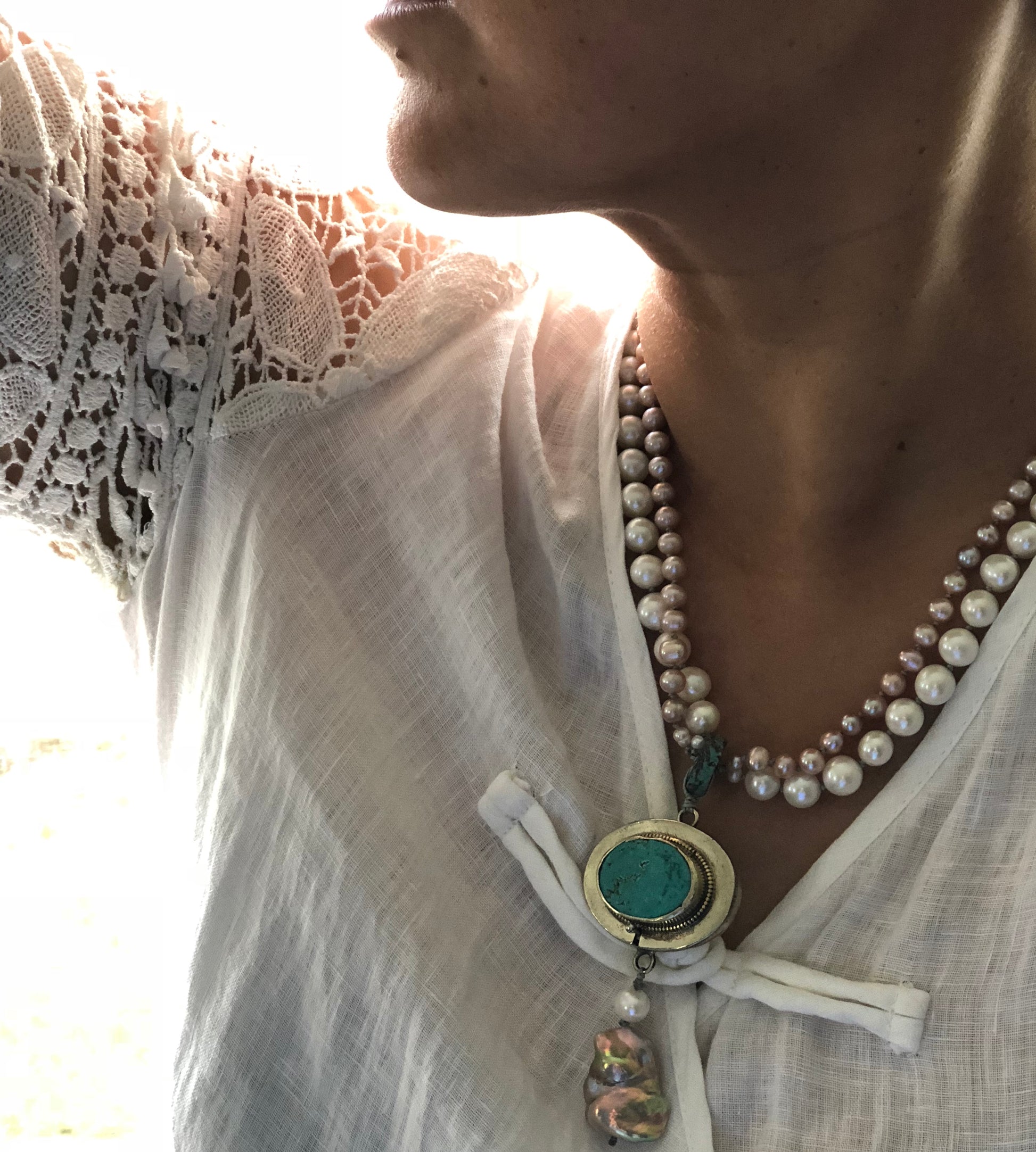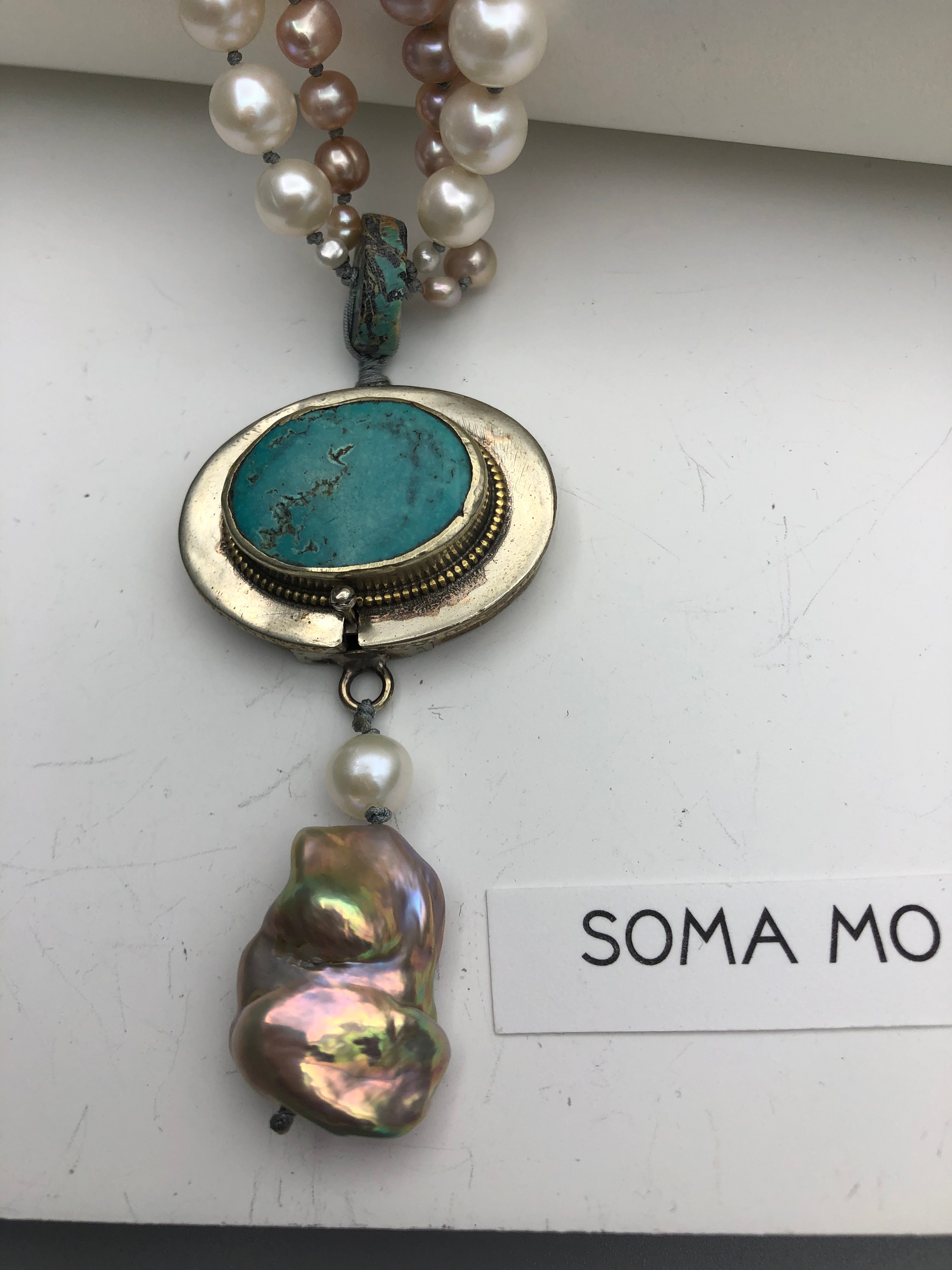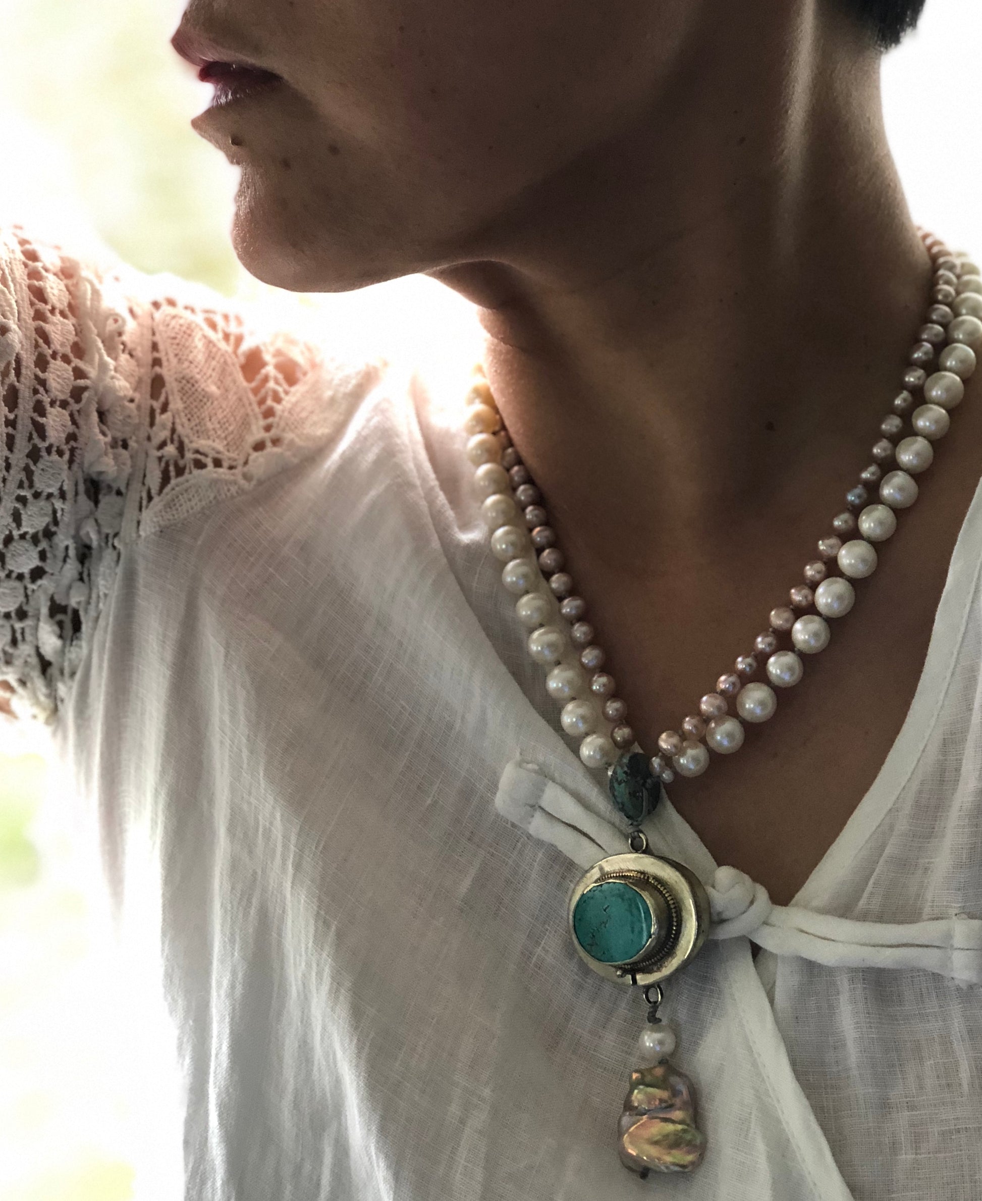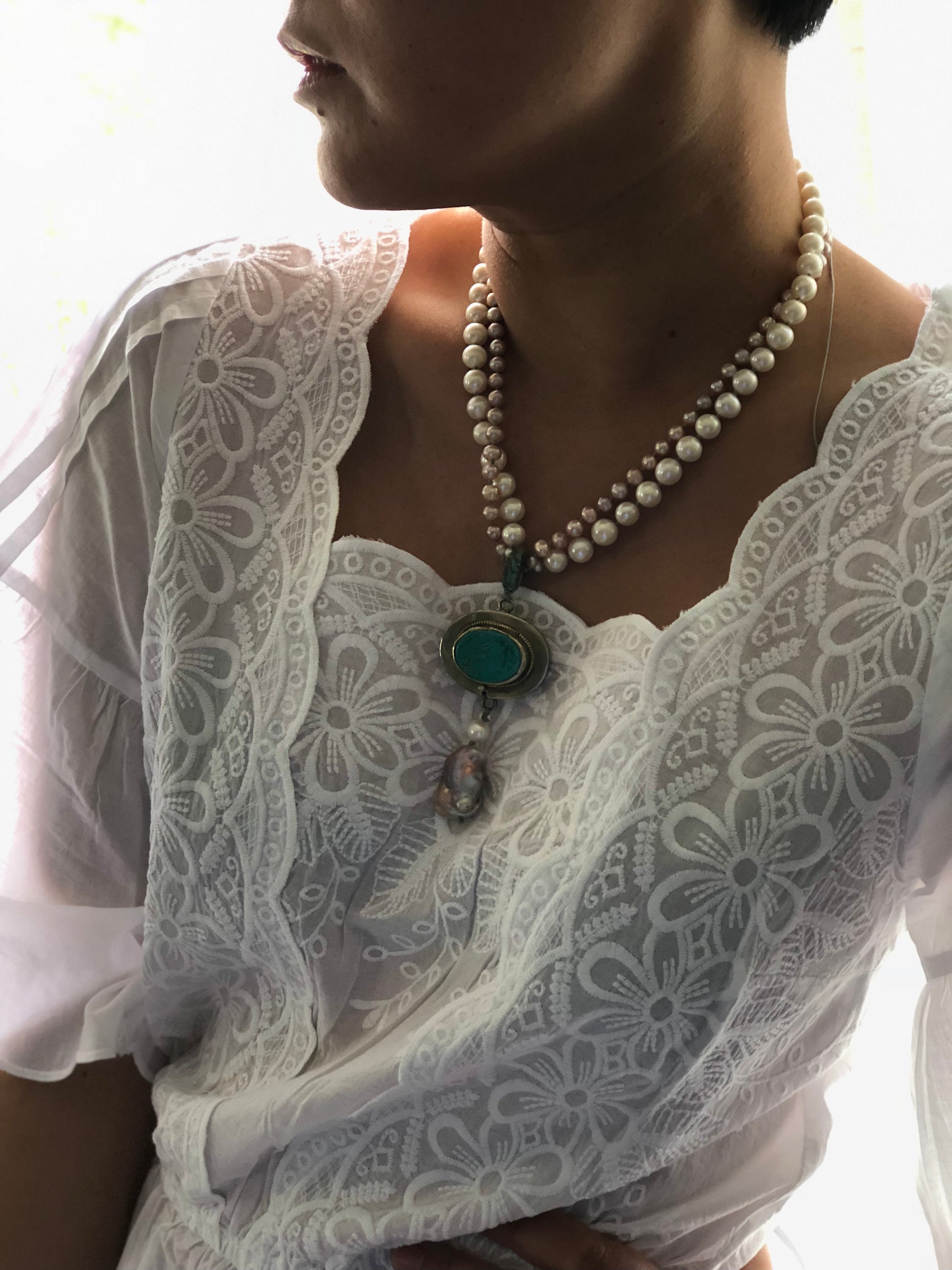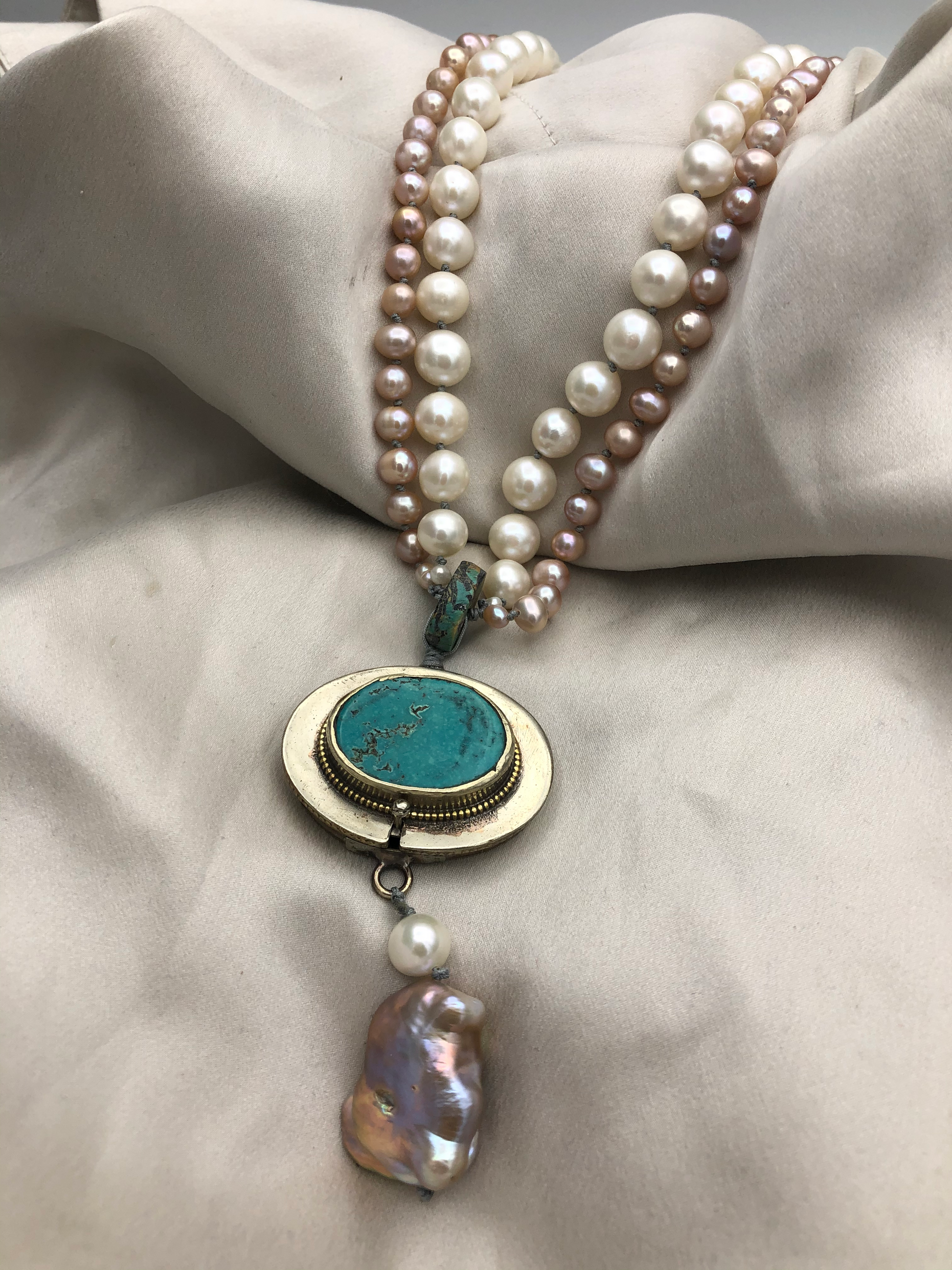 Precious turquoise with sterling silver , love this pendent with two color of fresh water pearl. Hand knotted between each beads, can be resized for special request.