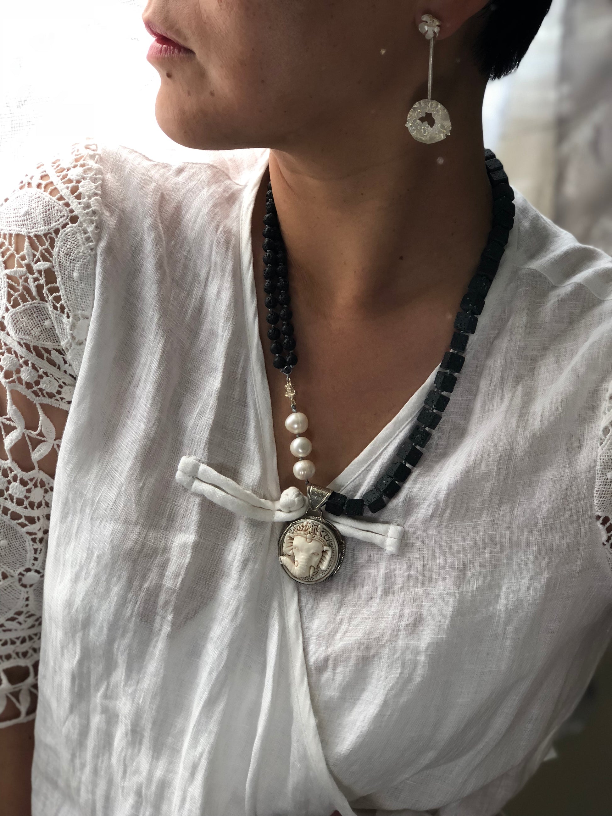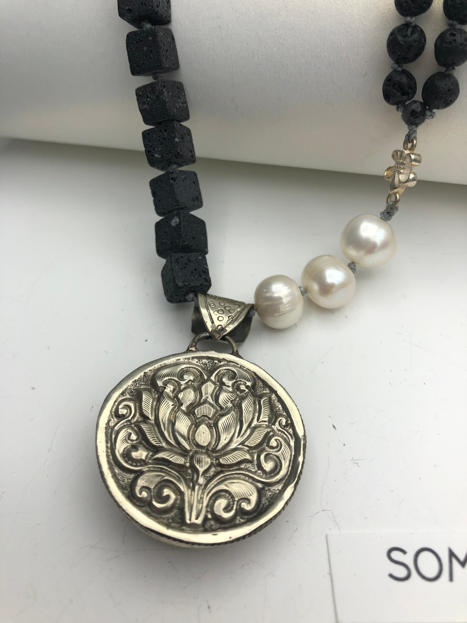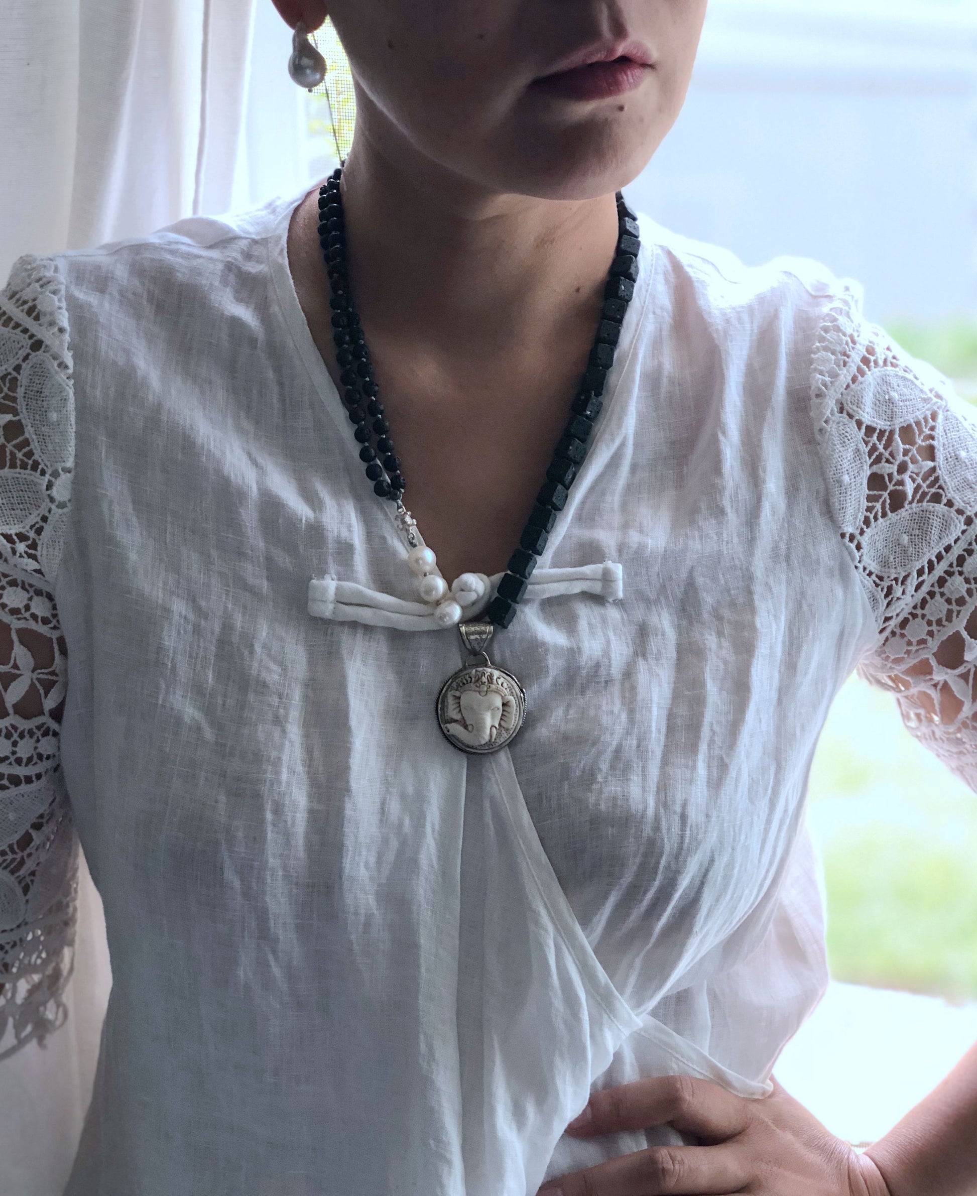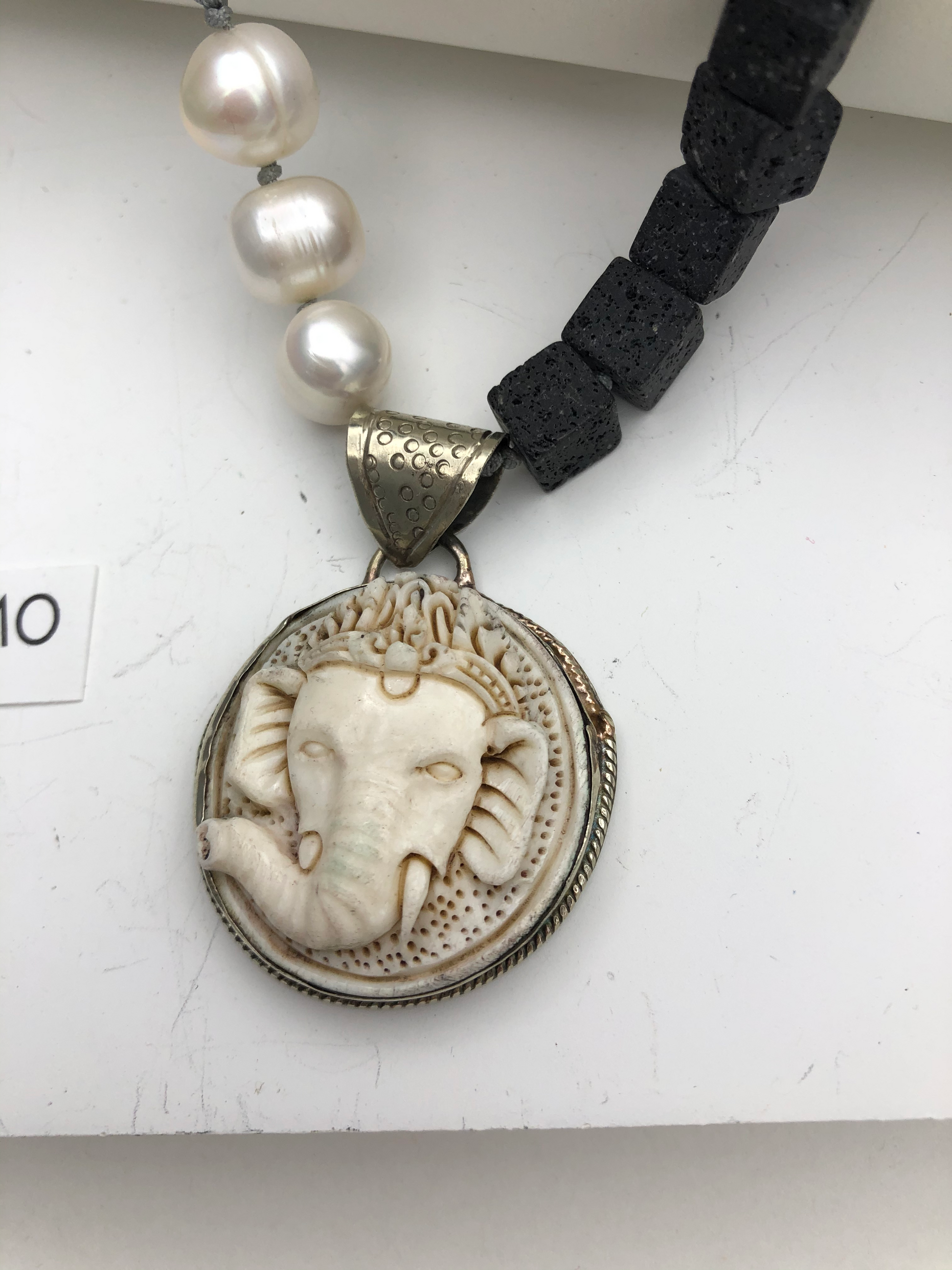 Classic black and white, with elephant pendent made of silver and bone from Nepal. Can be wear both side of the pendent . Hand knotted between each beads, can be resized for special request.