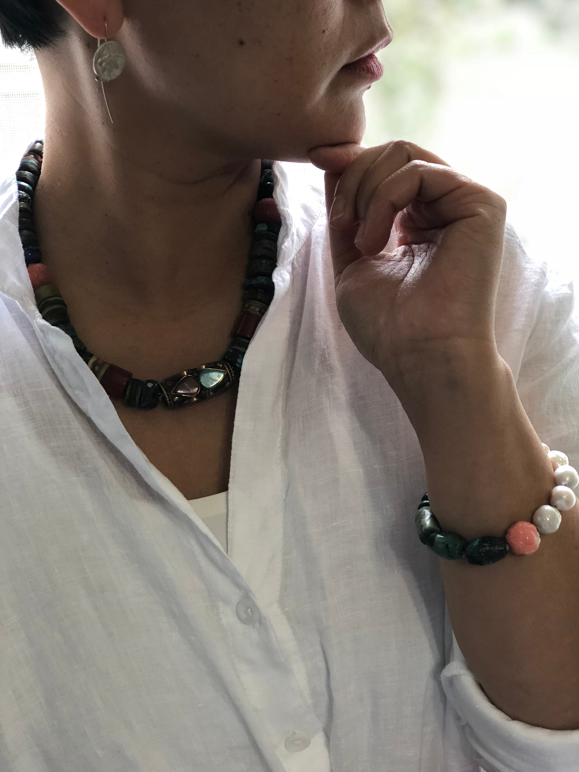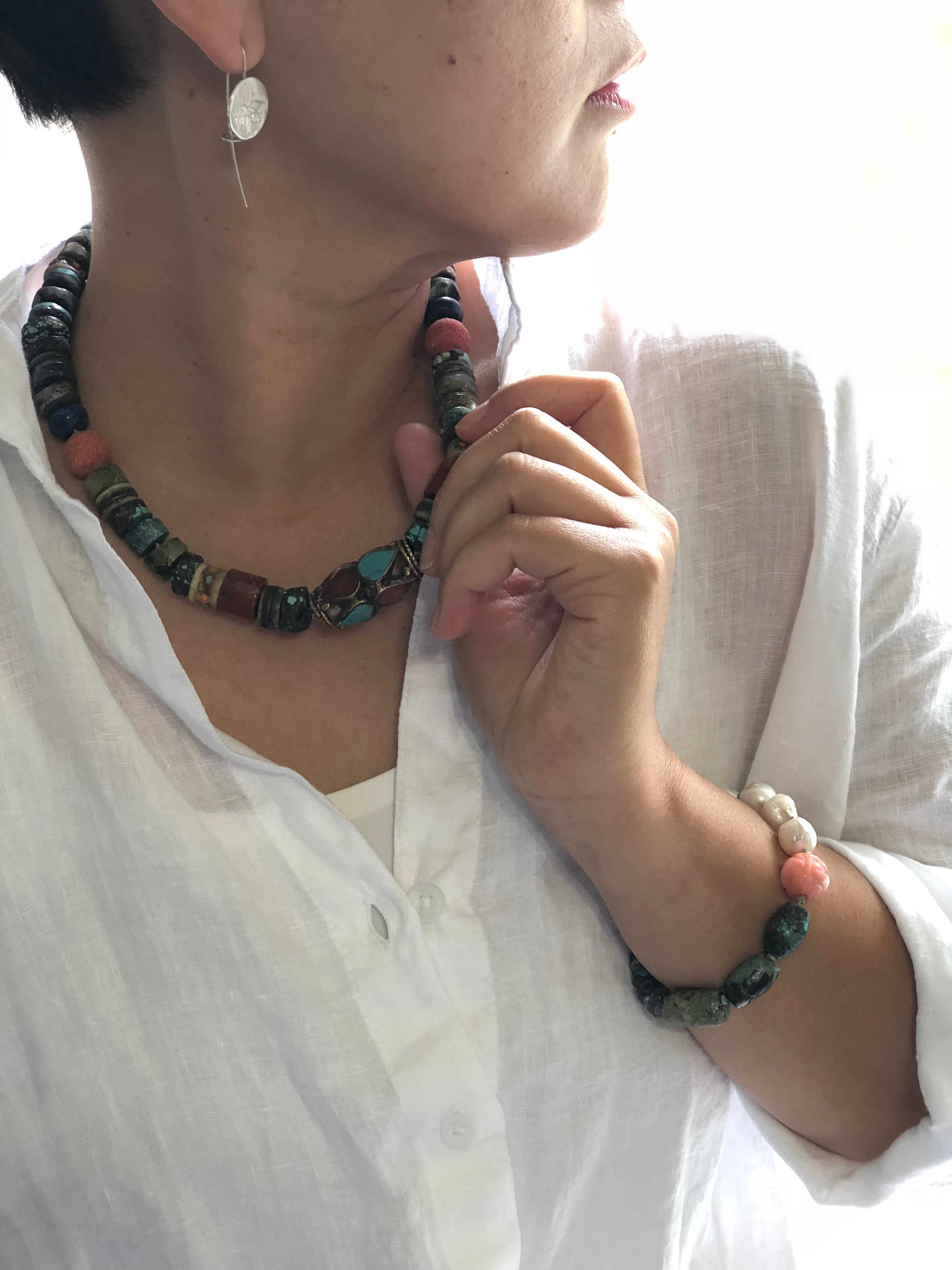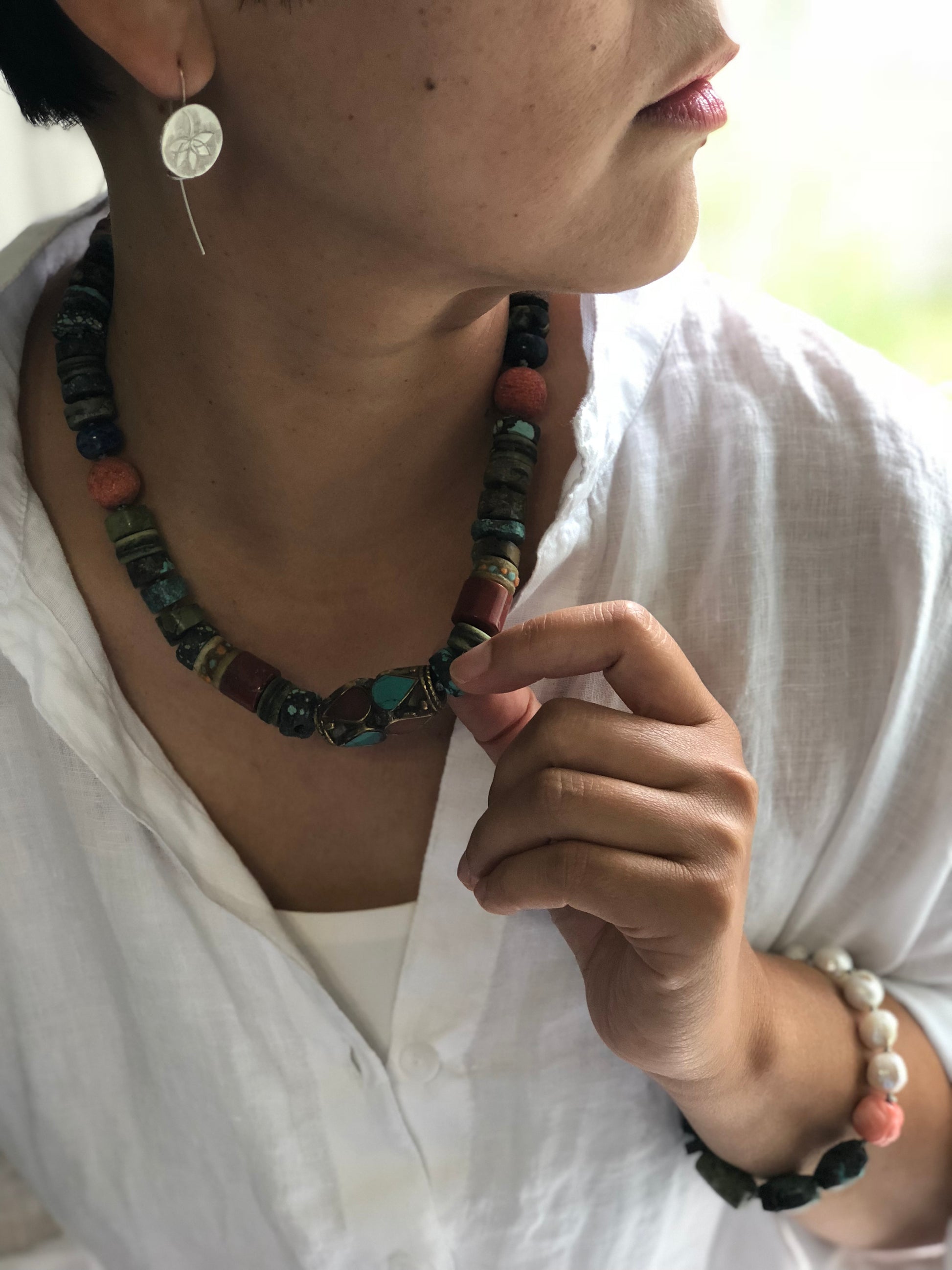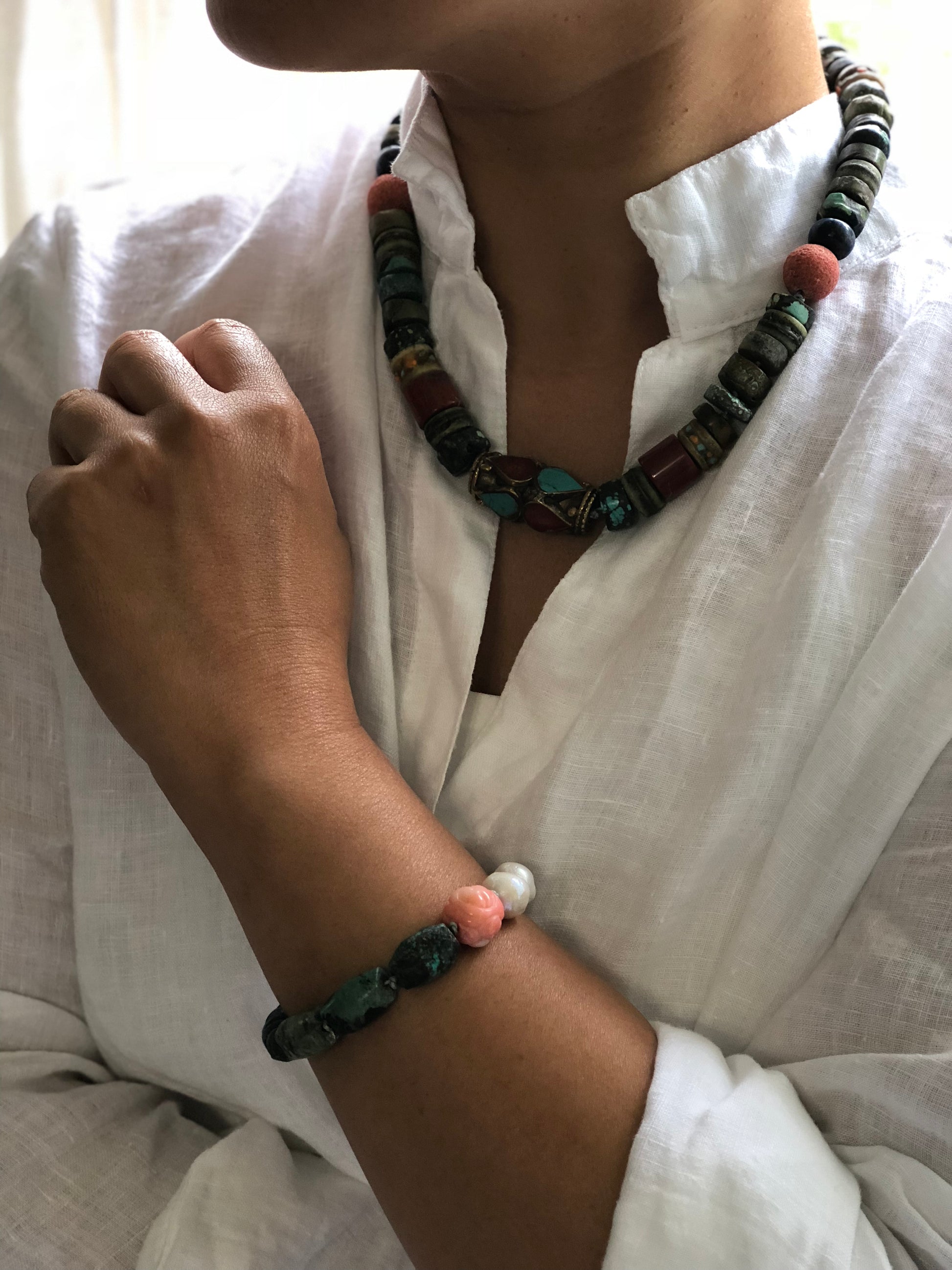Materials : Turquoise, coral, old Tibetan prayer beads
