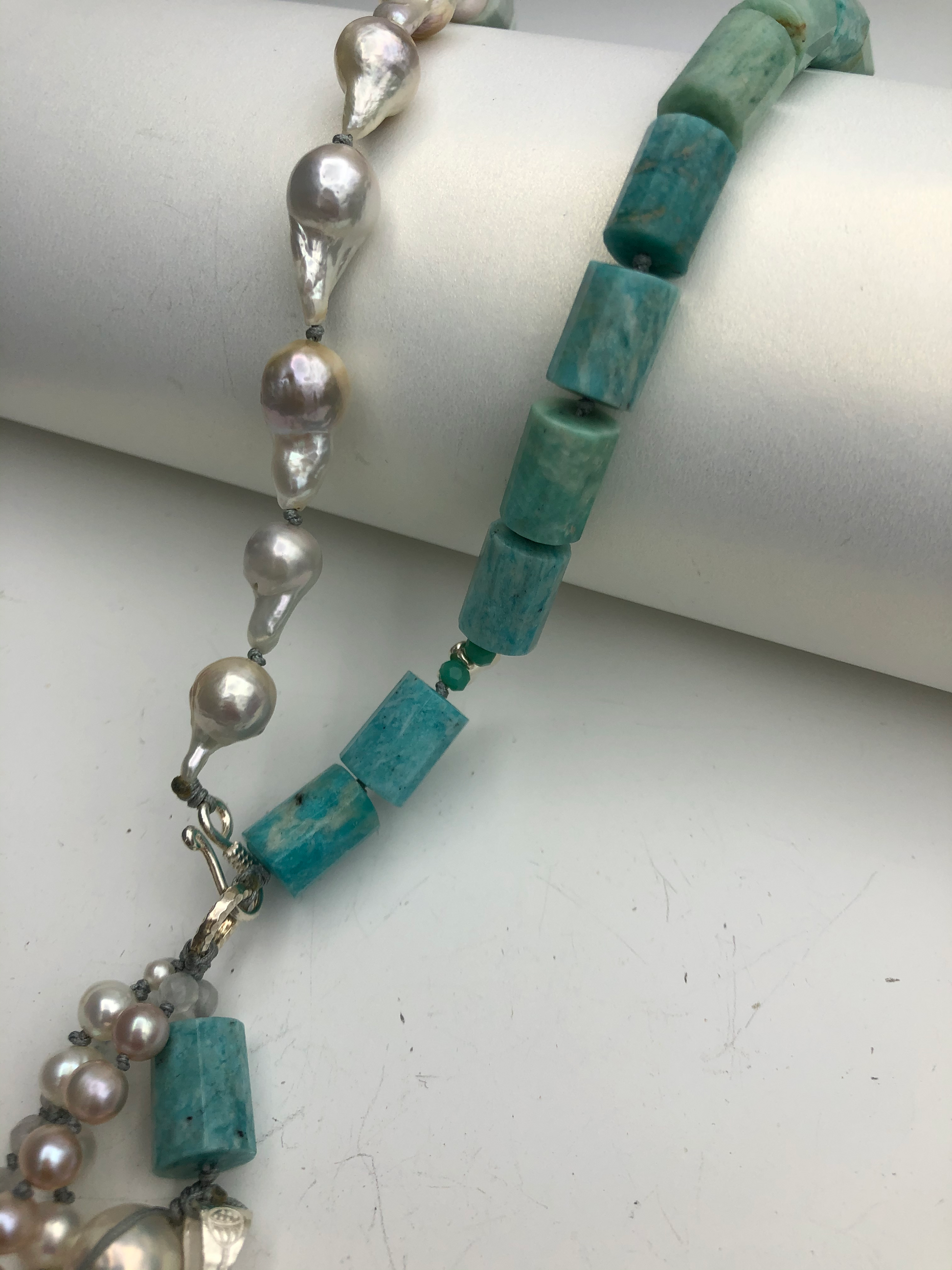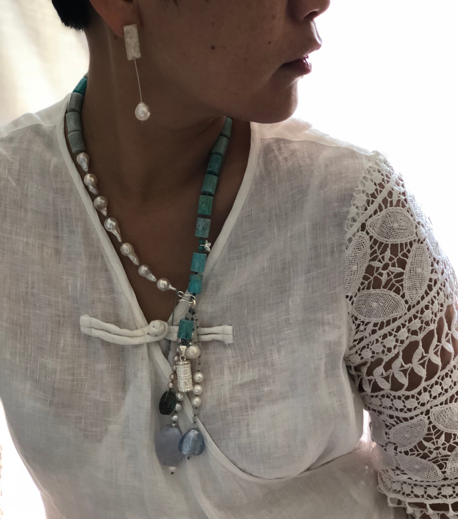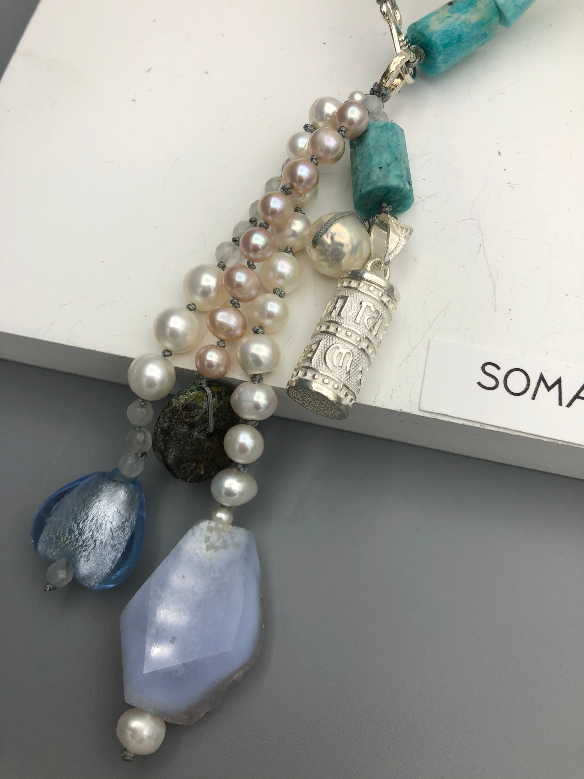 Materials : Amazonite, fresh water pearl, fine silver Tibetan prayer wheel, hand made glass heart