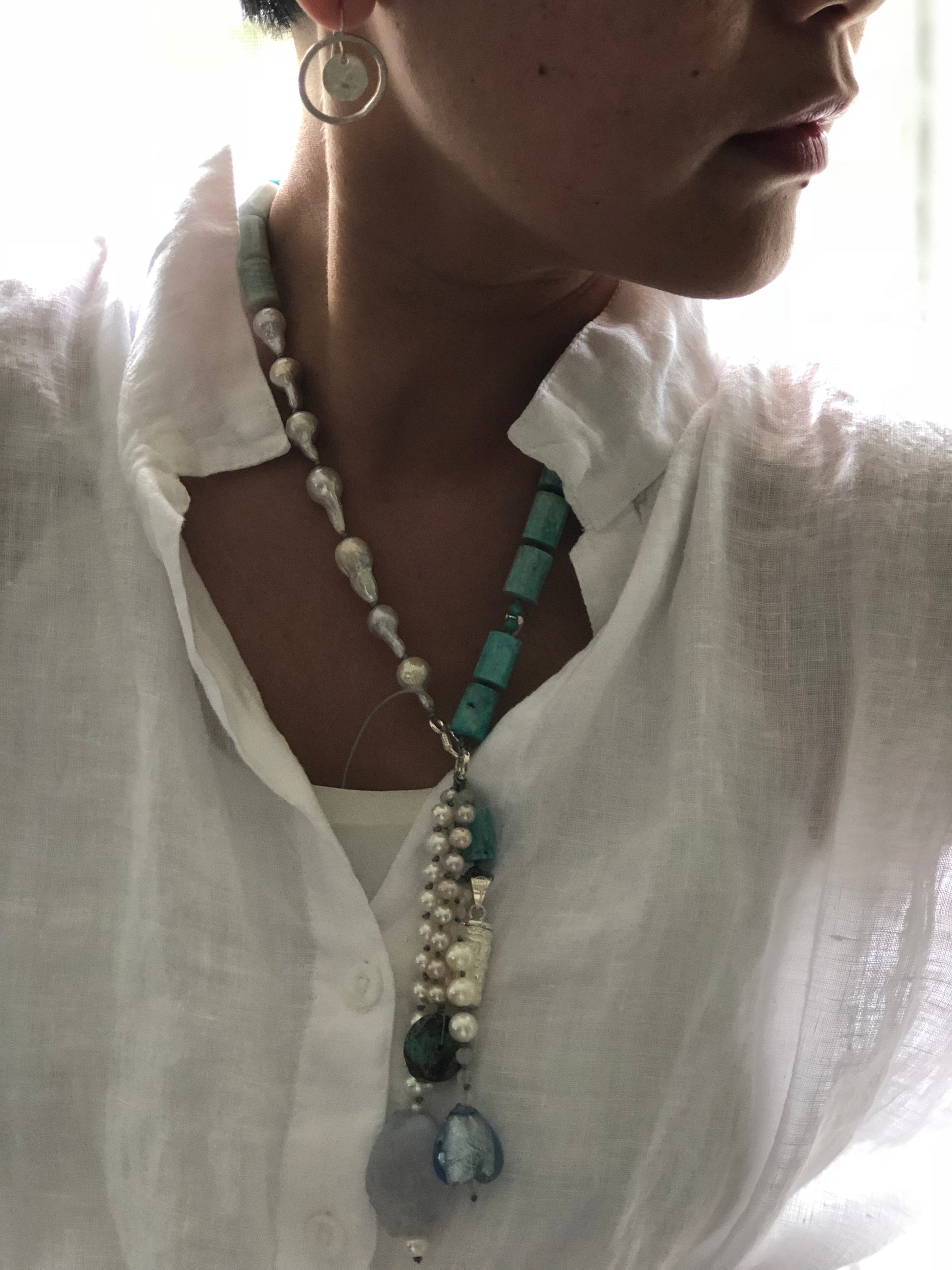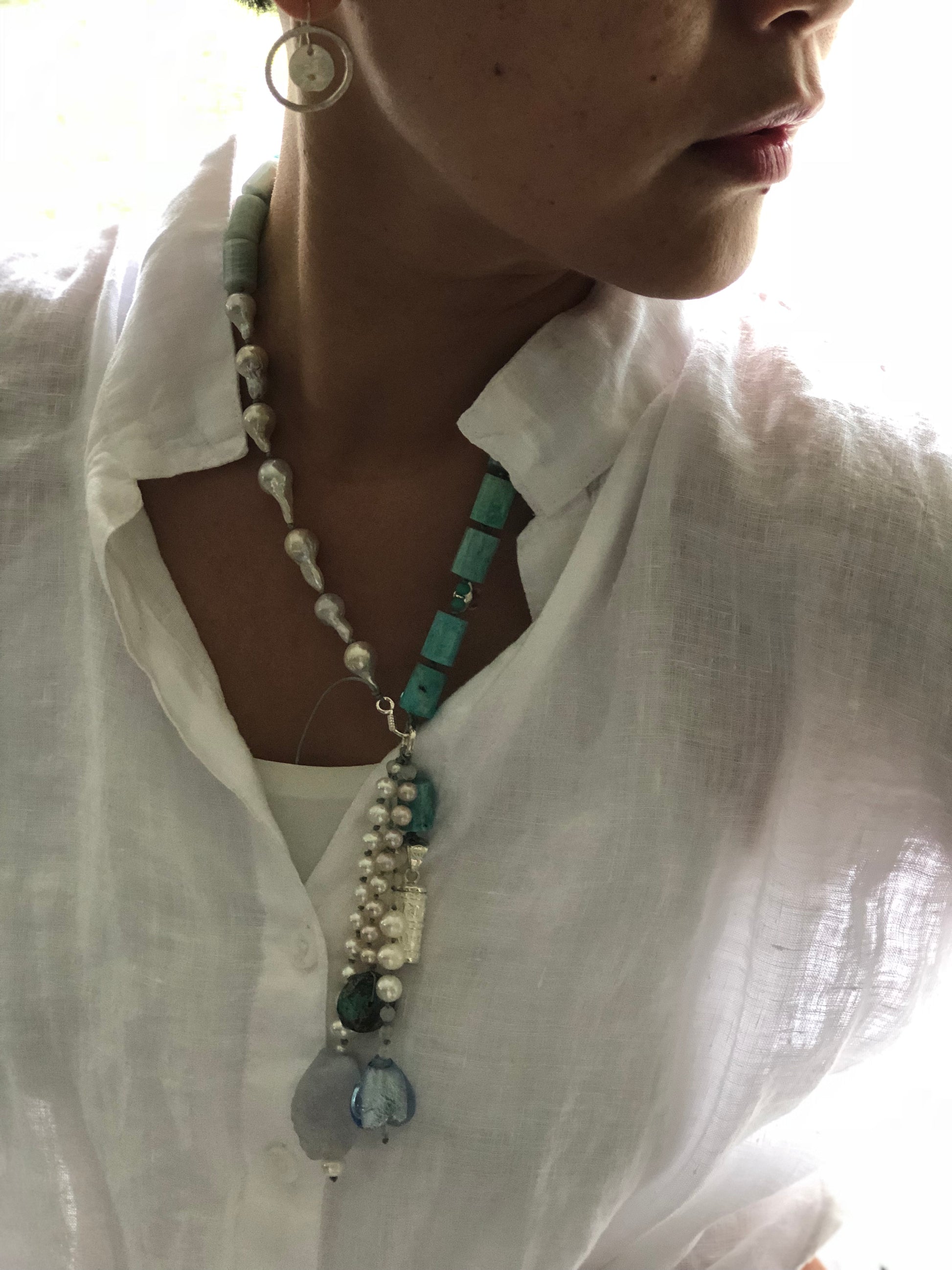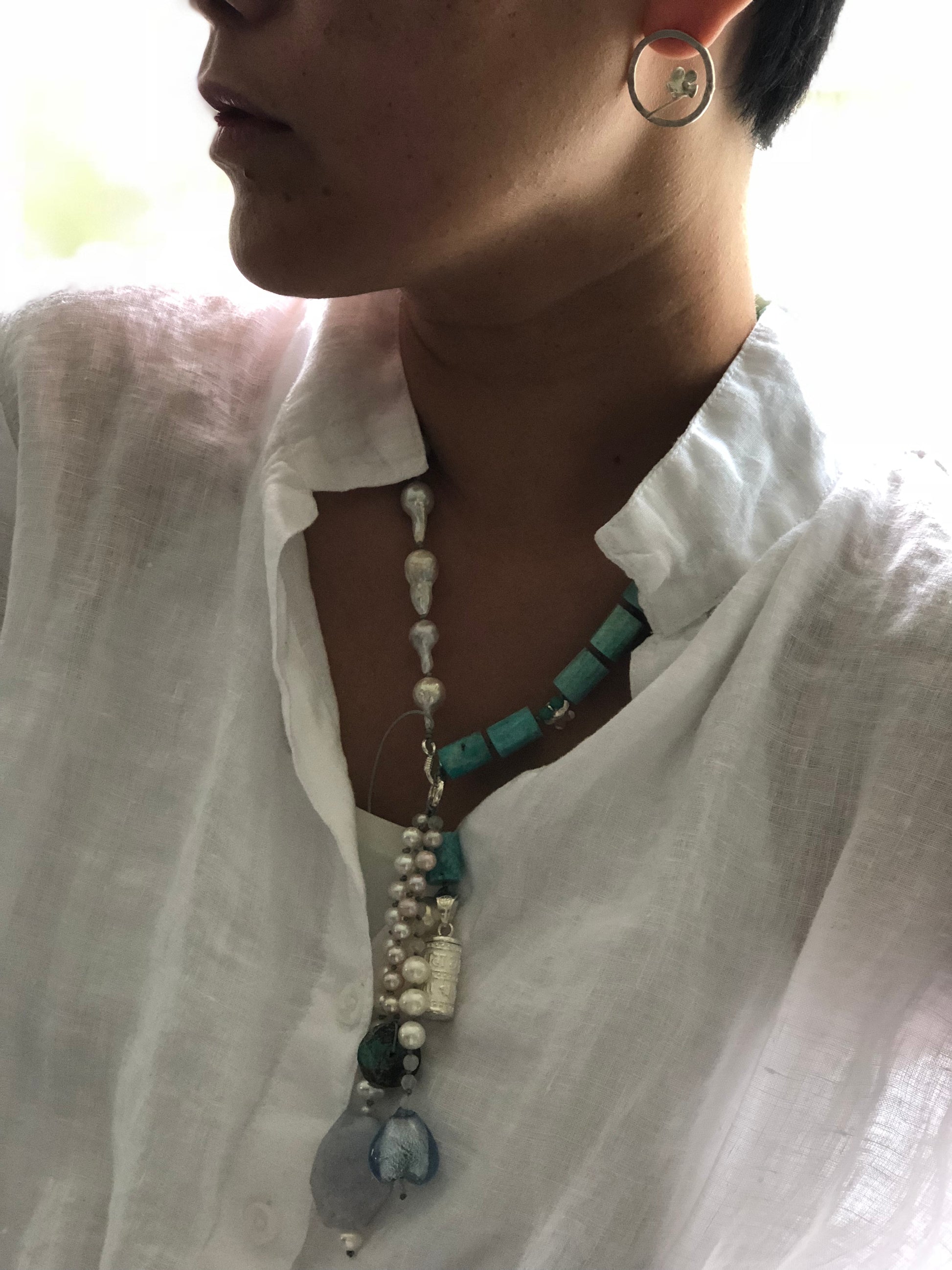 Materials : Amazonite, fresh water pearl, fine silver Tibetan prayer wheel, hand made glass heart