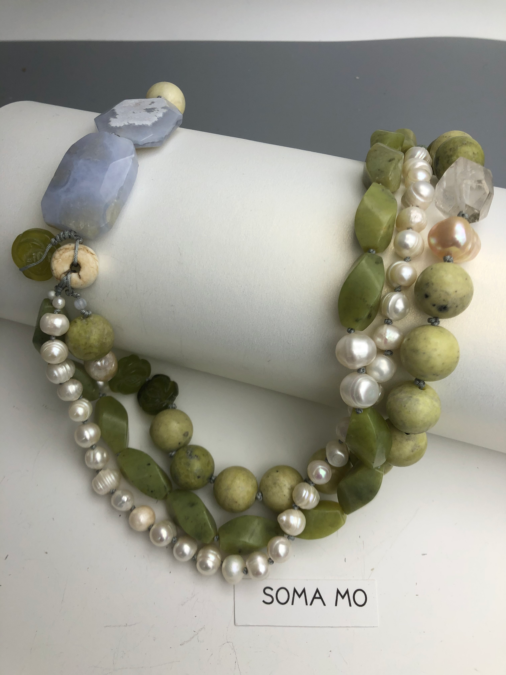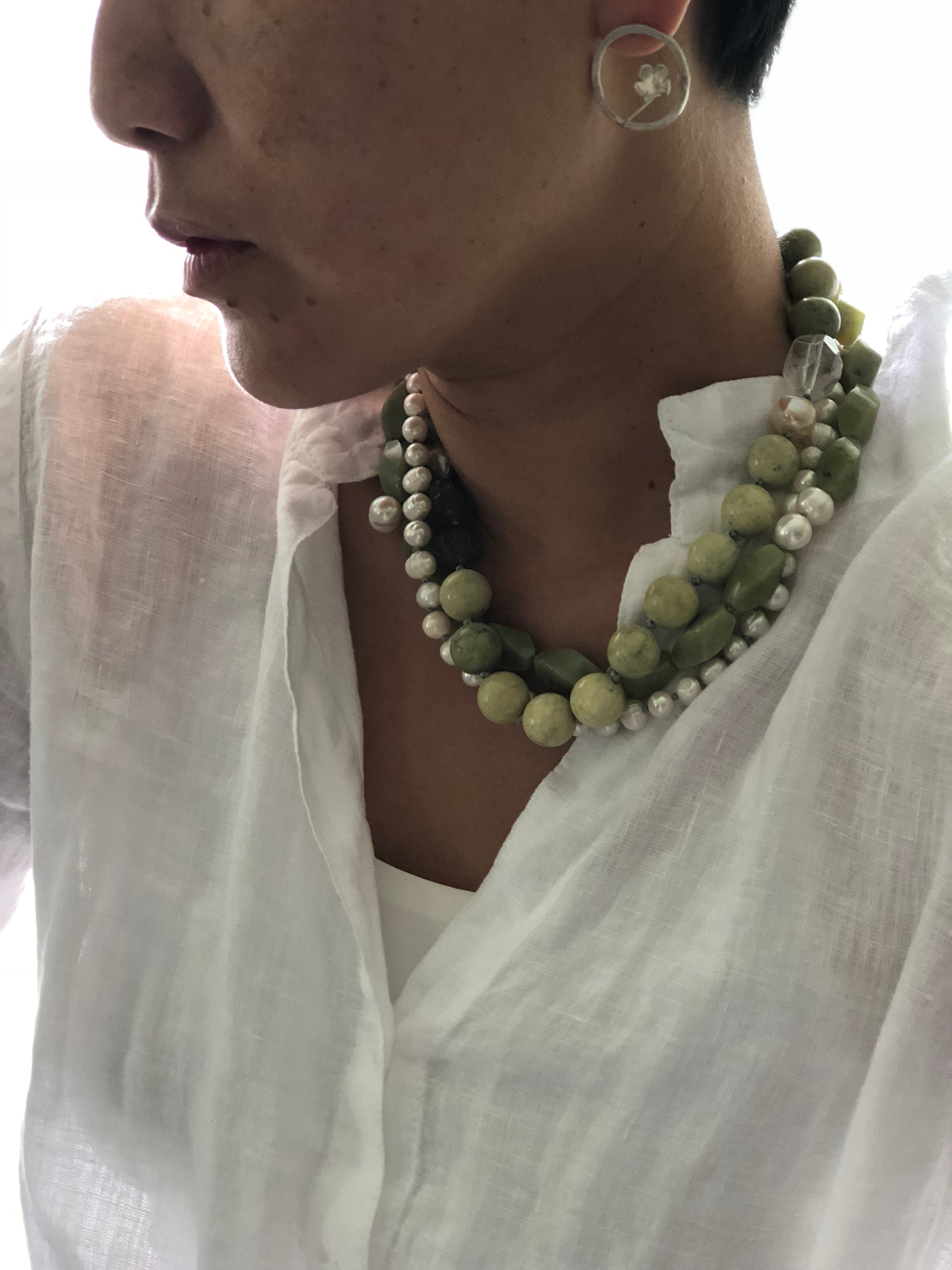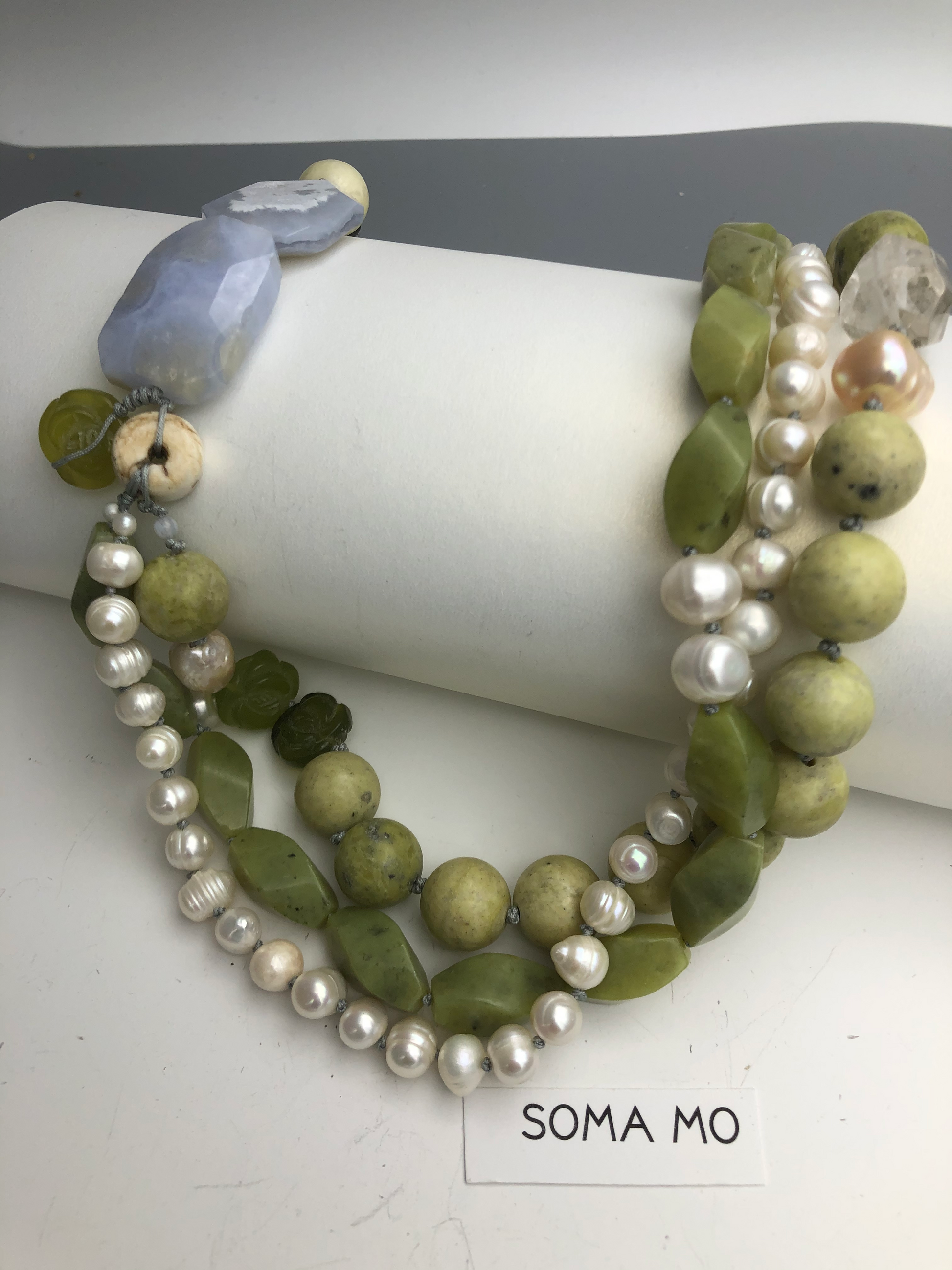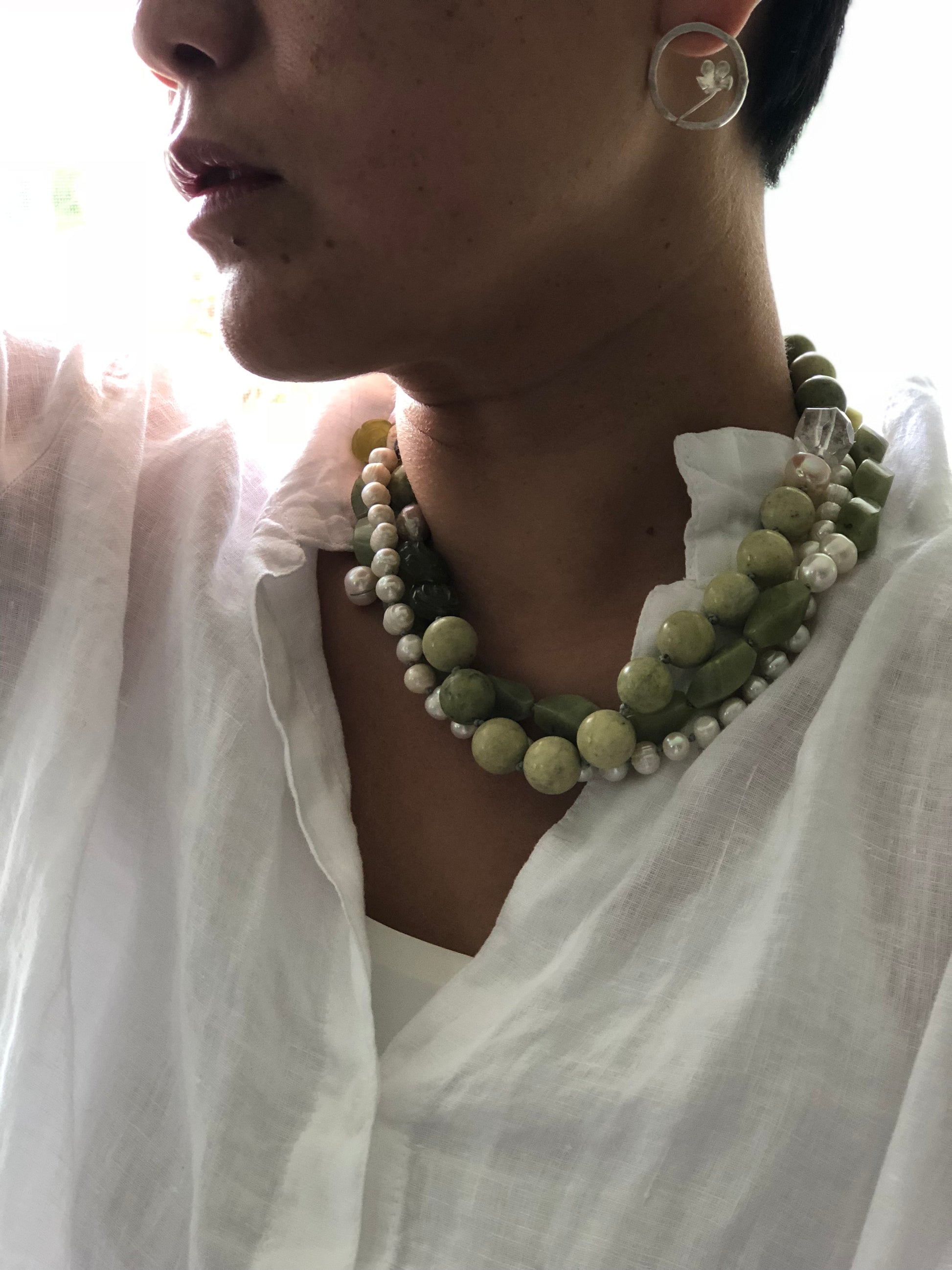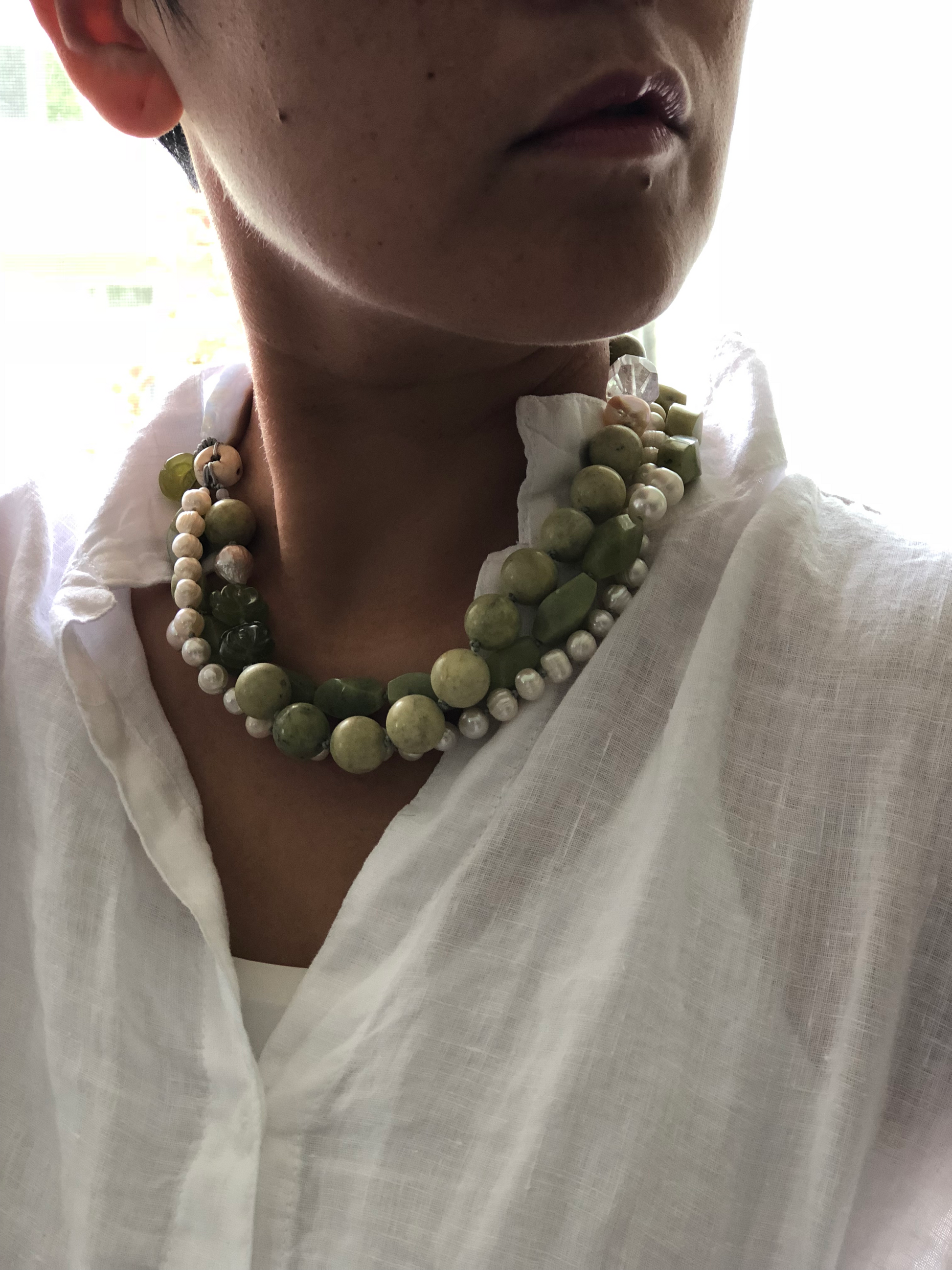 Materials : Olive jade, yellow turquoise, fresh water pearl, blue lace agate