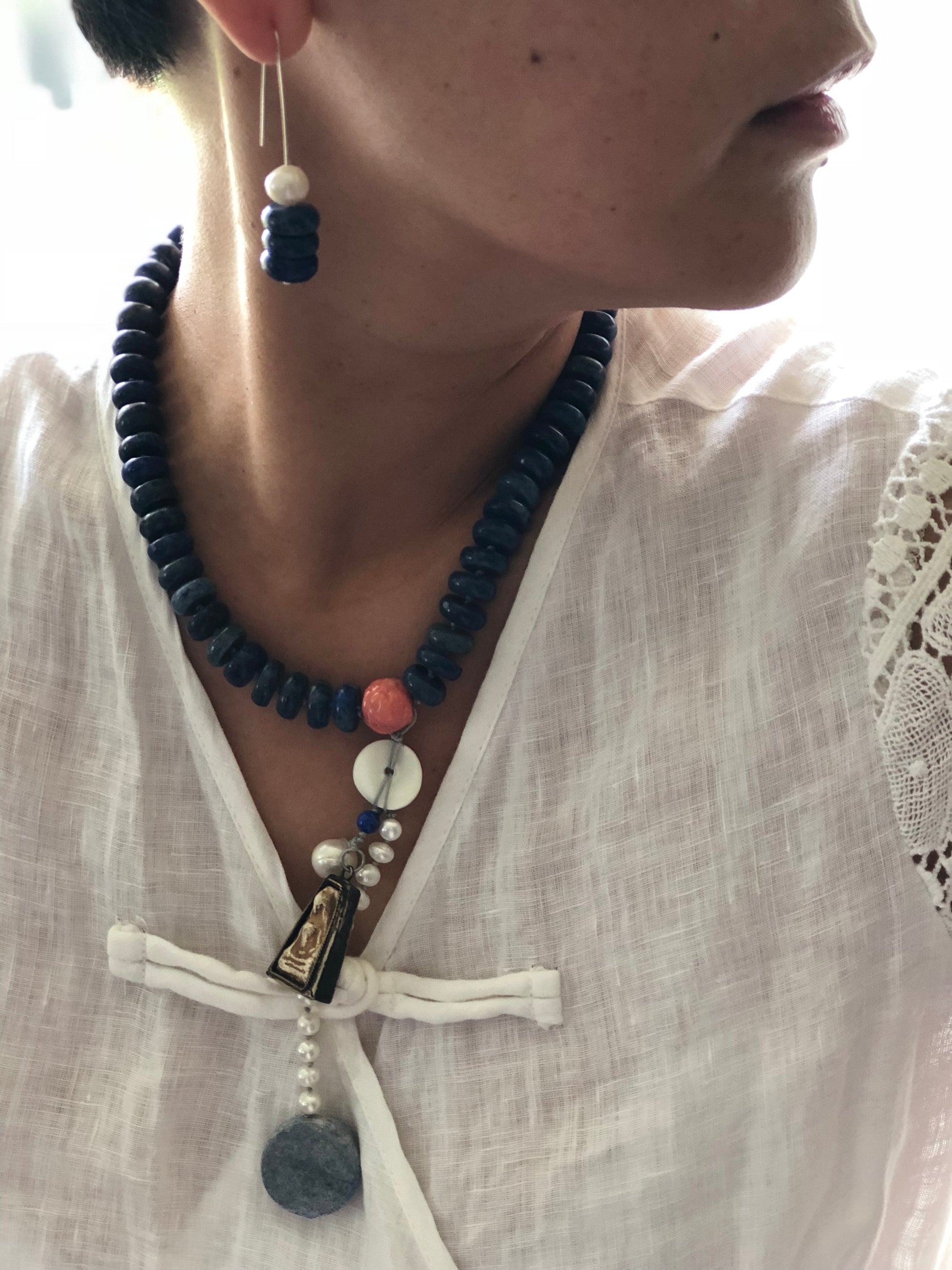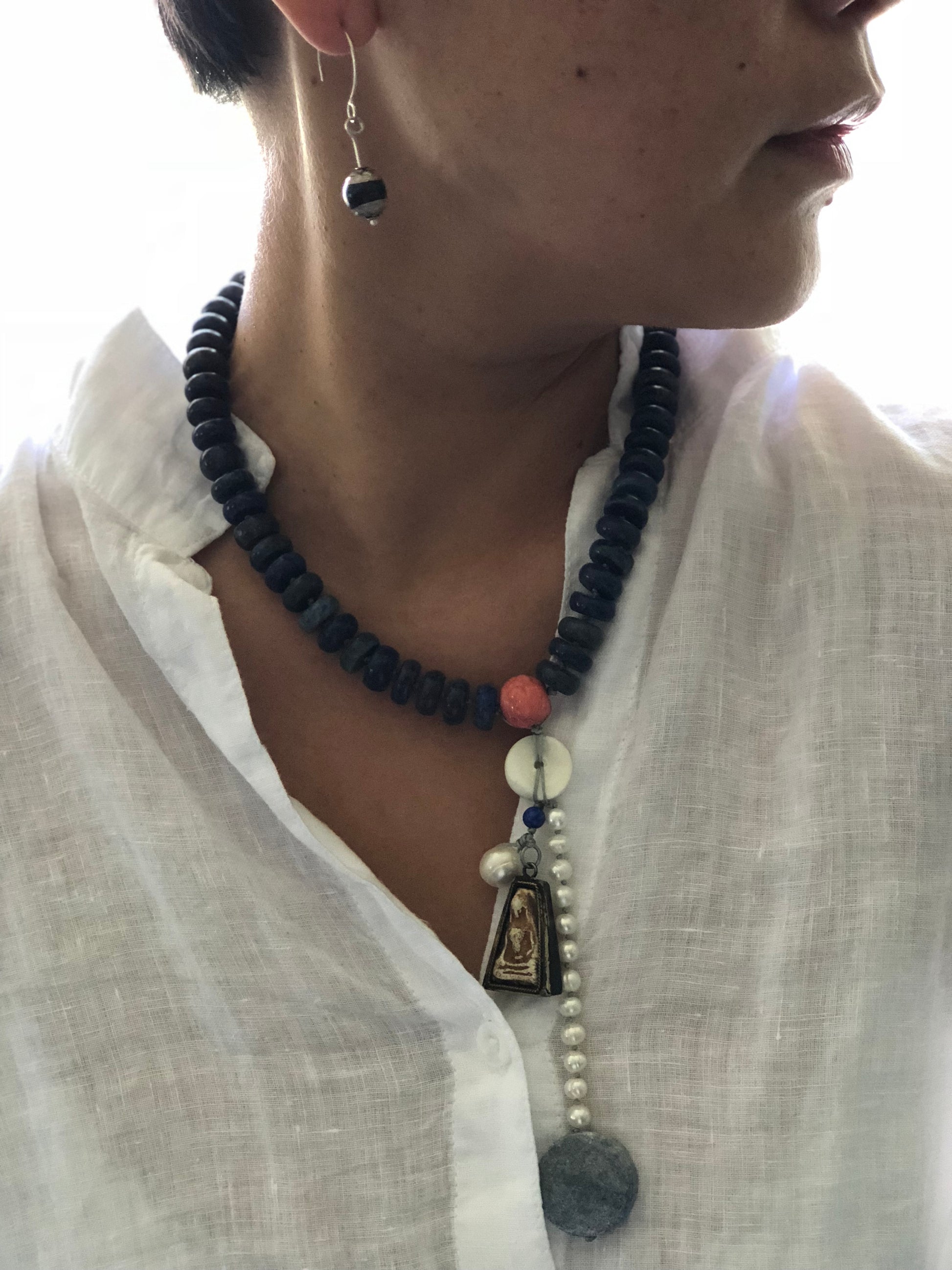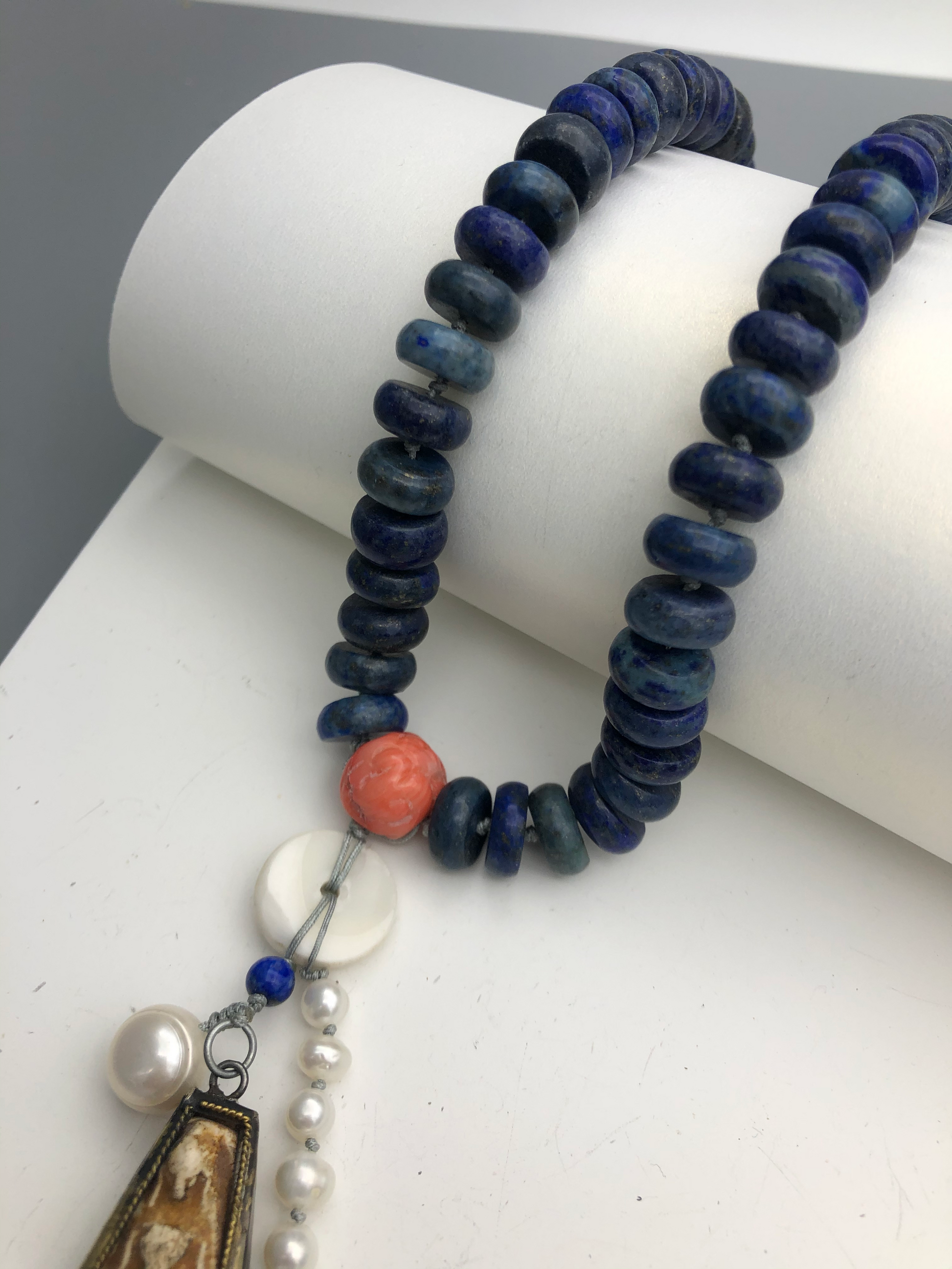 Materials : Lapis, red coral, old Tibetan pendent , fresh water pearl