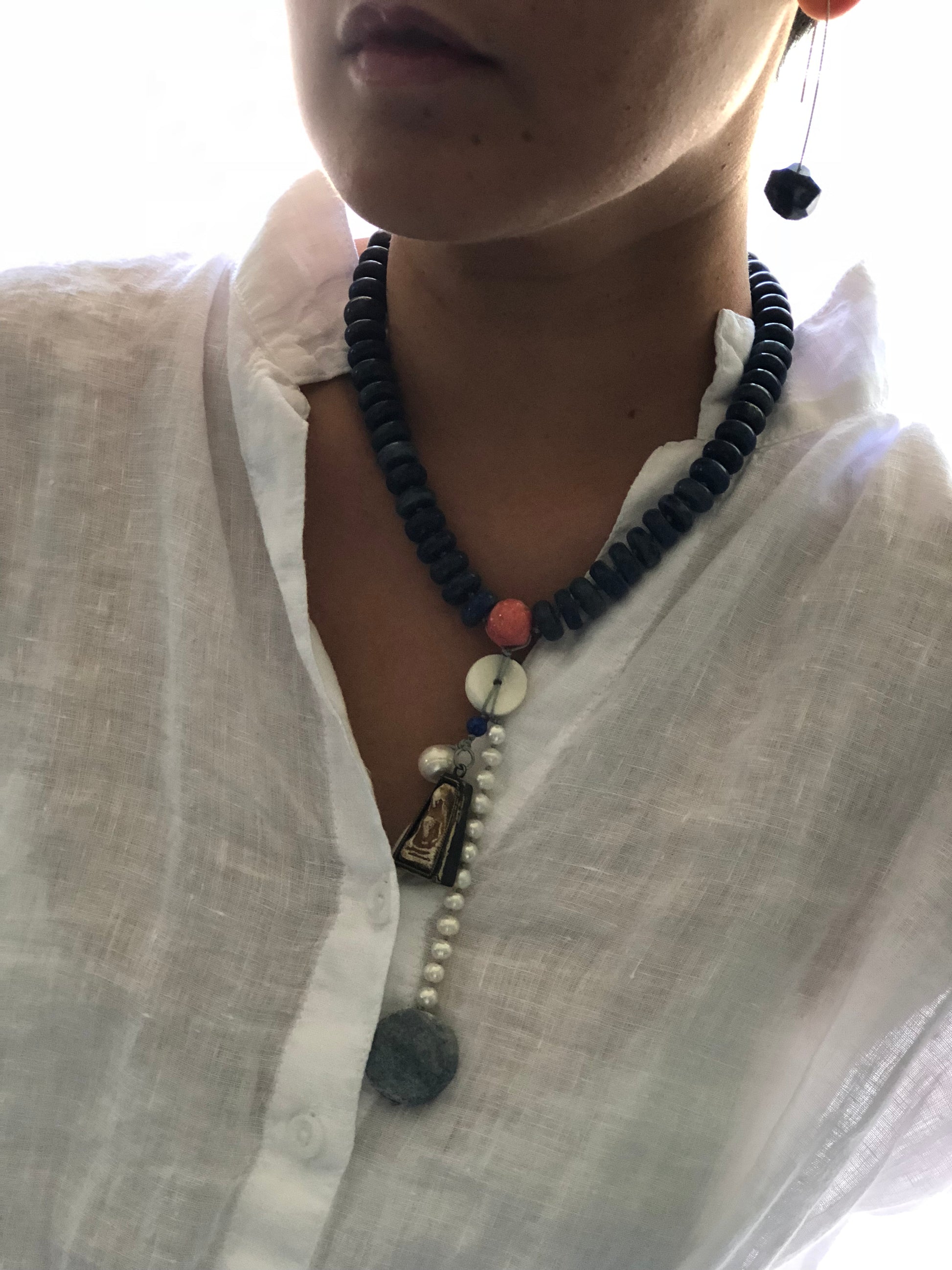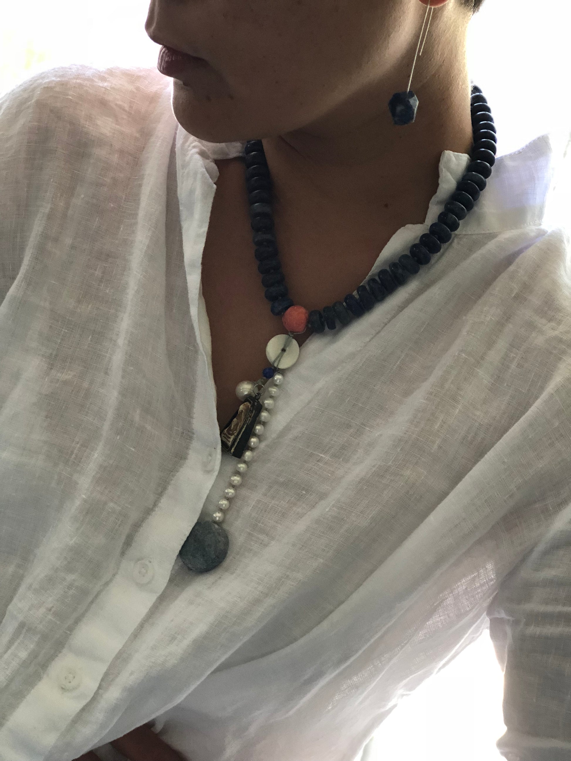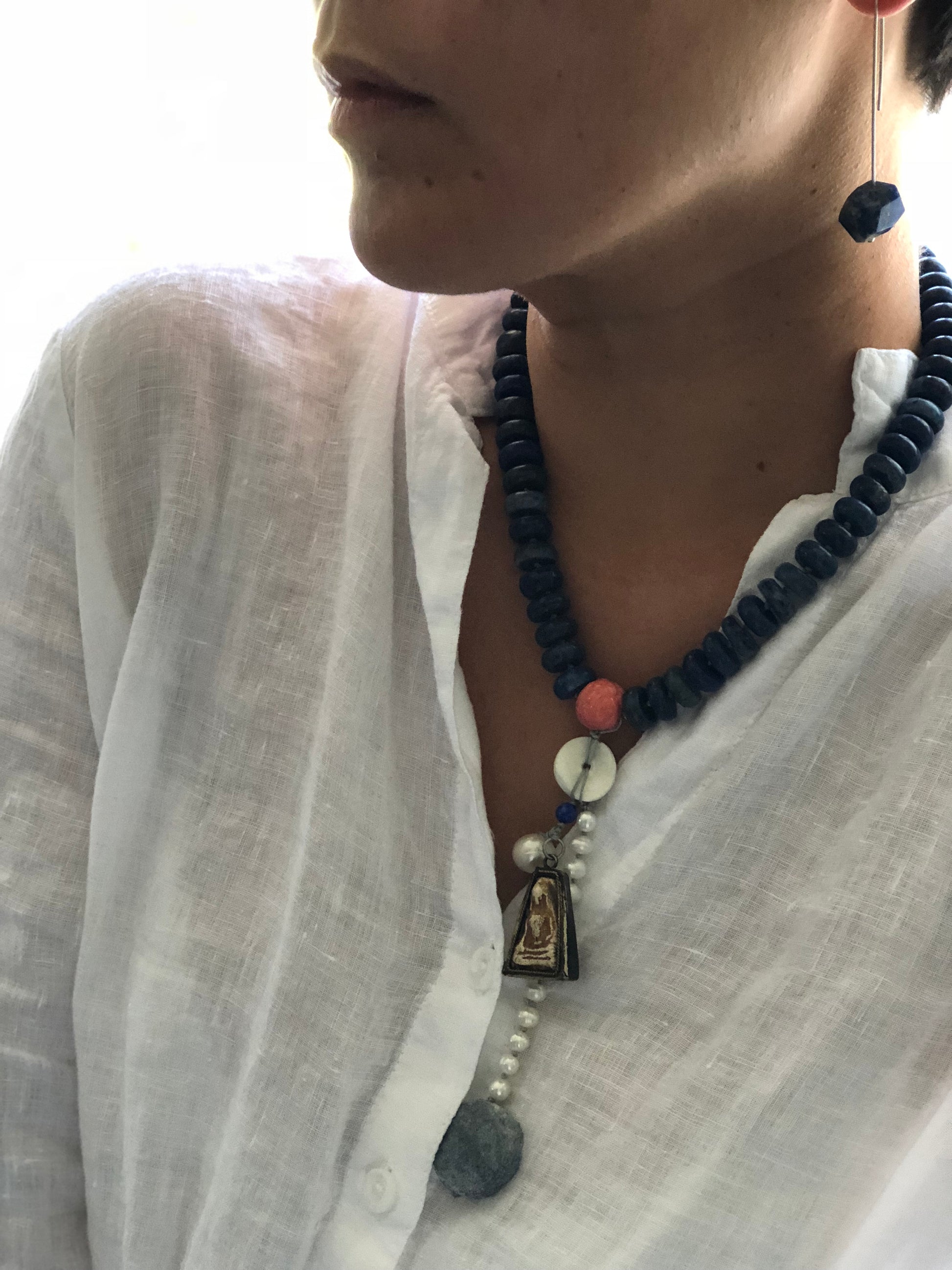 Materials : Lapis, red coral, old Tibetan pendent , fresh water pearl