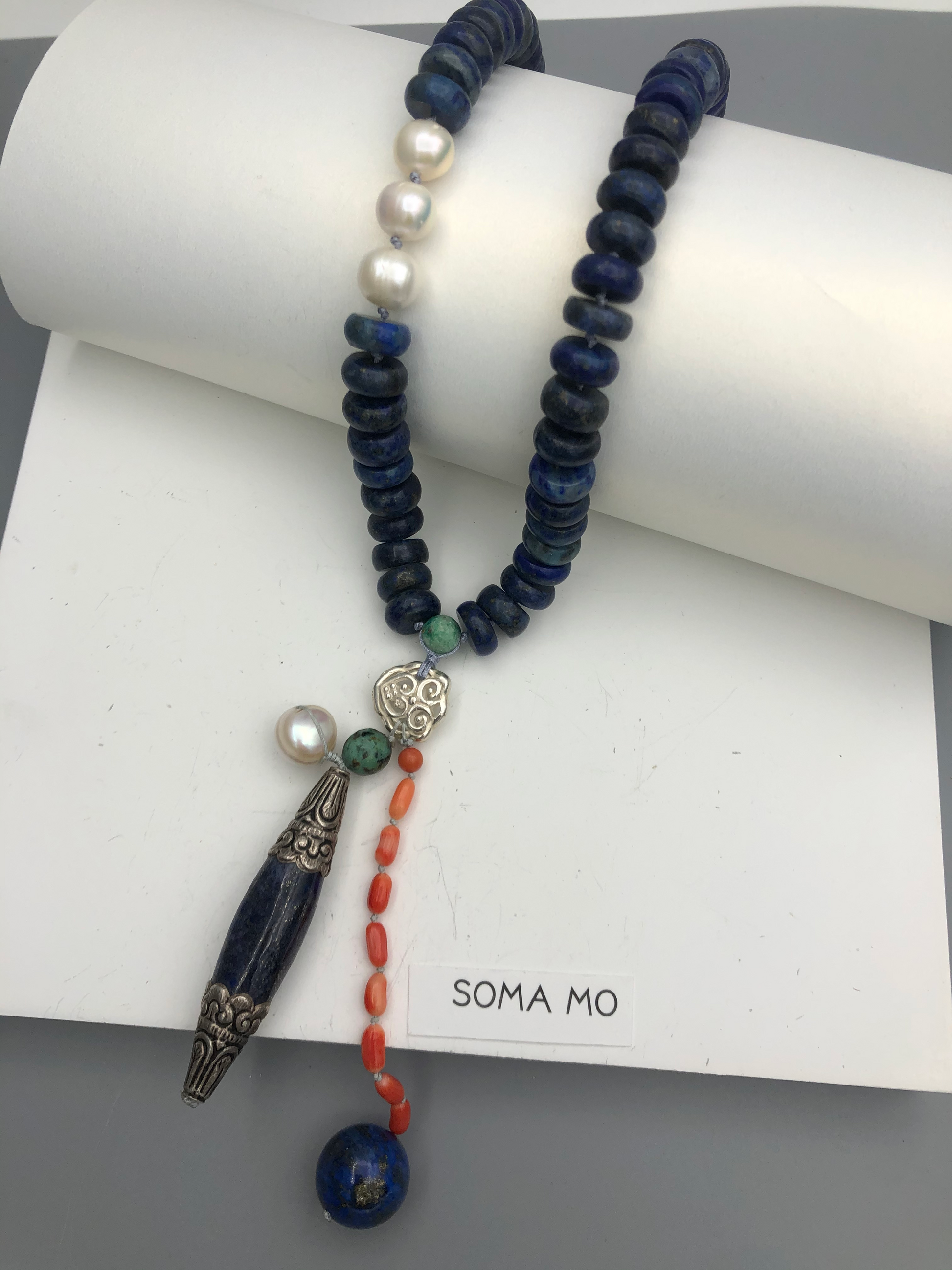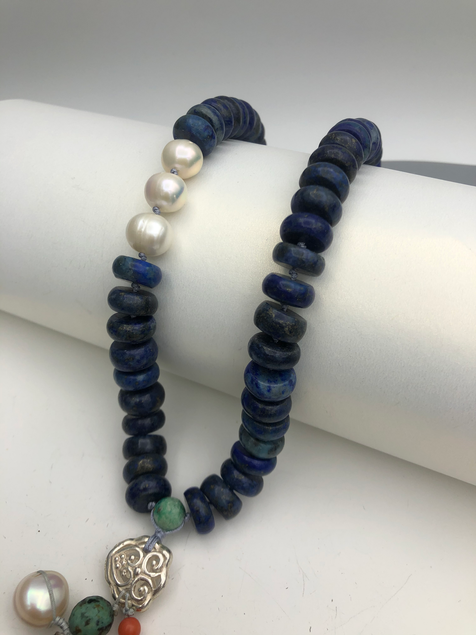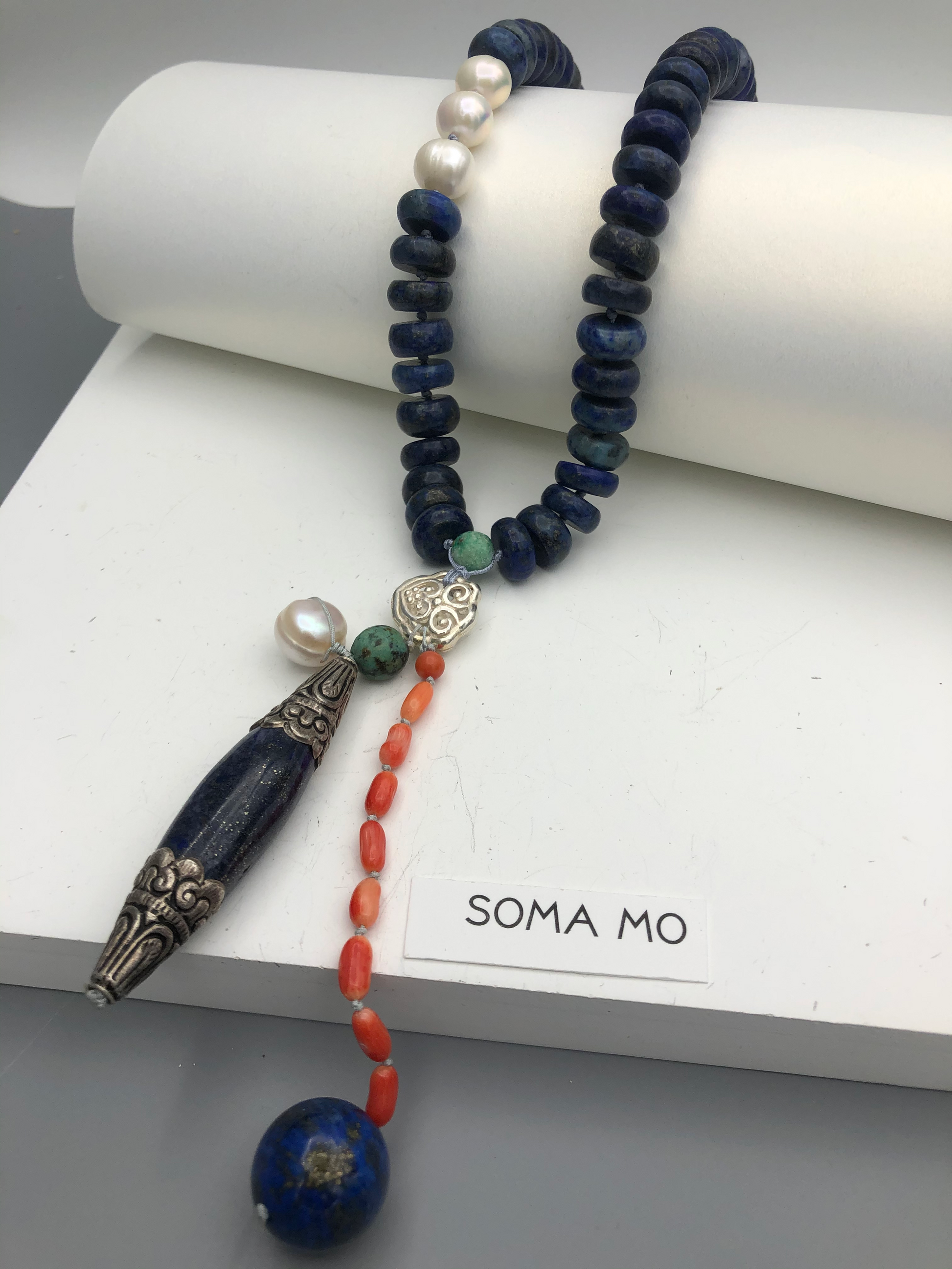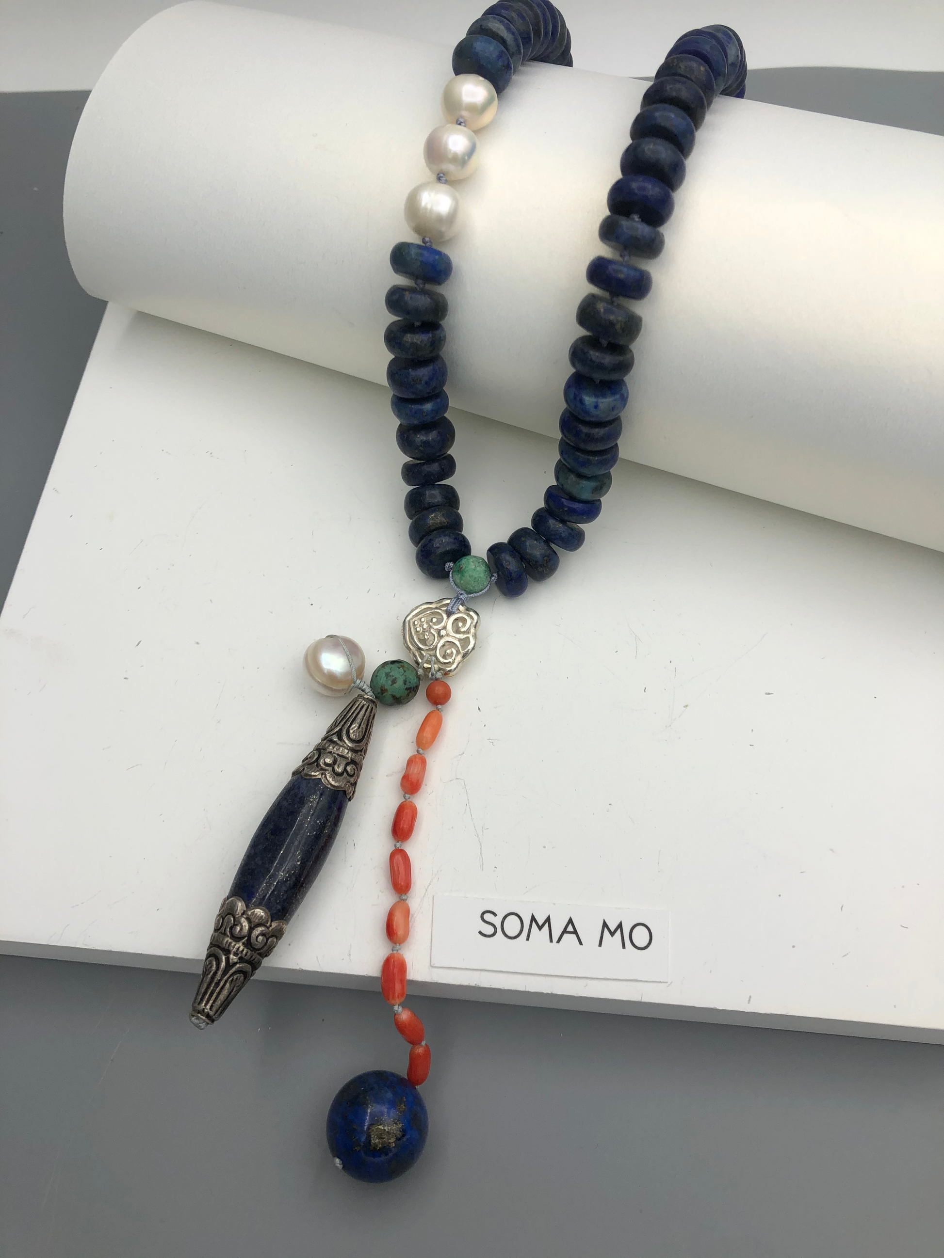 Materials : Lapis, red coral , fresh water pearl, Tibetan silver pendent with lapis