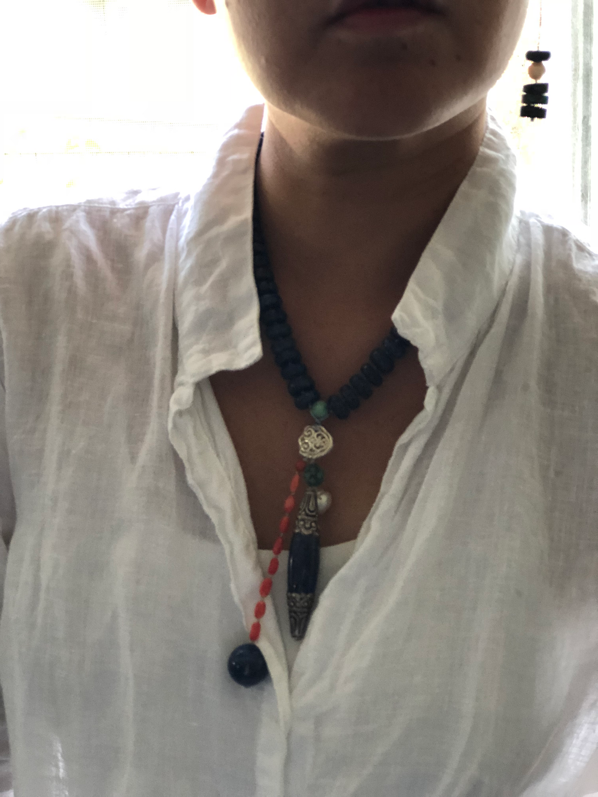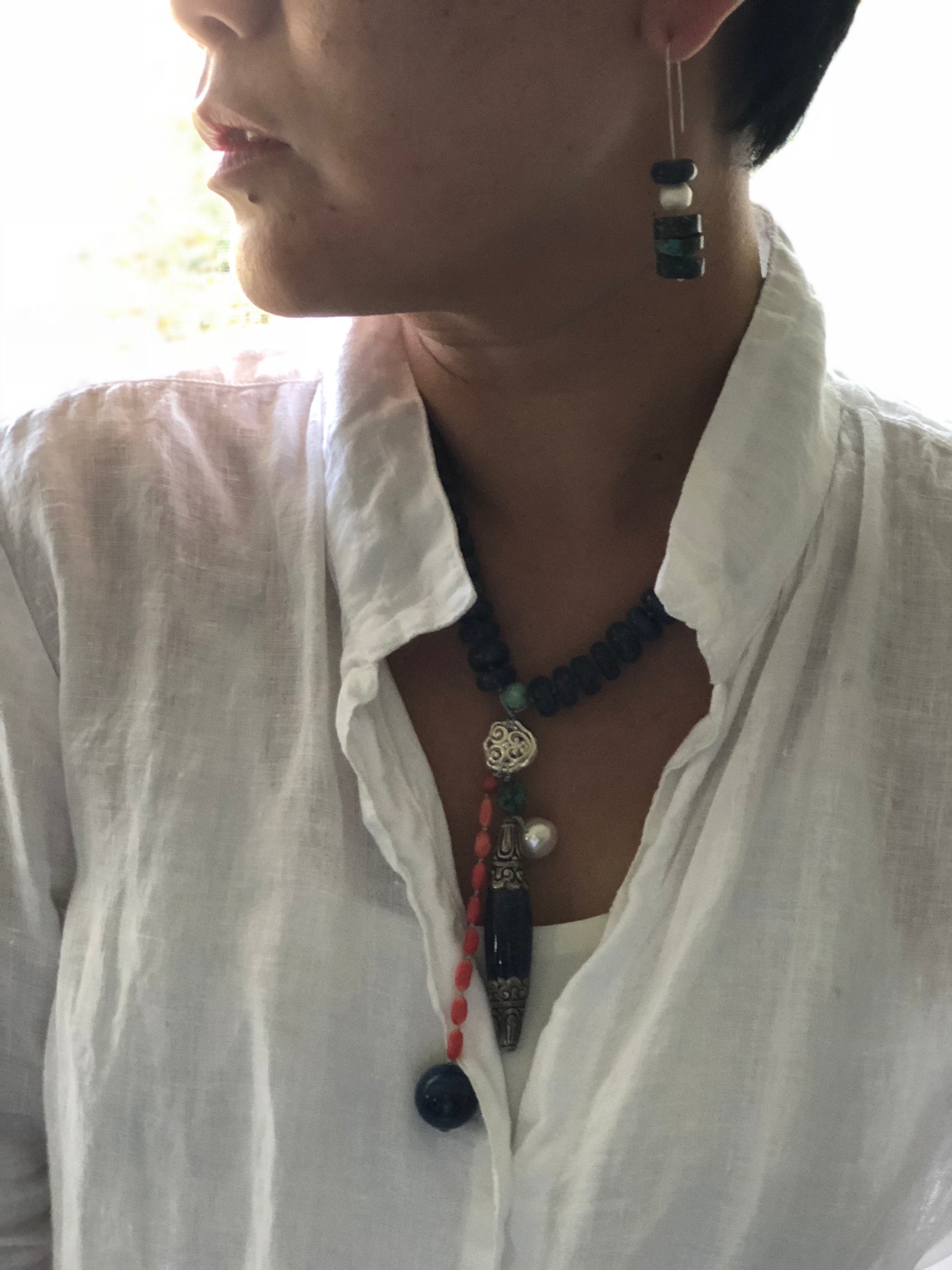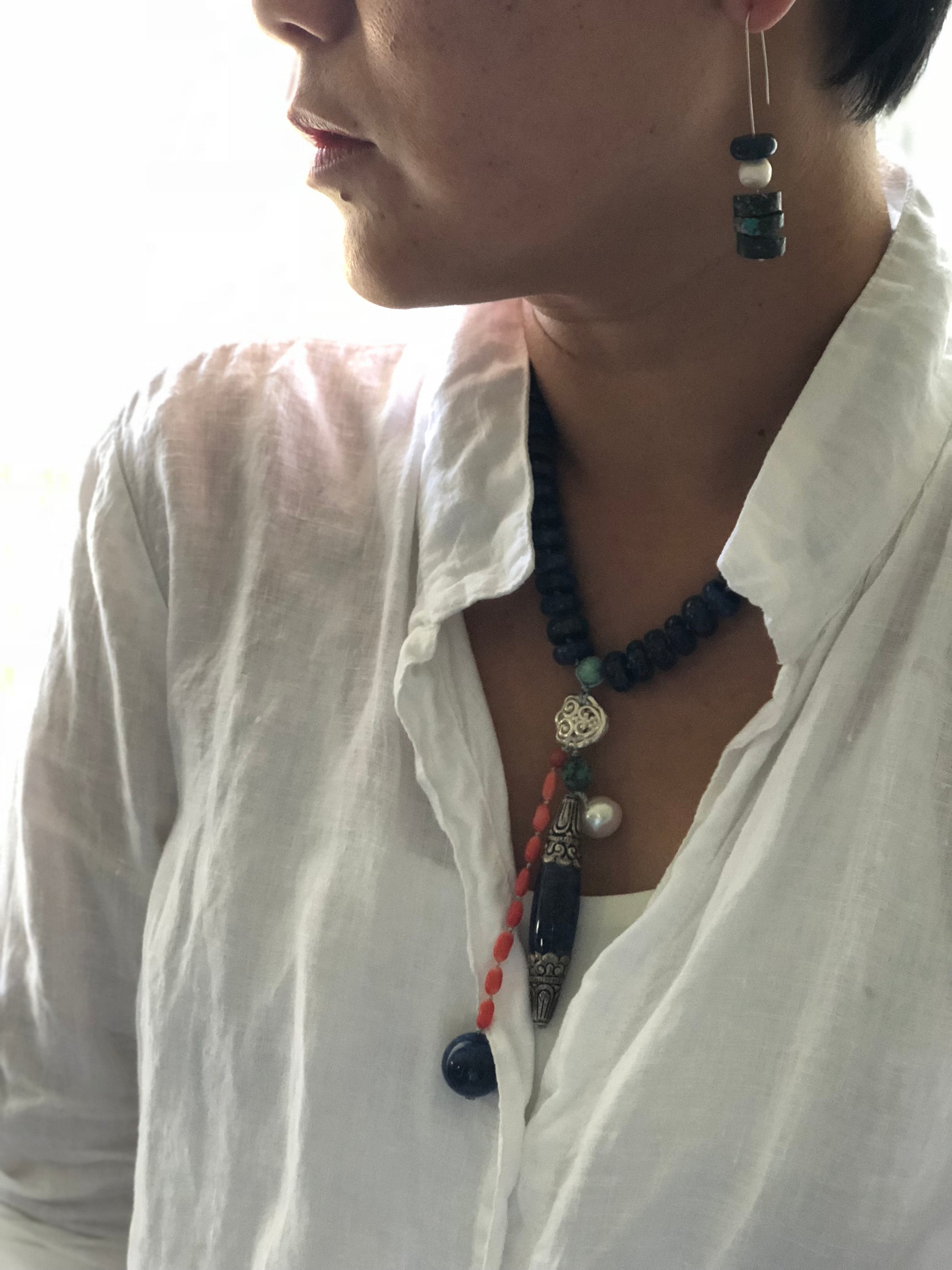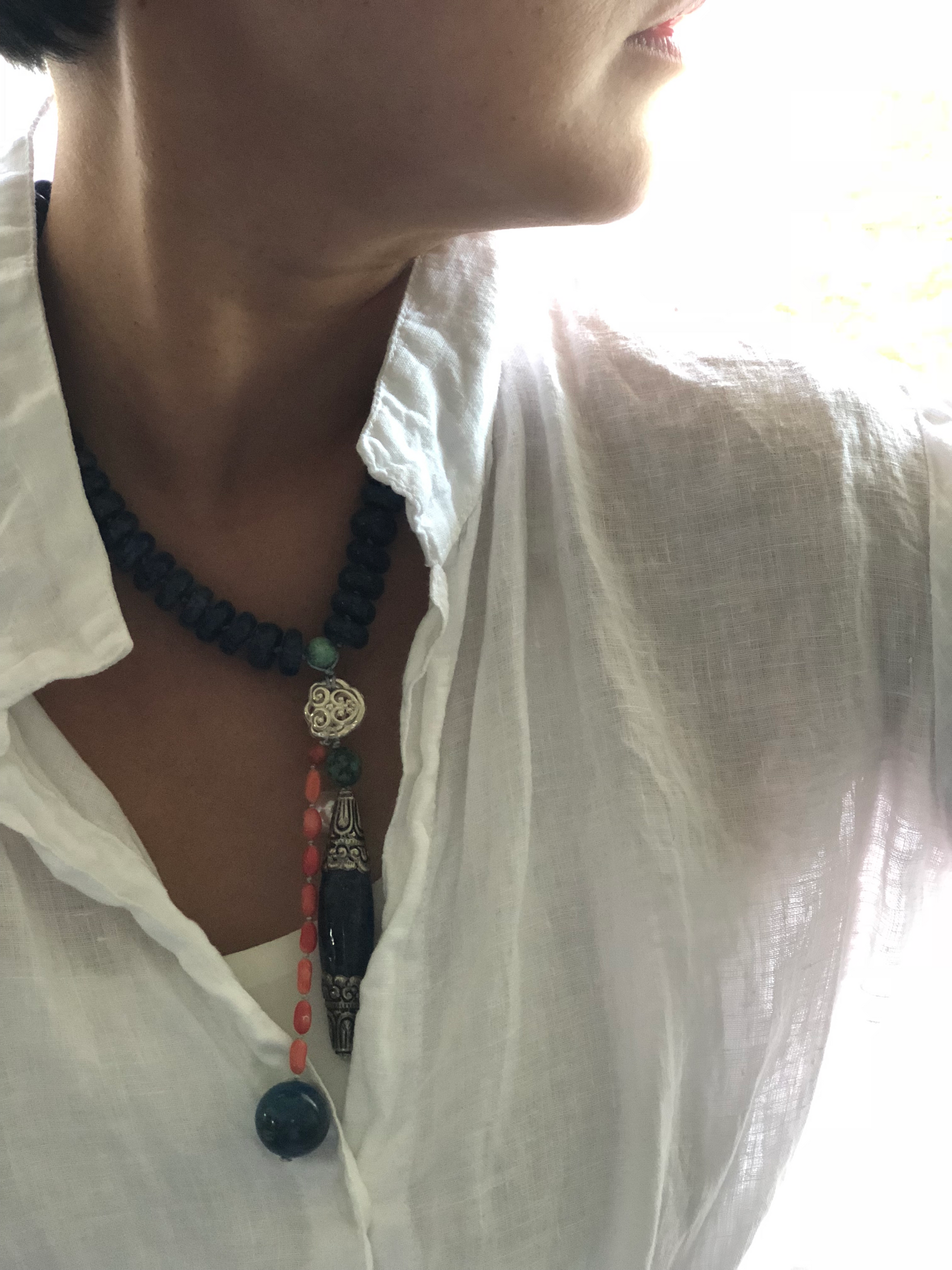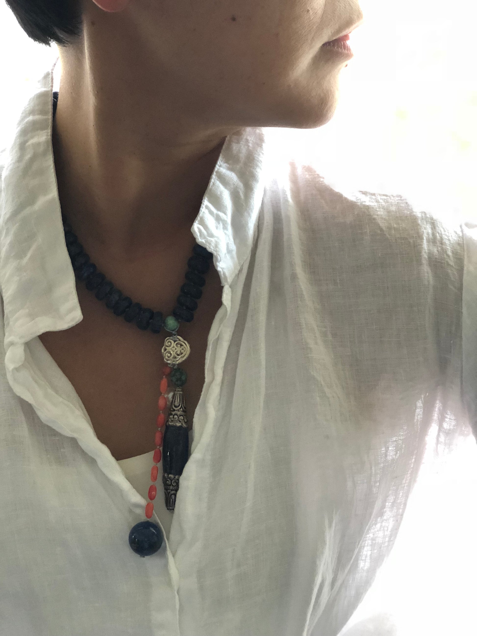 Materials : Lapis, red coral , fresh water pearl, Tibetan silver pendent with lapis