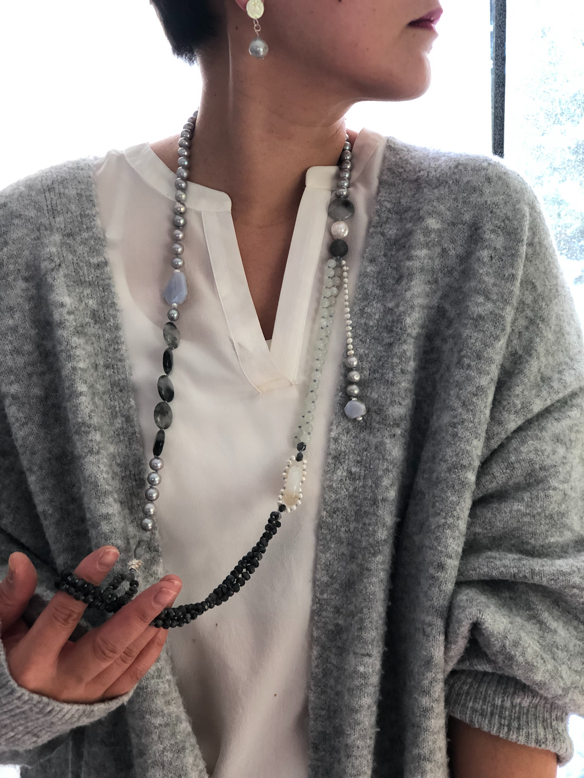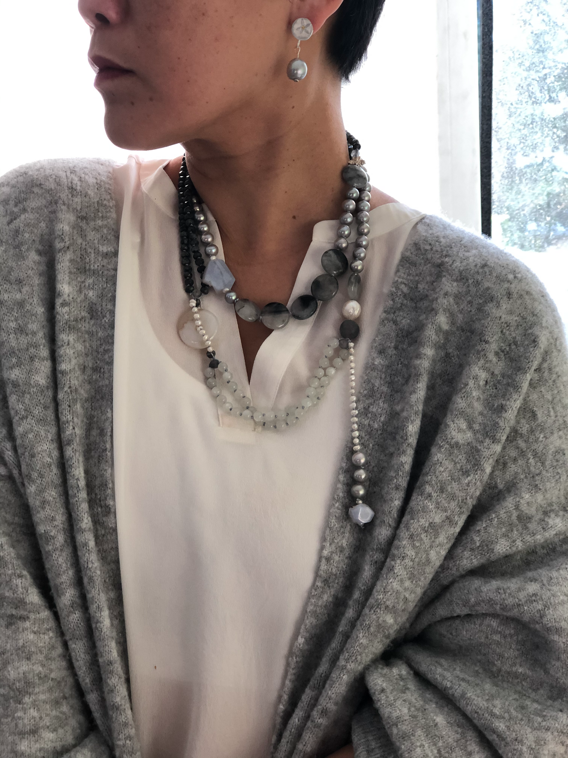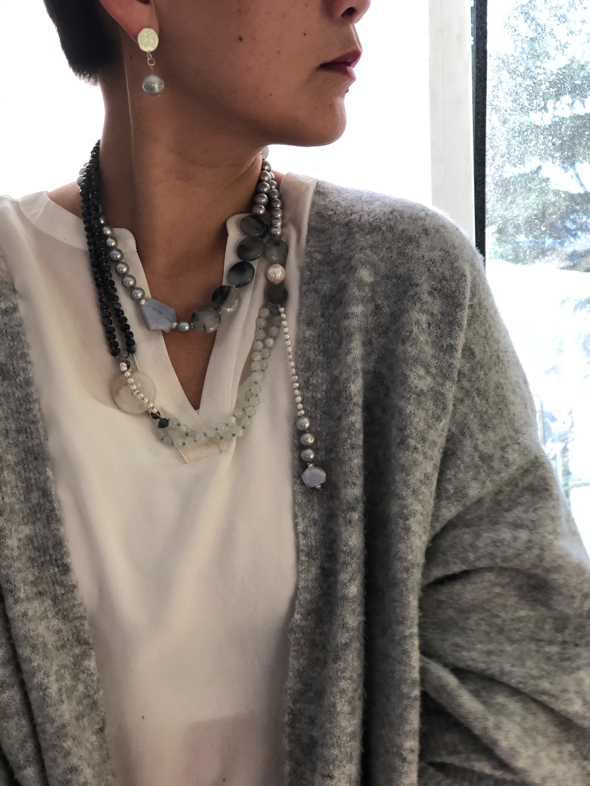 Materials : Fresh water pearl, grey quartz, blue lace agate