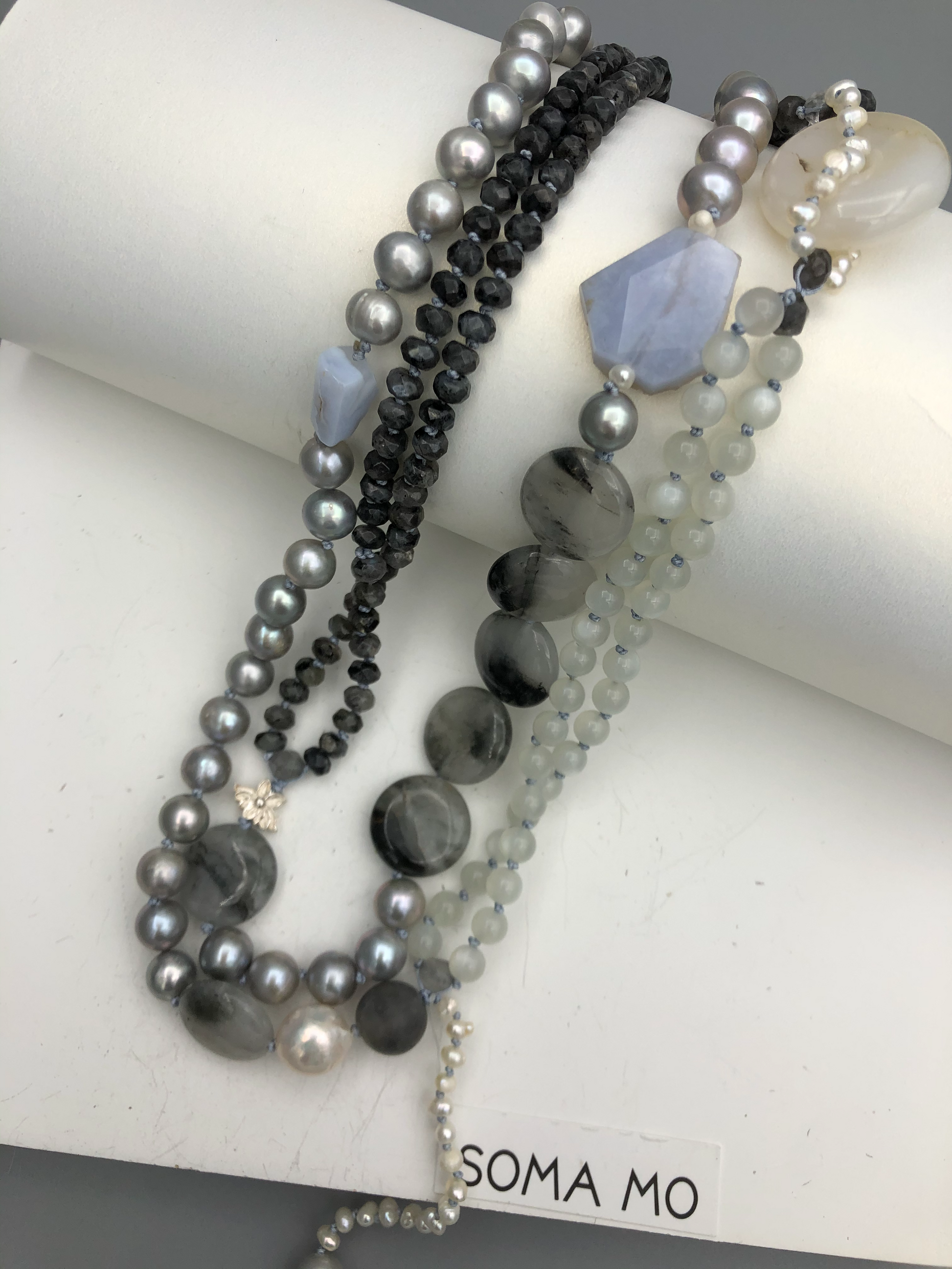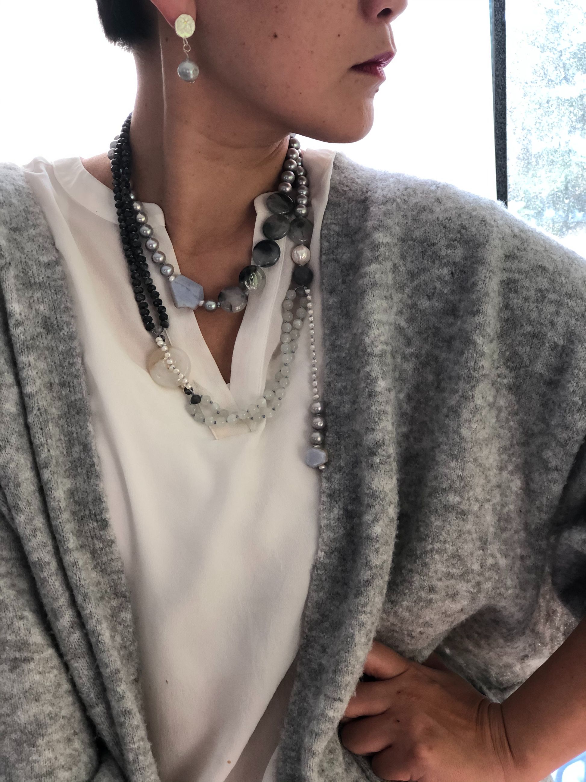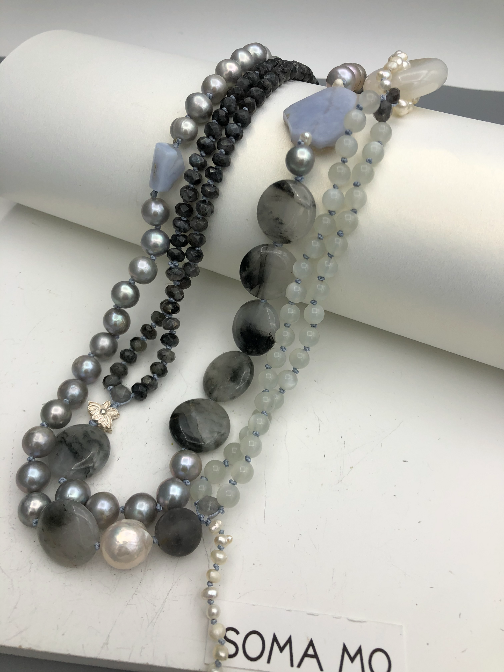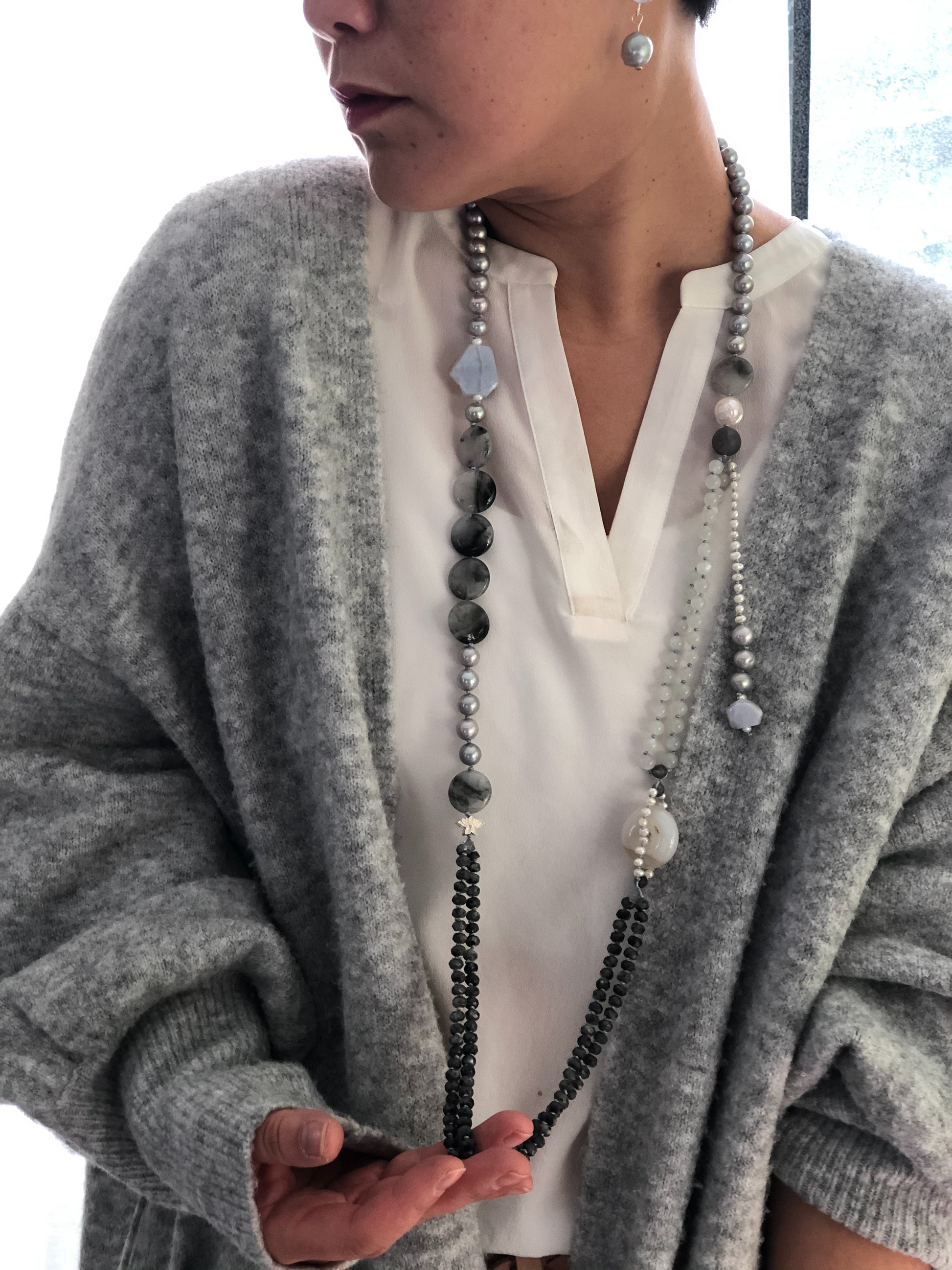 Materials : Fresh water pearl, grey quartz, blue lace agate