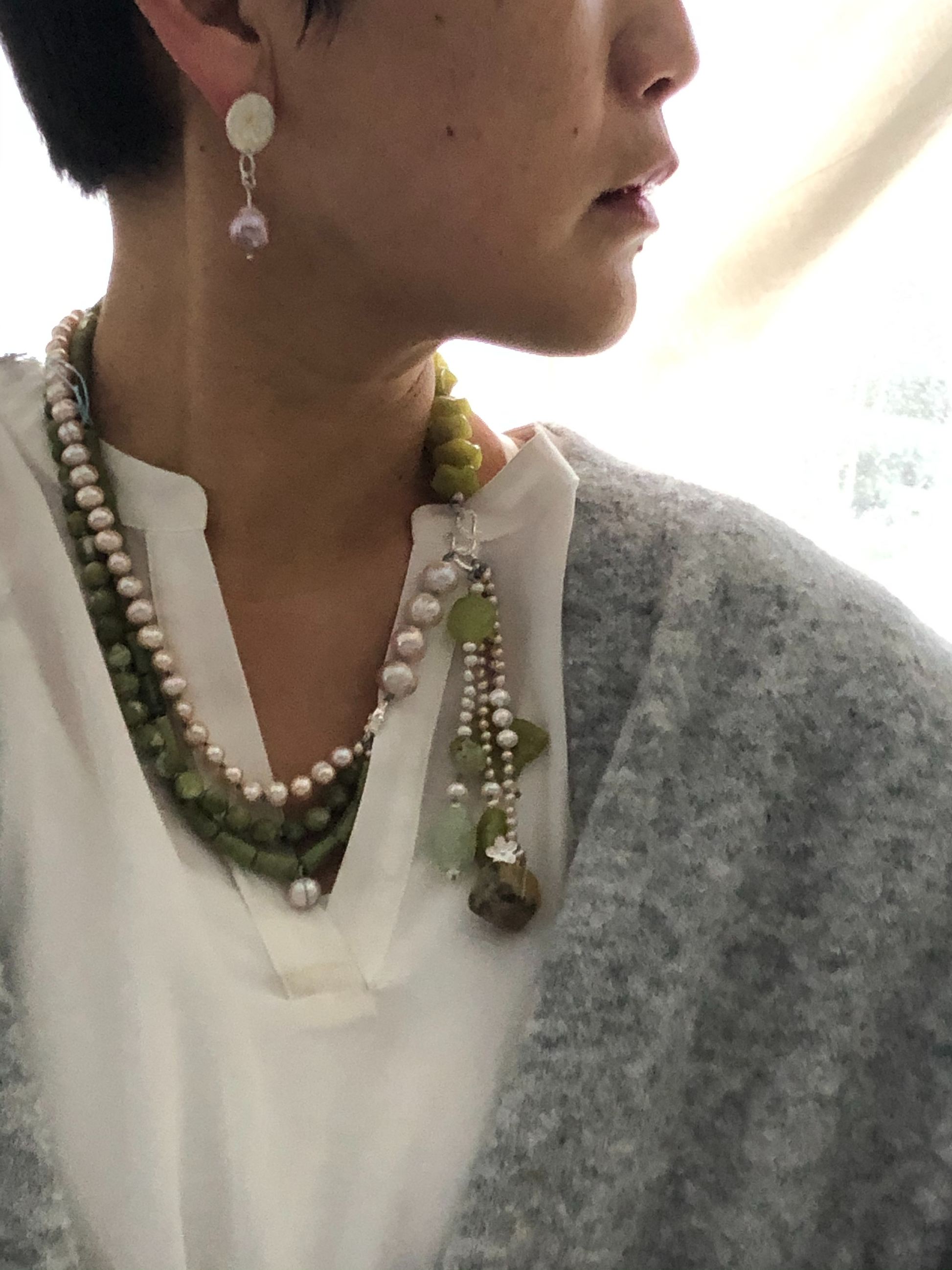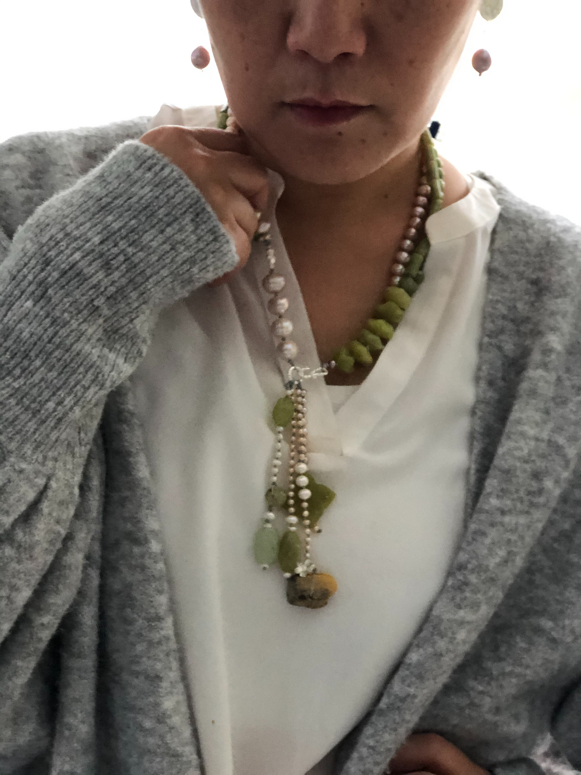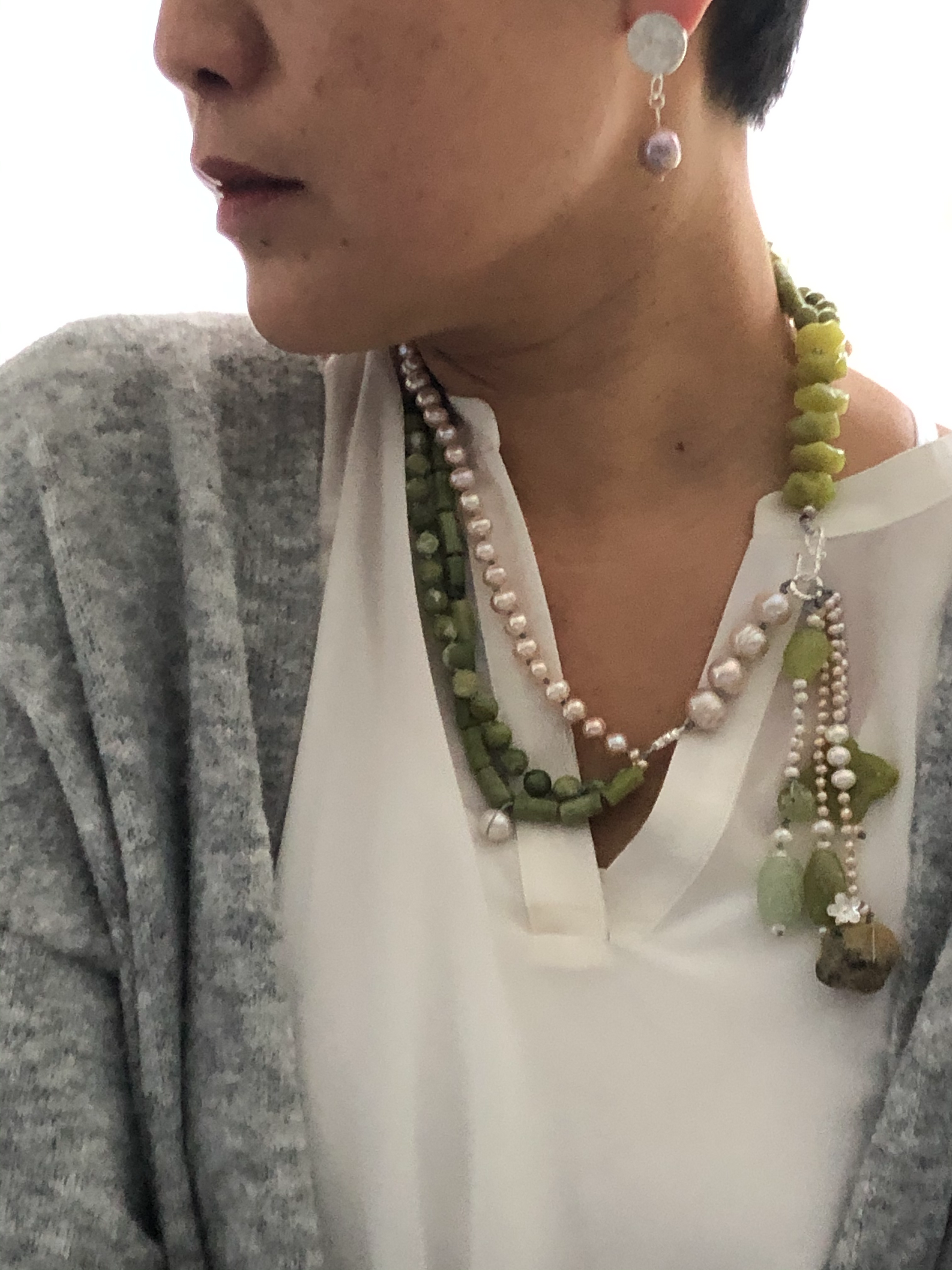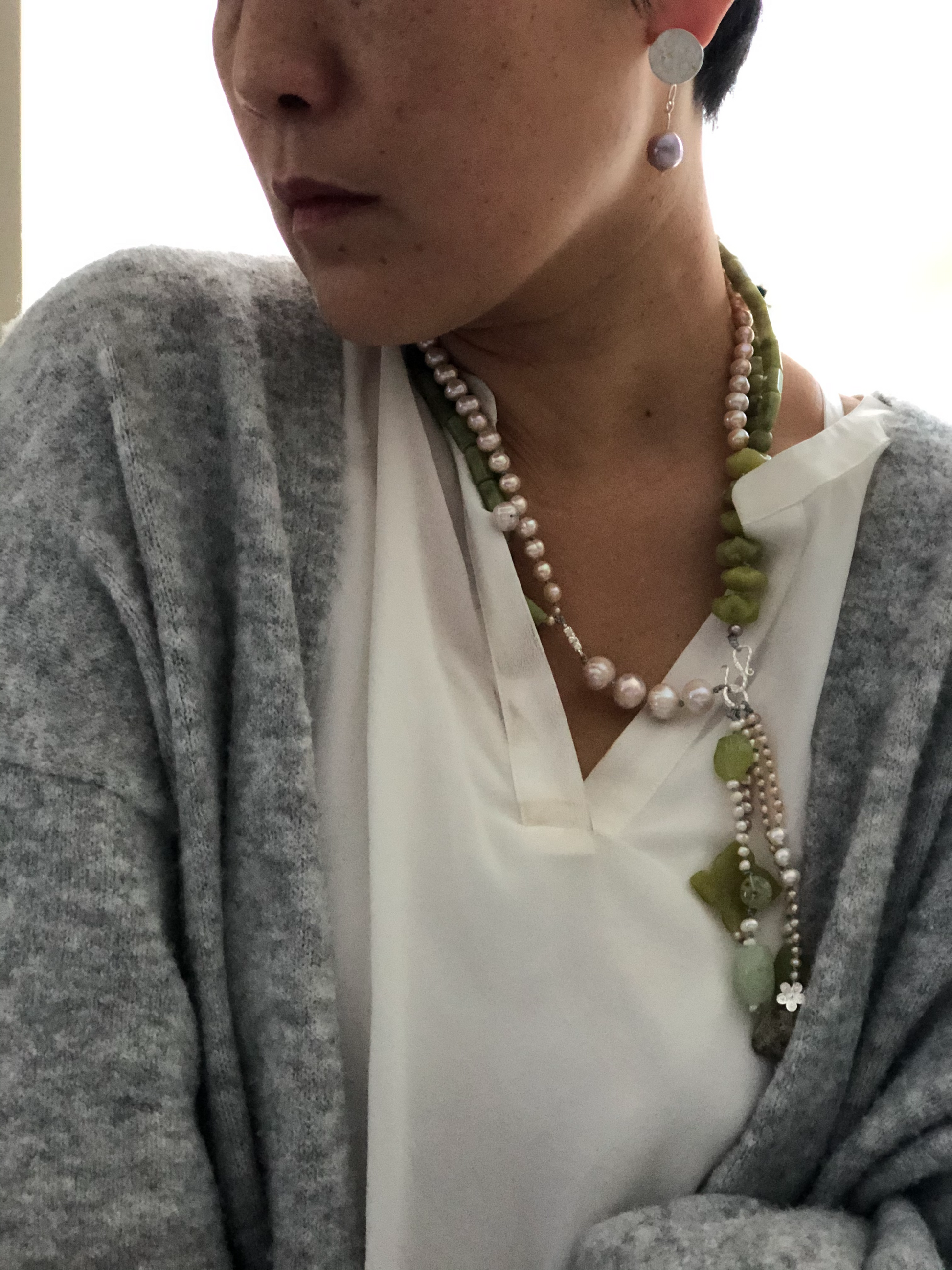 Materials : Olive jade, fresh water pearl, jade, fine silver