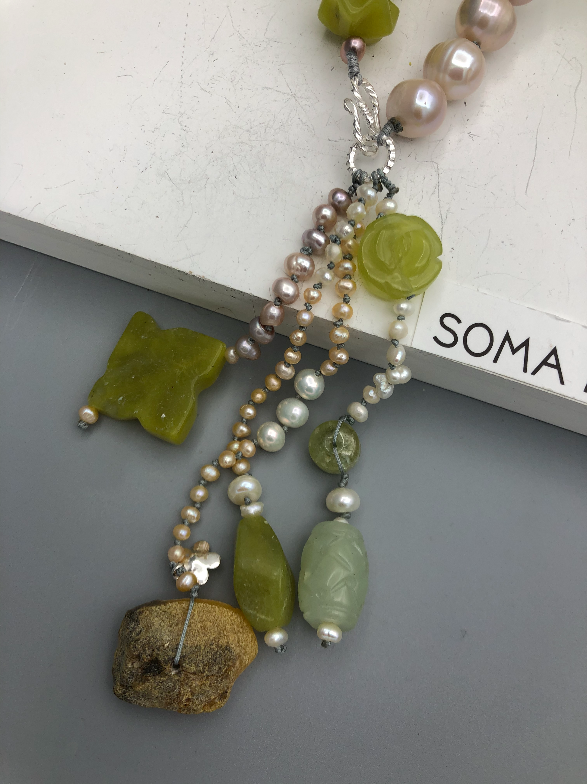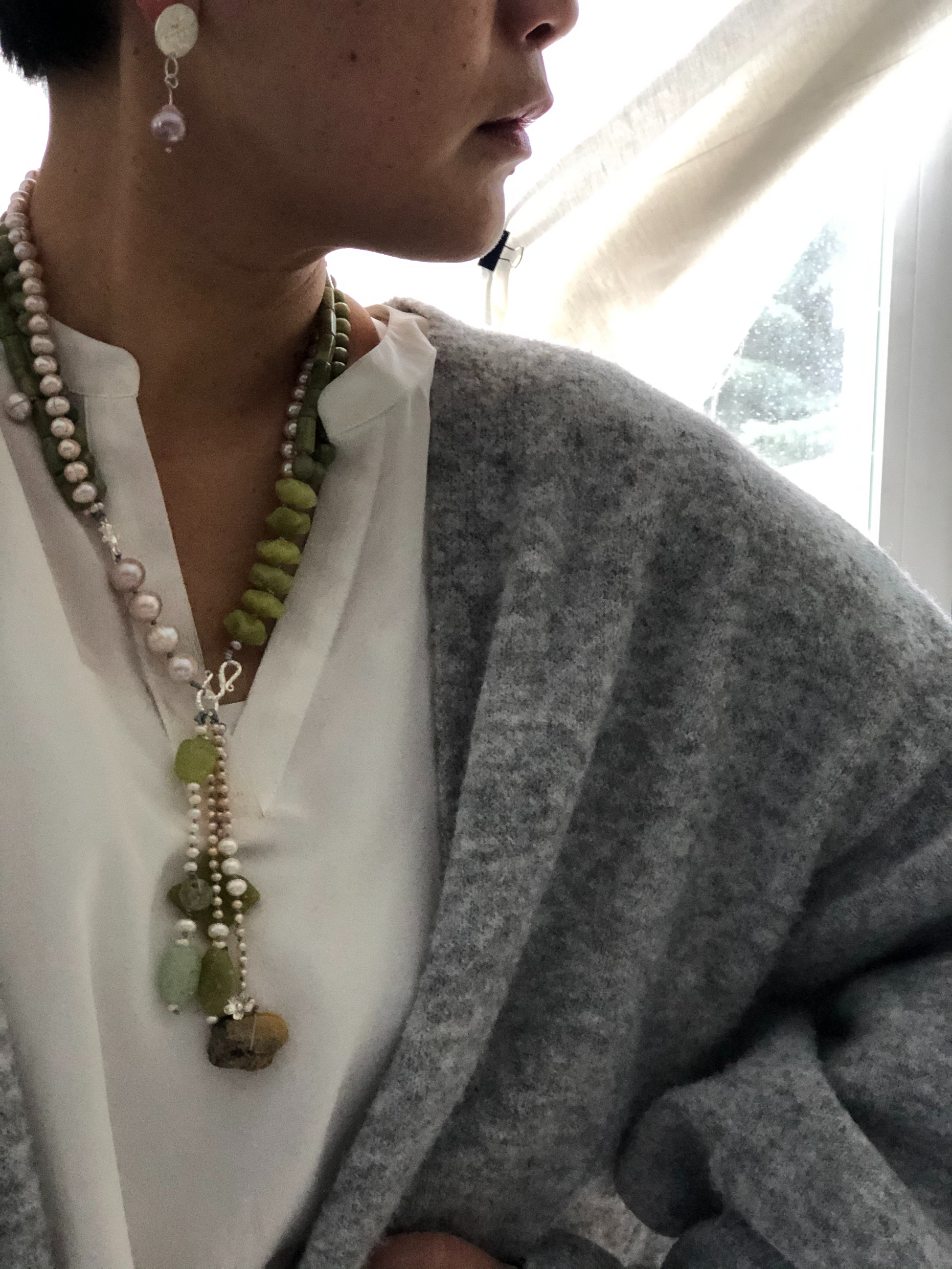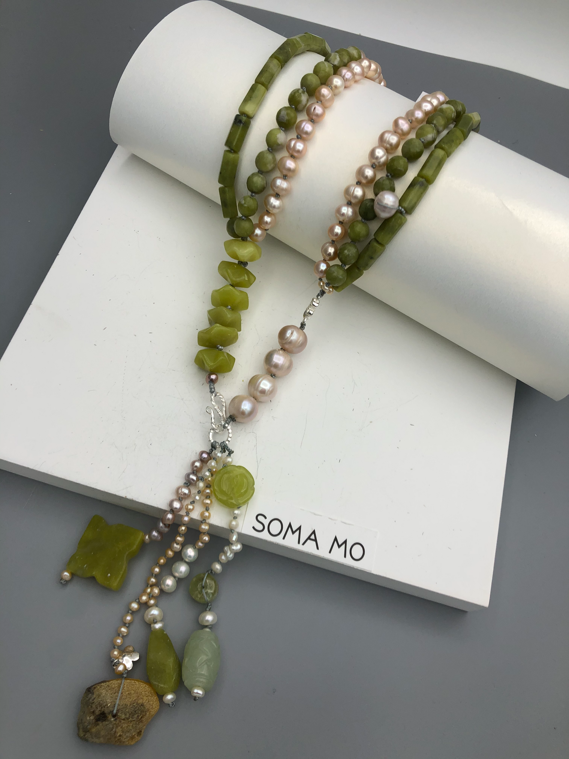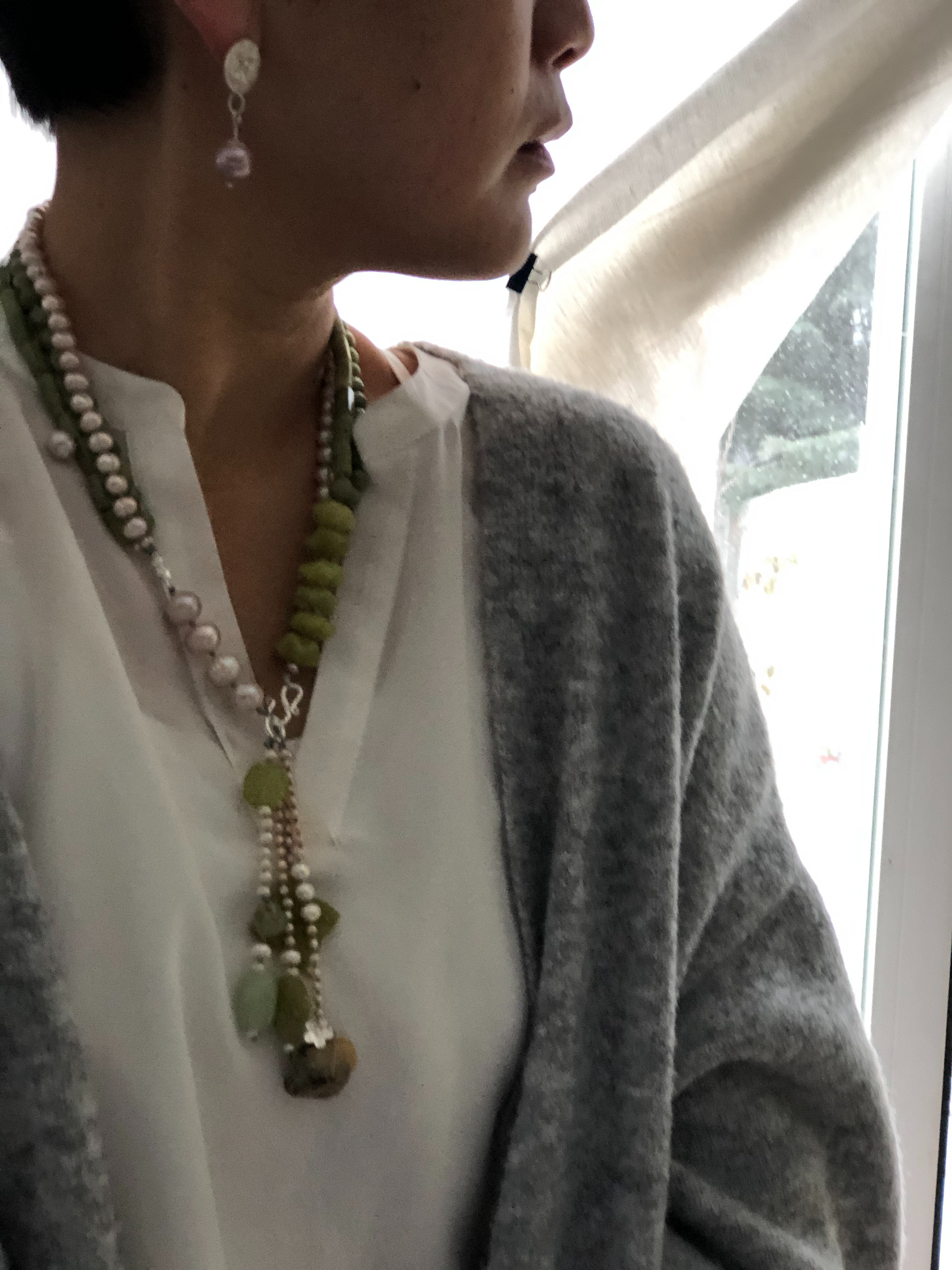 Materials : Olive jade, fresh water pearl, jade, fine silver