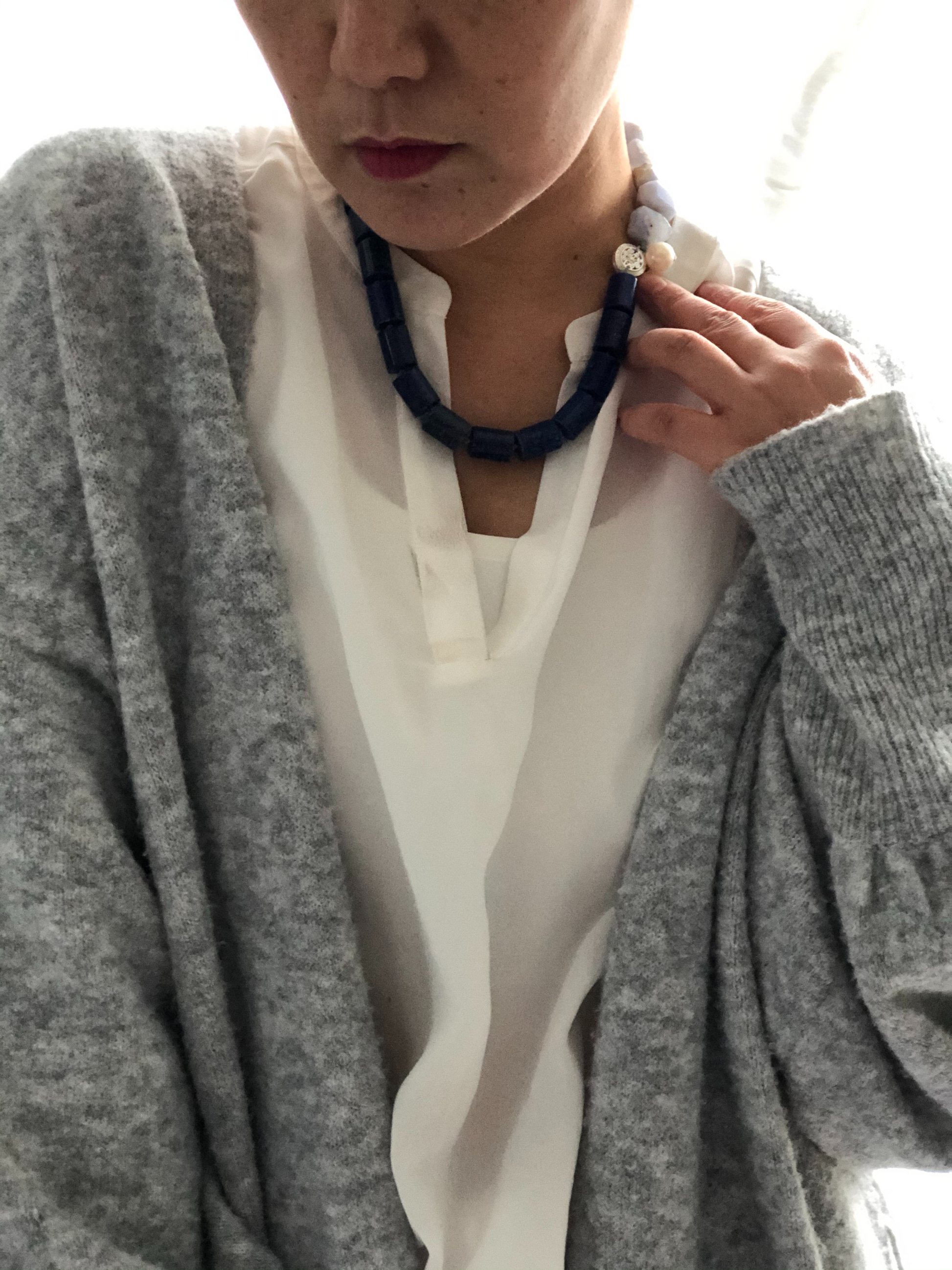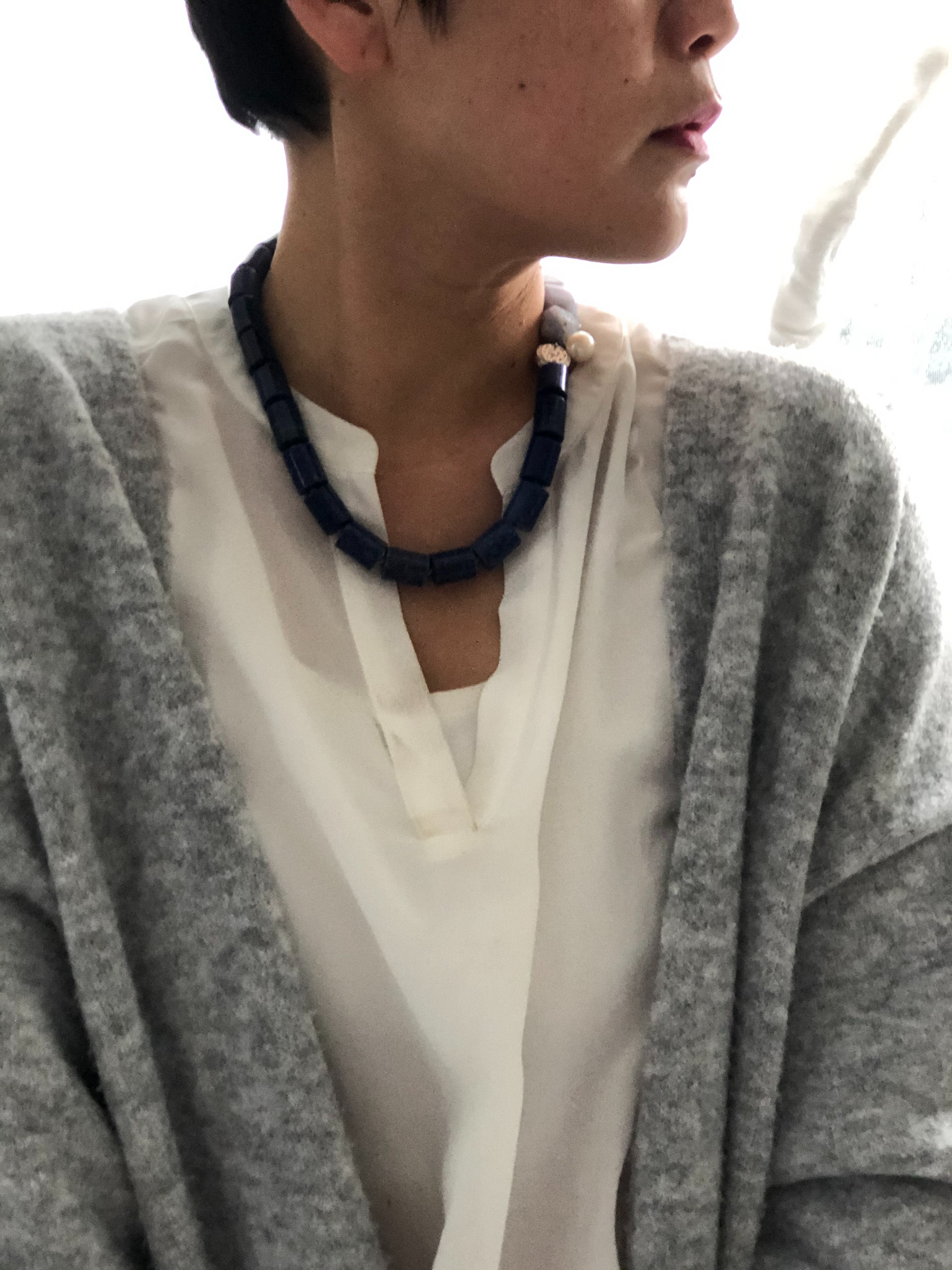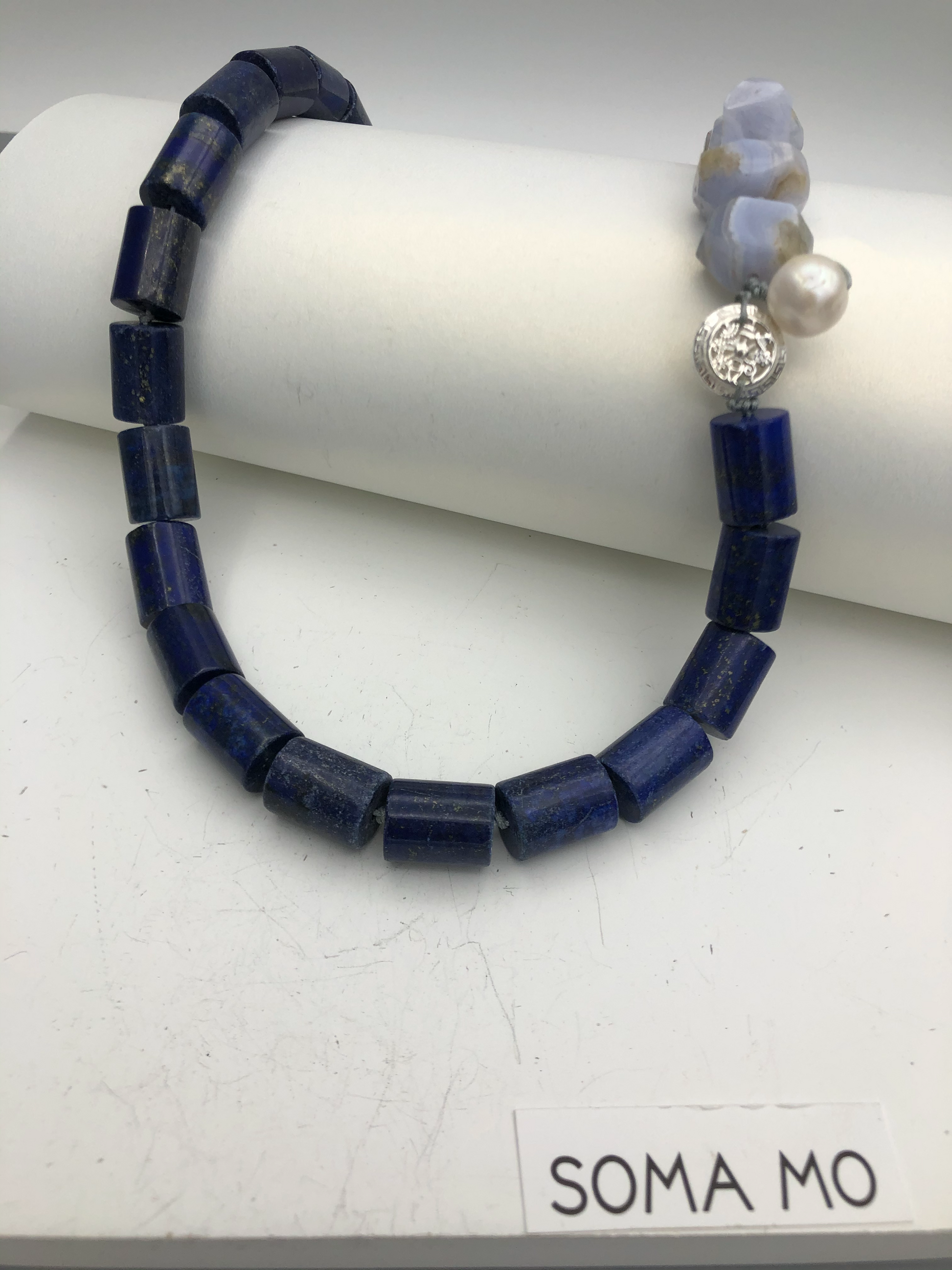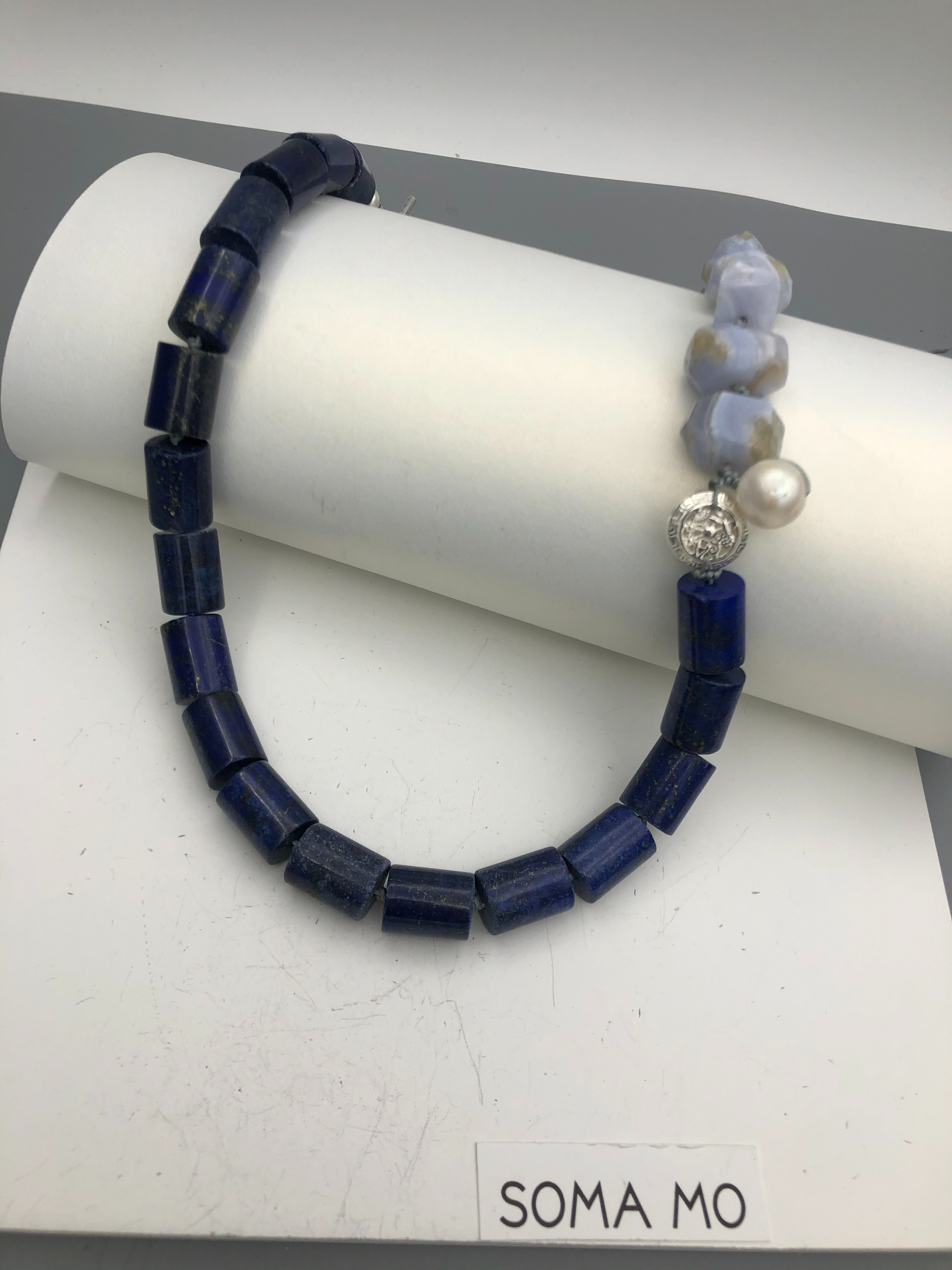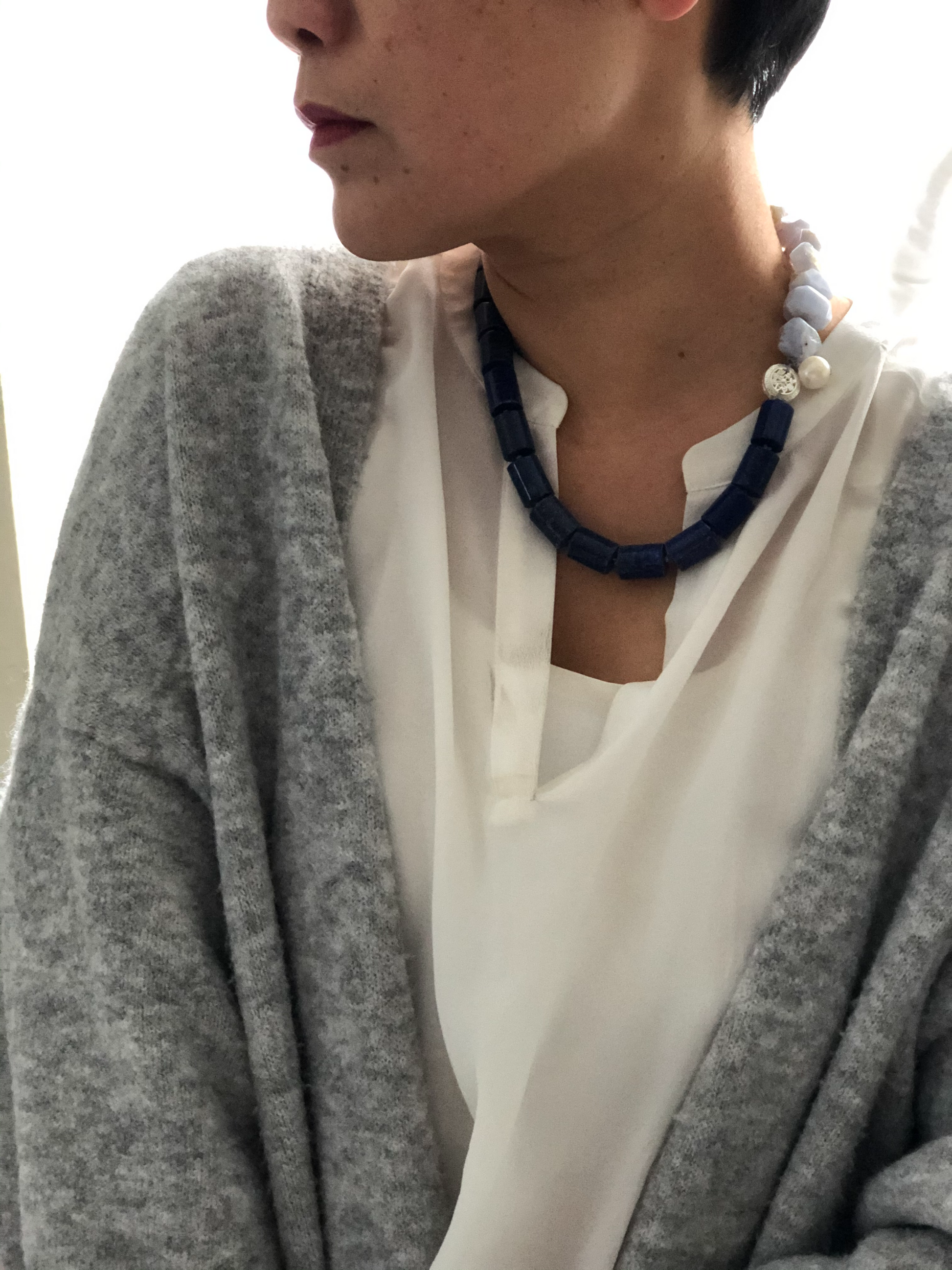 Materials : Lapis, blue lace agate, fresh water pearl ,fine silver
