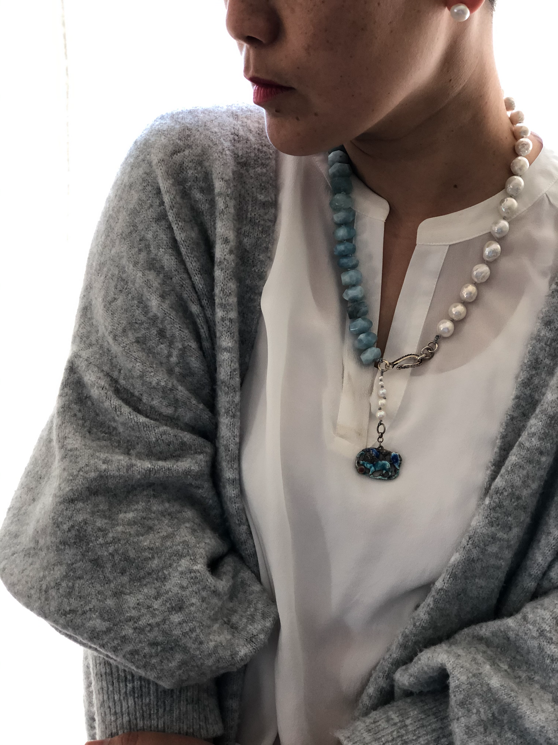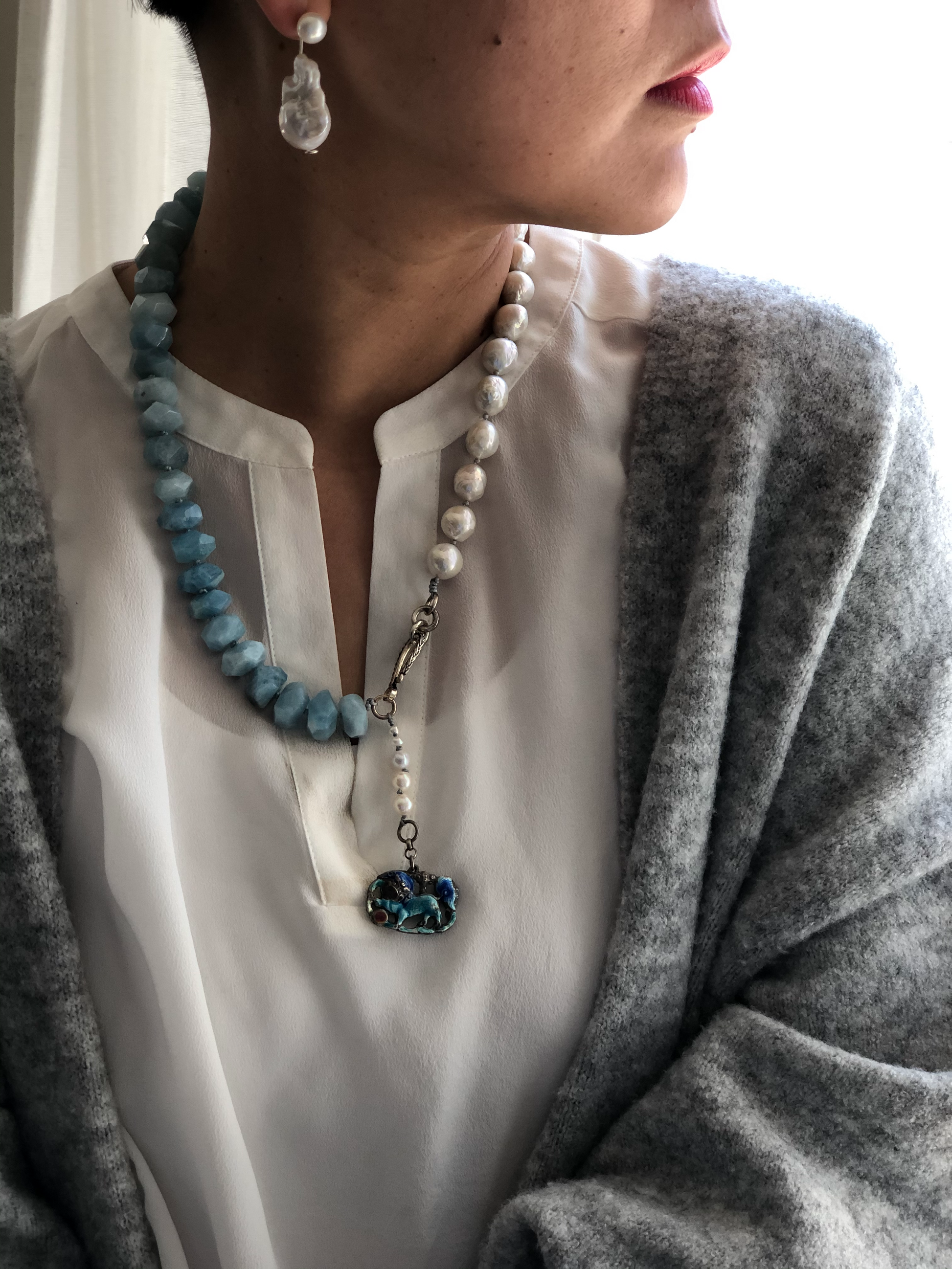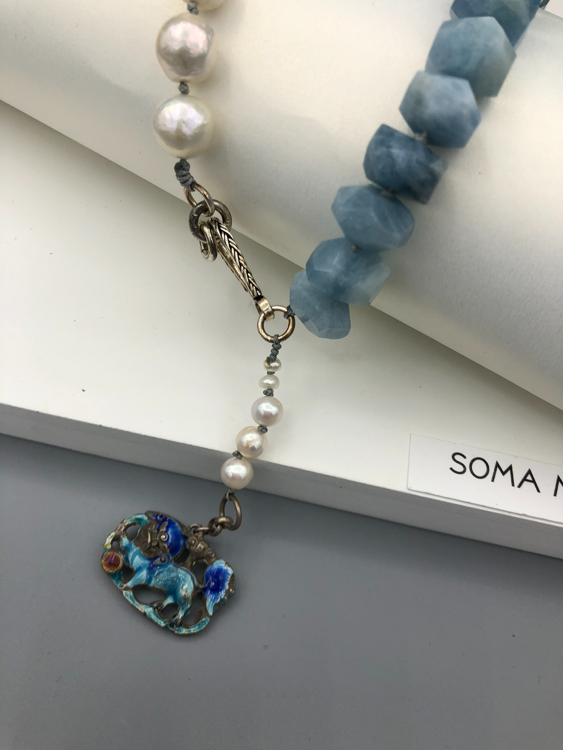 Materials : Aquamarine , fresh water pearl, silver enamel pendent
