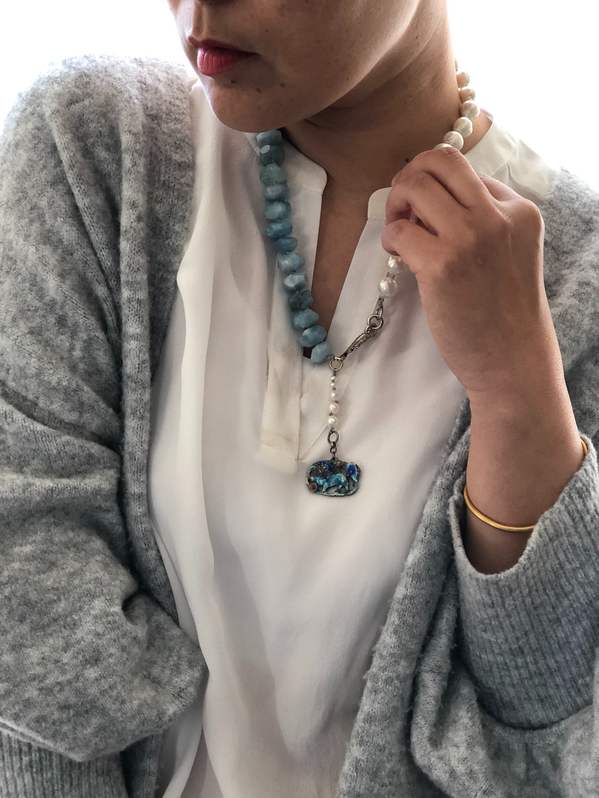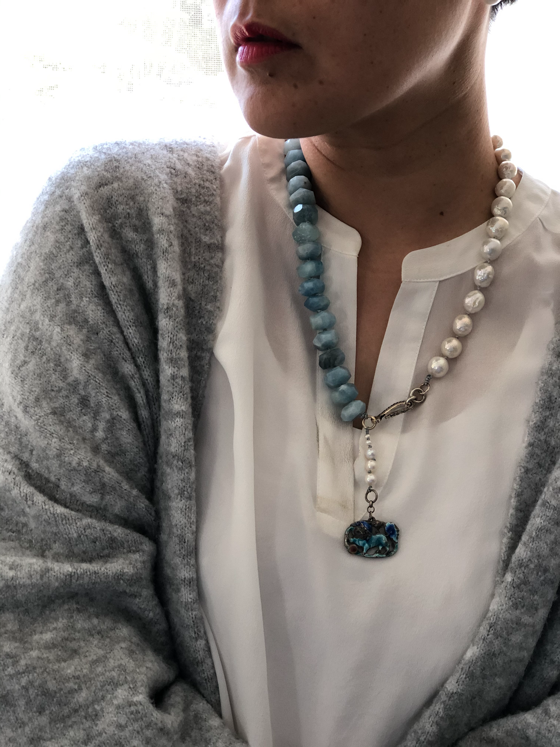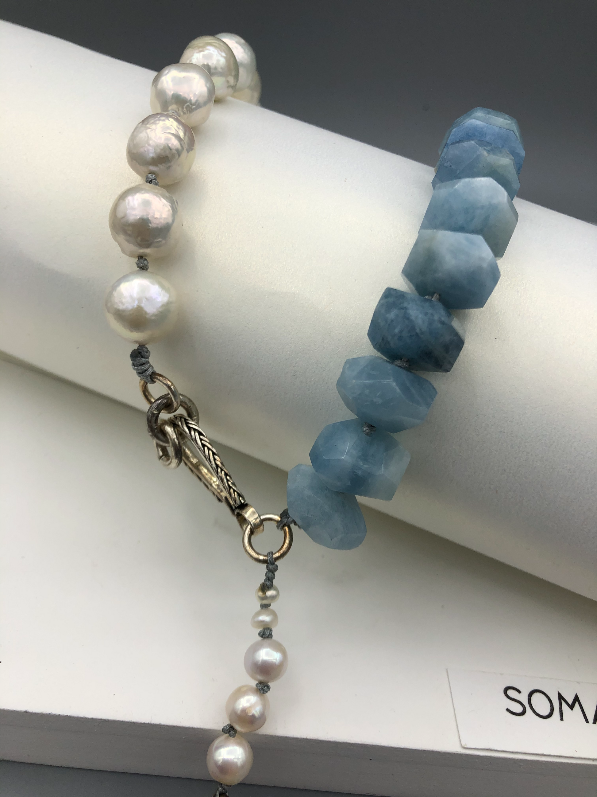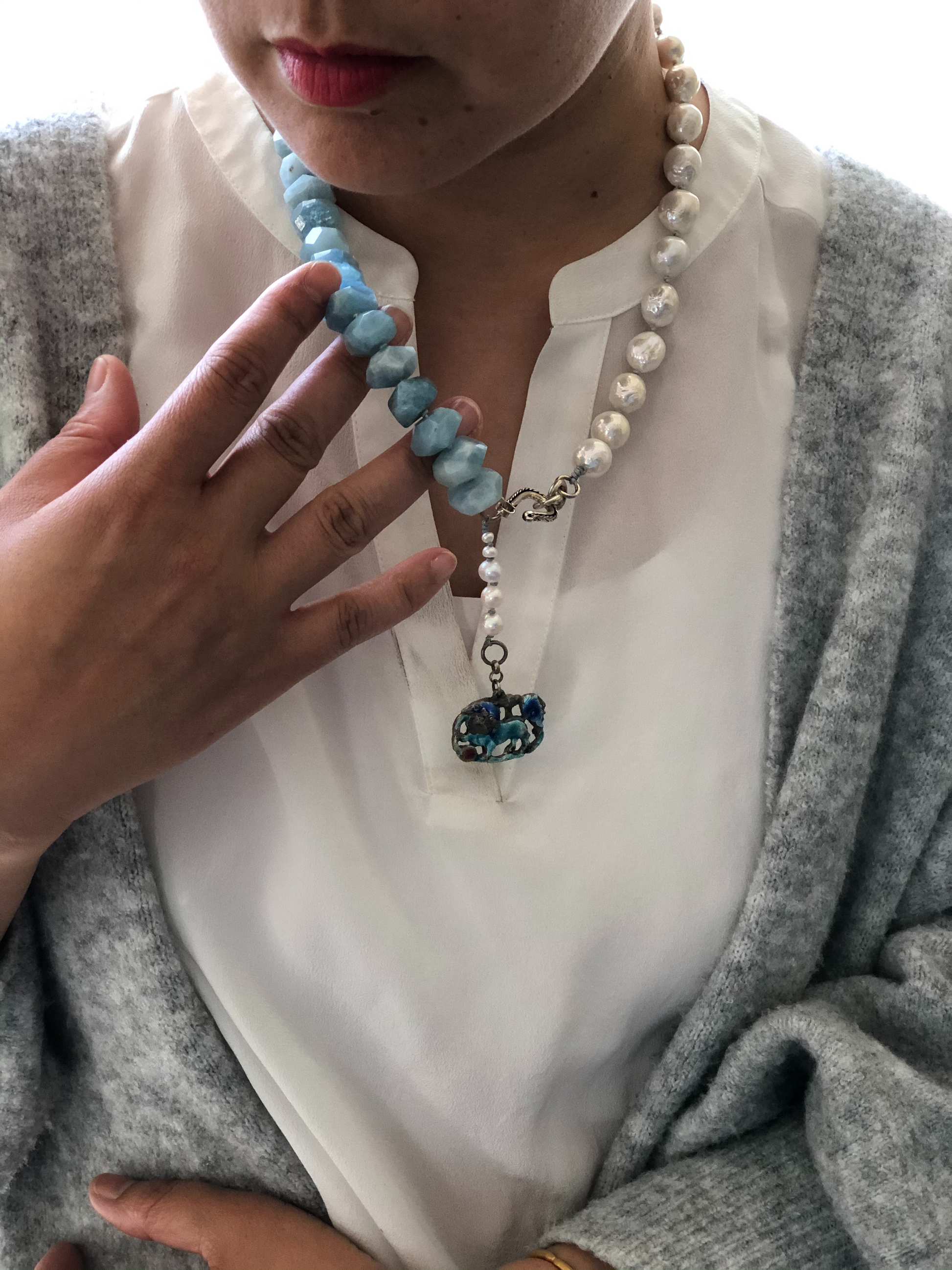 Materials : Aquamarine , fresh water pearl, silver enamel pendent