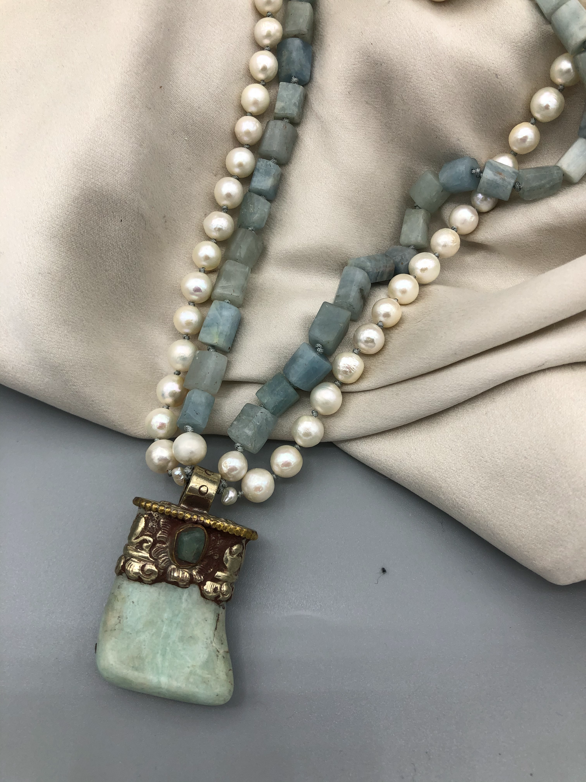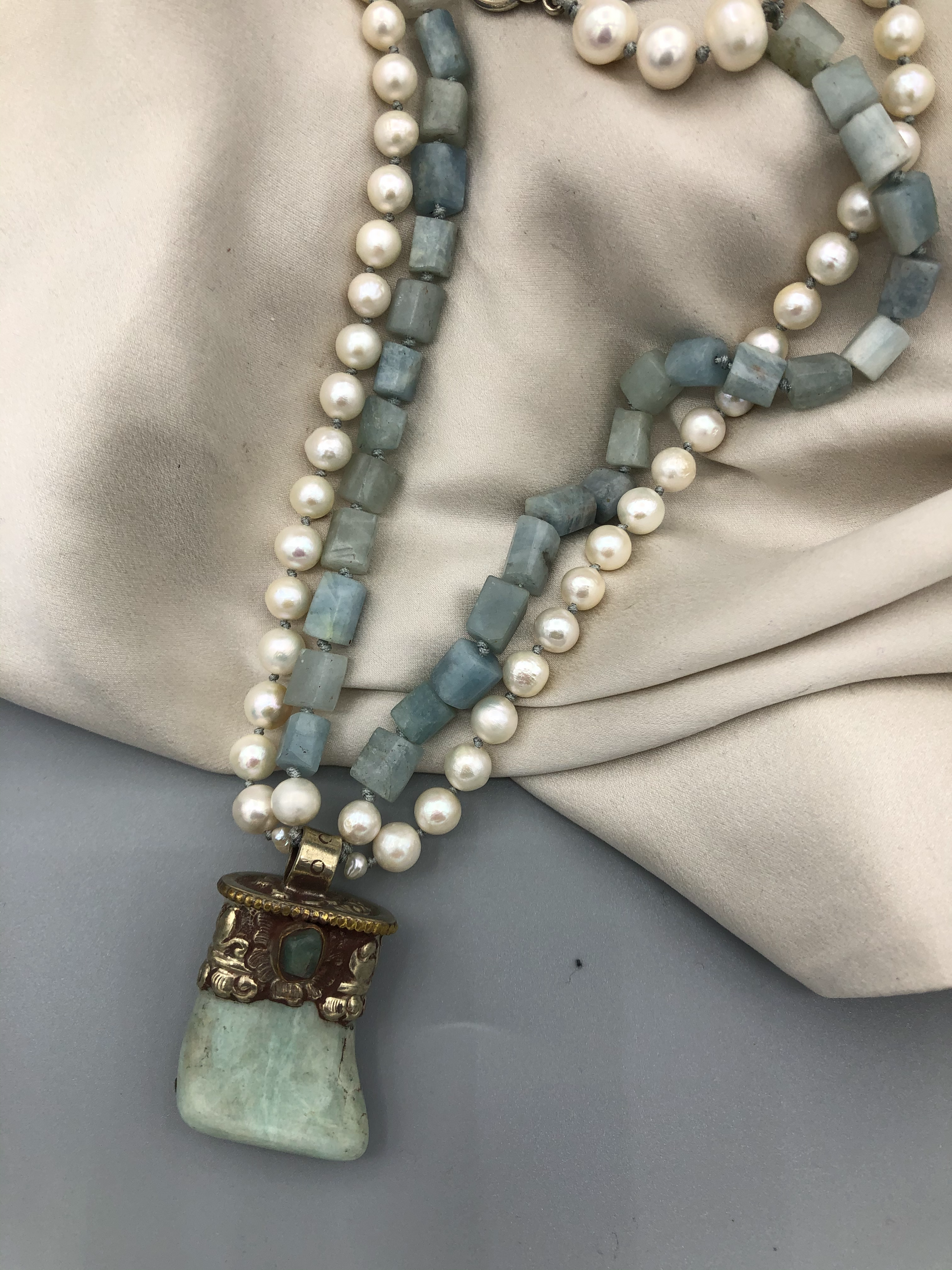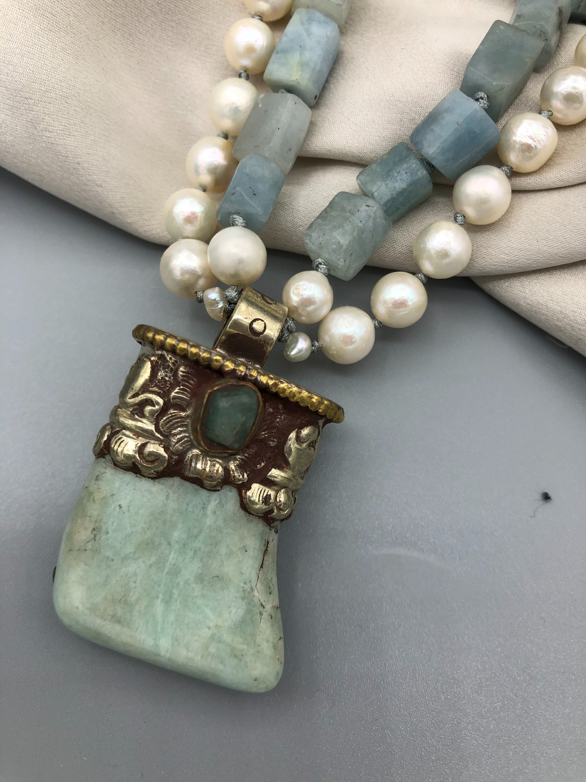 Materials : Aquamarine, fresh water pearl , Tibetan pendent with aquamarine