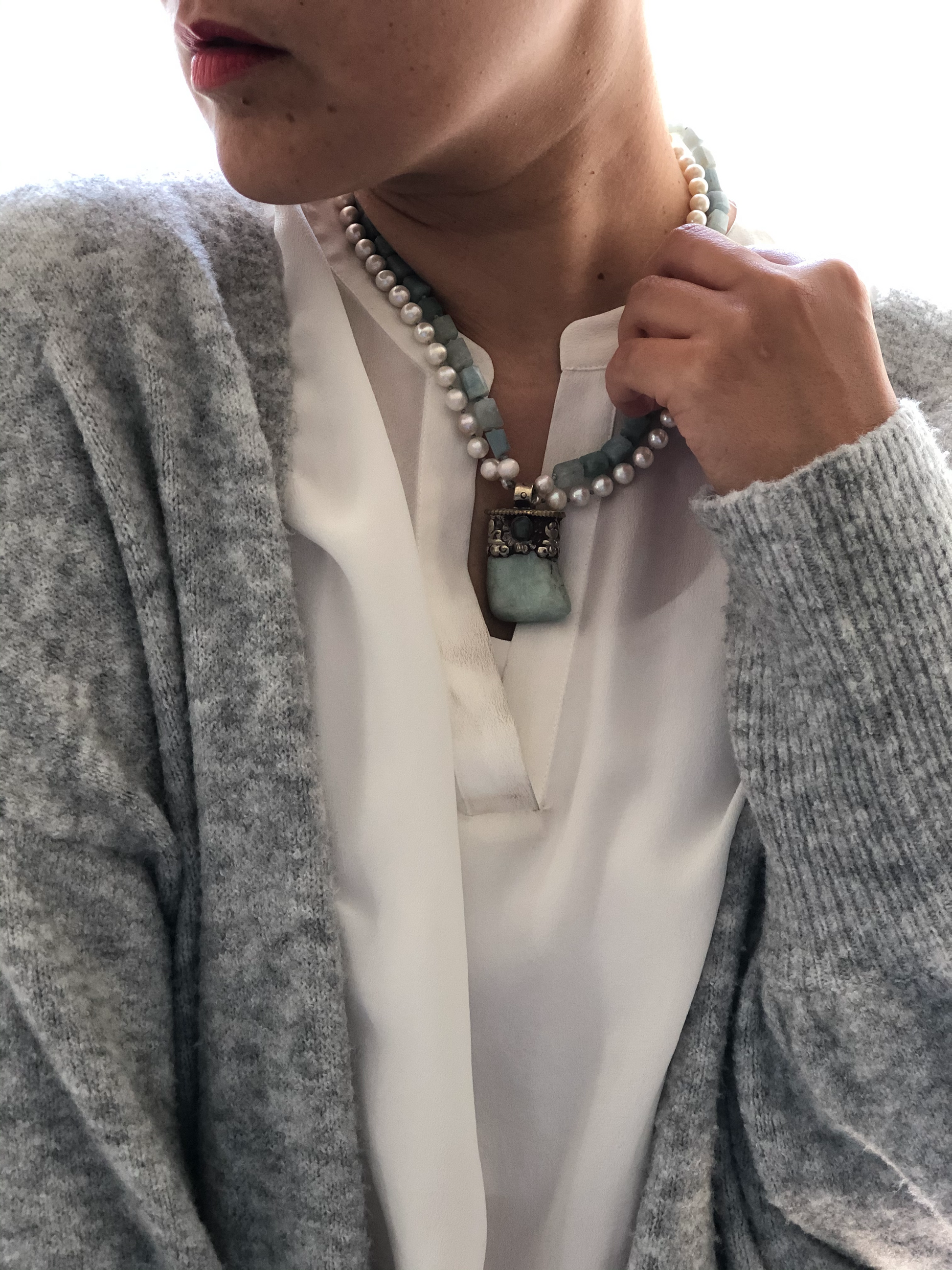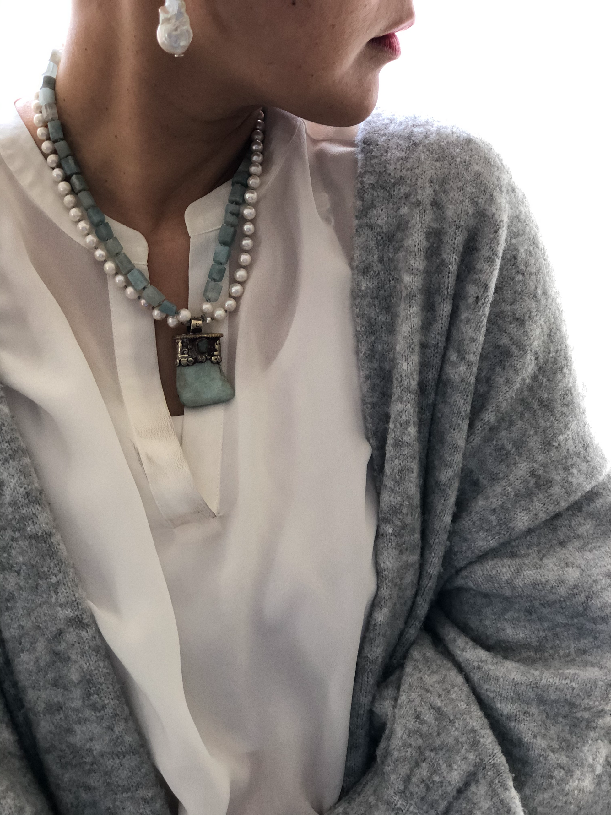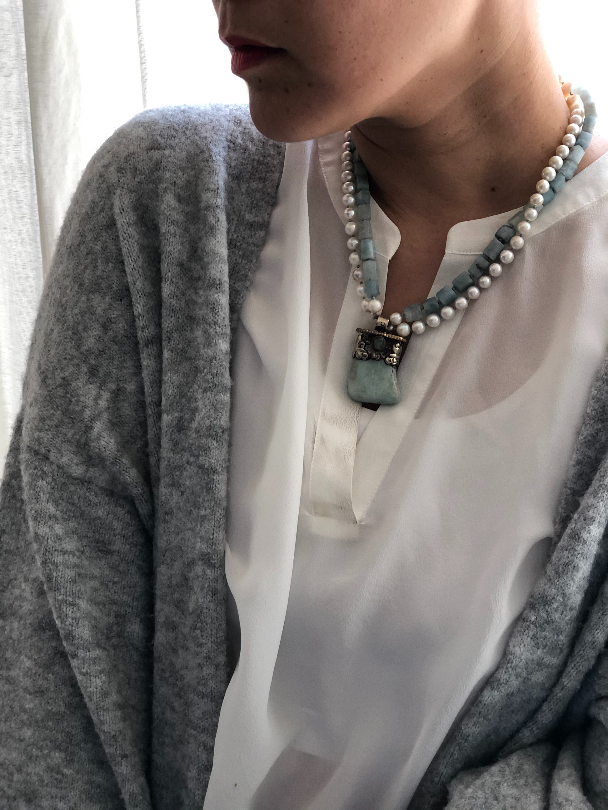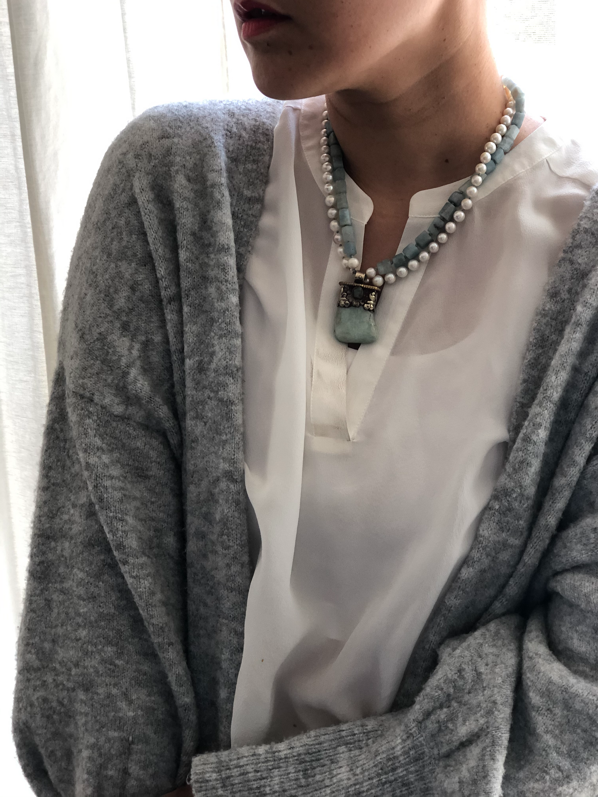 Materials : Aquamarine, fresh water pearl , Tibetan pendent with aquamarine