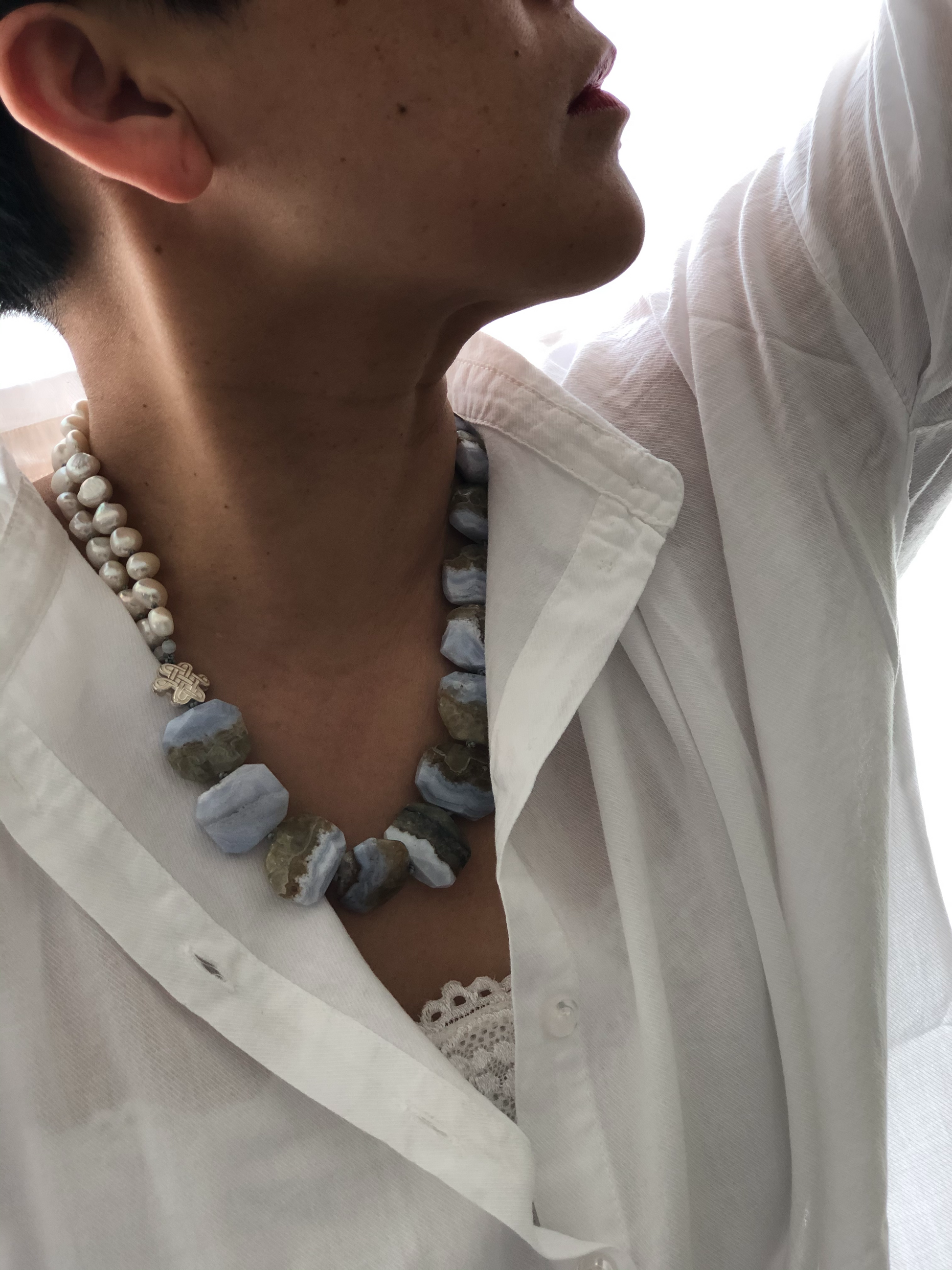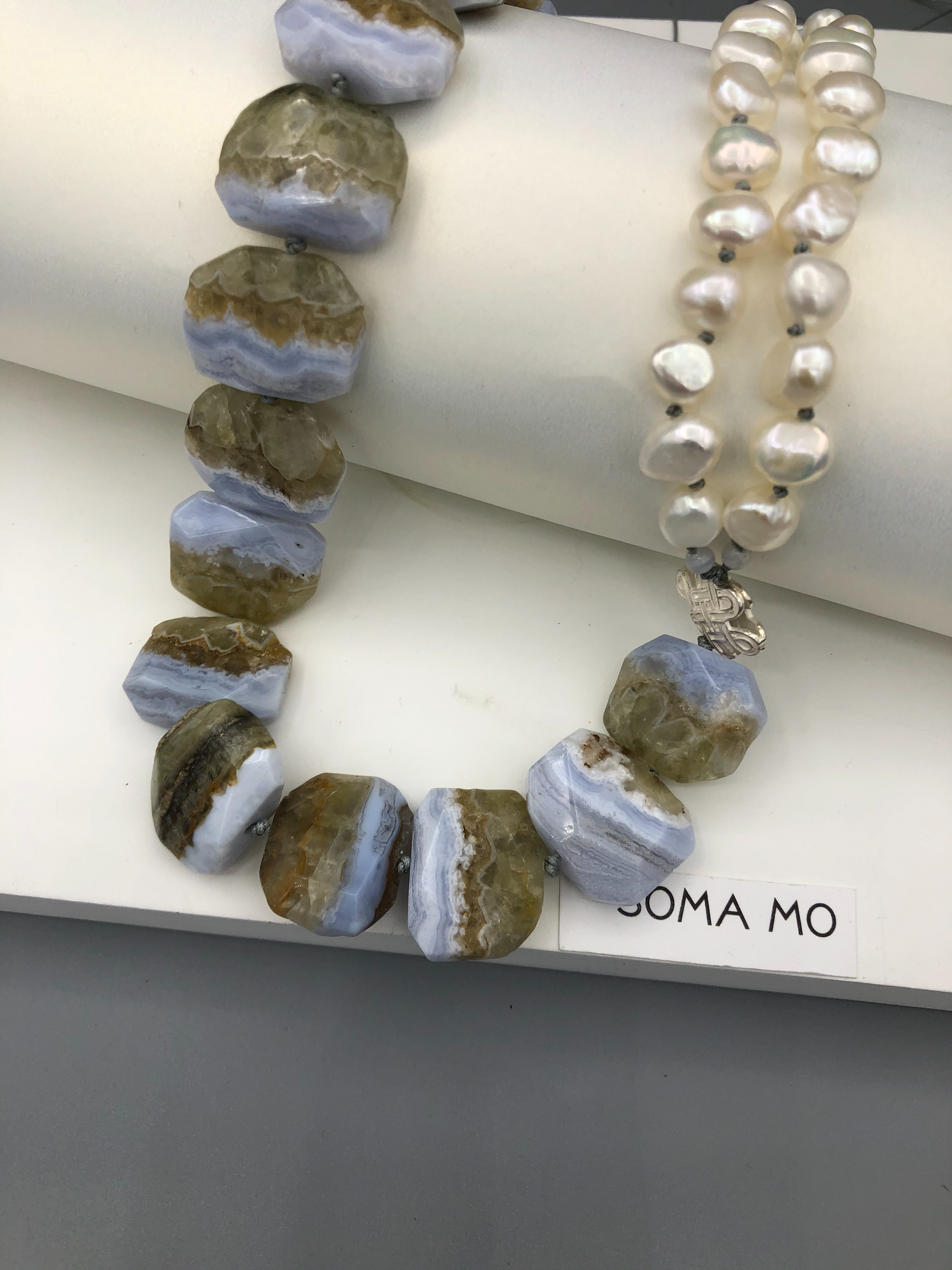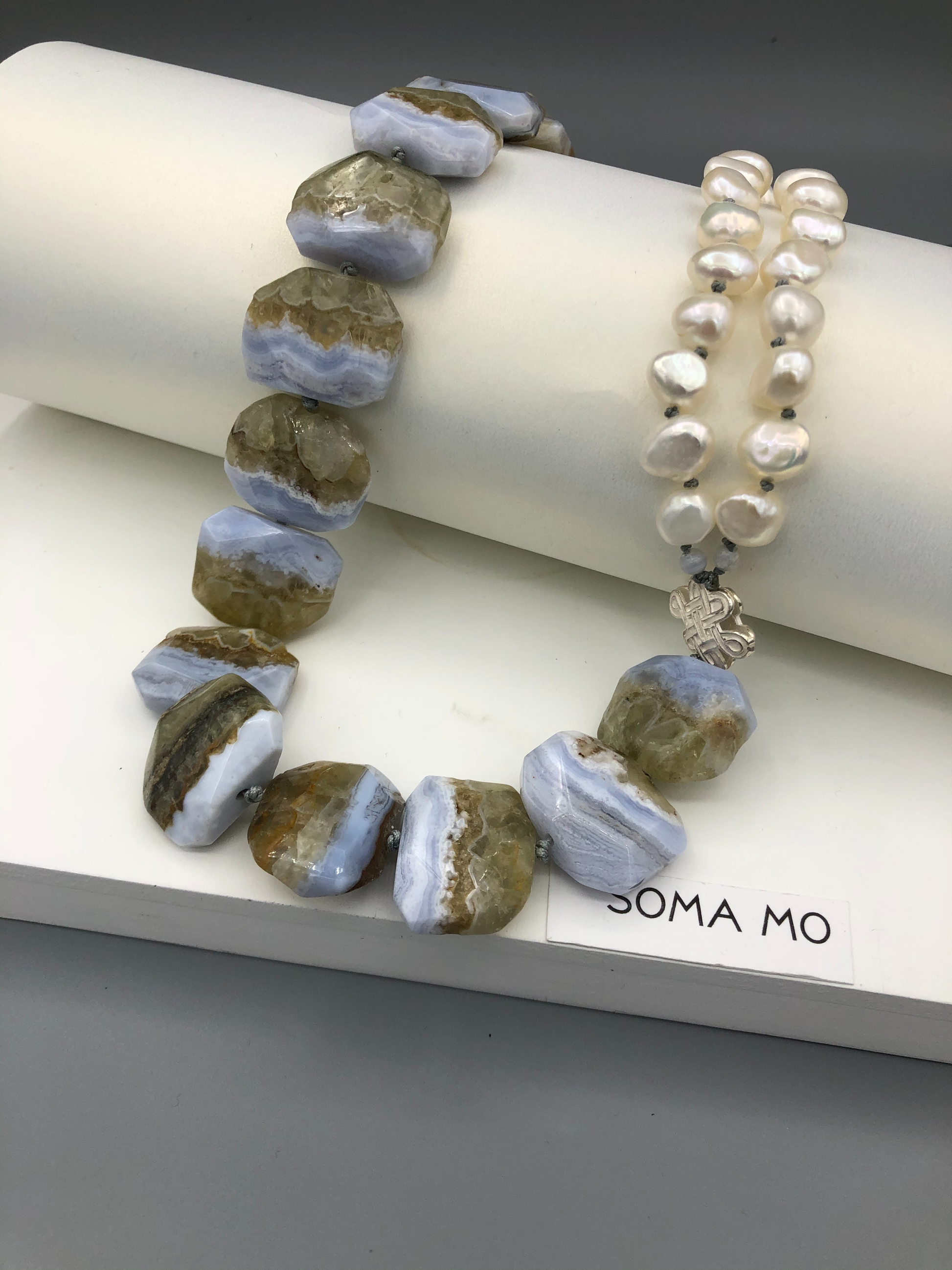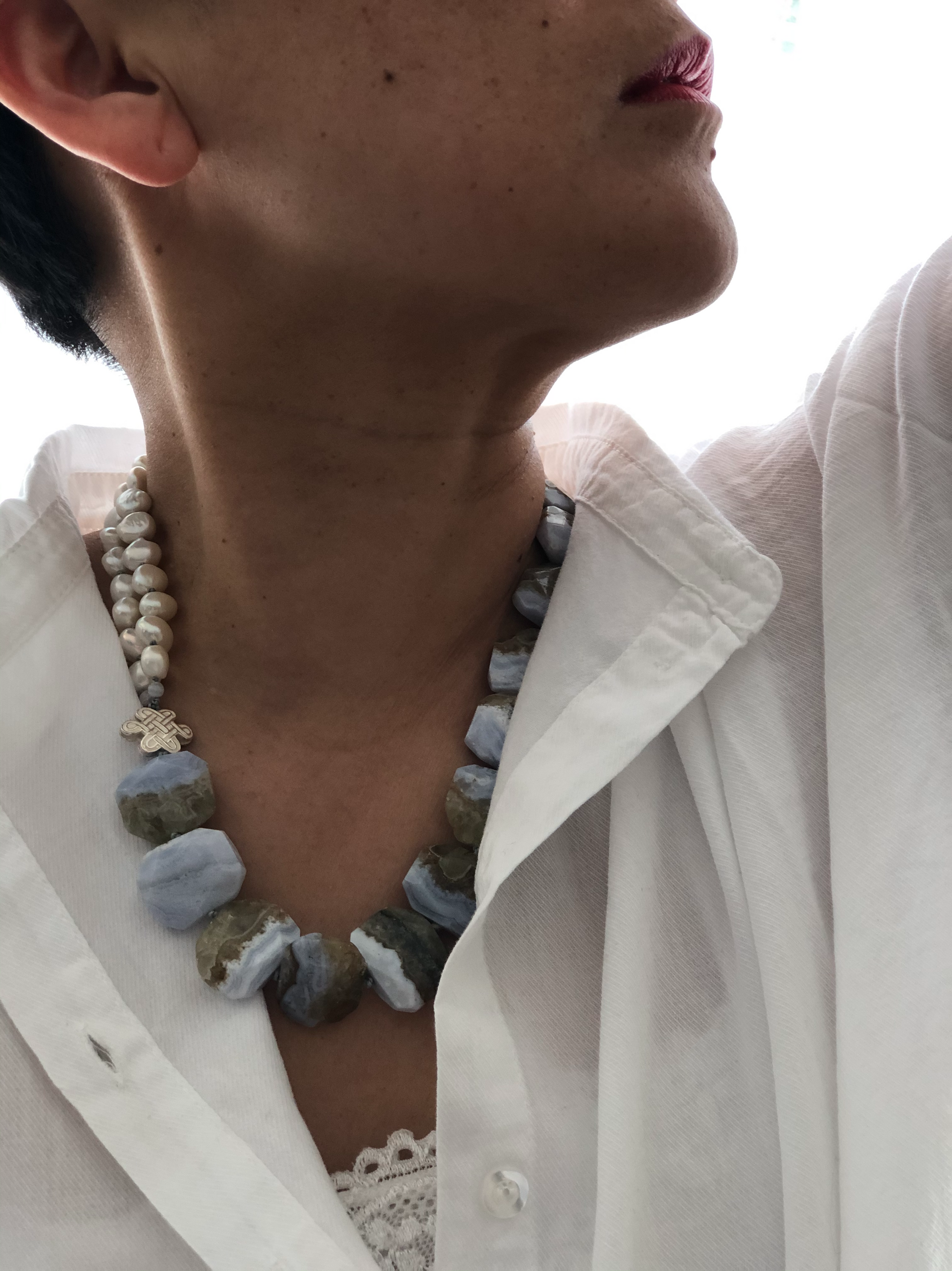 Materials : Blue lace agate, fresh water pearl , fine silver