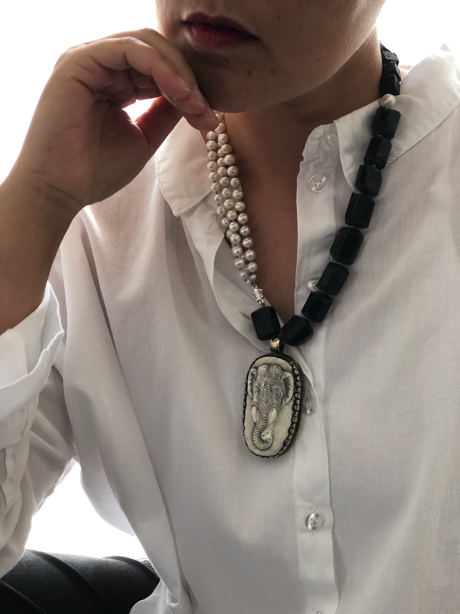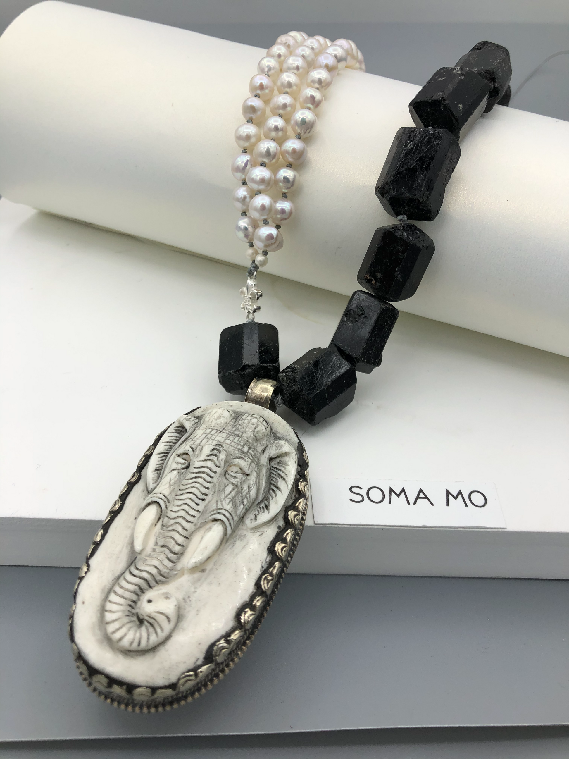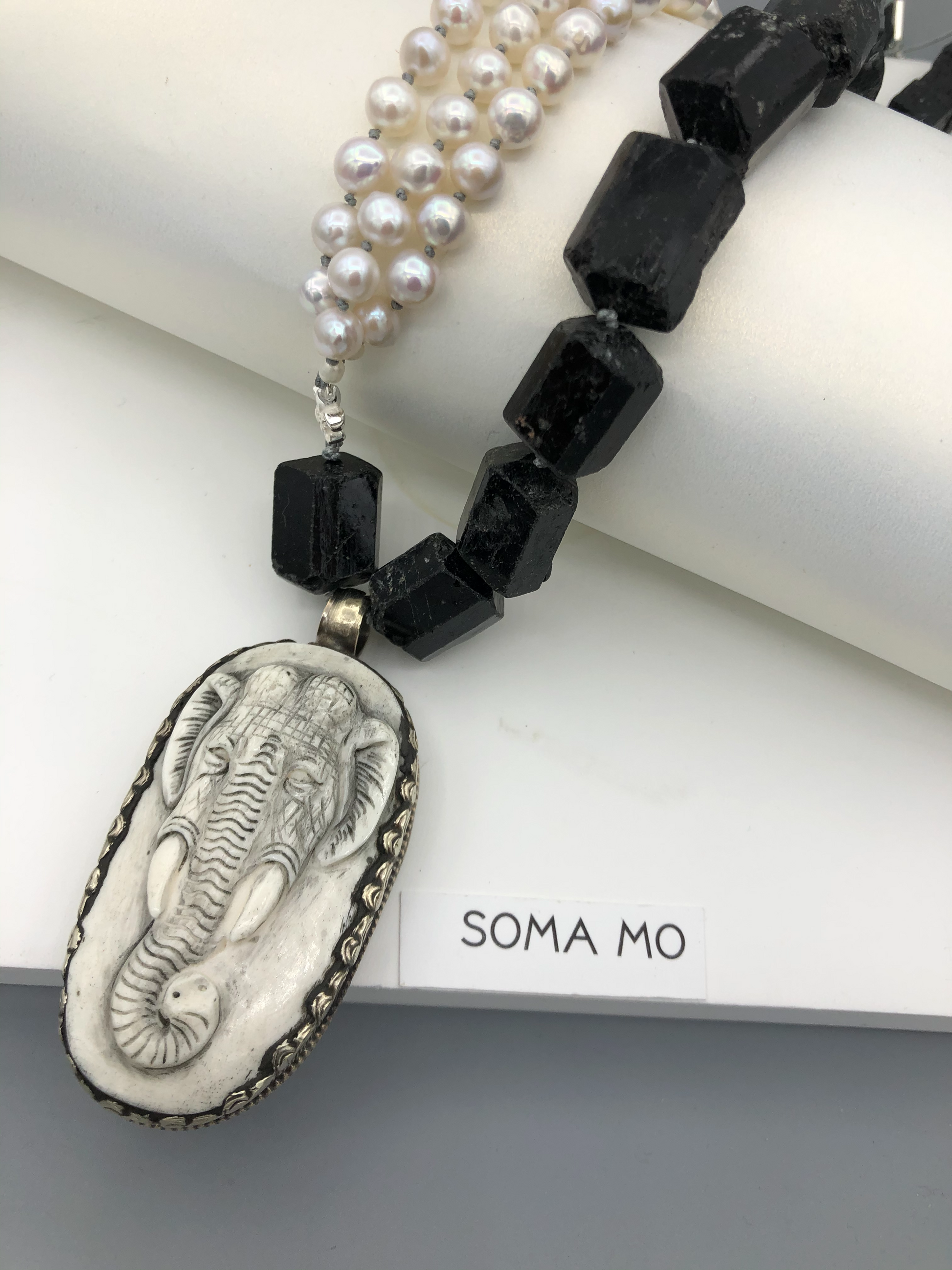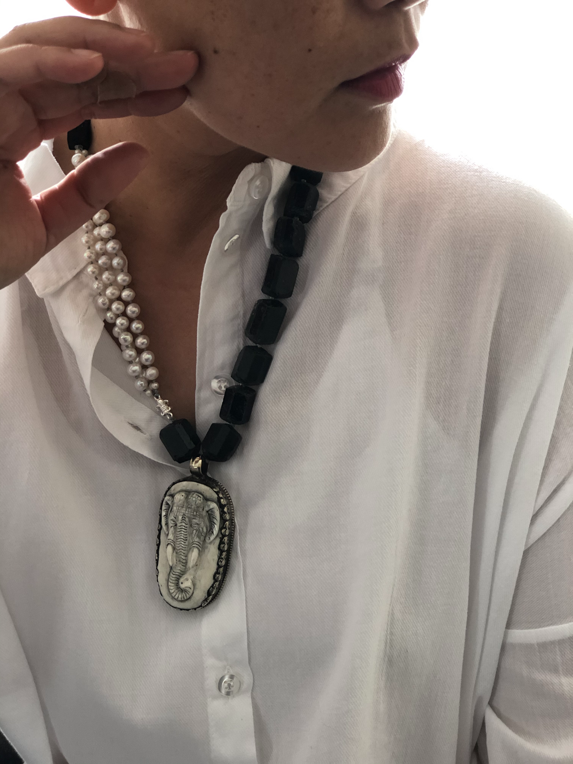 Materials : Black turmaline , fresh water pearl , Tibetan two sided pendent