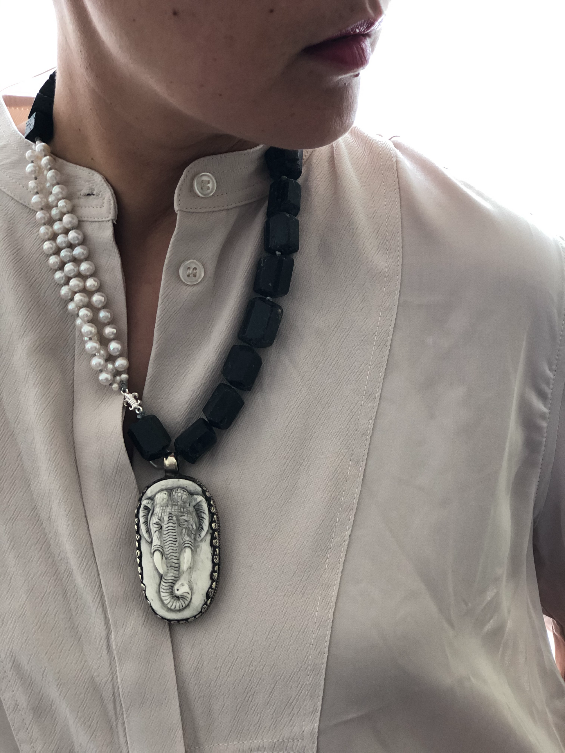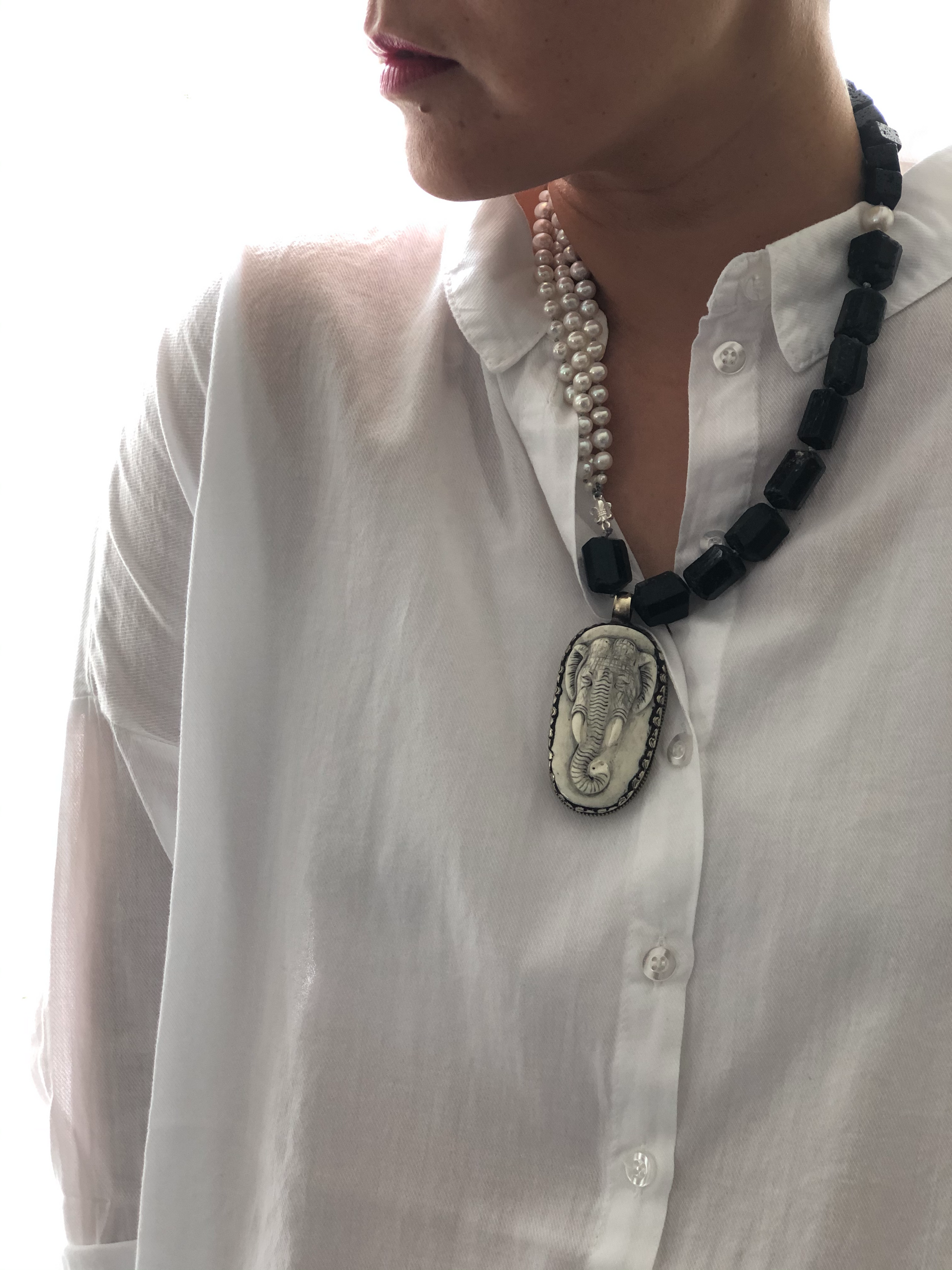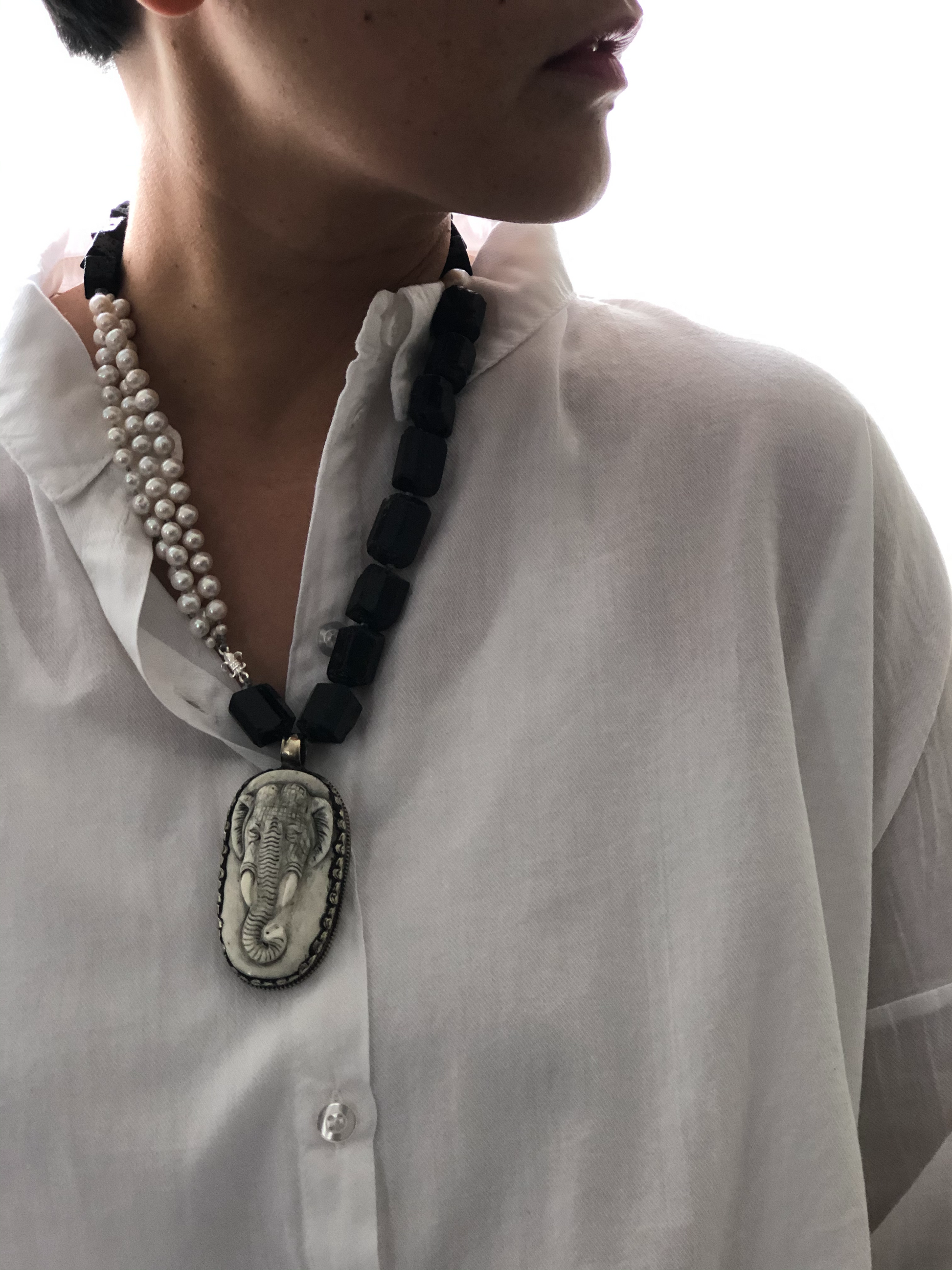Materials : Black turmaline , fresh water pearl , Tibetan two sided pendent