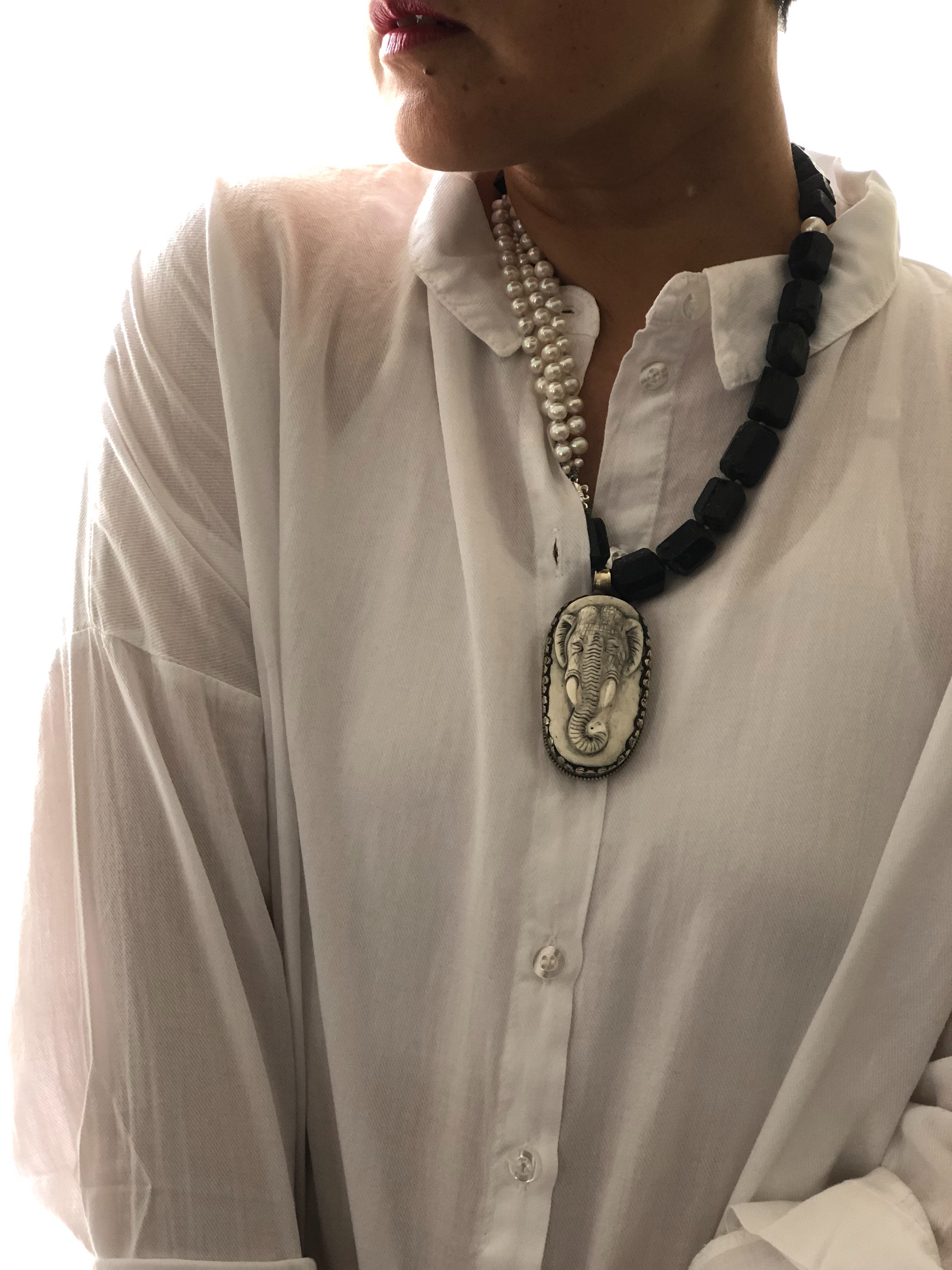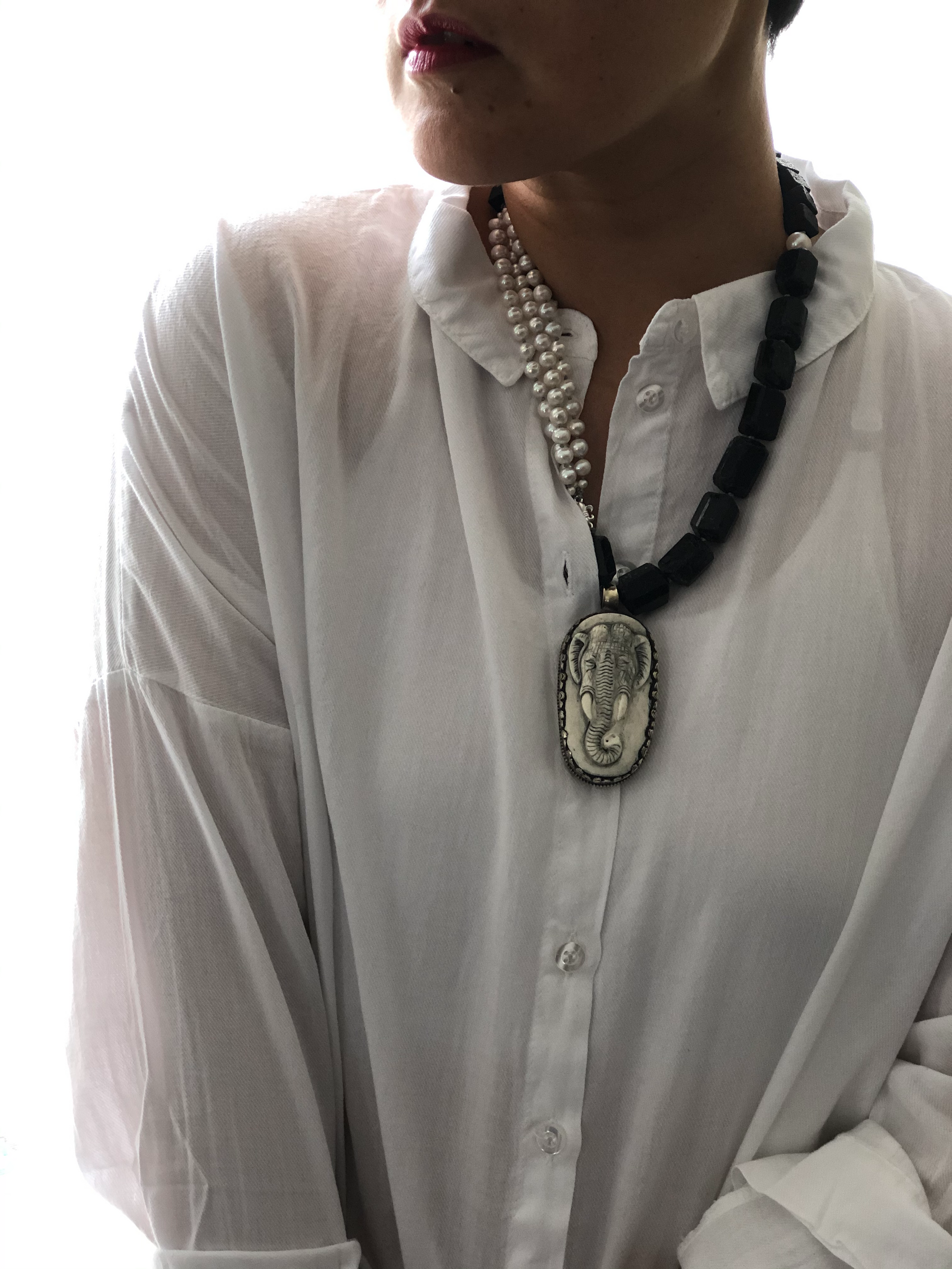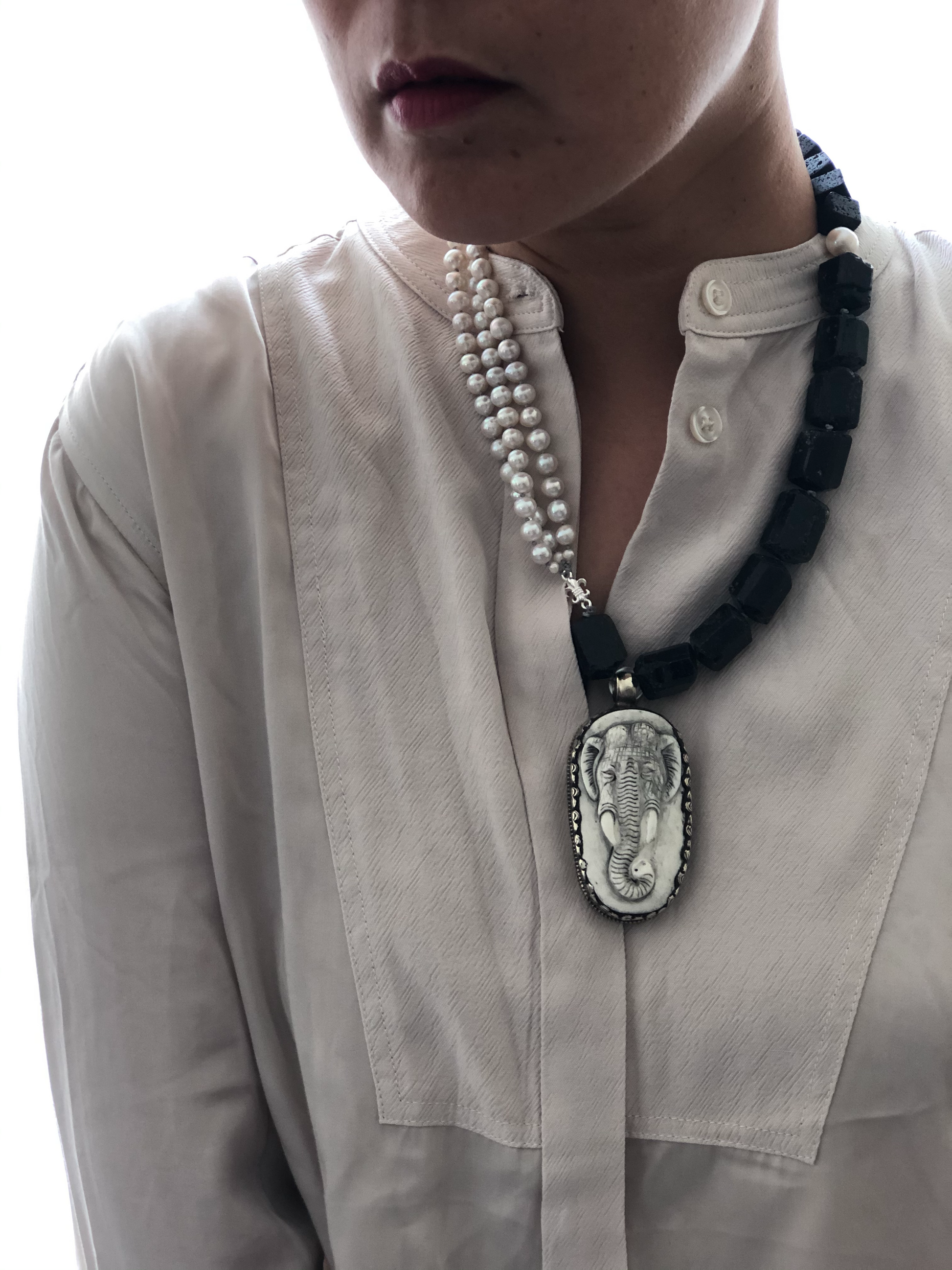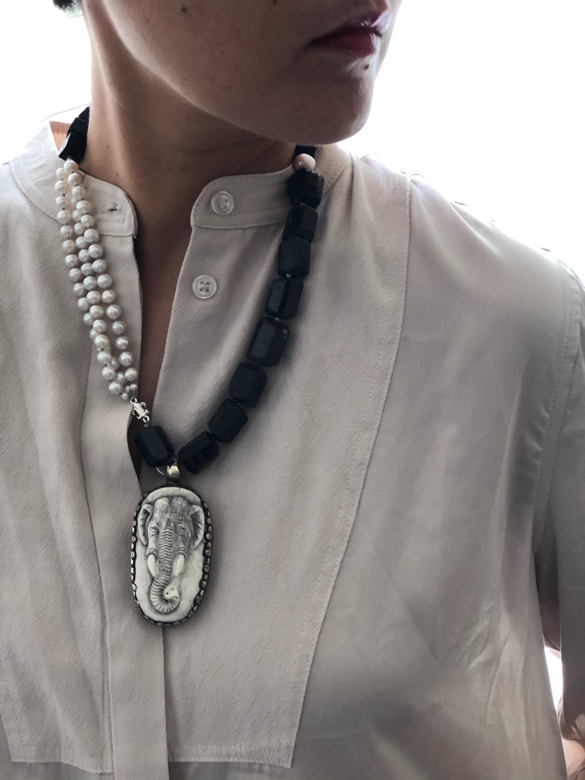 Materials : Black turmaline , fresh water pearl , Tibetan two sided pendent