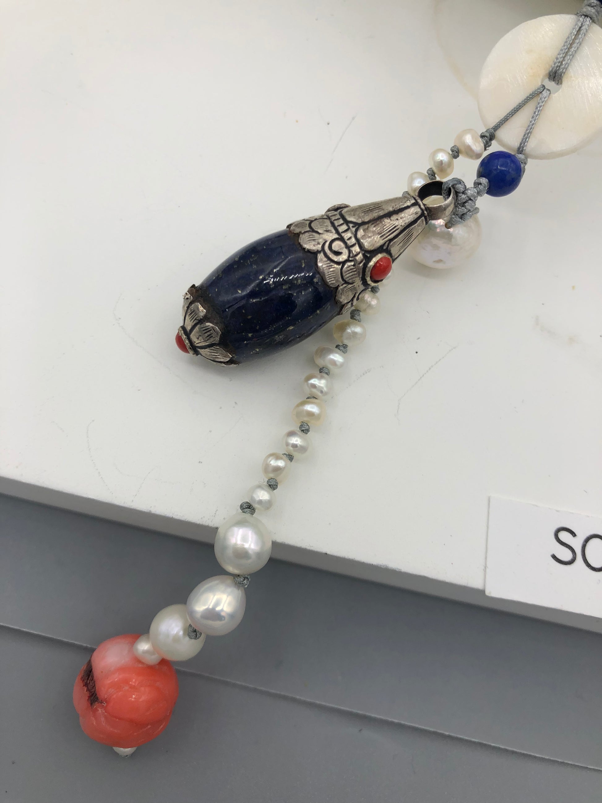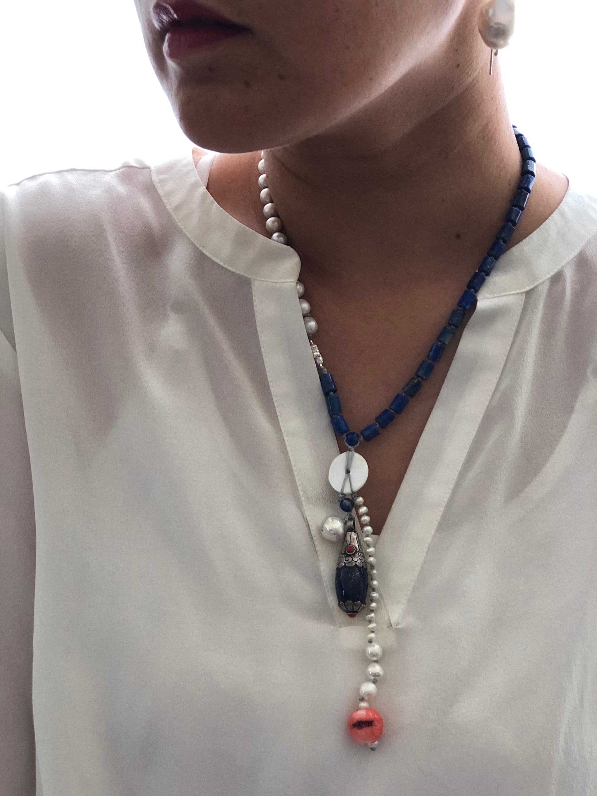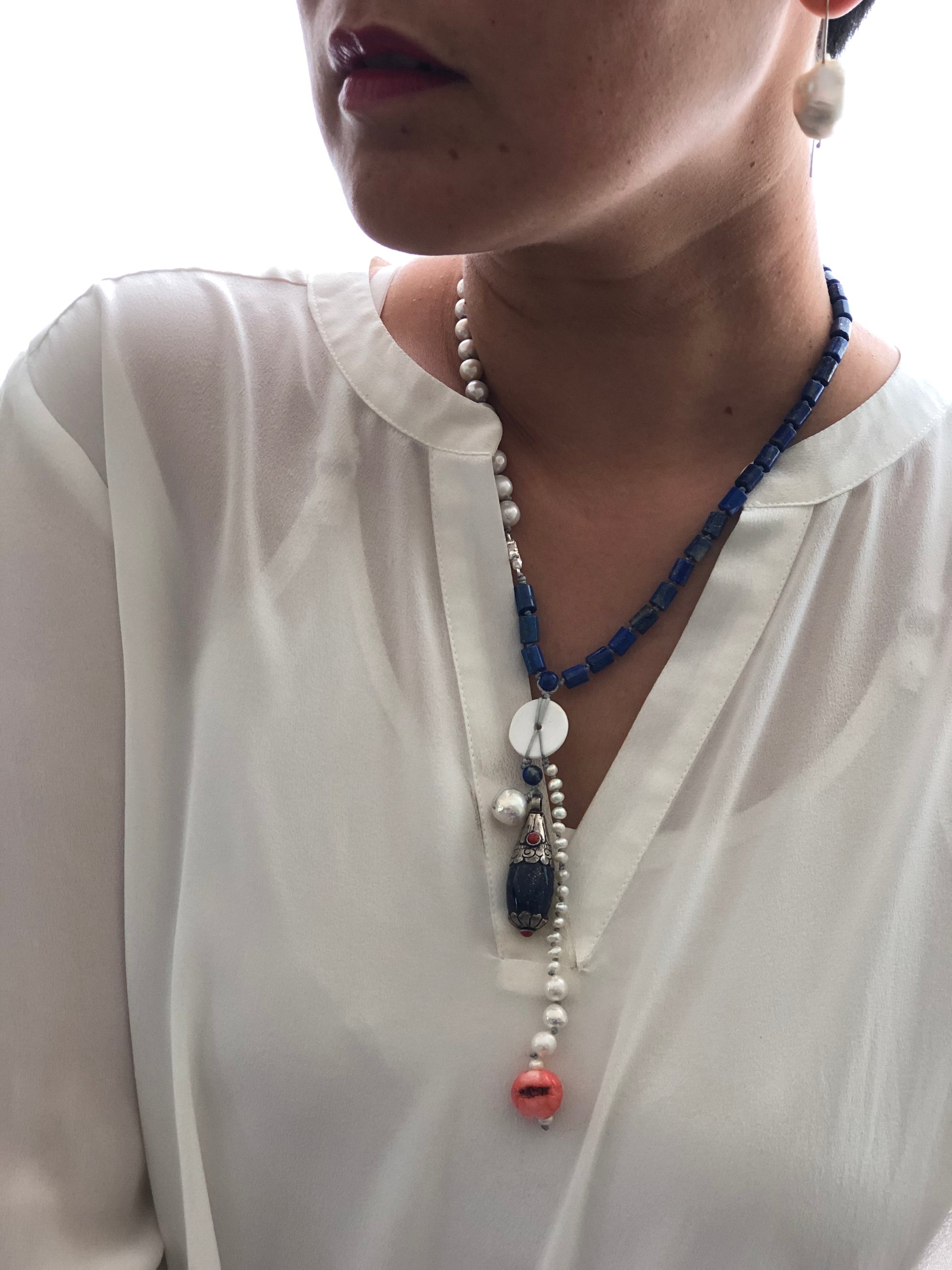 Materials : Lapis, fresh water pearl, coral , Tibetan silver pendent with lapis