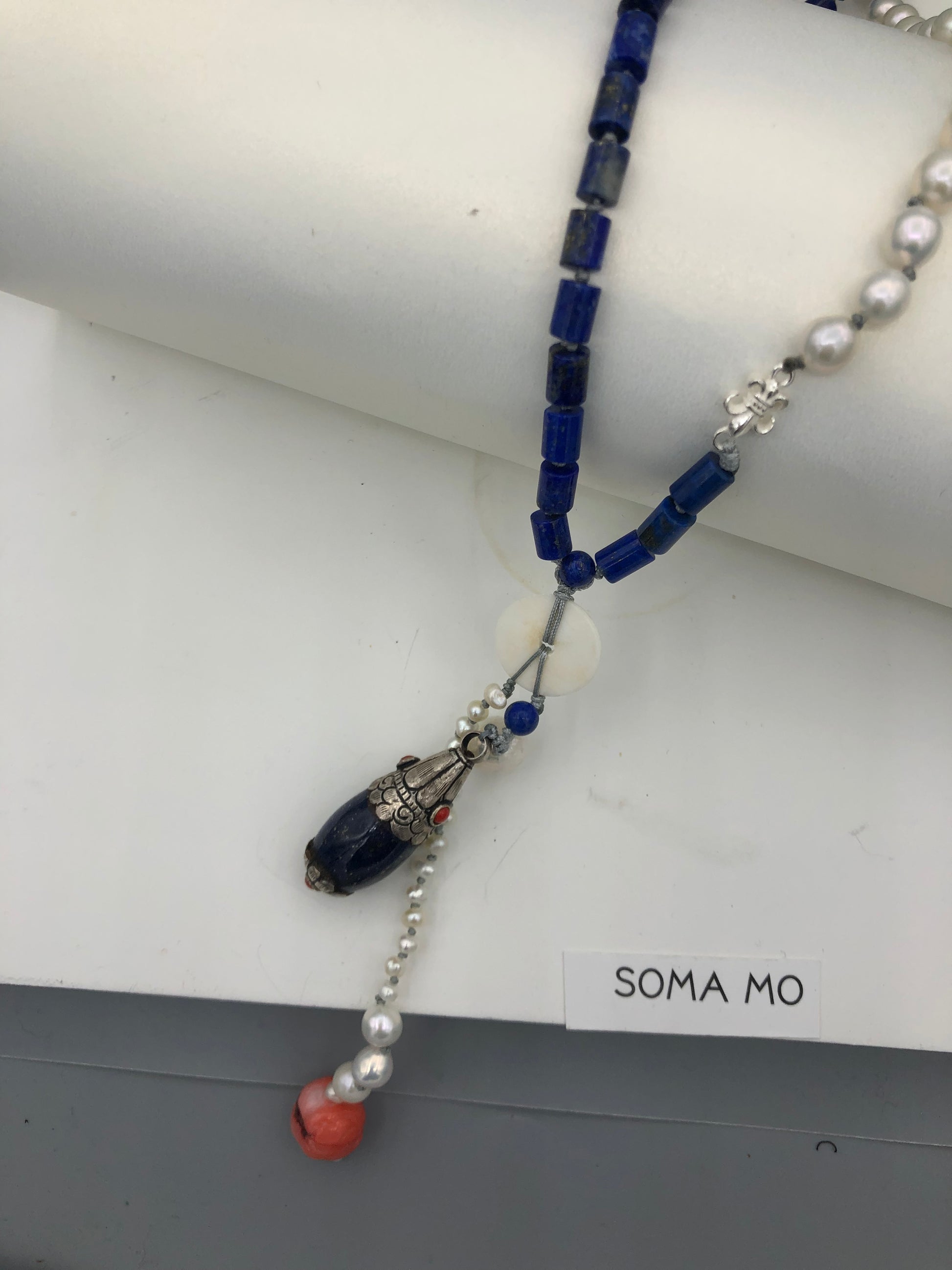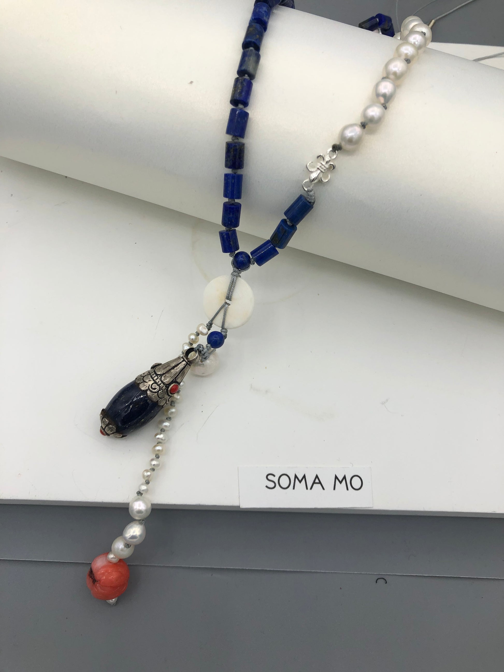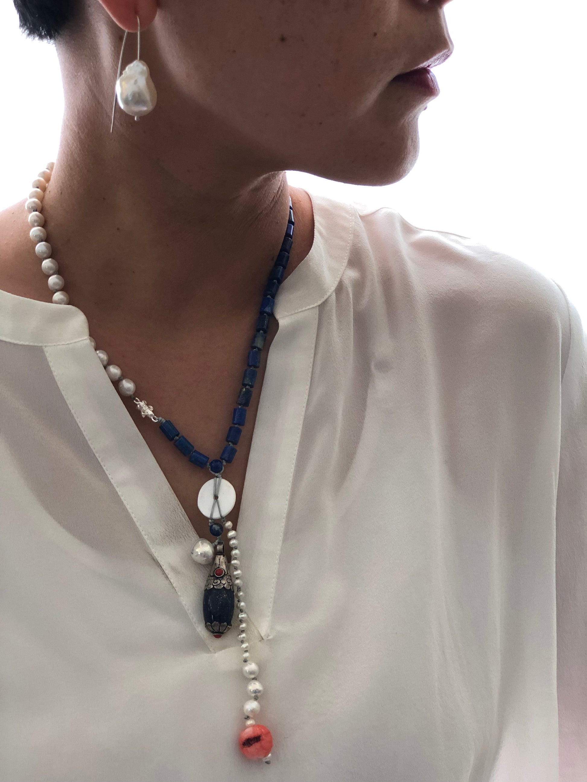 Materials : Lapis, fresh water pearl, coral , Tibetan silver pendent with lapis