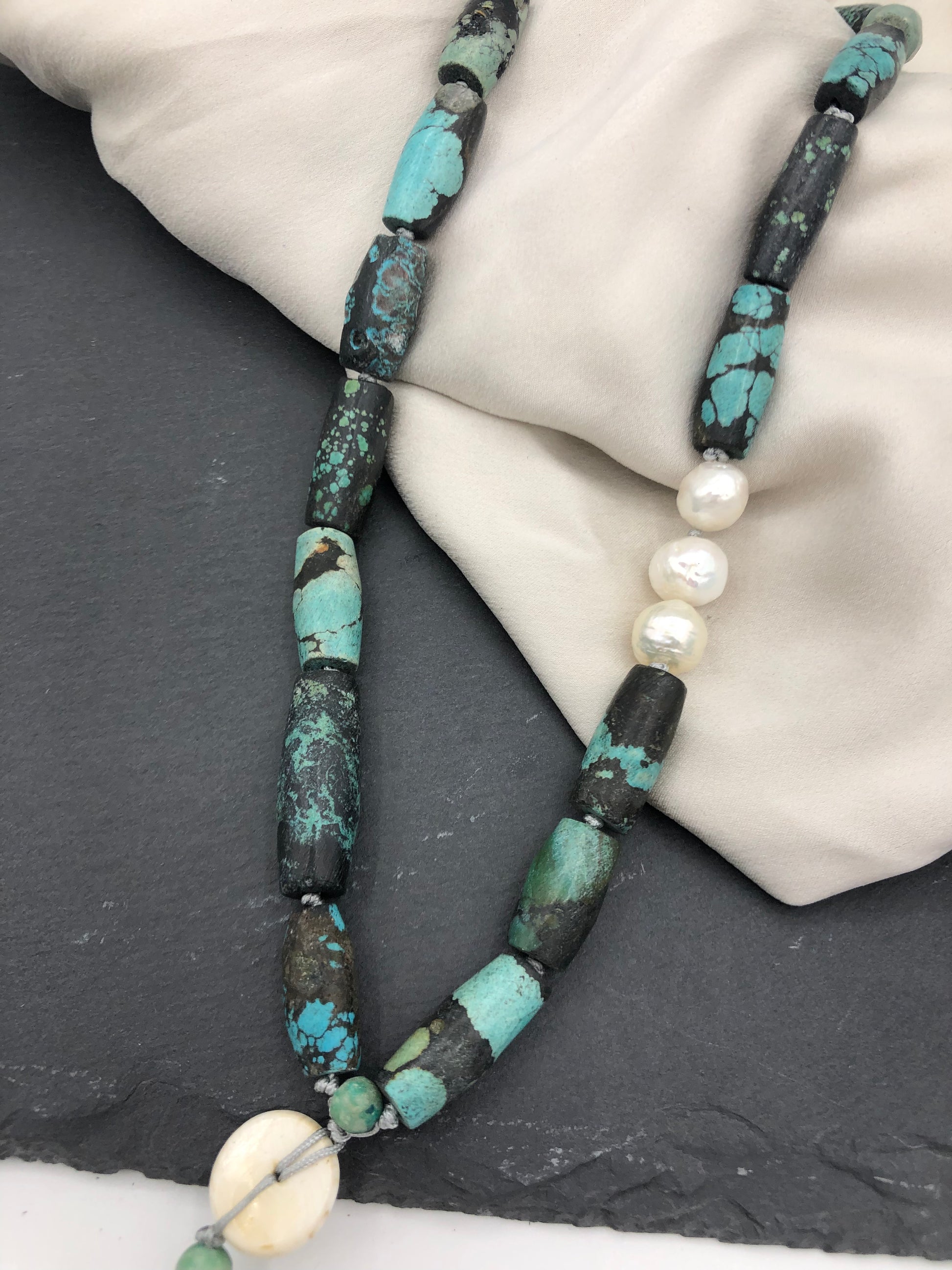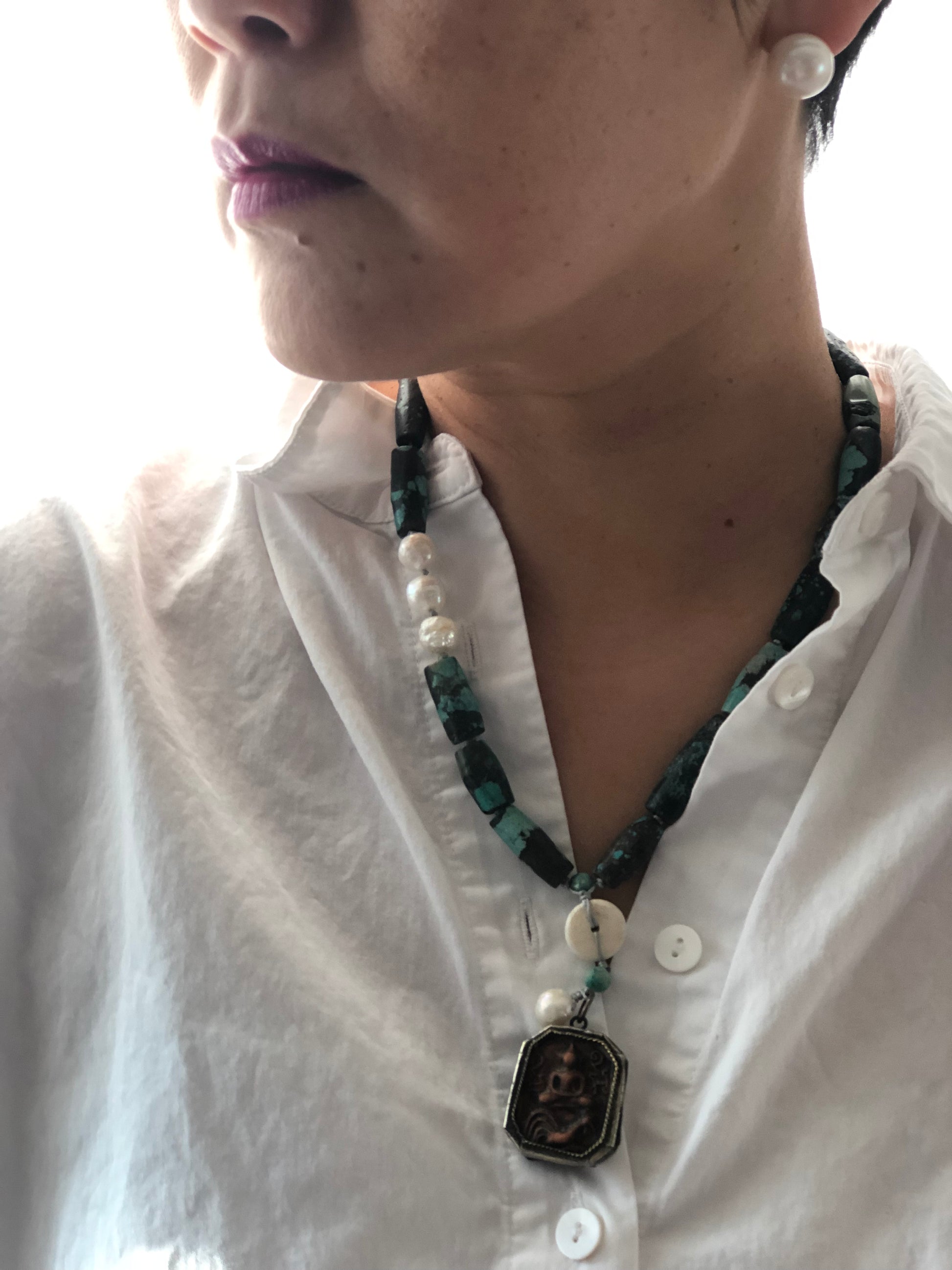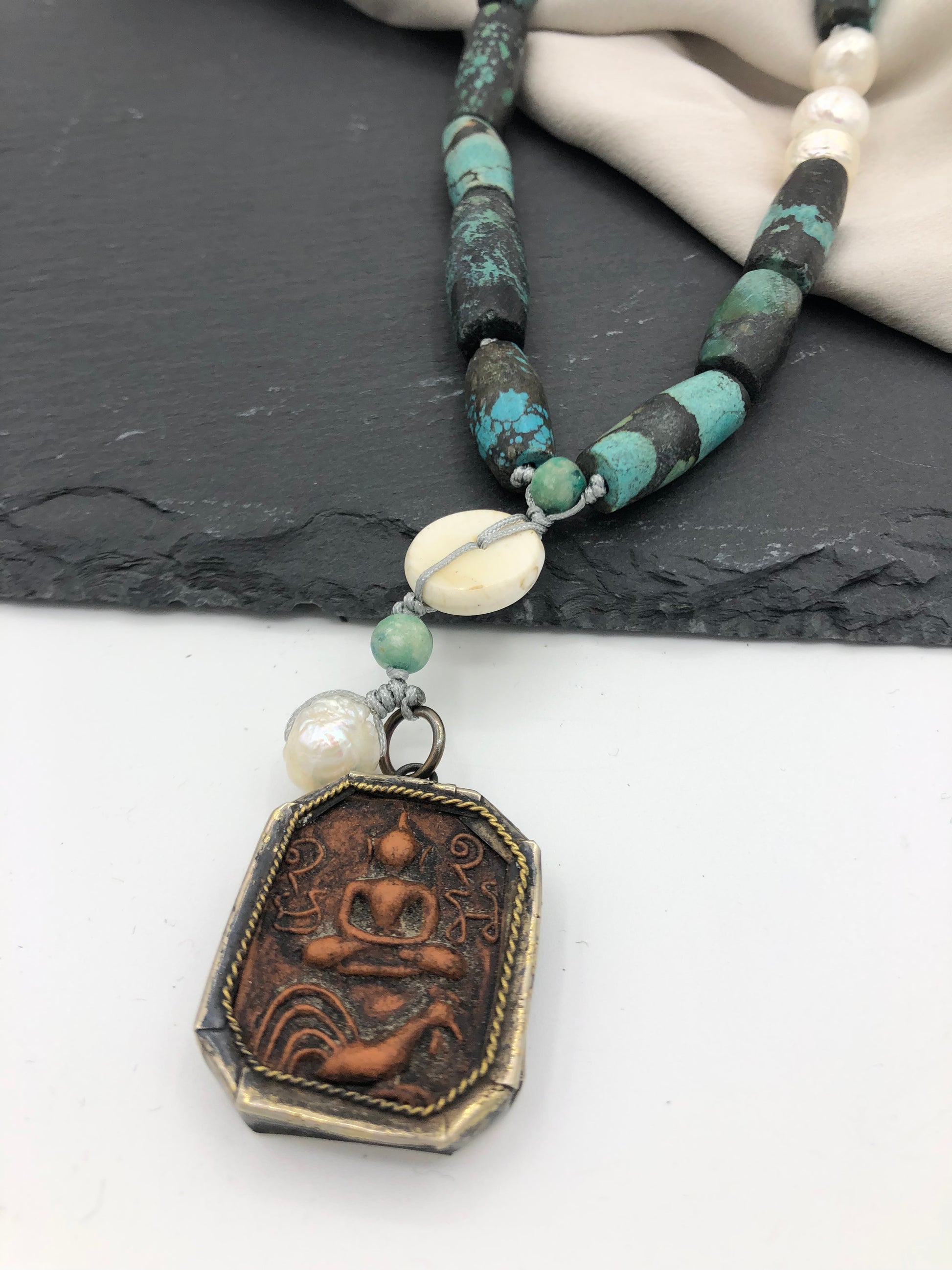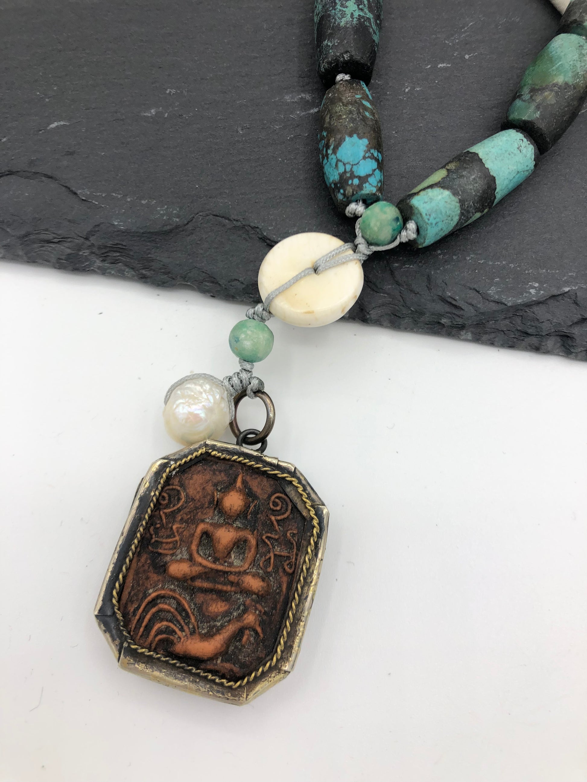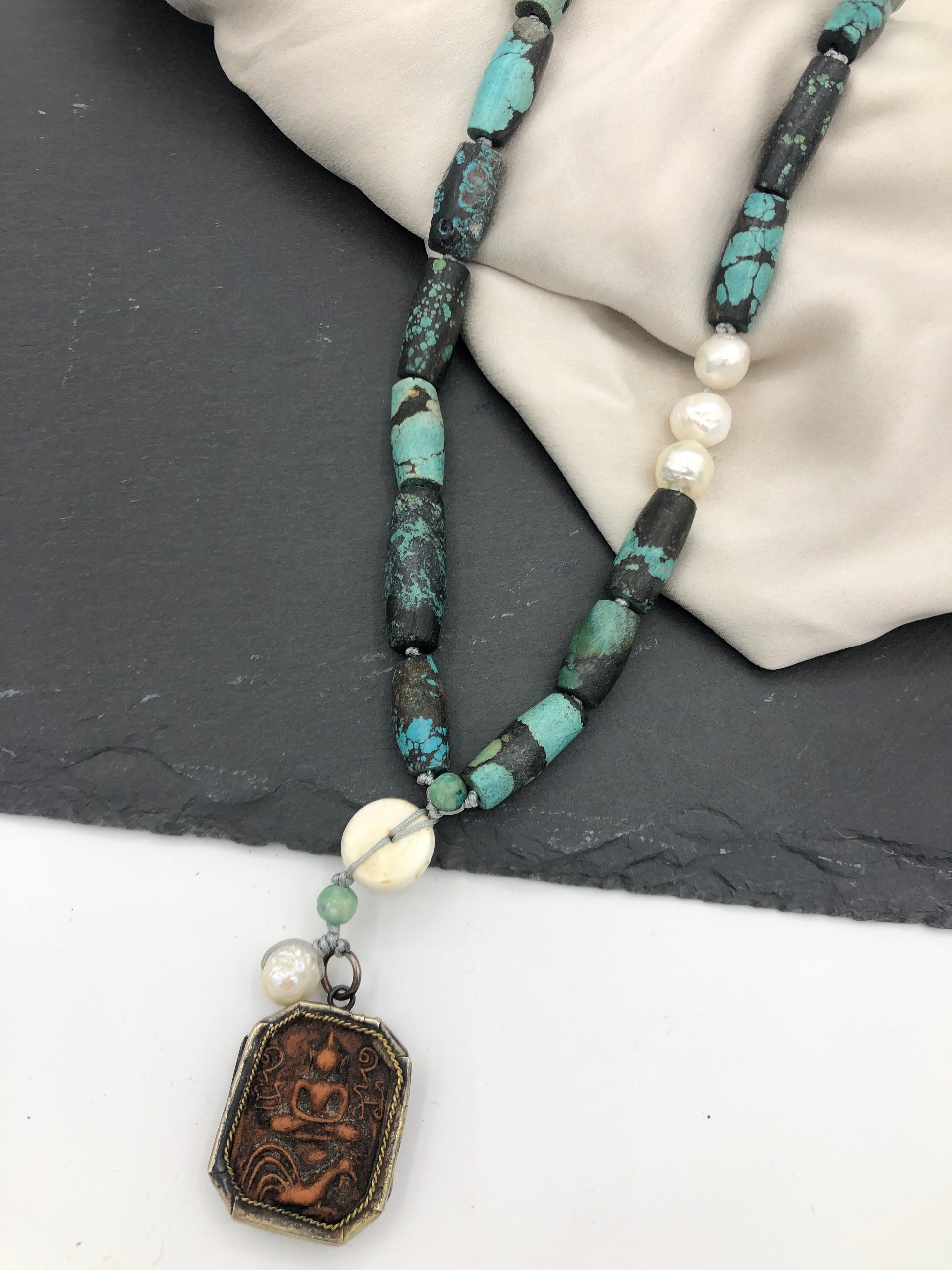 Old Tibetan pendent , with Tibetan turquoise. Hand knotted between each beads.