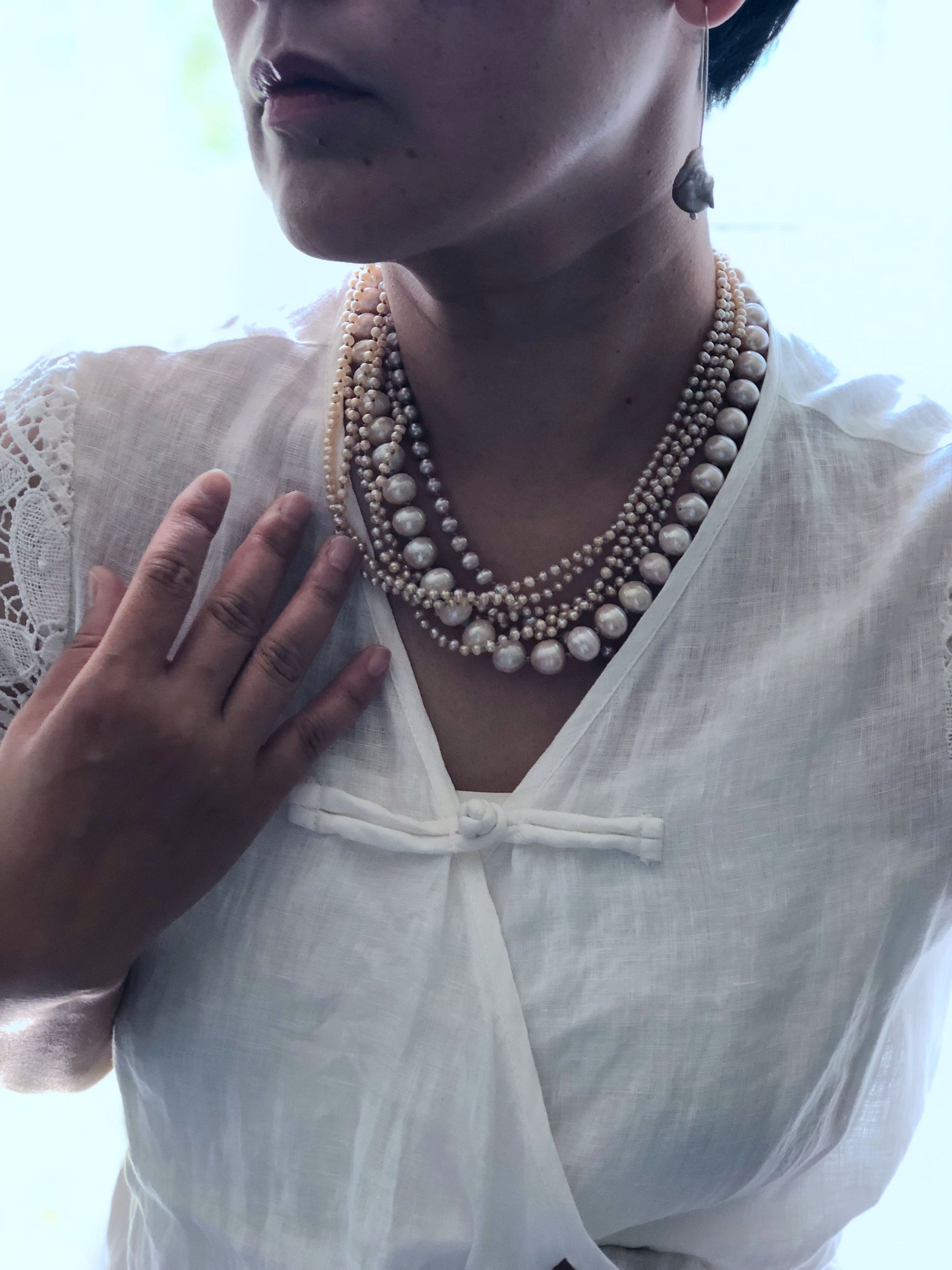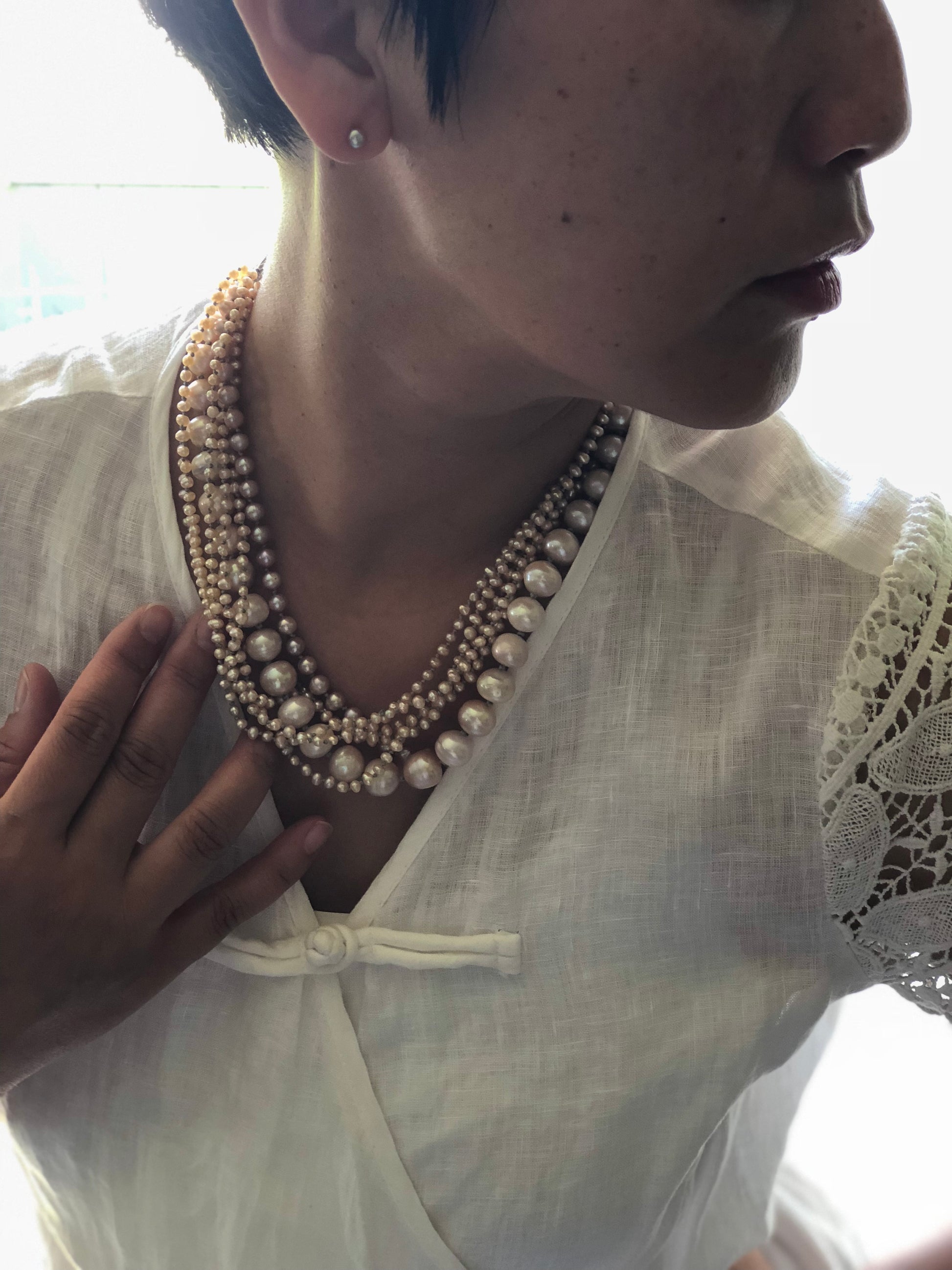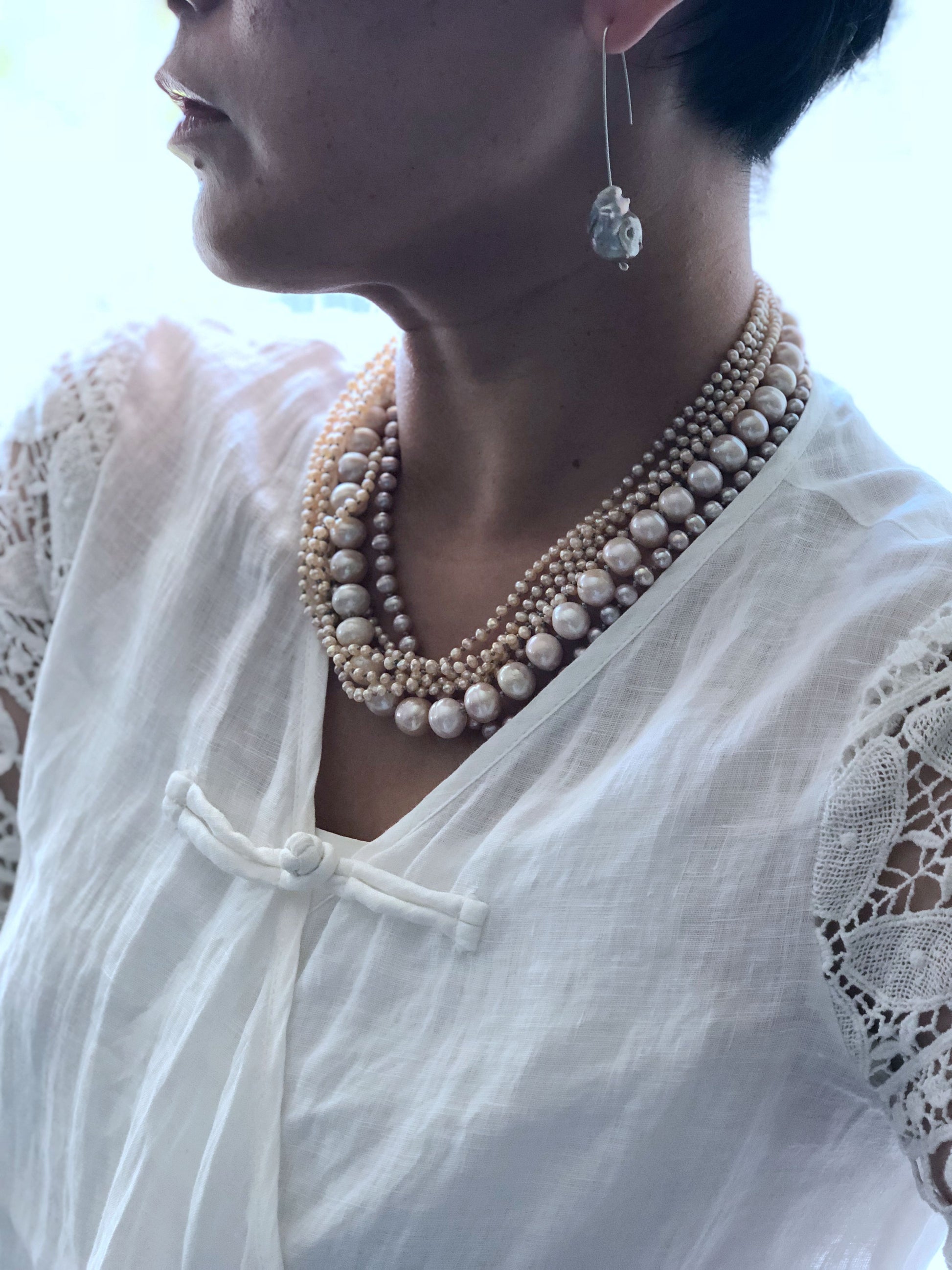 Multi strand of golden color pearls, in different shape and size, this piece is all hand knotted between each beads, absolutely a statement piece . Can be resized for special request.