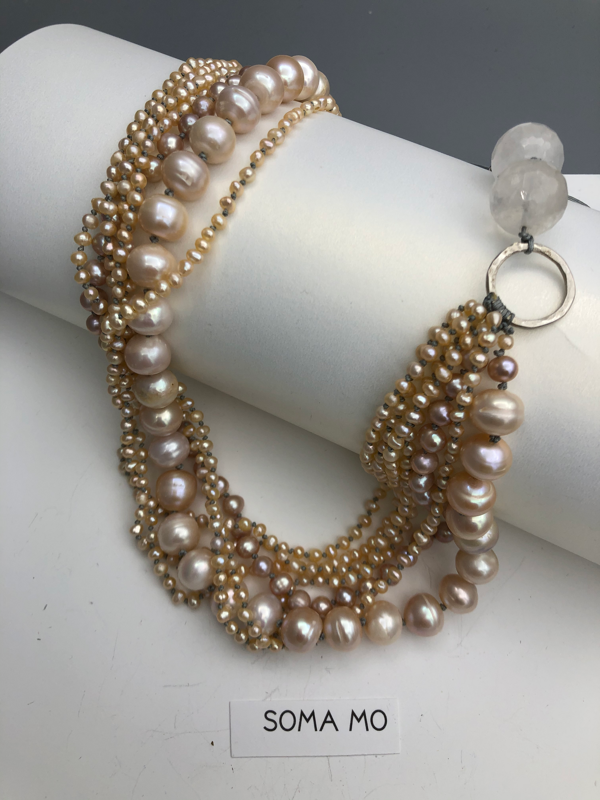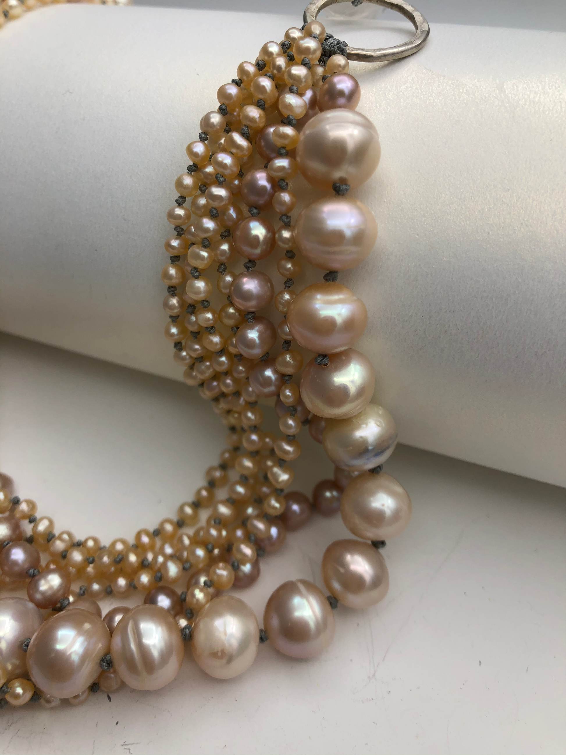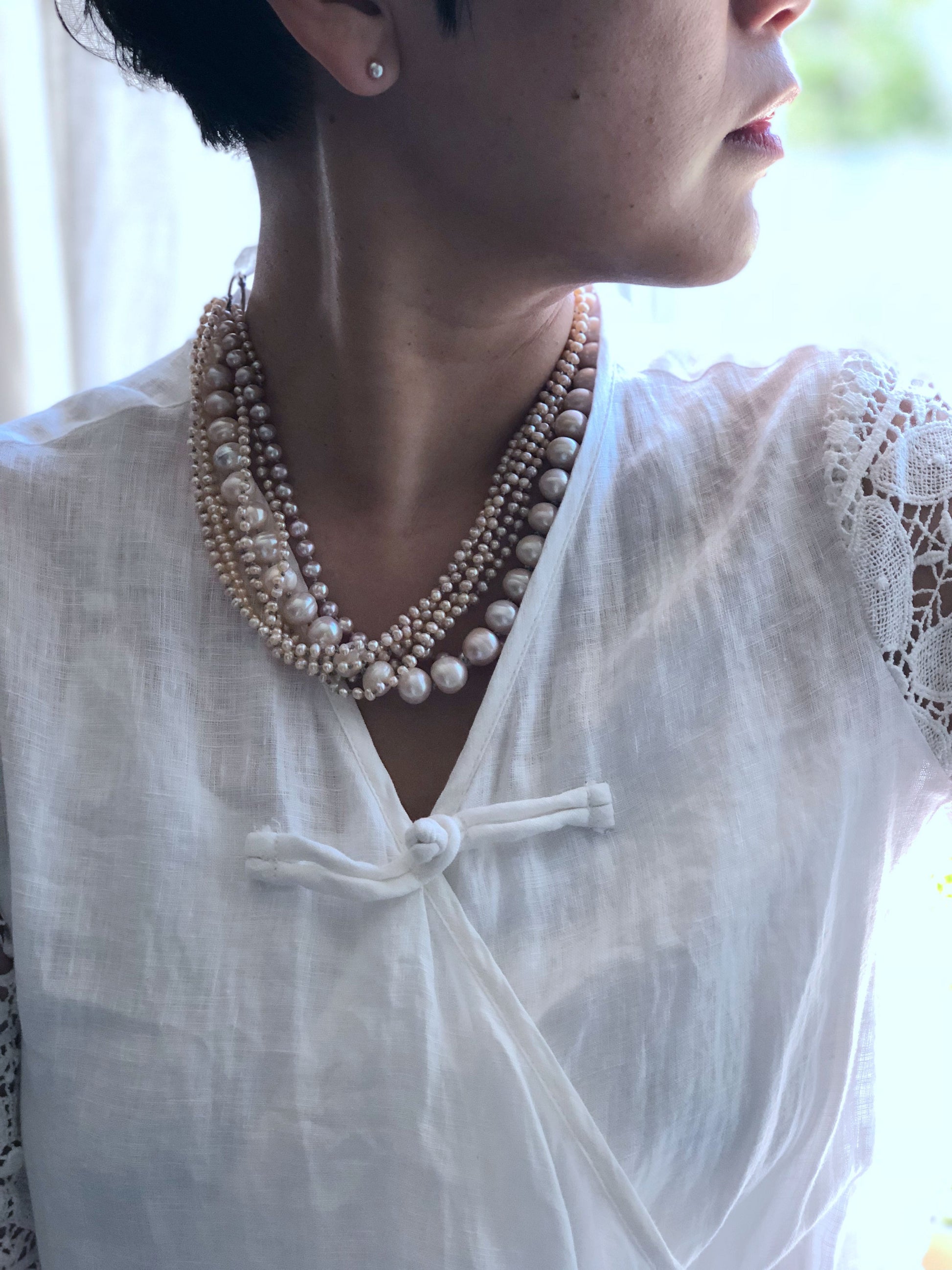Multi strand of golden color pearls, in different shape and size, this piece is all hand knotted between each beads, absolutely a statement piece . Can be resized for special request.