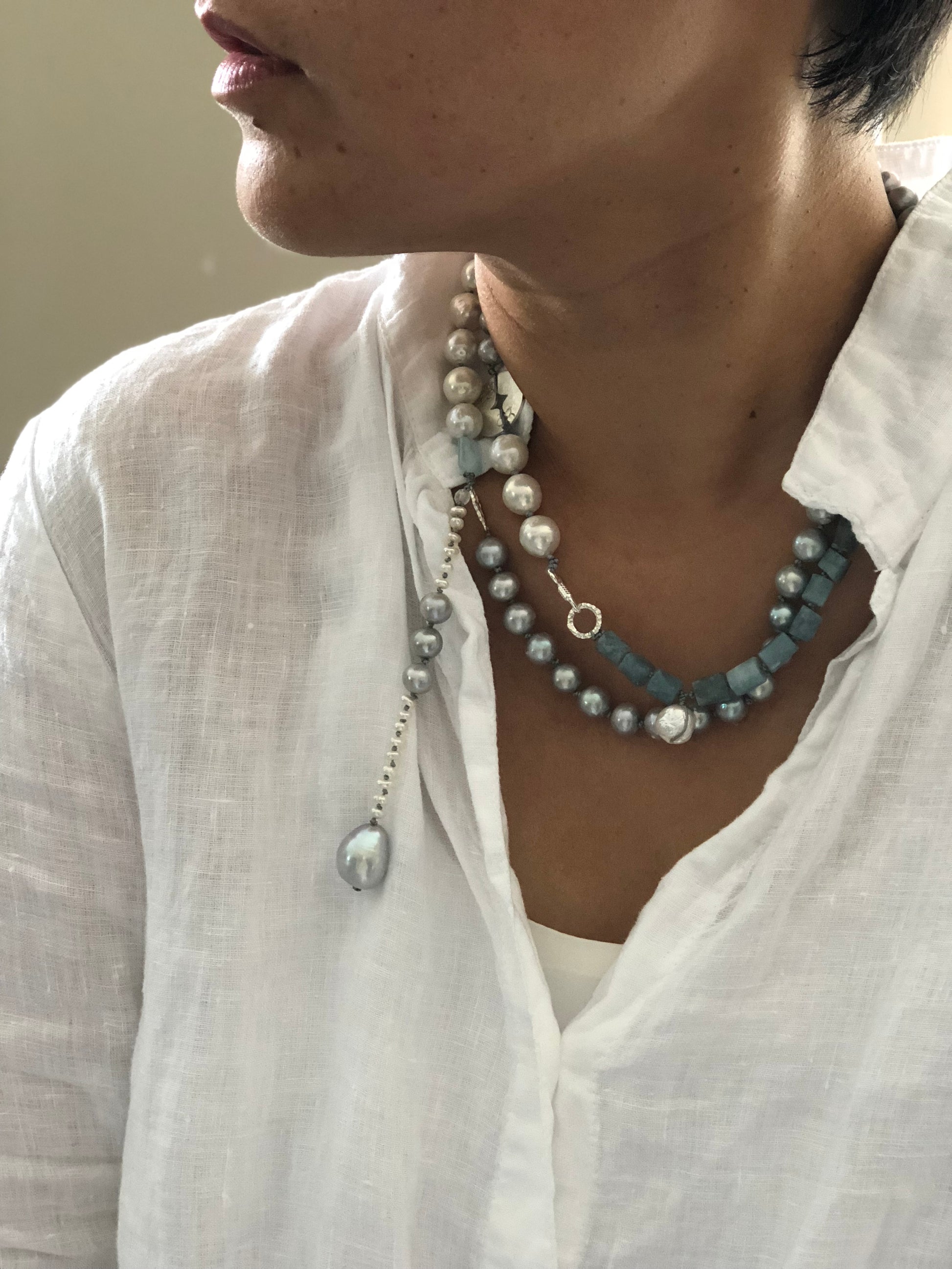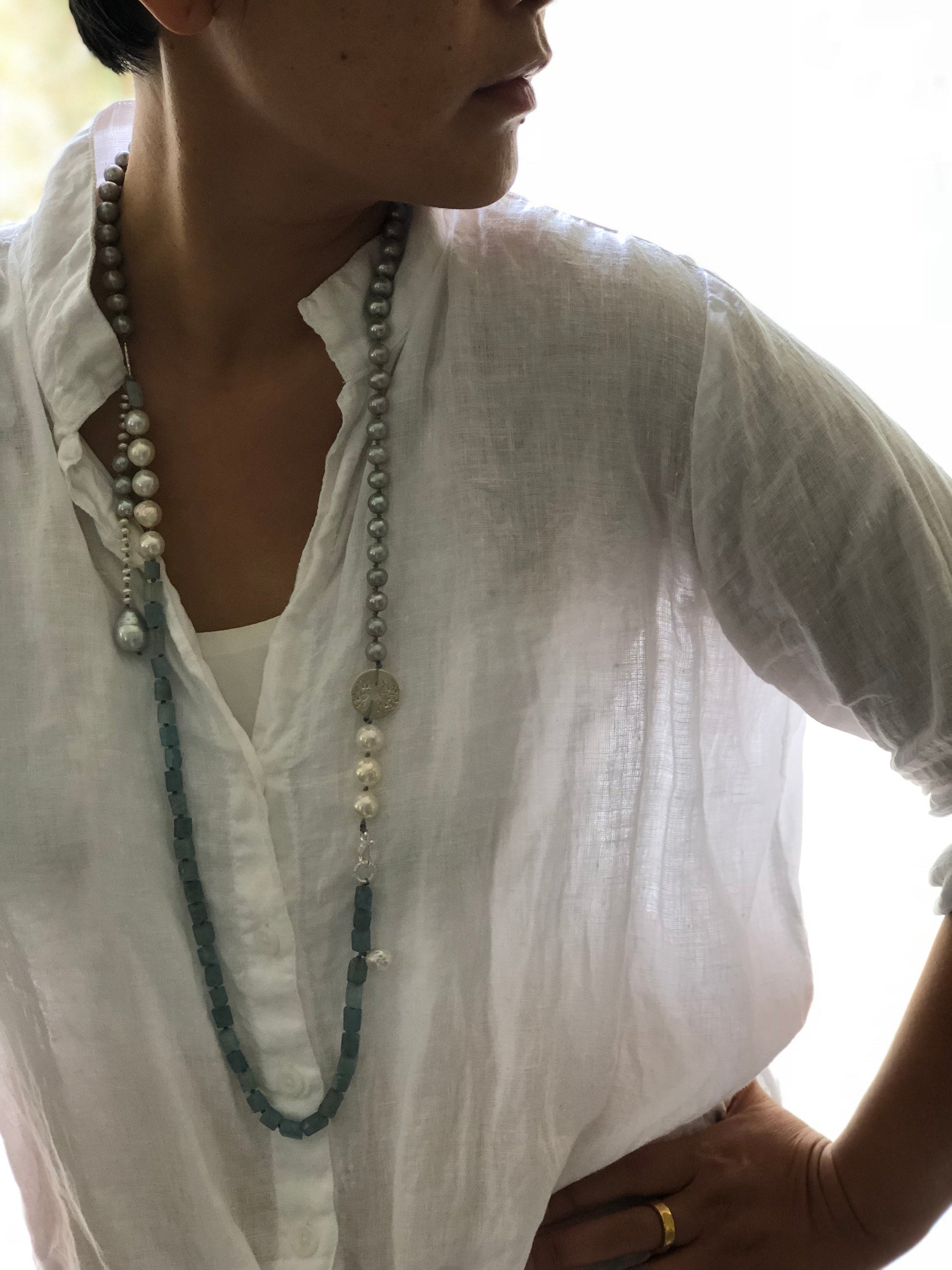 This piece has both my hand silver piece and fresh water pearl, with my favorite aquamarine raw beads. Hand knotted between each beads, can wear long or doubled.