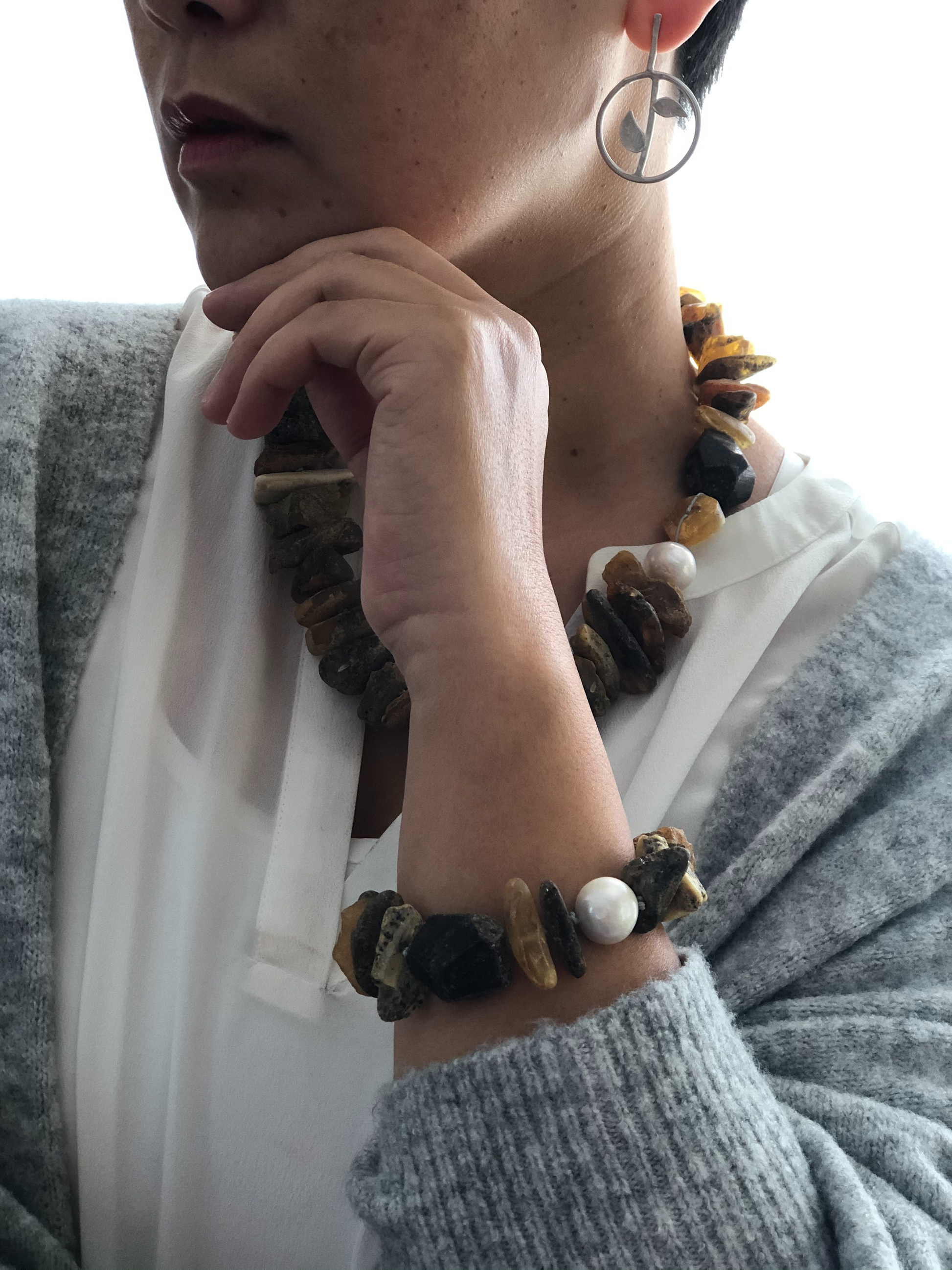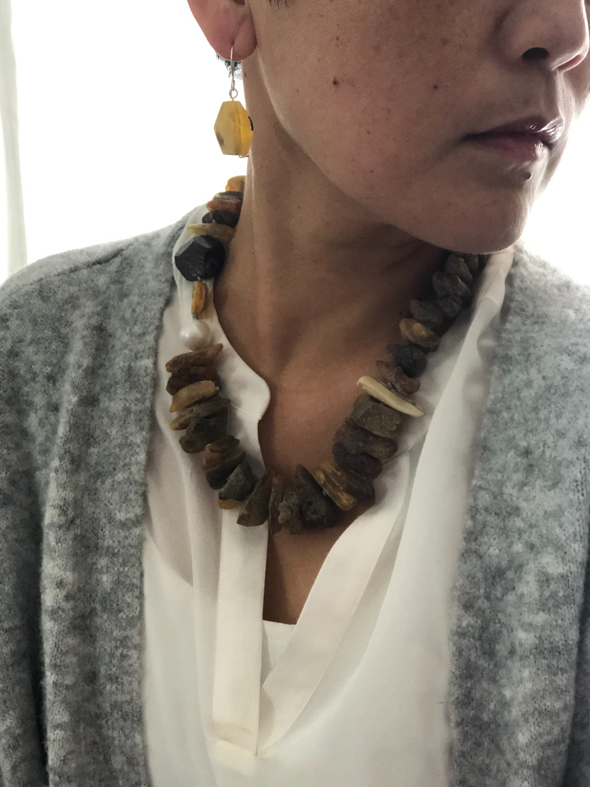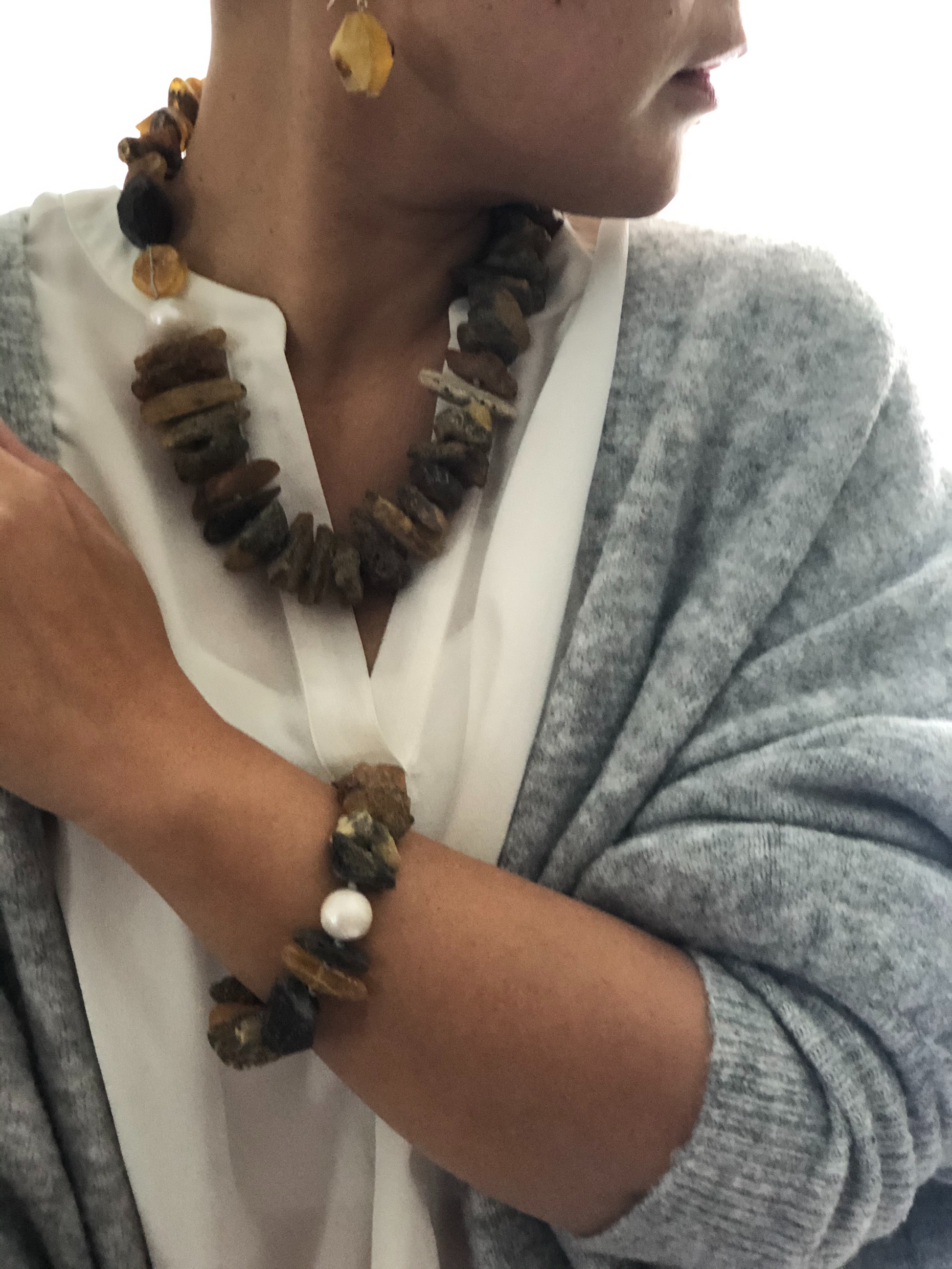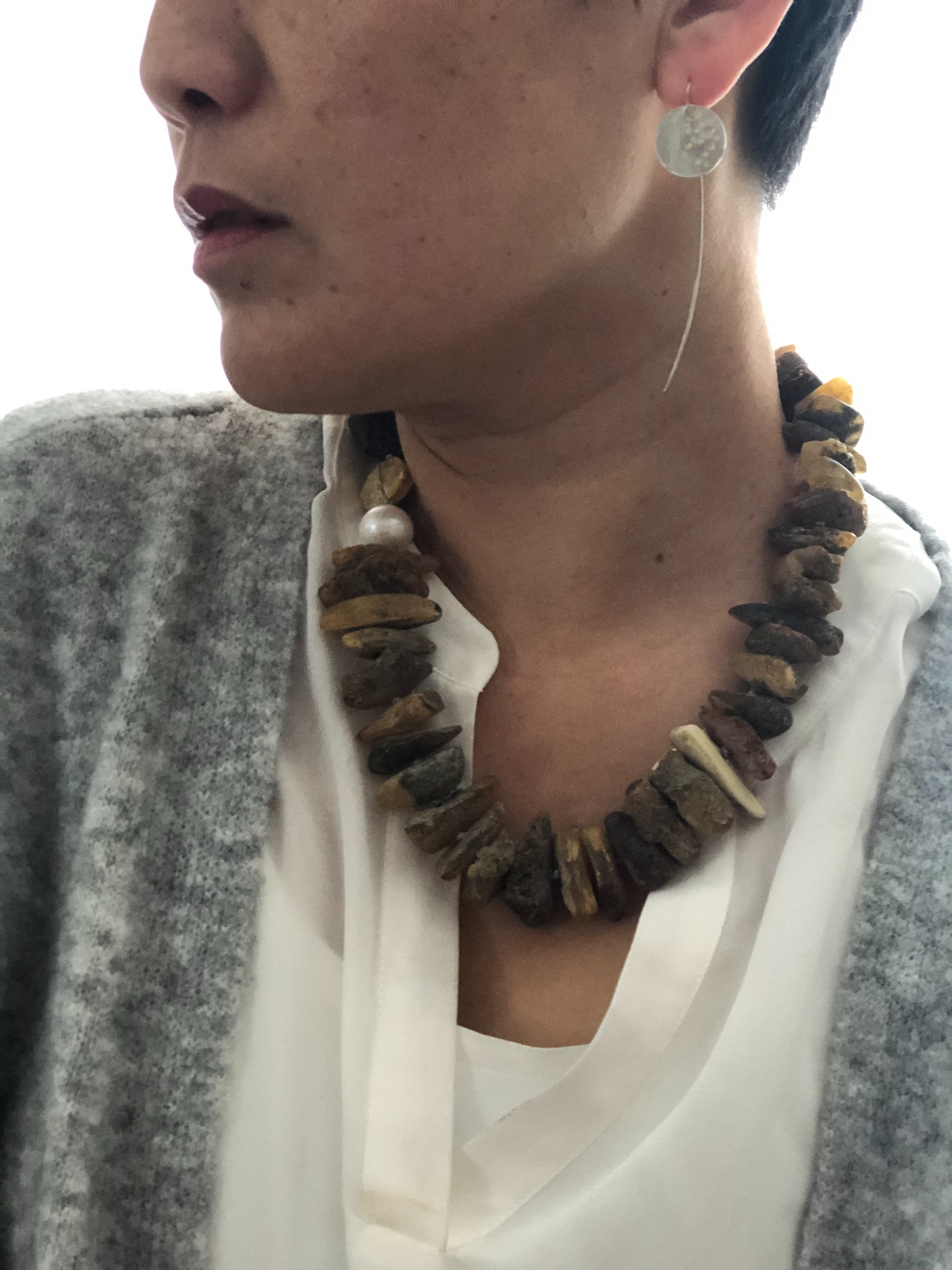 Materials : Raw Baltic amber, fresh water pearl, garnet