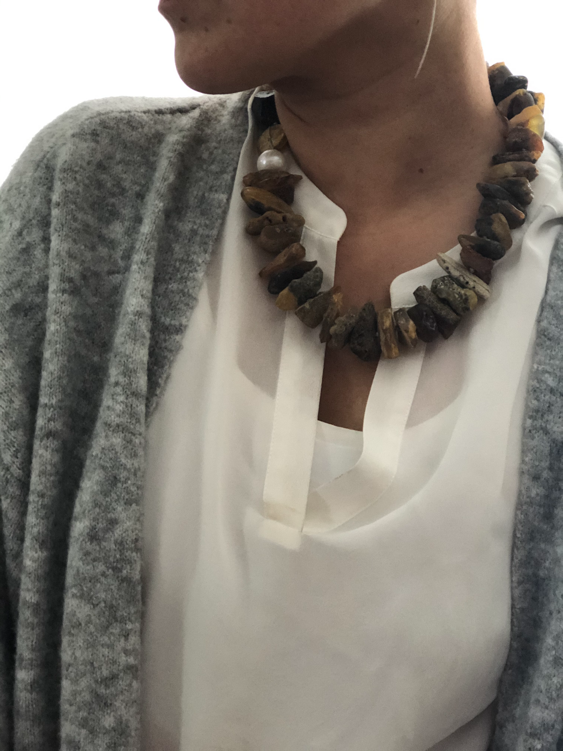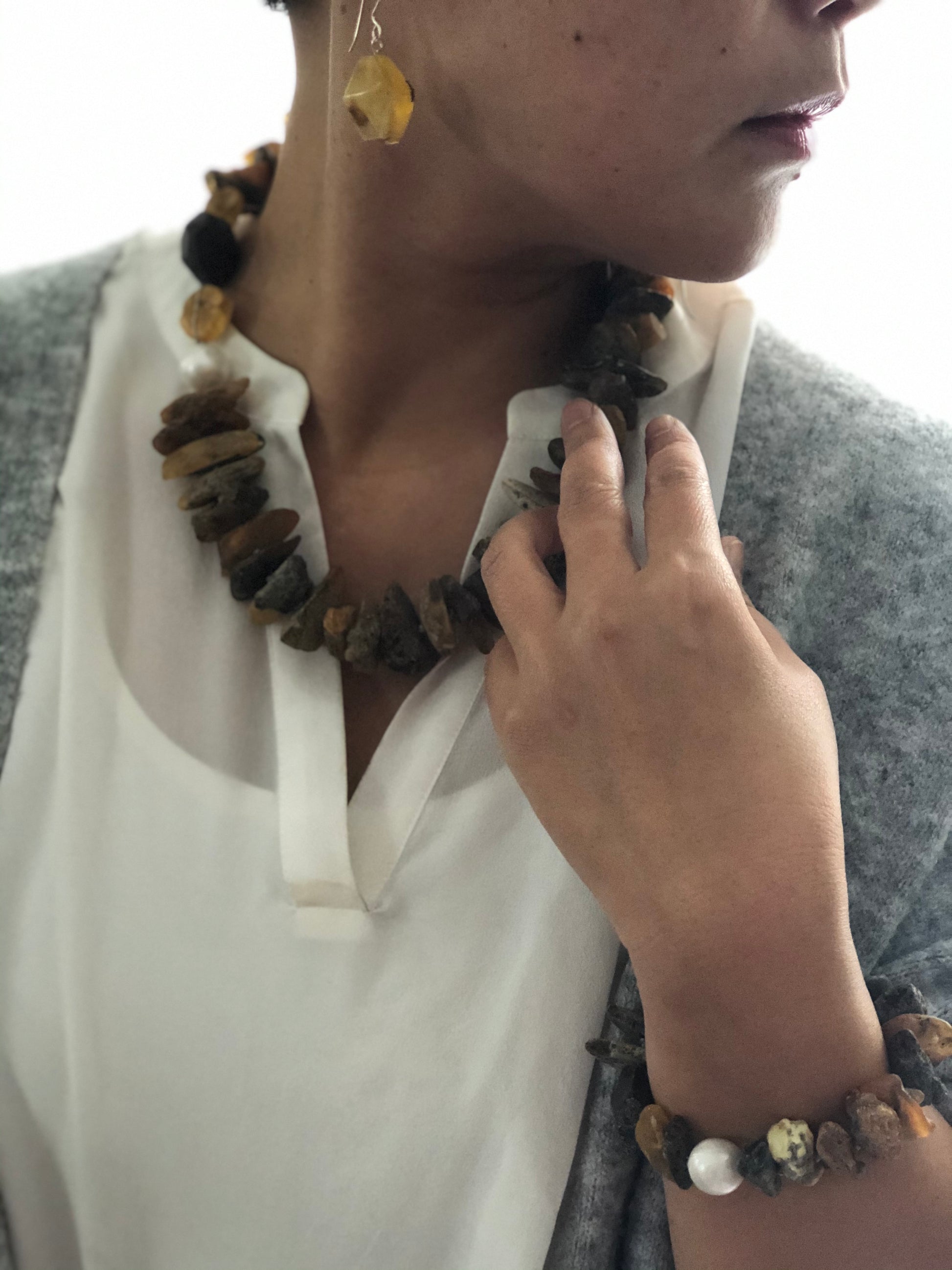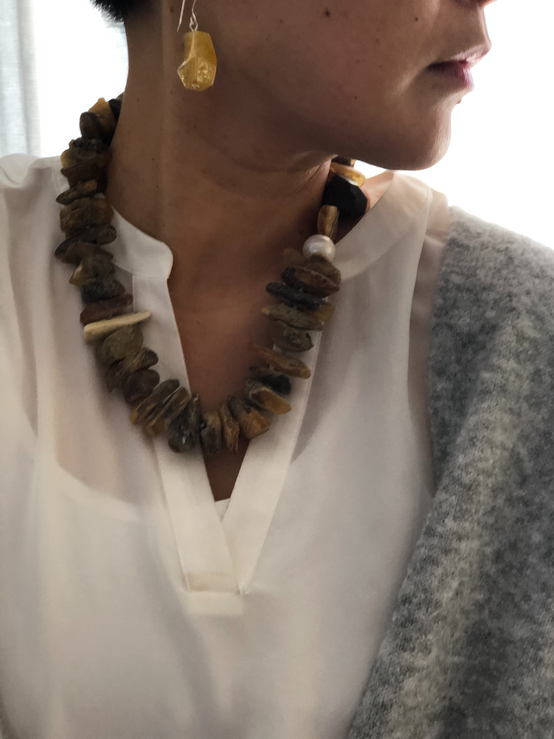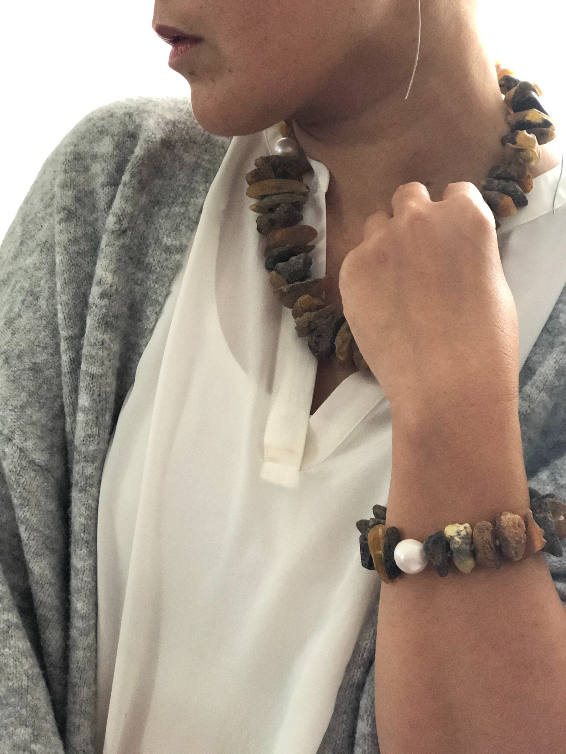 Materials : Raw Baltic amber, fresh water pearl, garnet