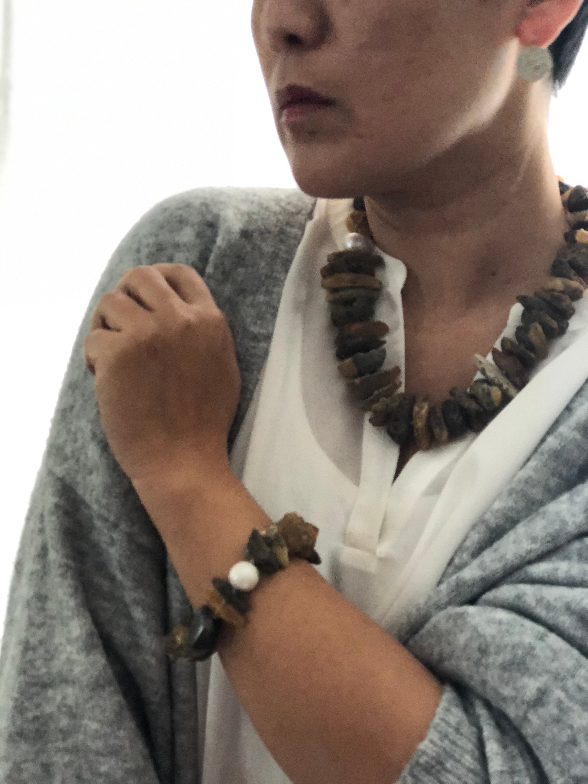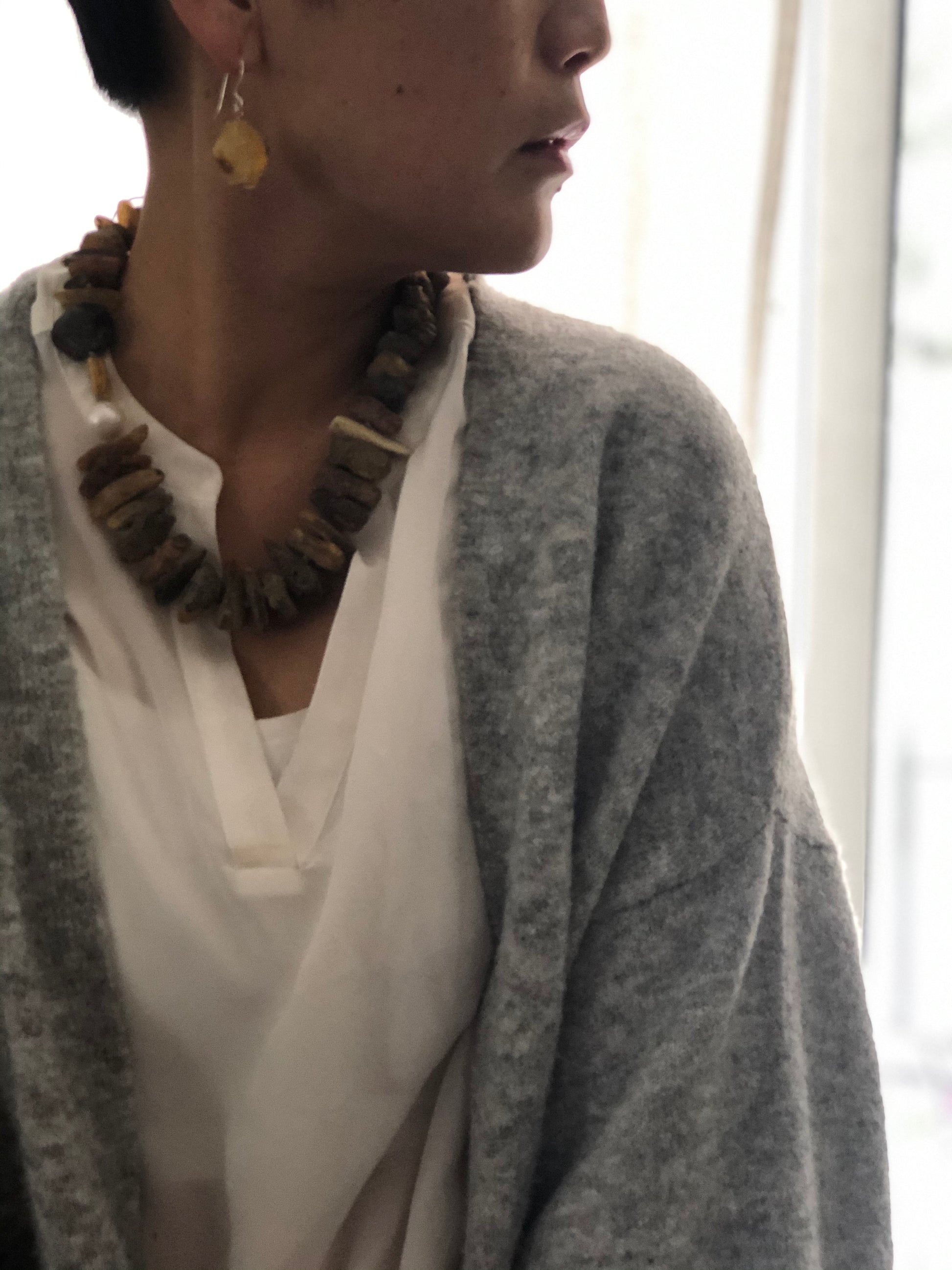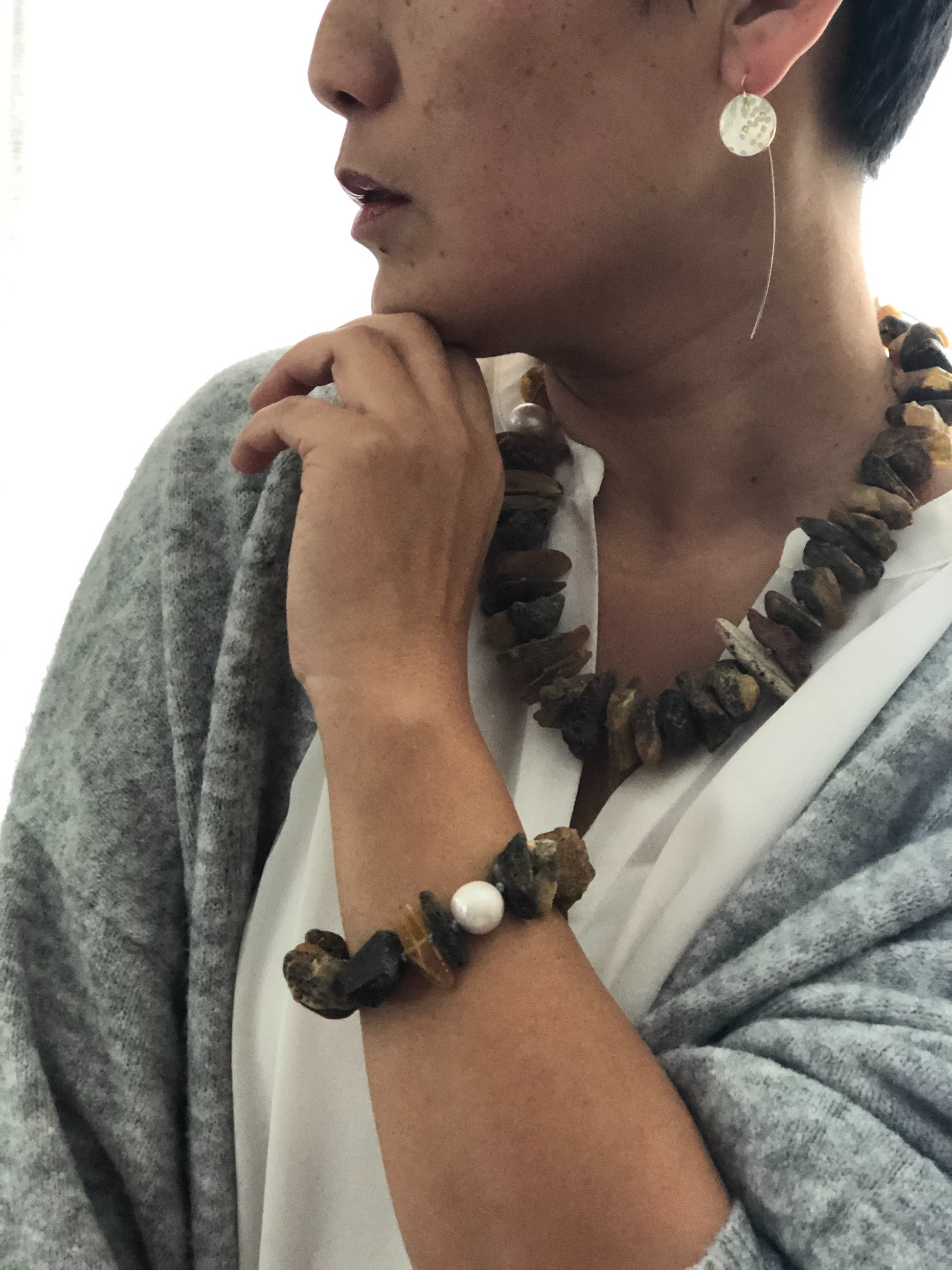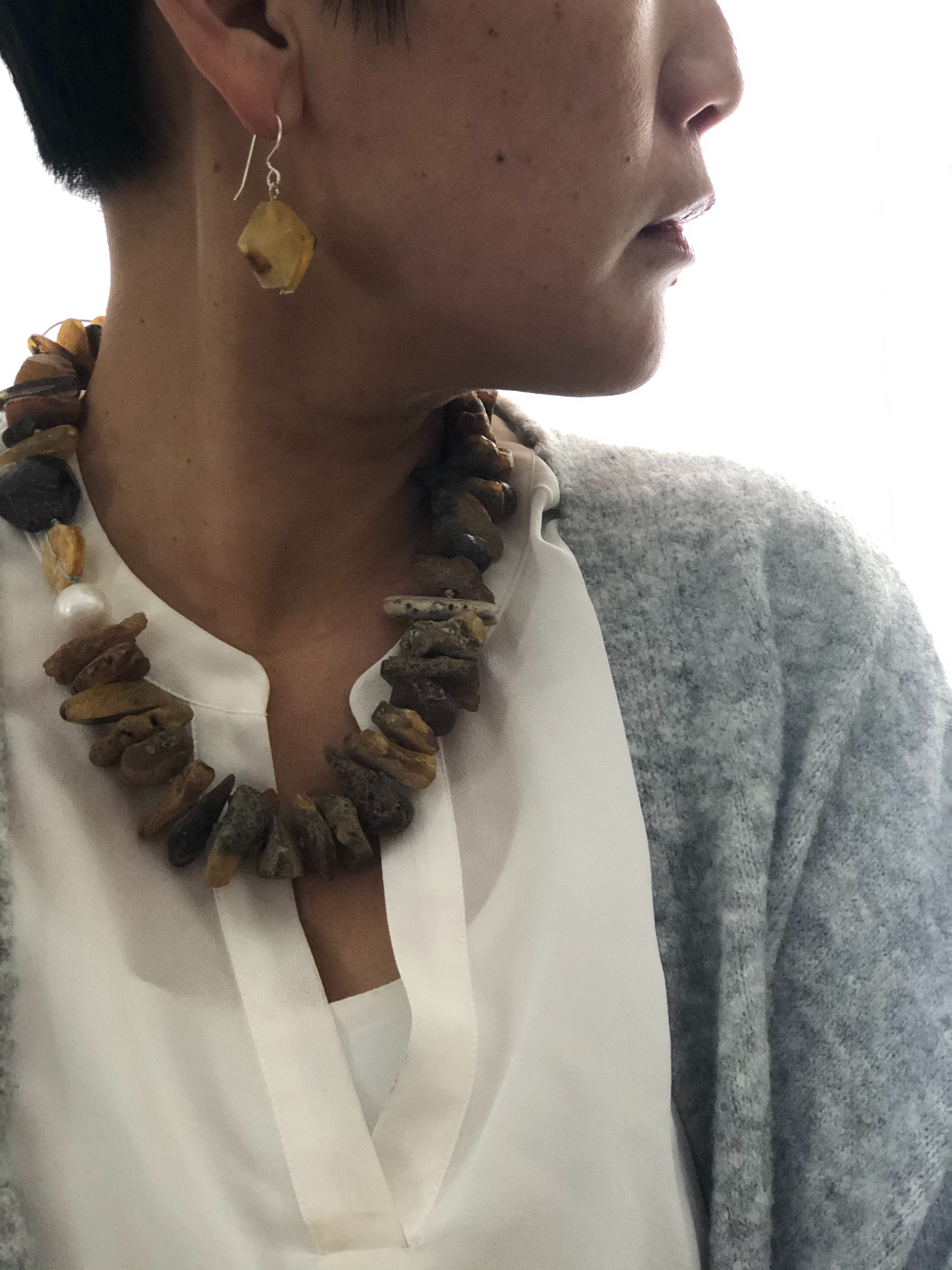 Materials : Raw Baltic amber, fresh water pearl, garnet