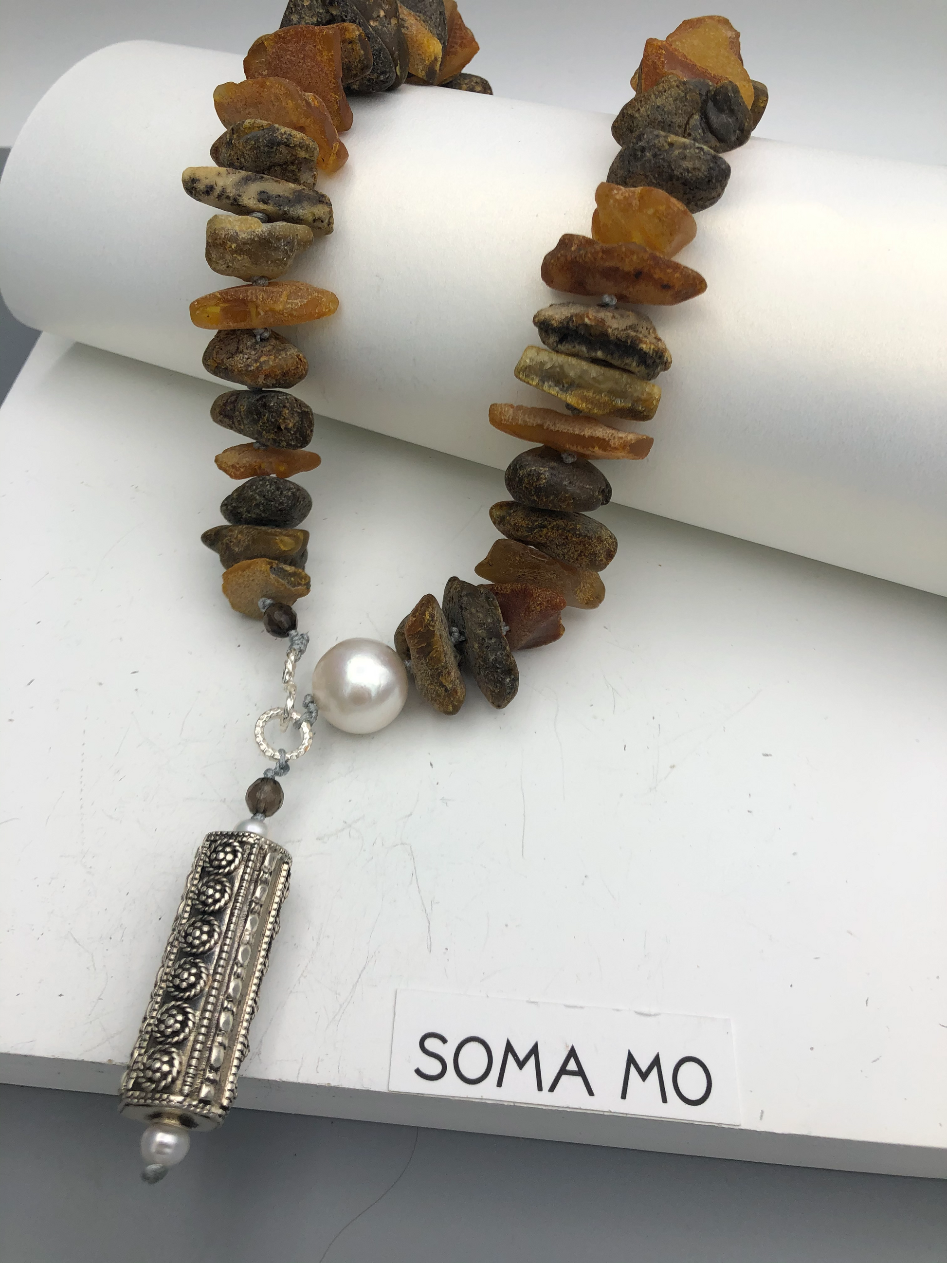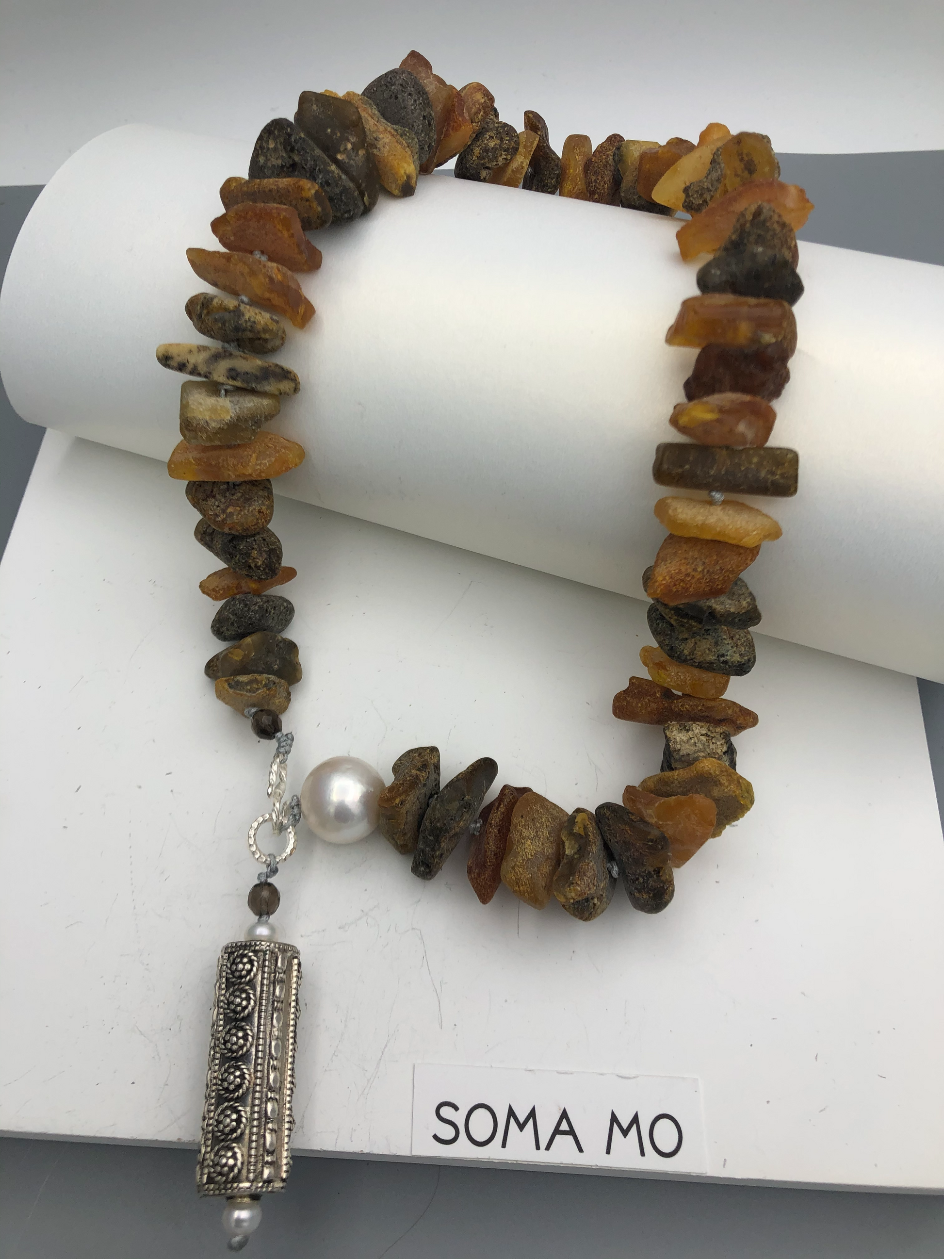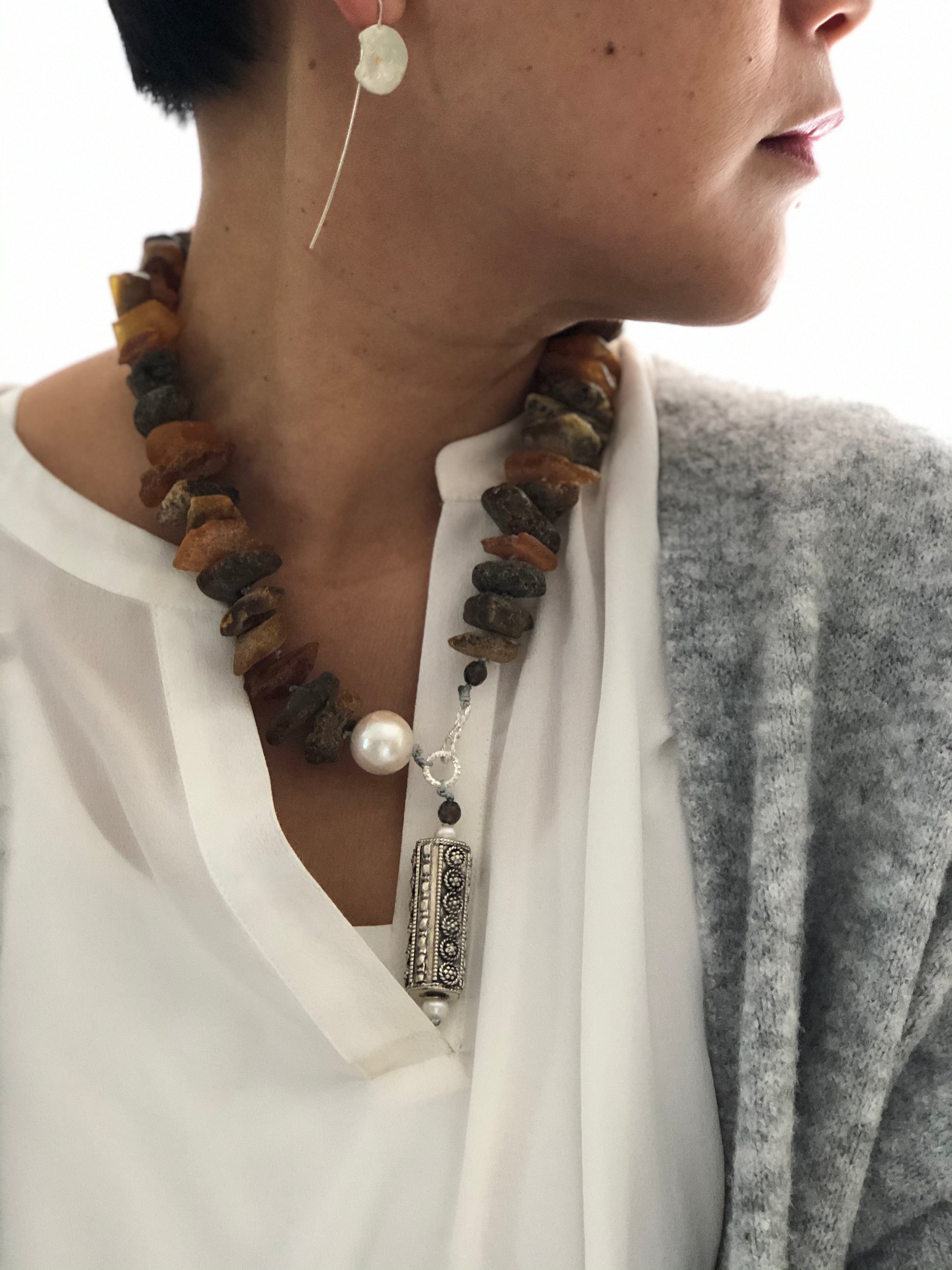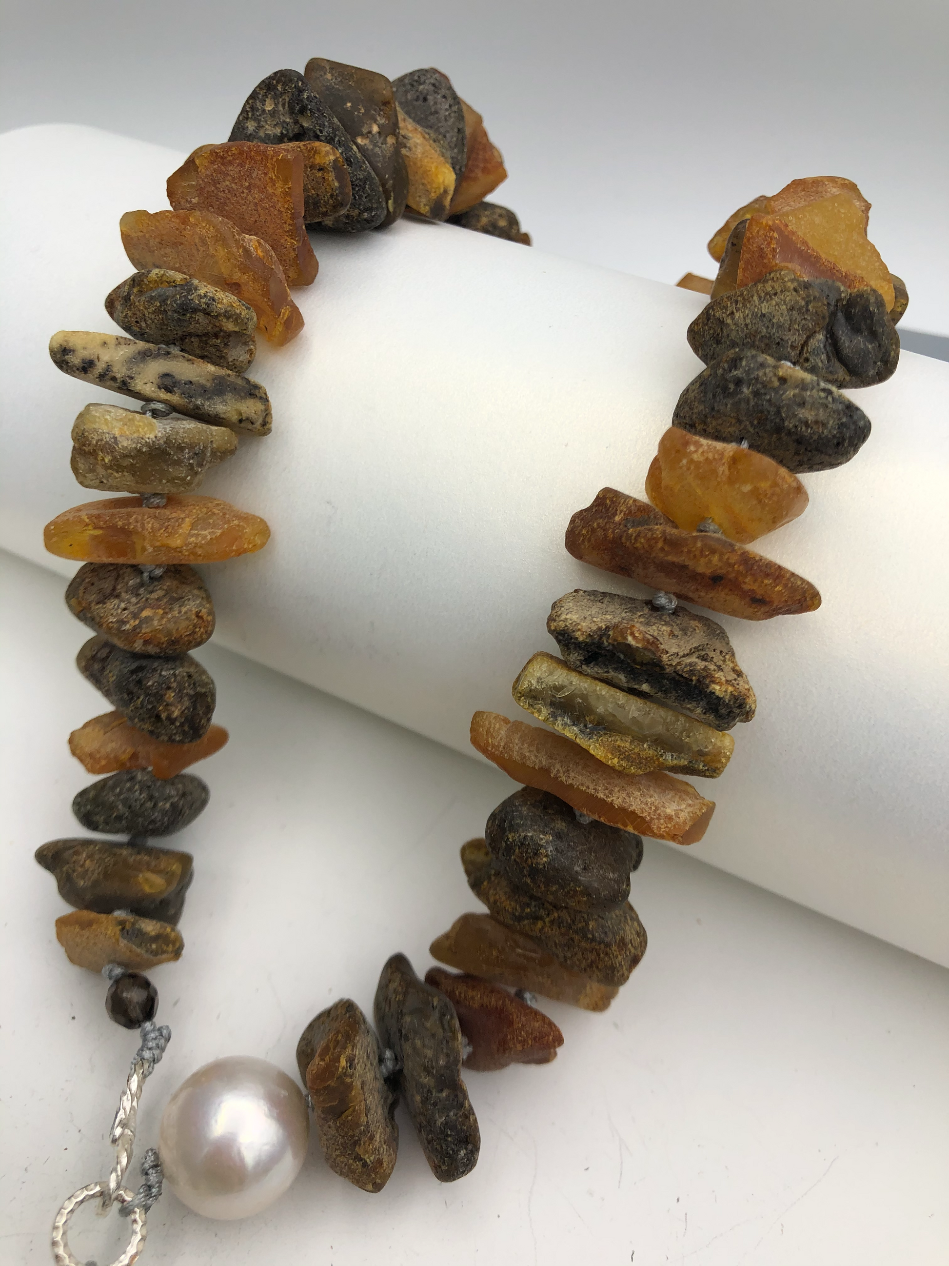 Materials : Raw Baltic amber, Fresh water pearl , Large Bali sterling pendent