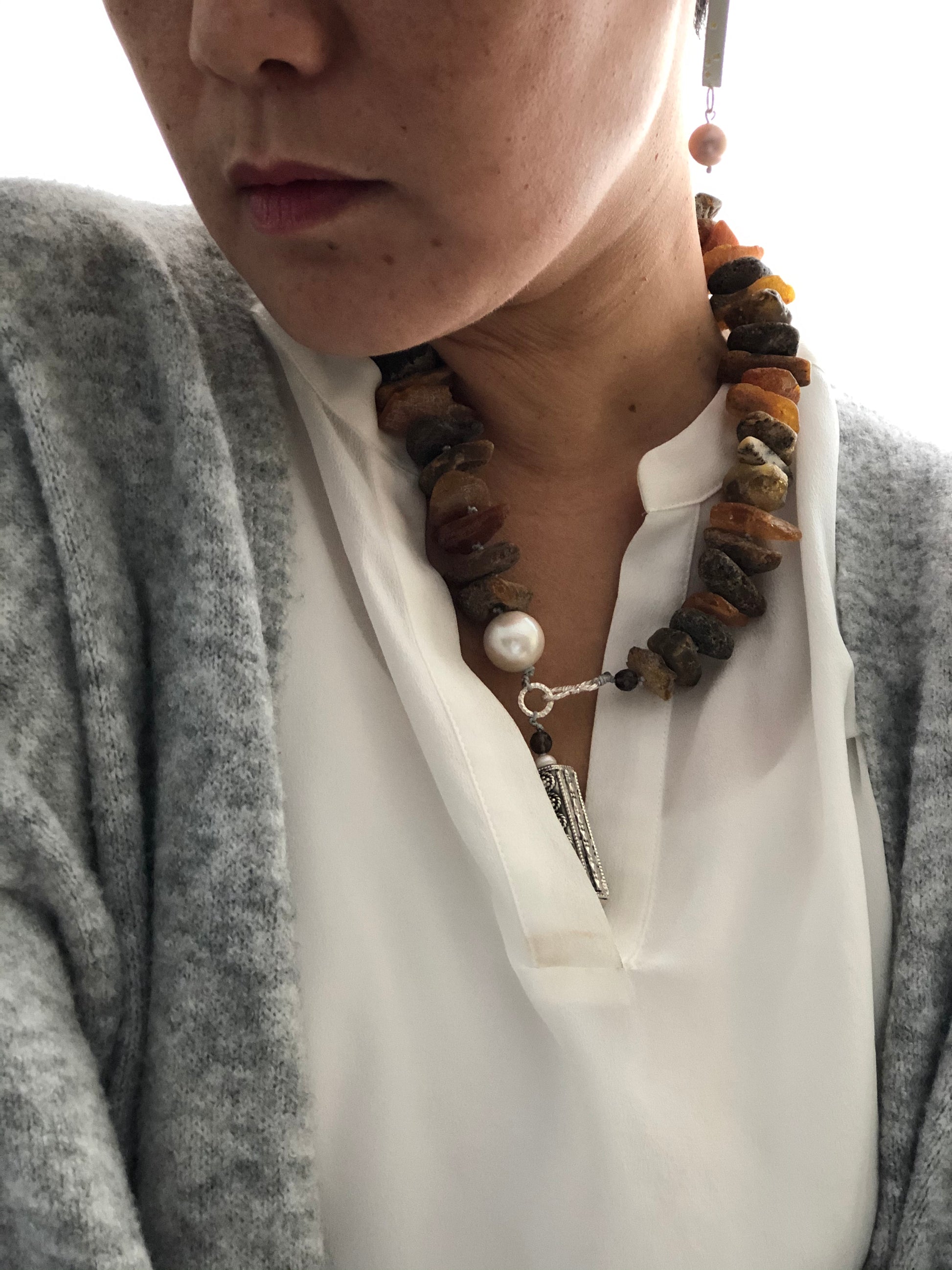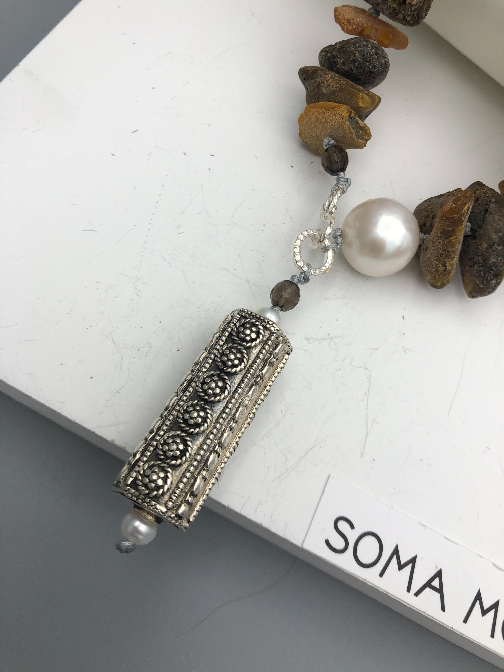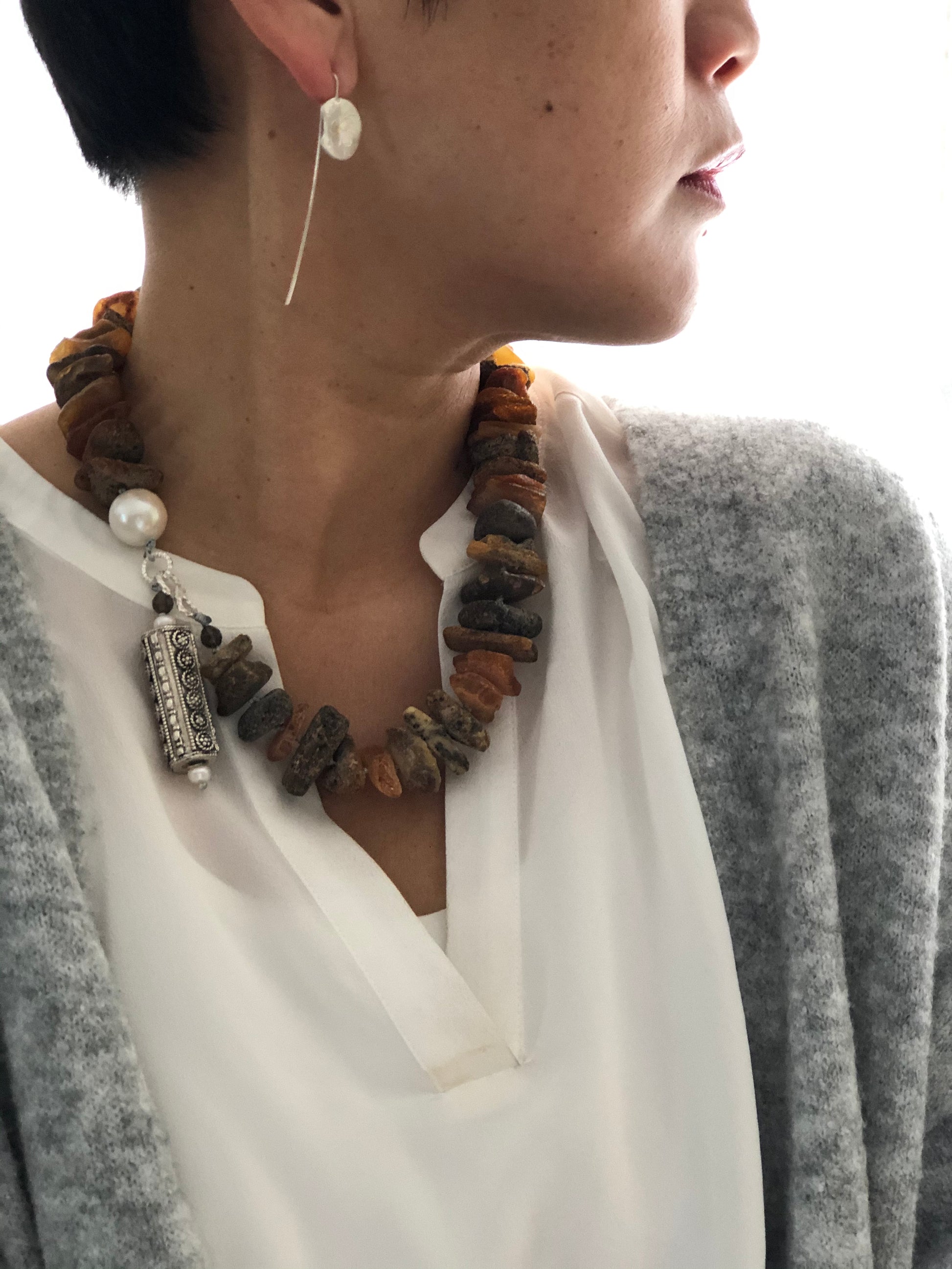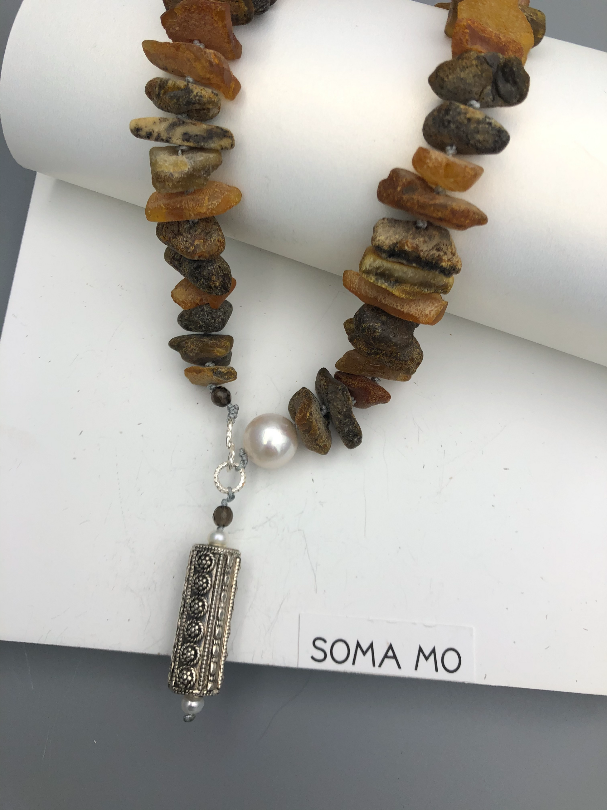 Materials : Raw Baltic amber, Fresh water pearl , Large Bali sterling pendent