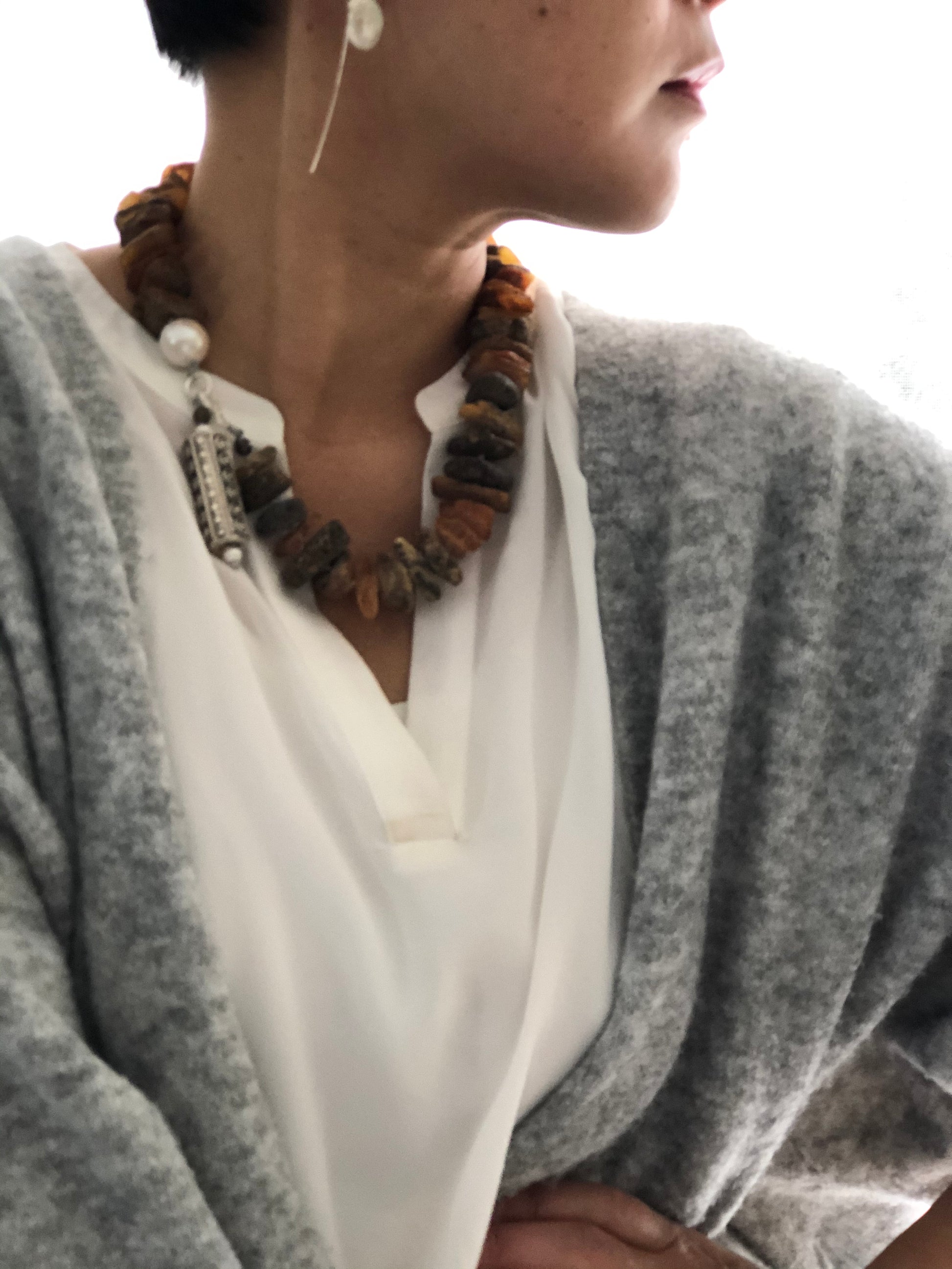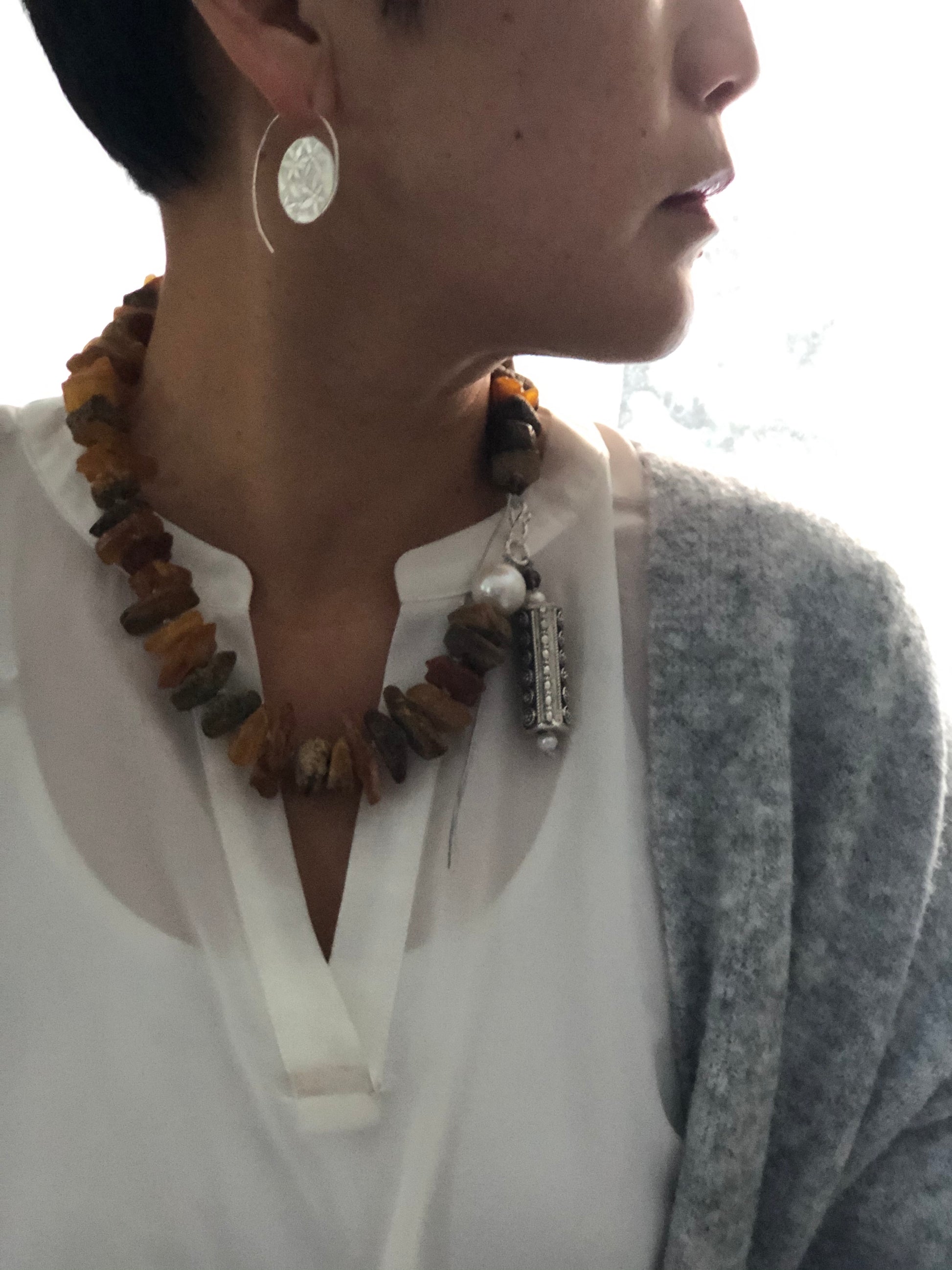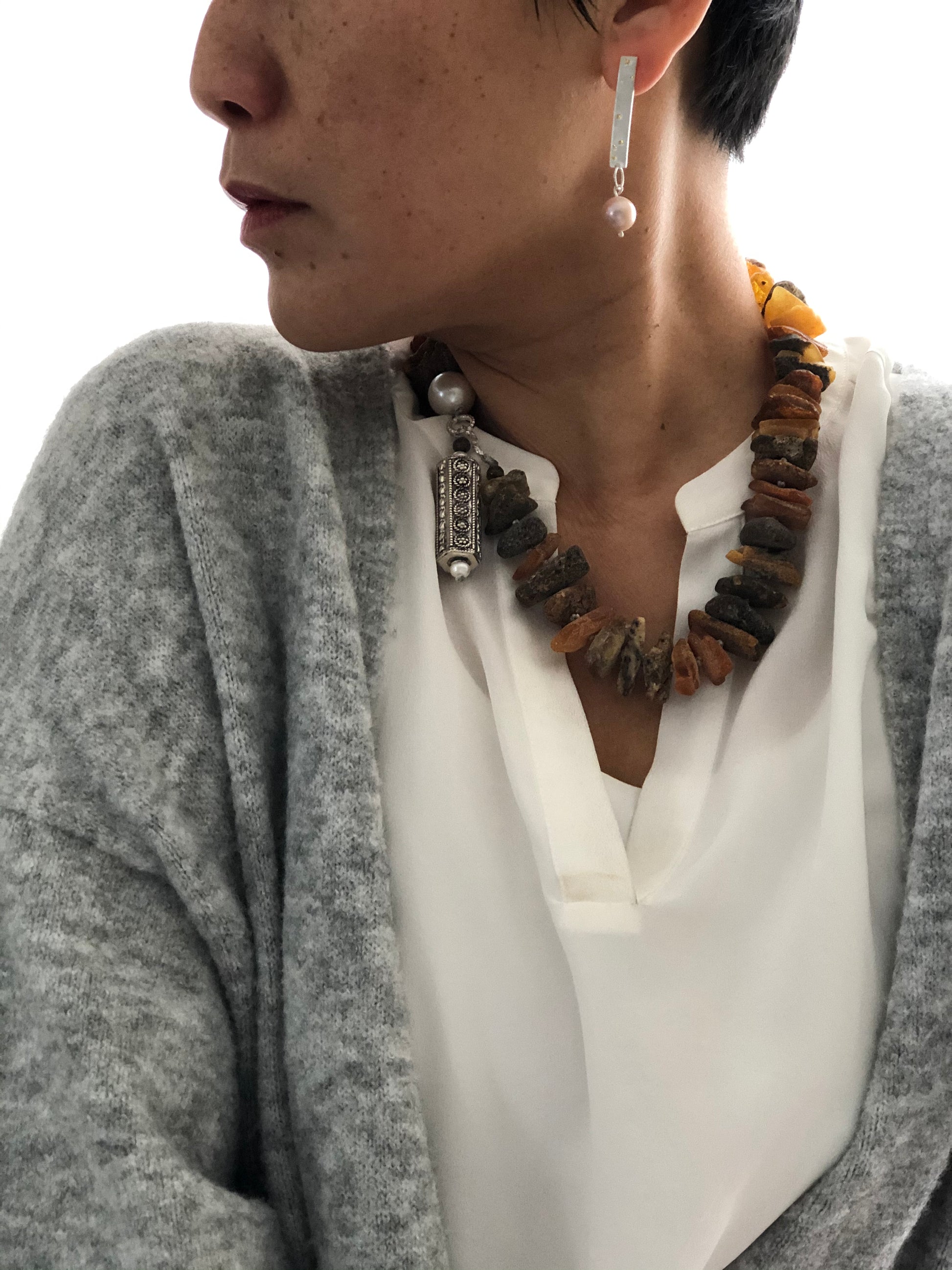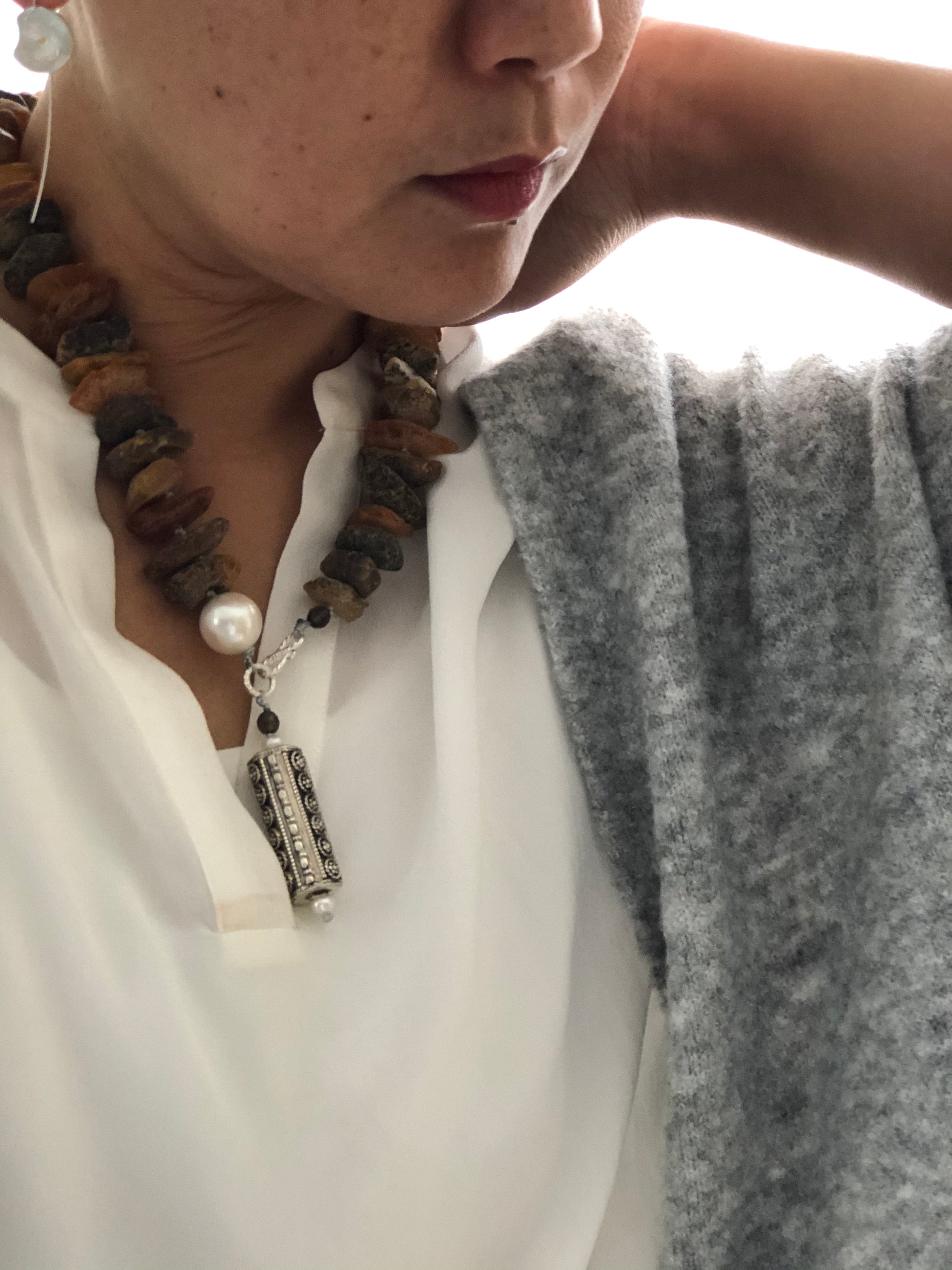 Materials : Raw Baltic amber, Fresh water pearl , Large Bali sterling pendent