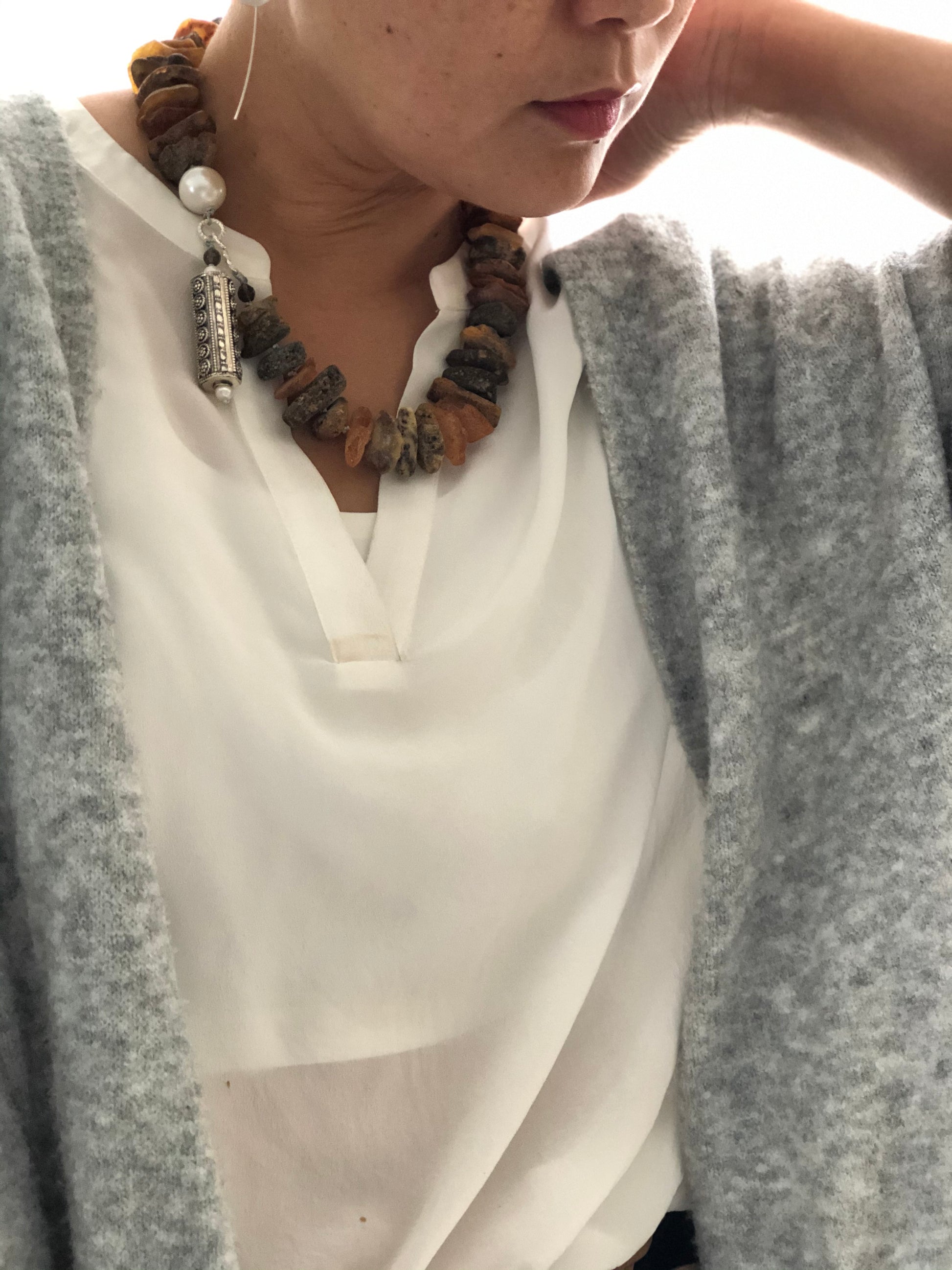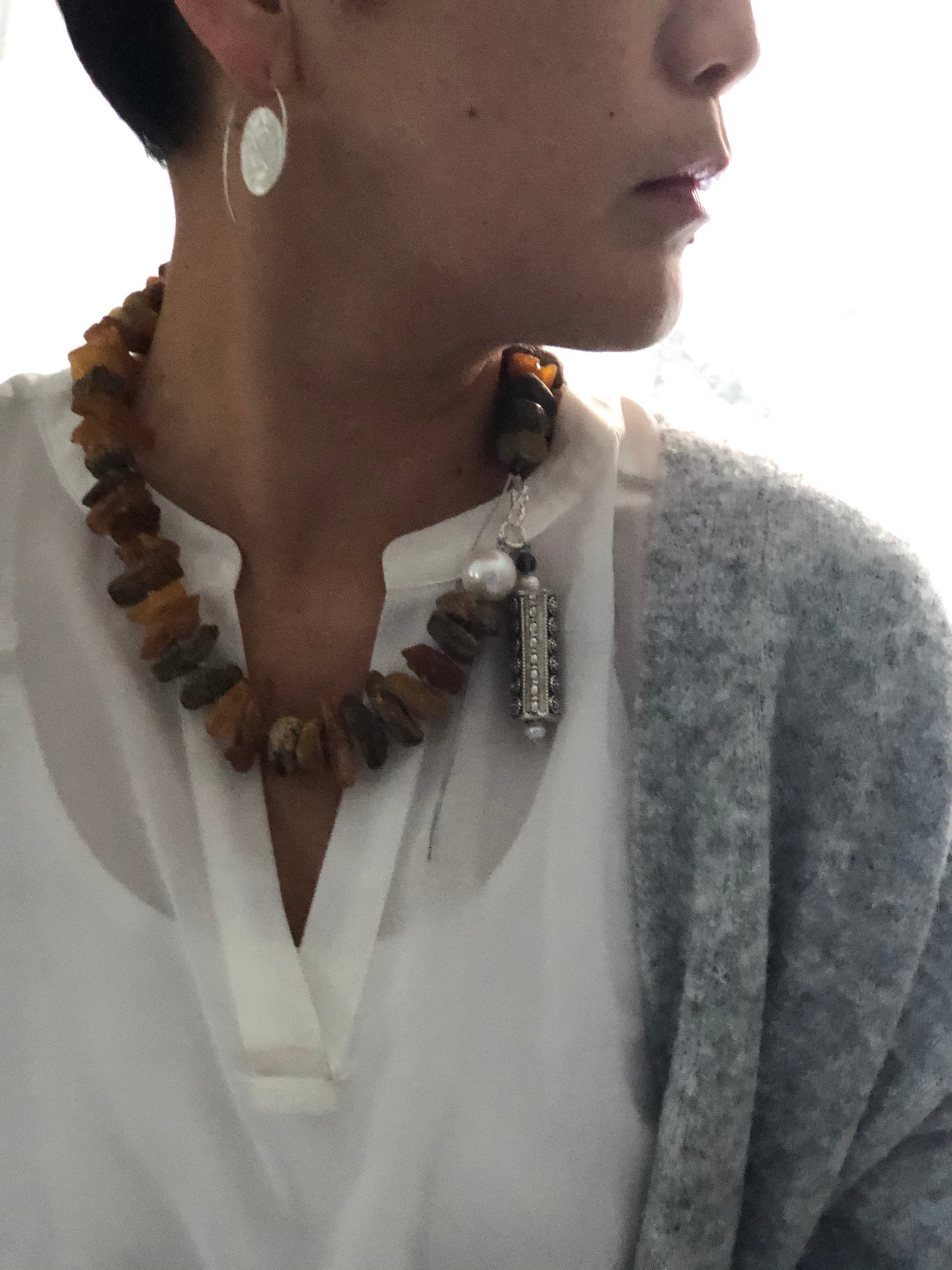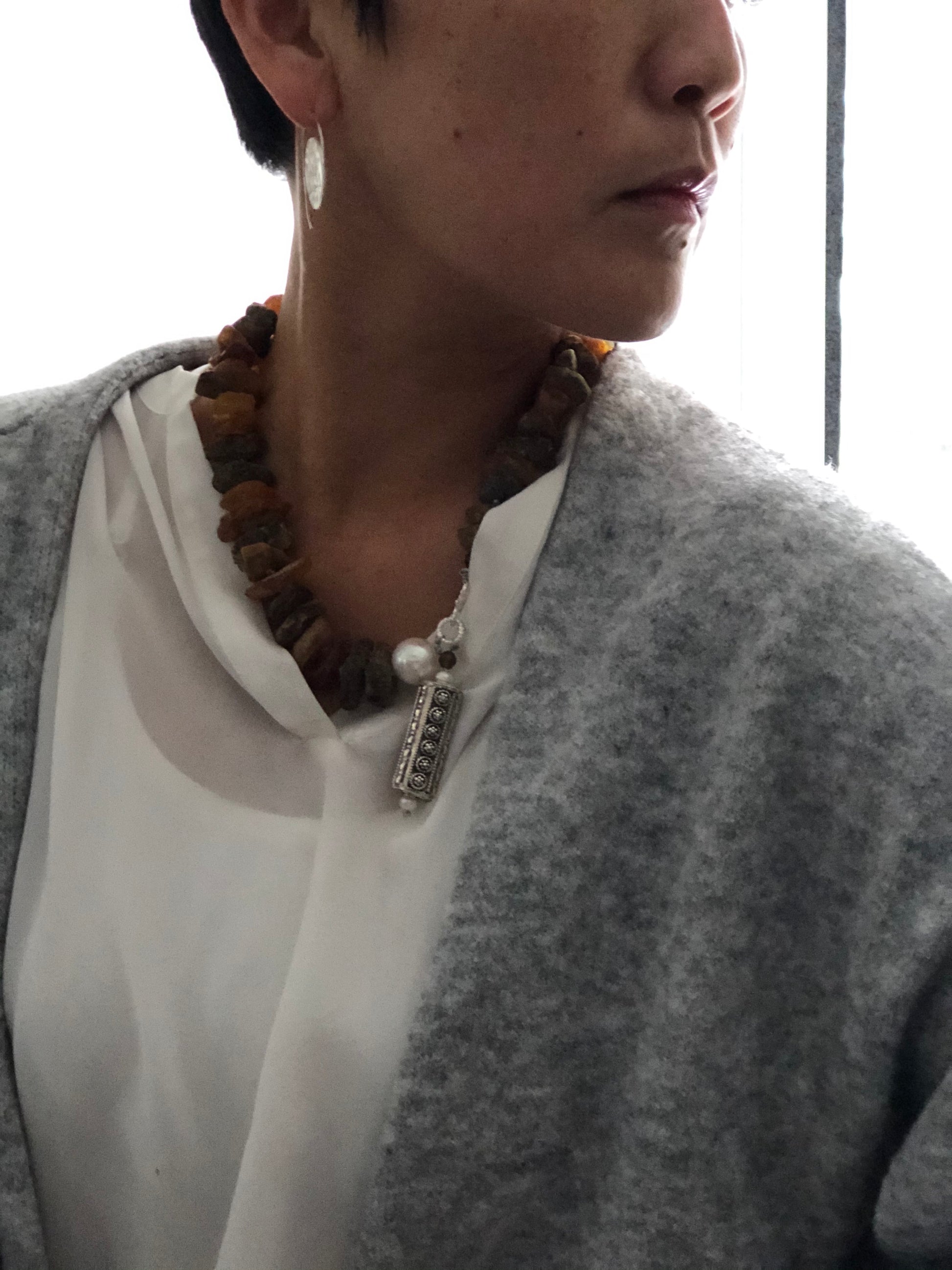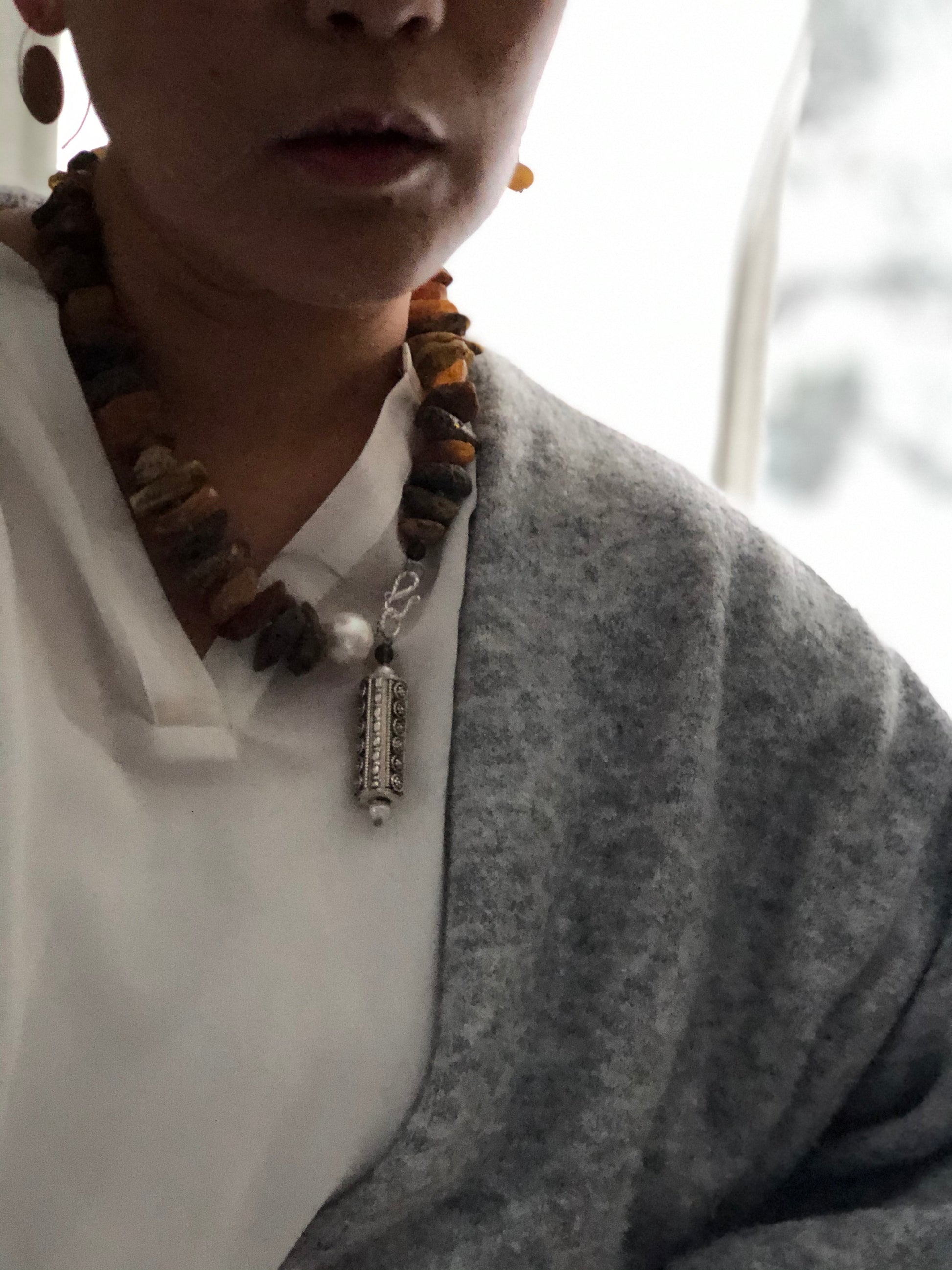 Materials : Raw Baltic amber, Fresh water pearl , Large Bali sterling pendent