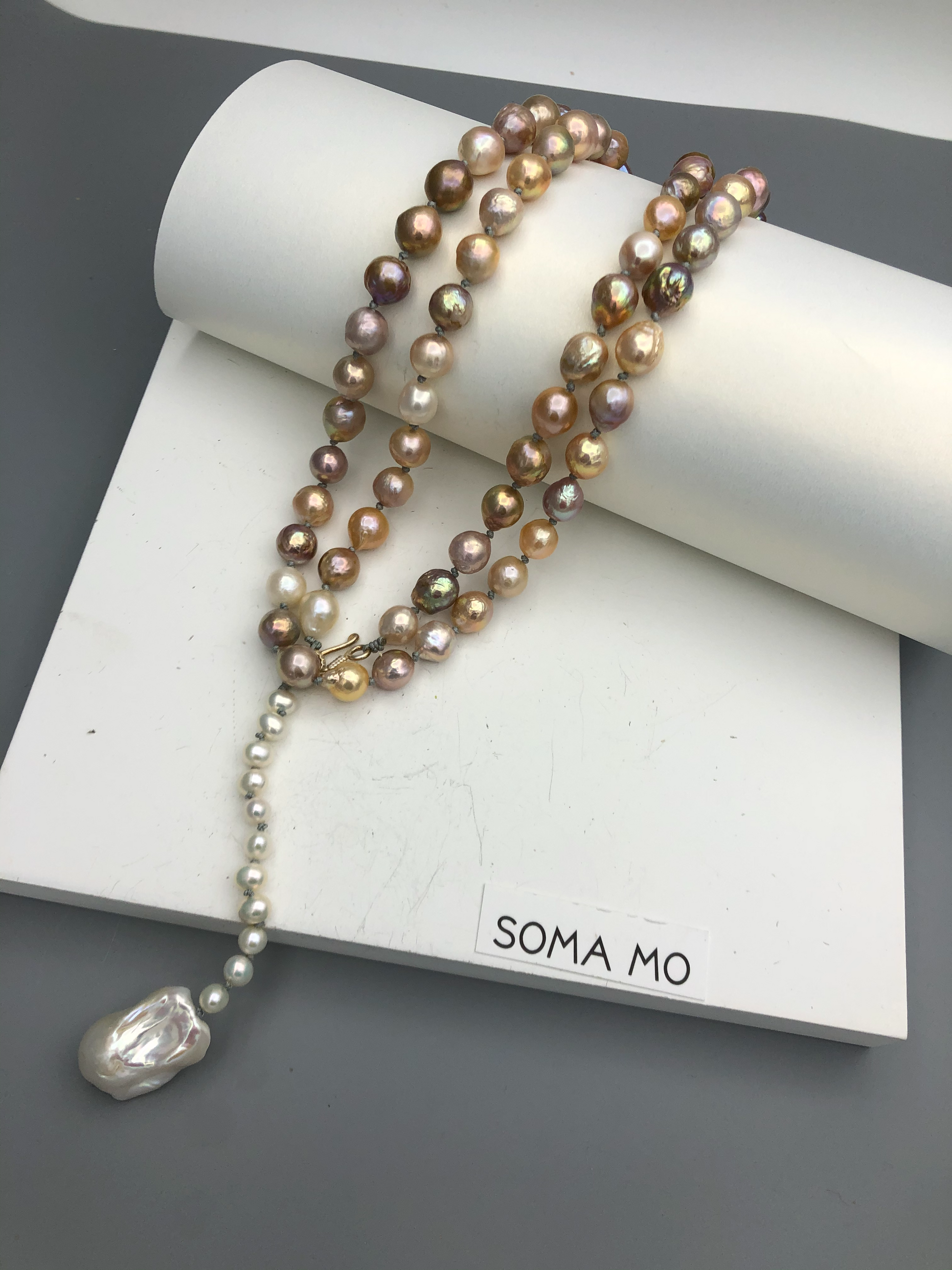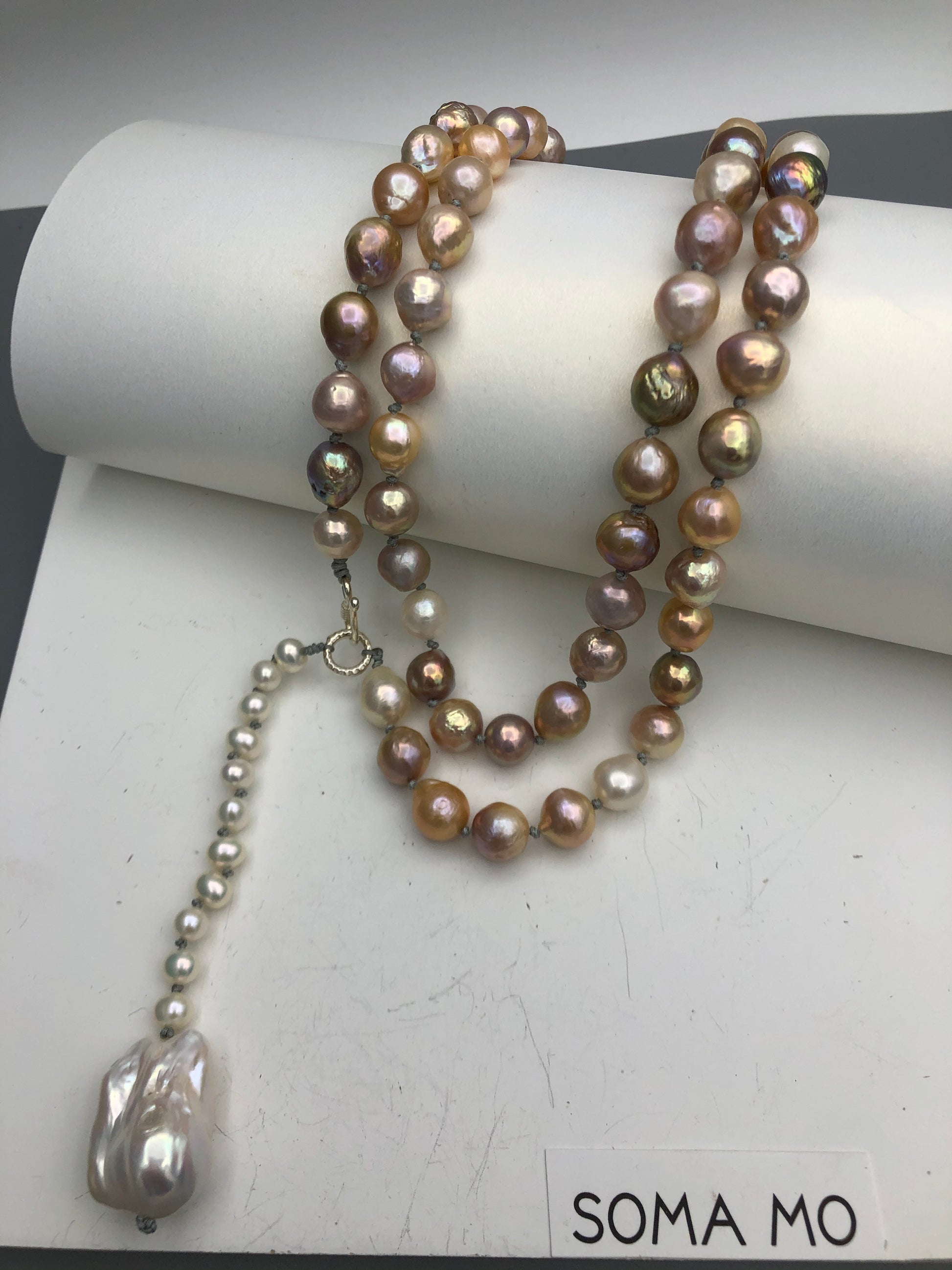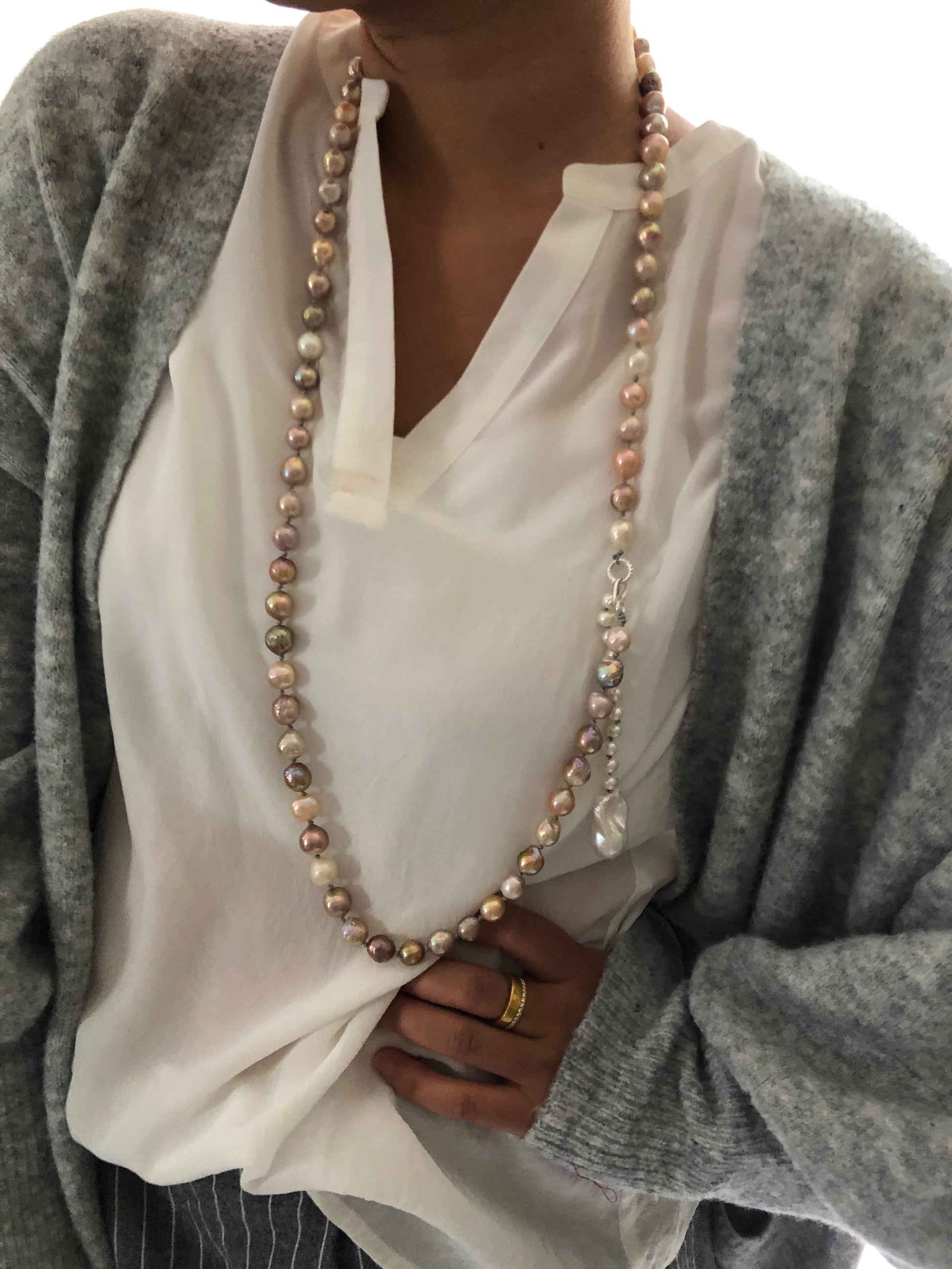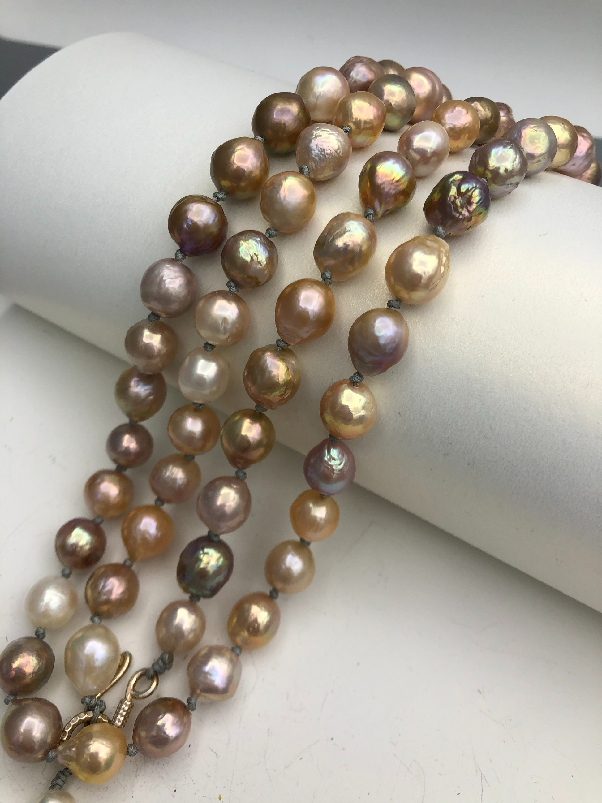 Very rich color , Edson pearl . Hand knotted between each beads, can be worn long or doubled .