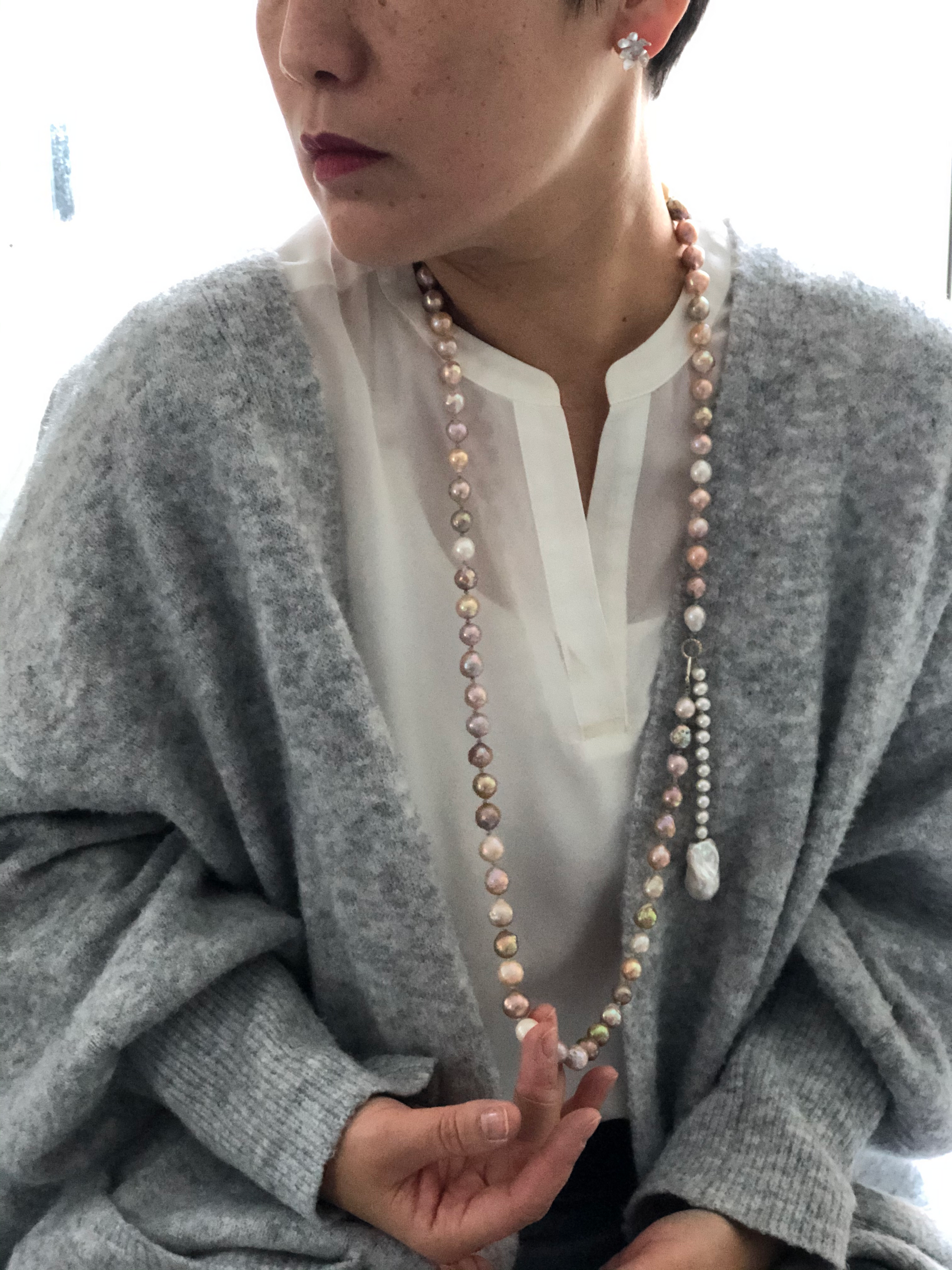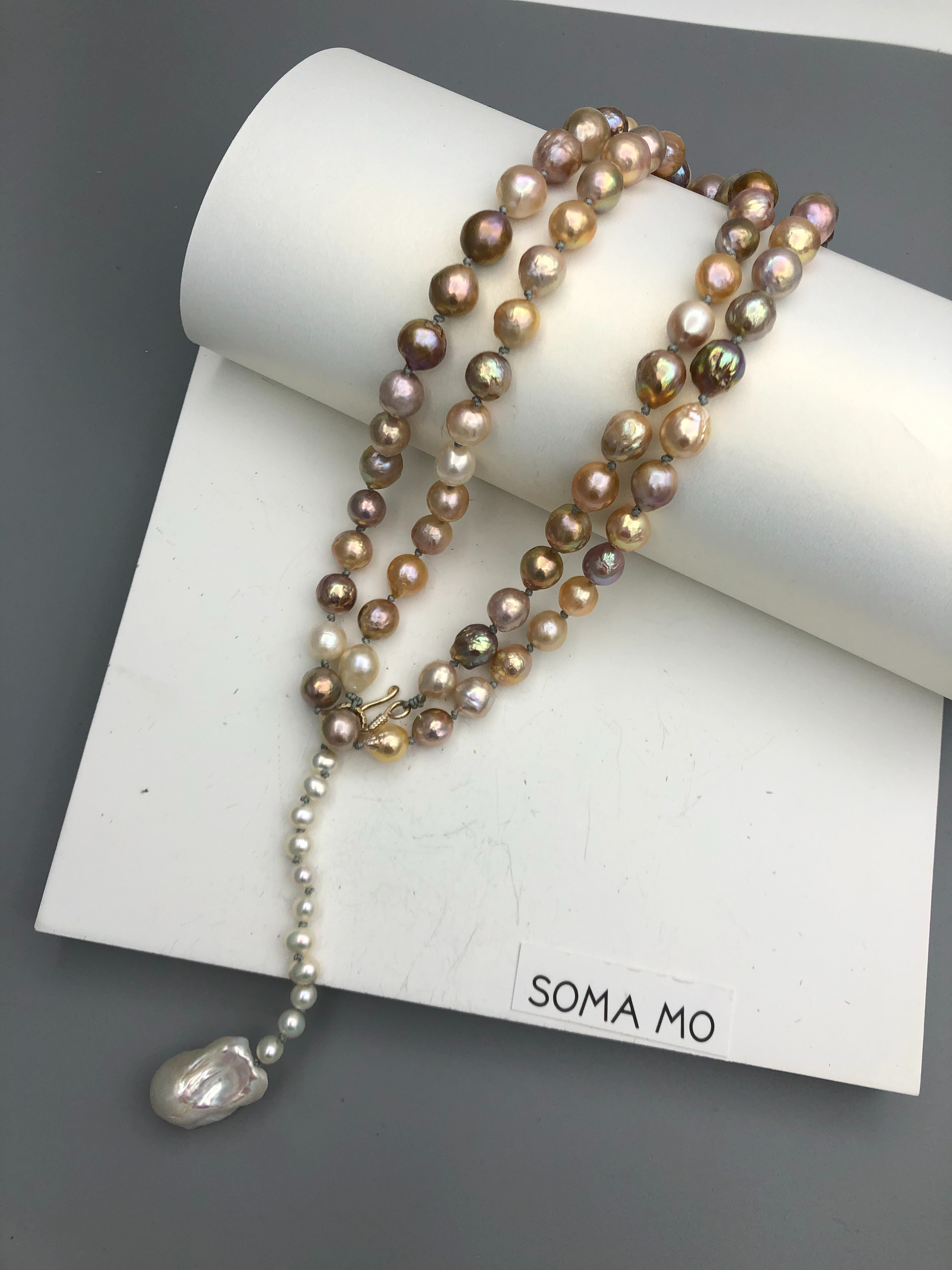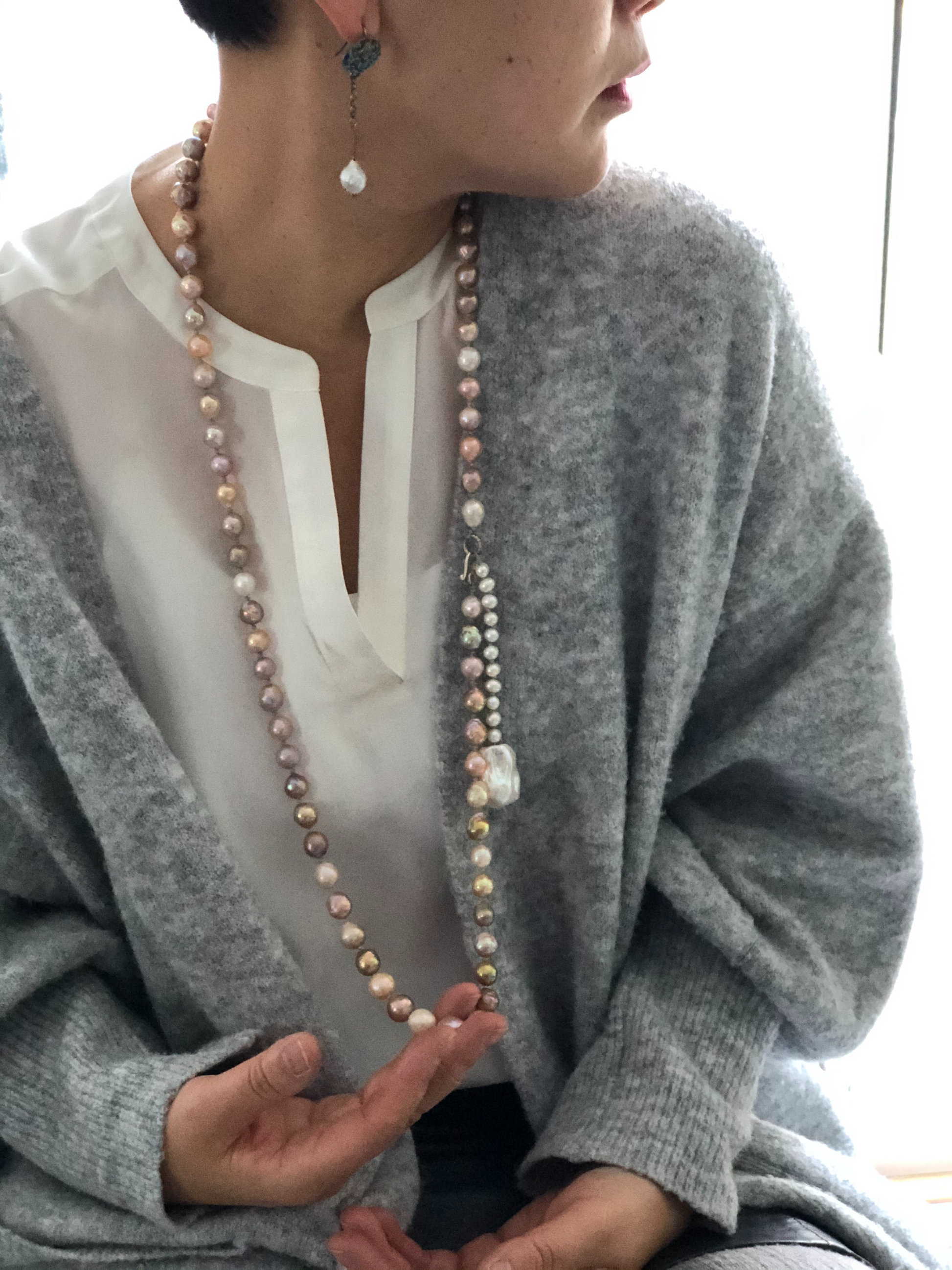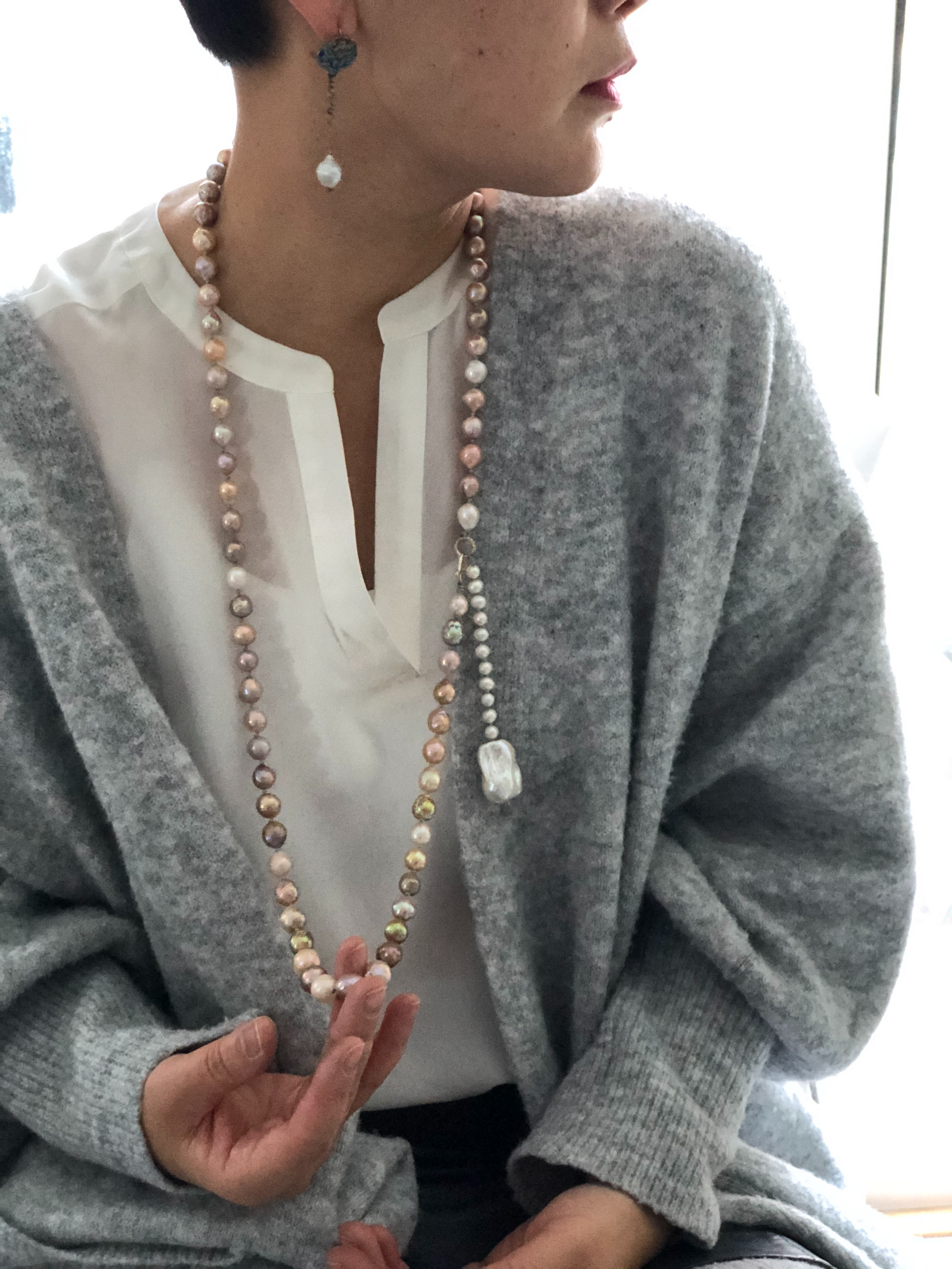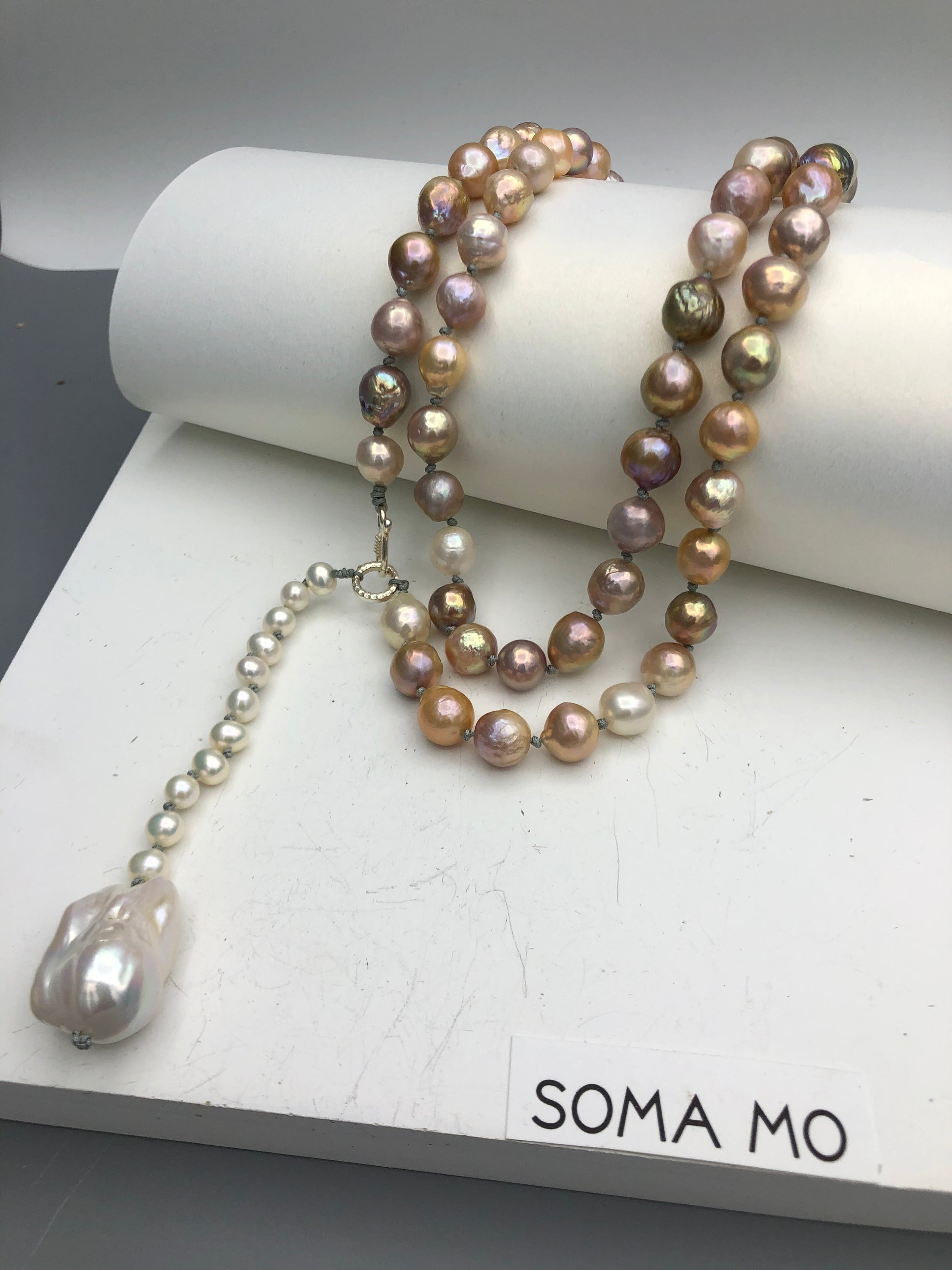 Very rich color , Edson pearl . Hand knotted between each beads, can be worn long or doubled .