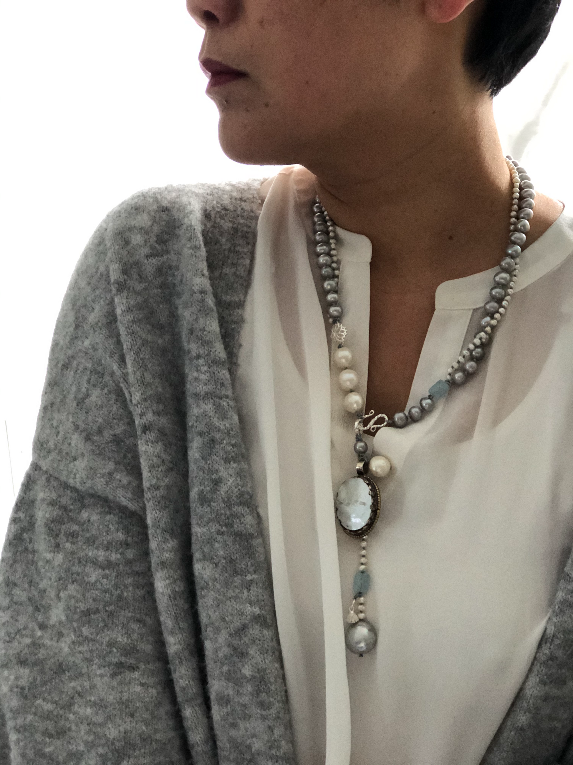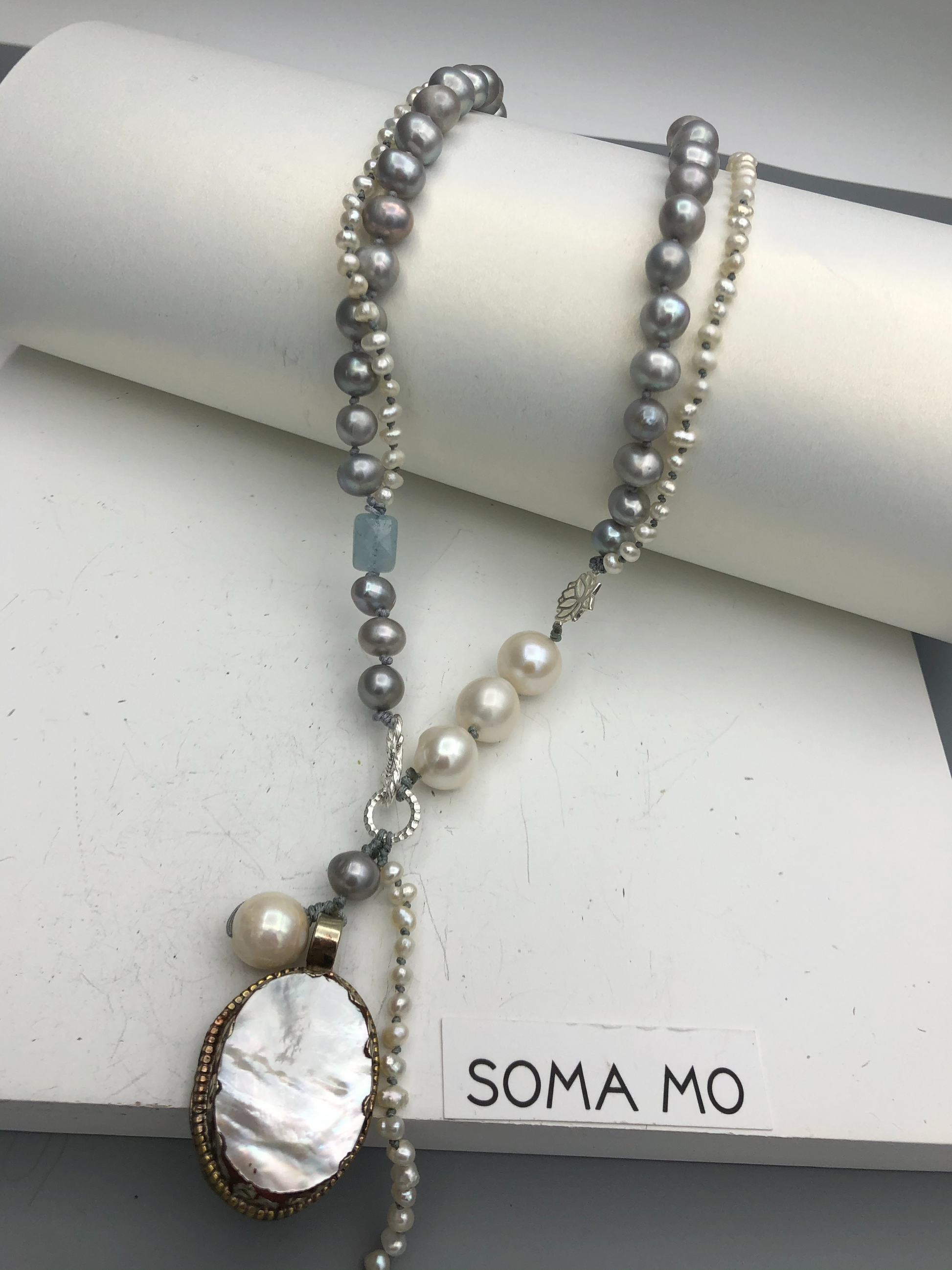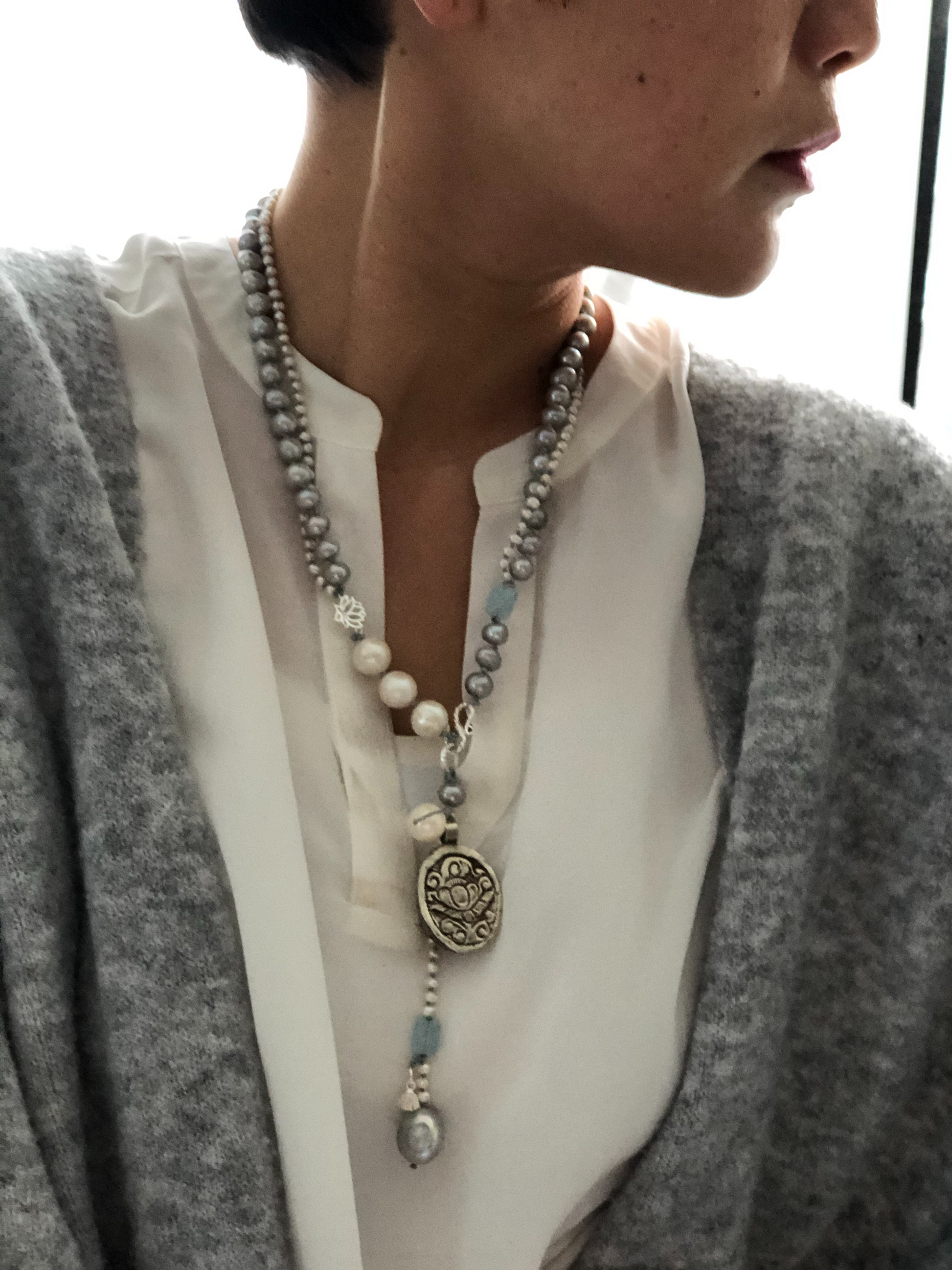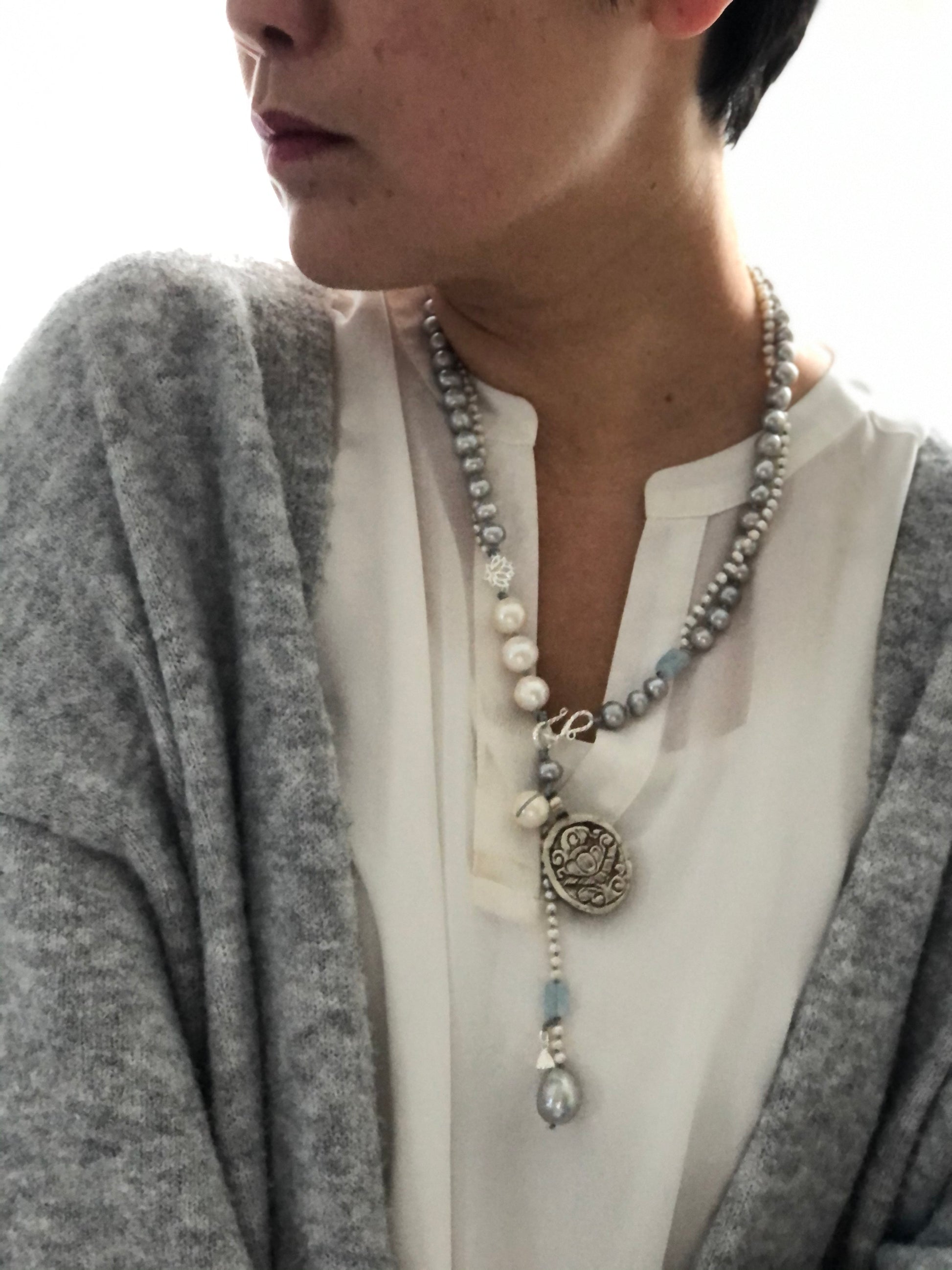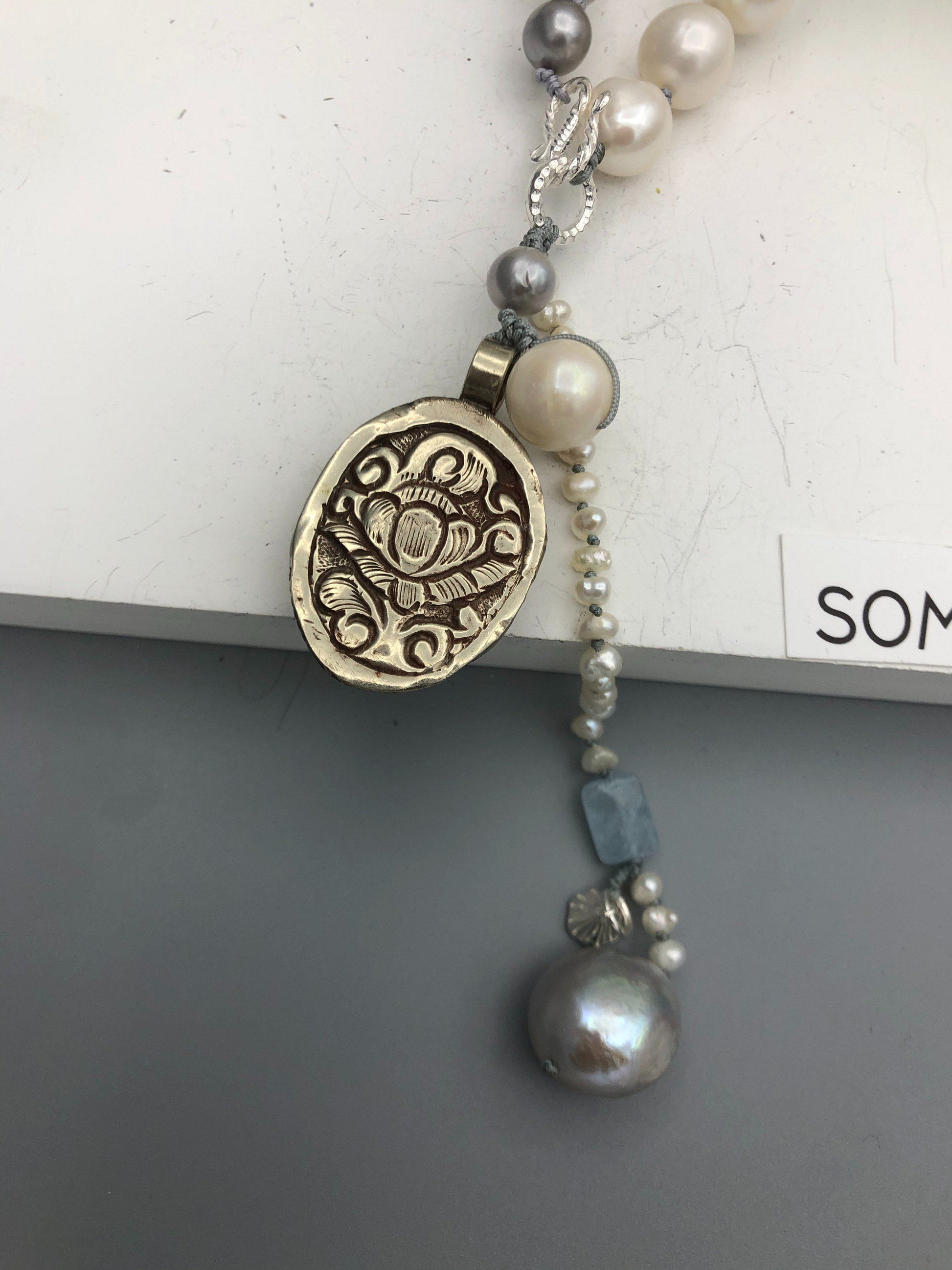 Materials : Tibetan silver pendent with mother of pearl, fresh water pearl, fine silver