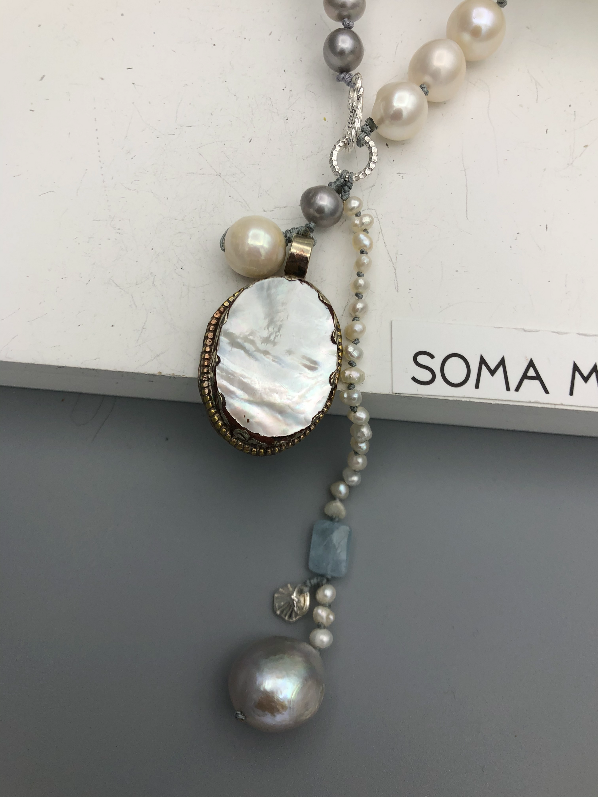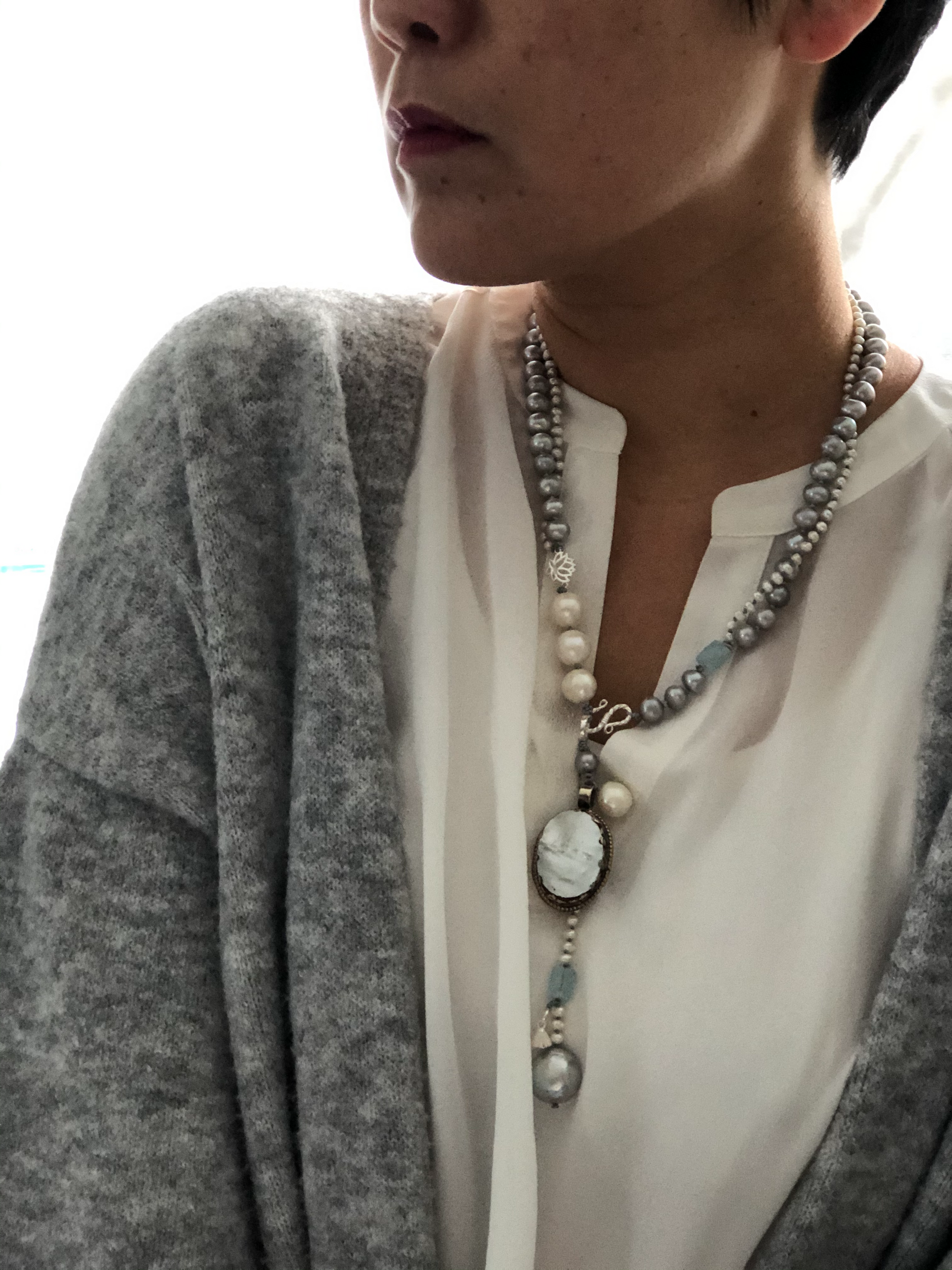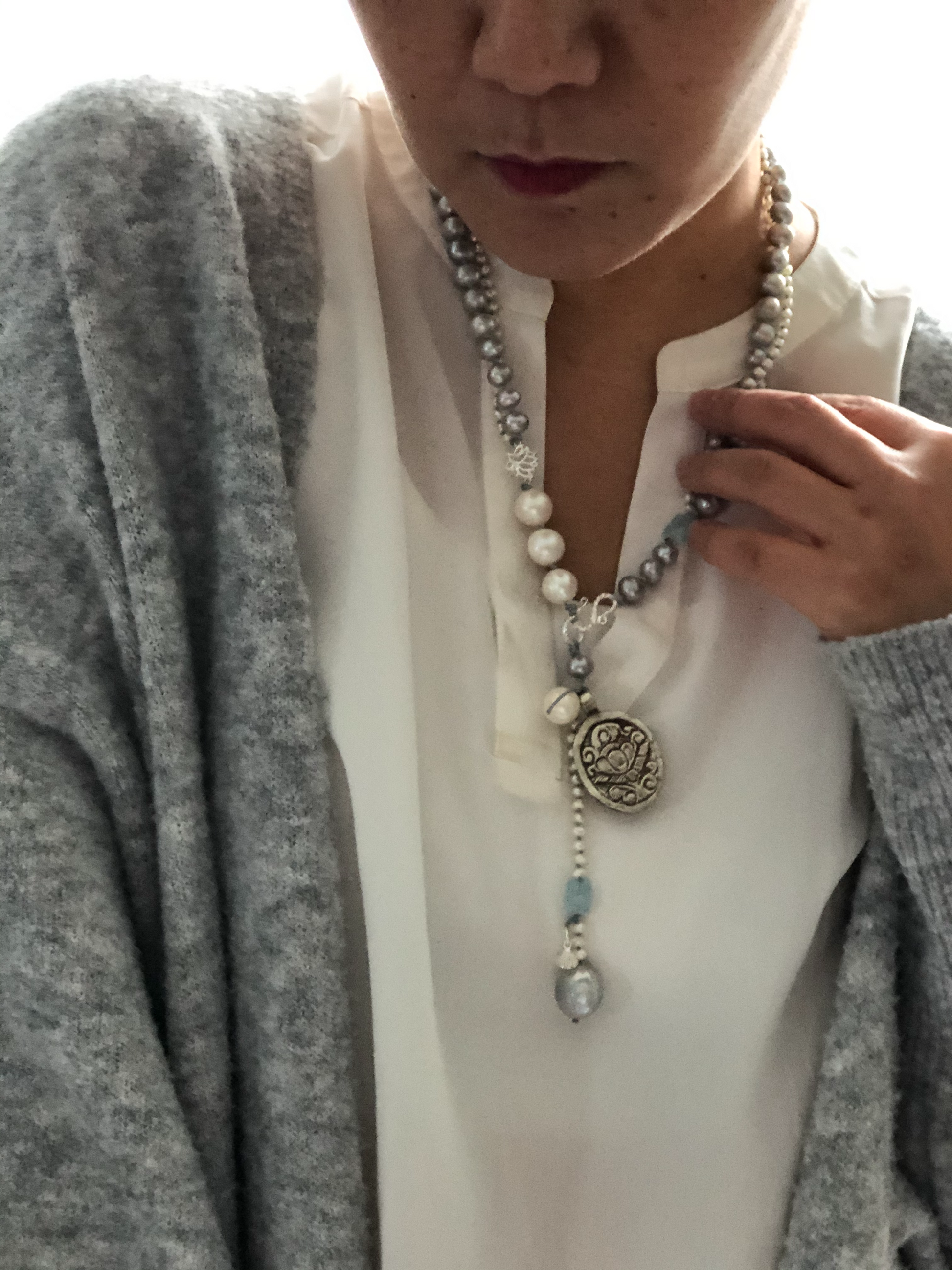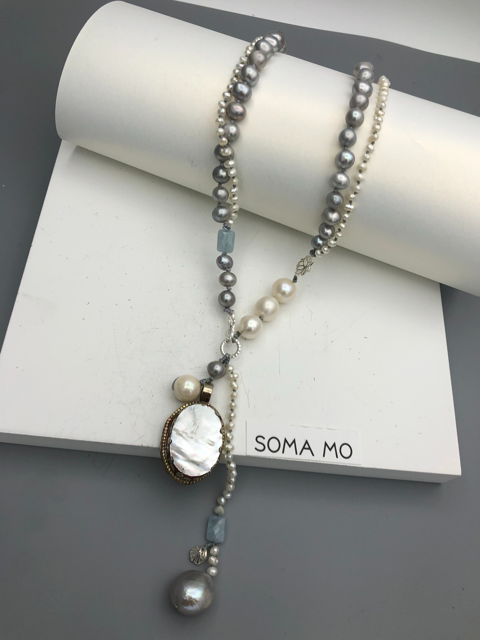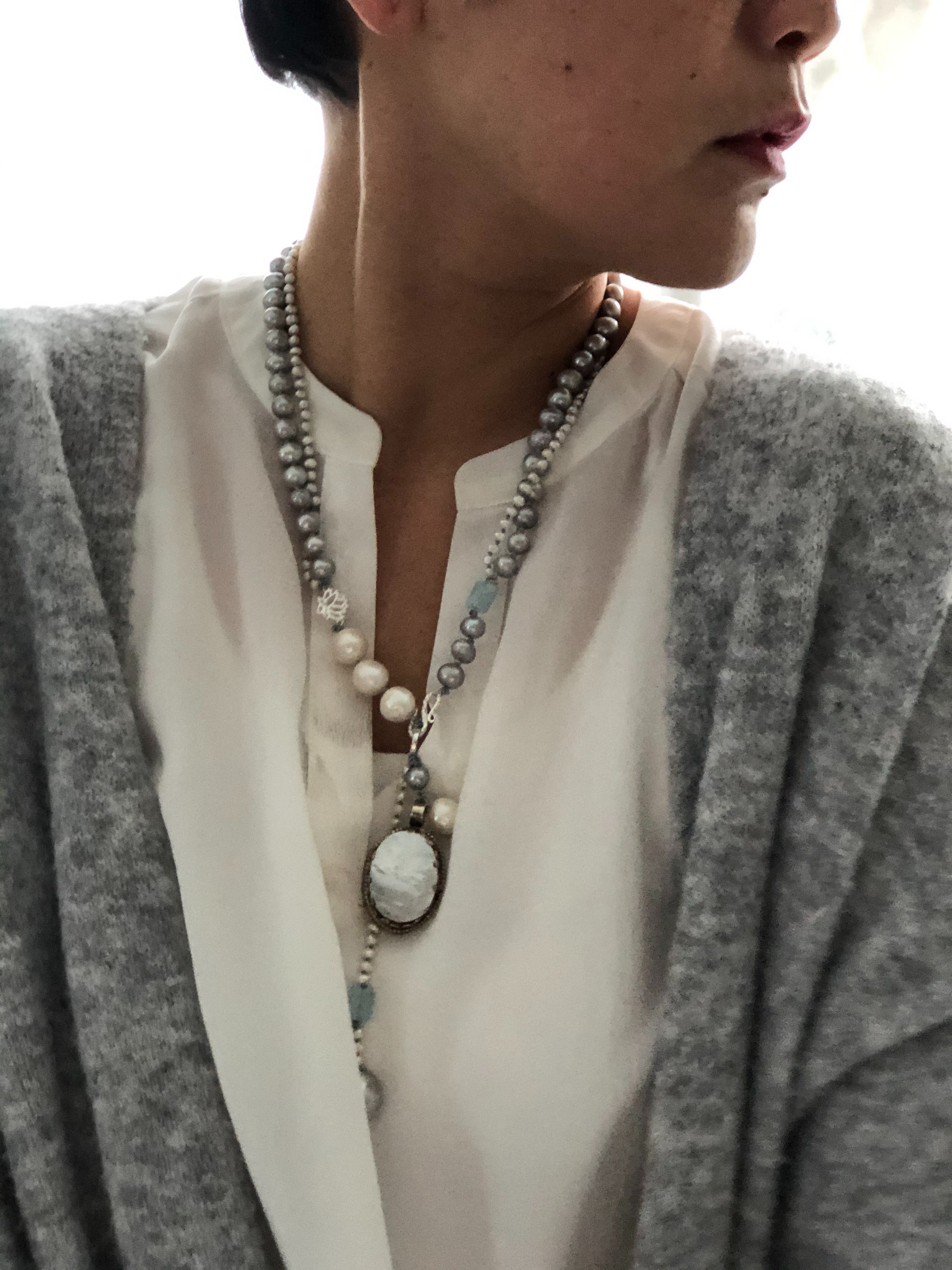 Materials : Tibetan silver pendent with mother of pearl, fresh water pearl, fine silver