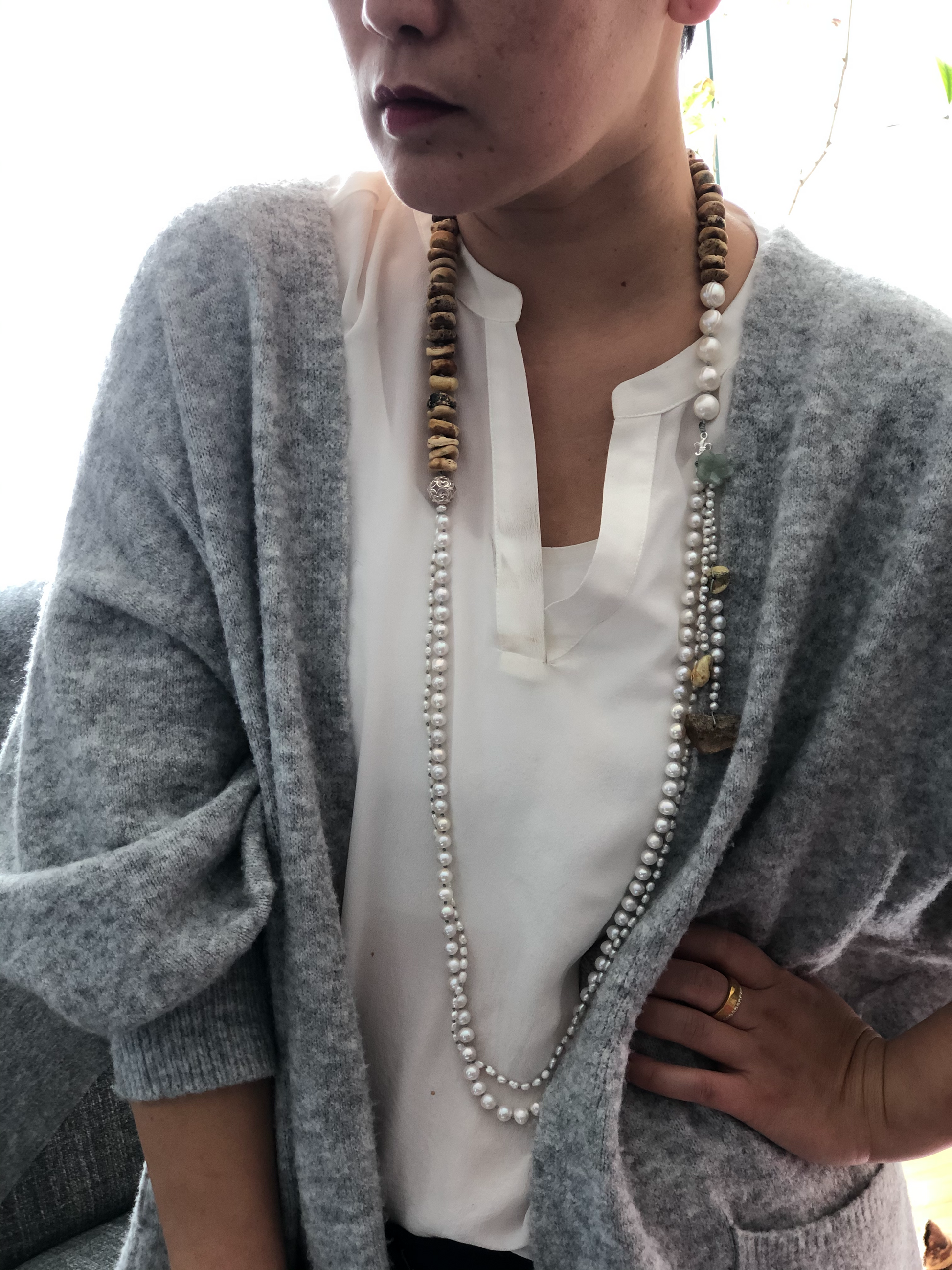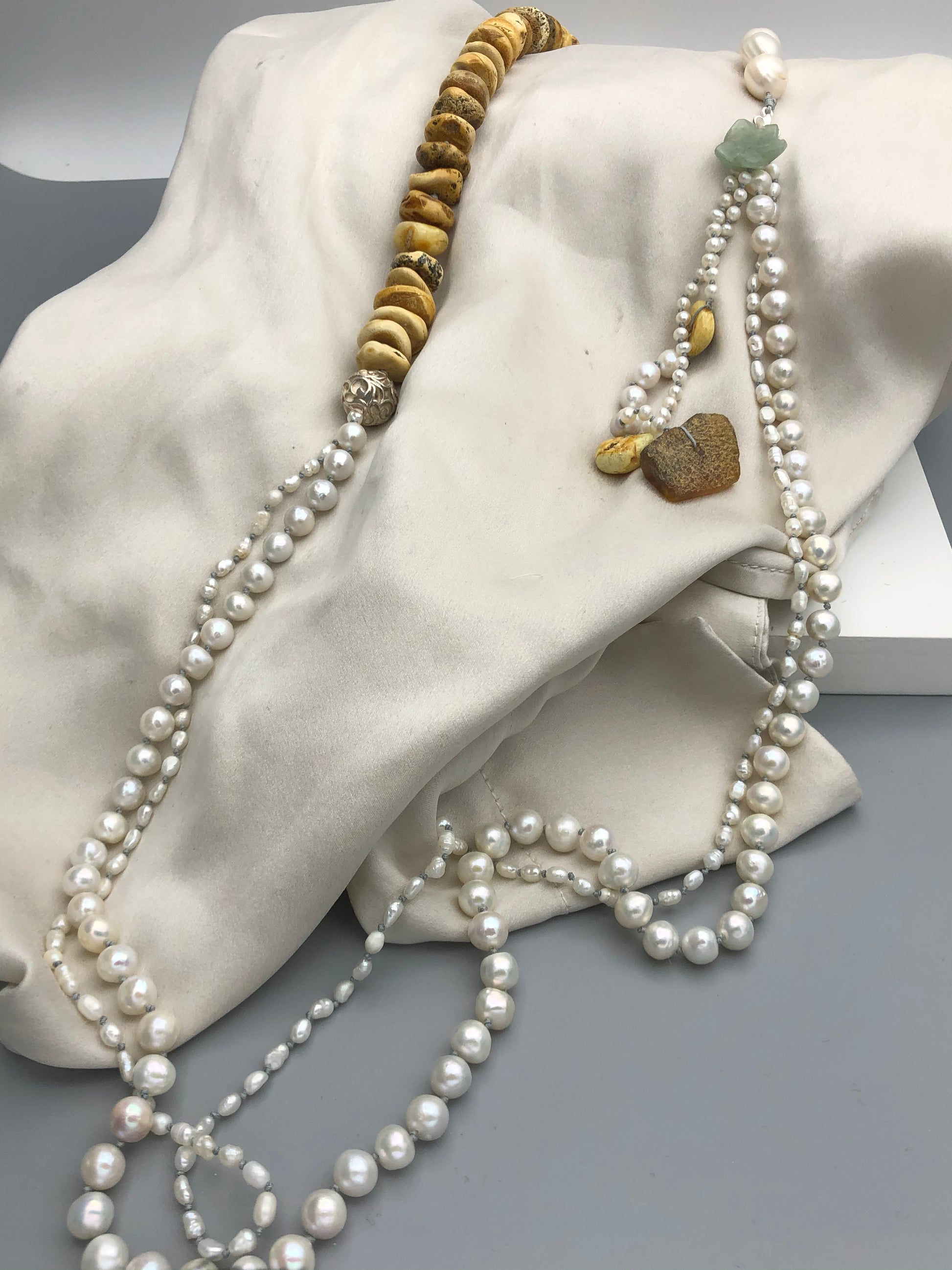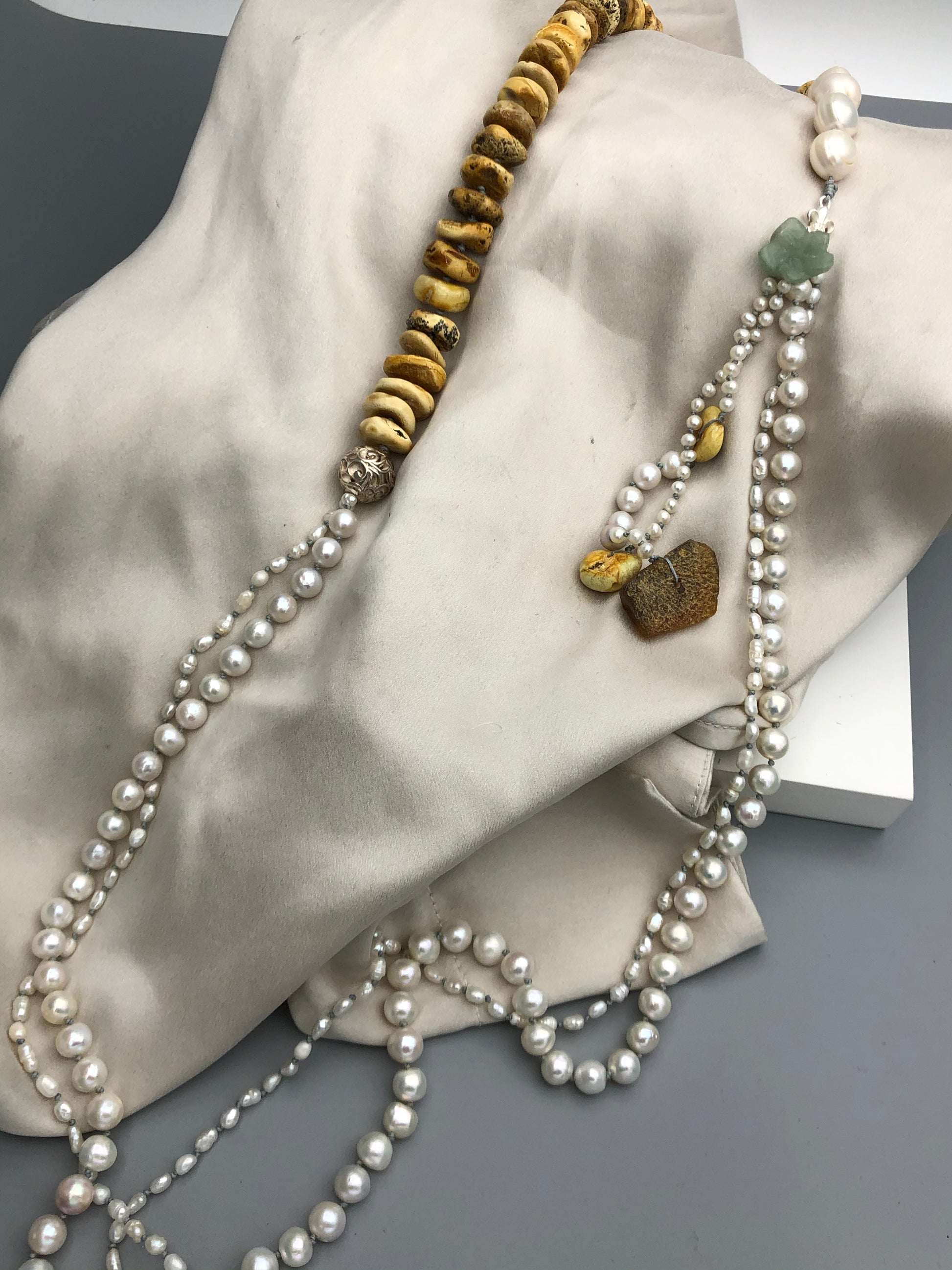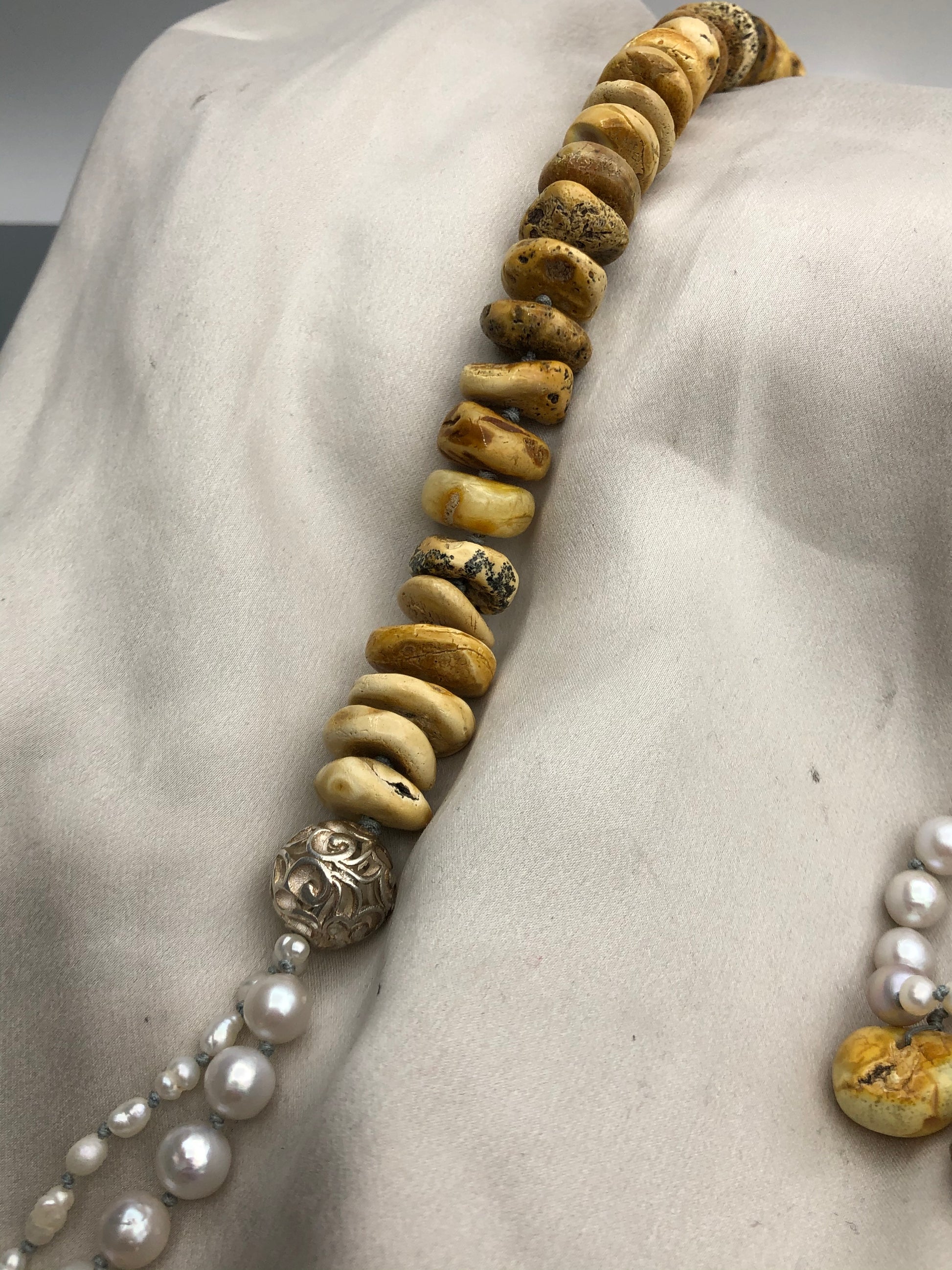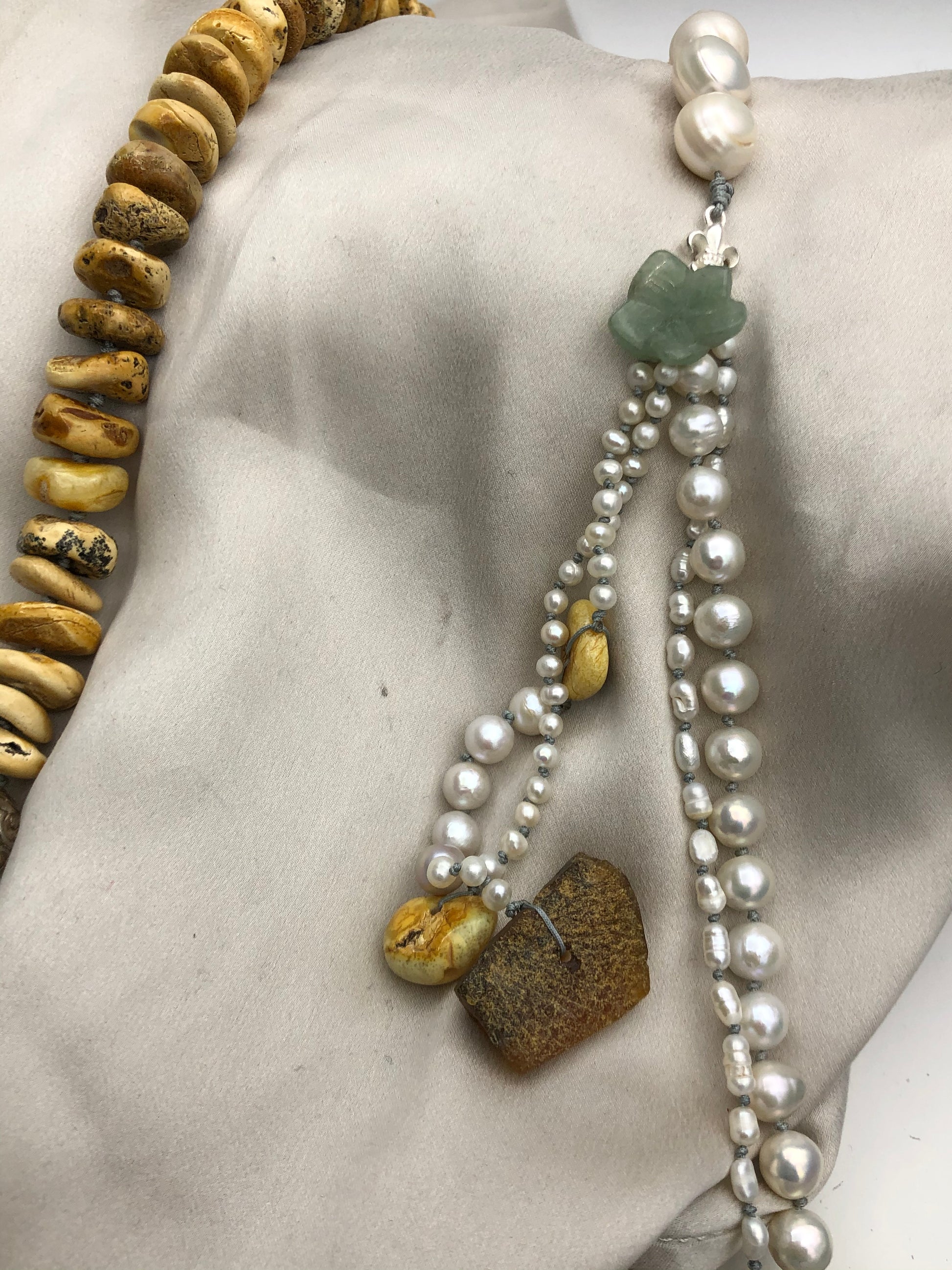 Materials : Baltic butter amber, fresh water pearl, jade.
