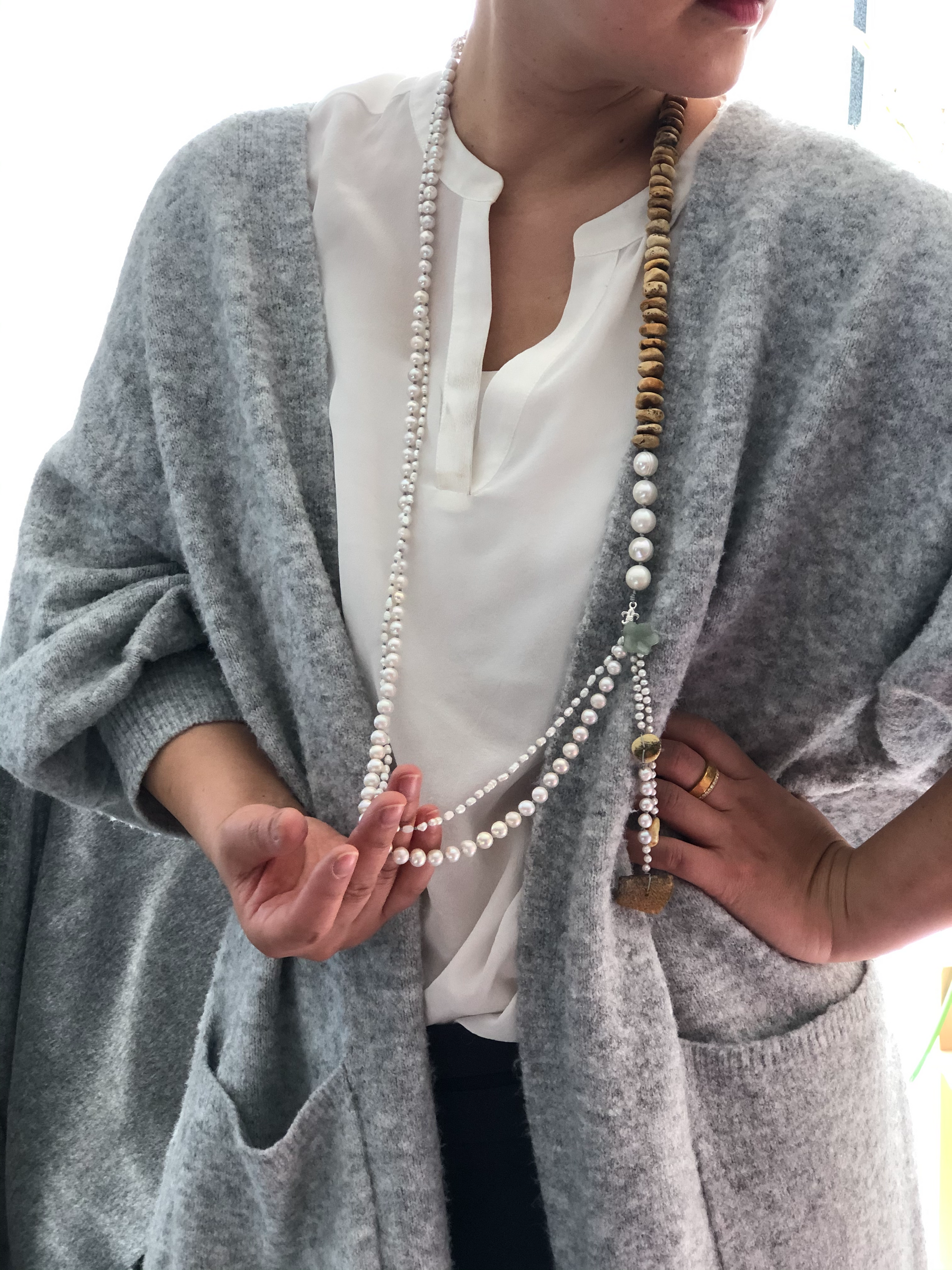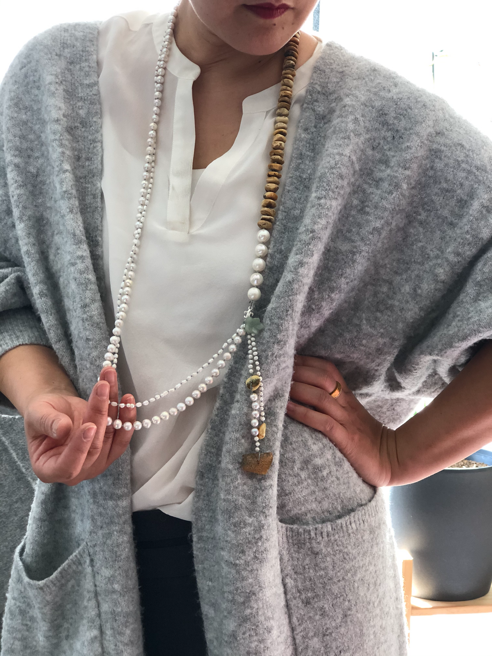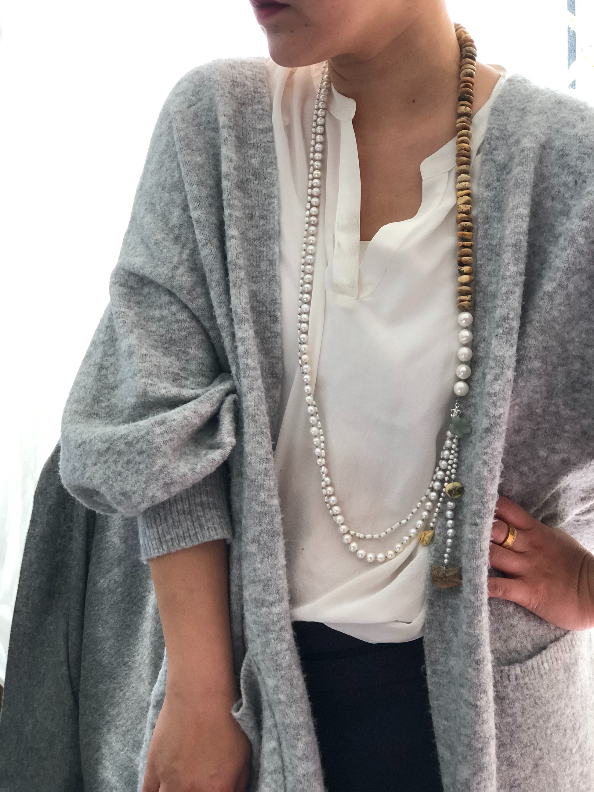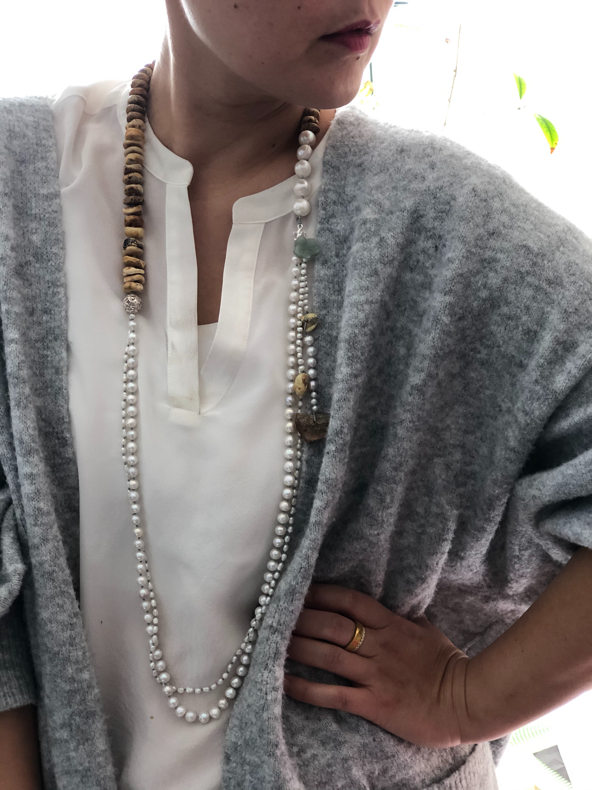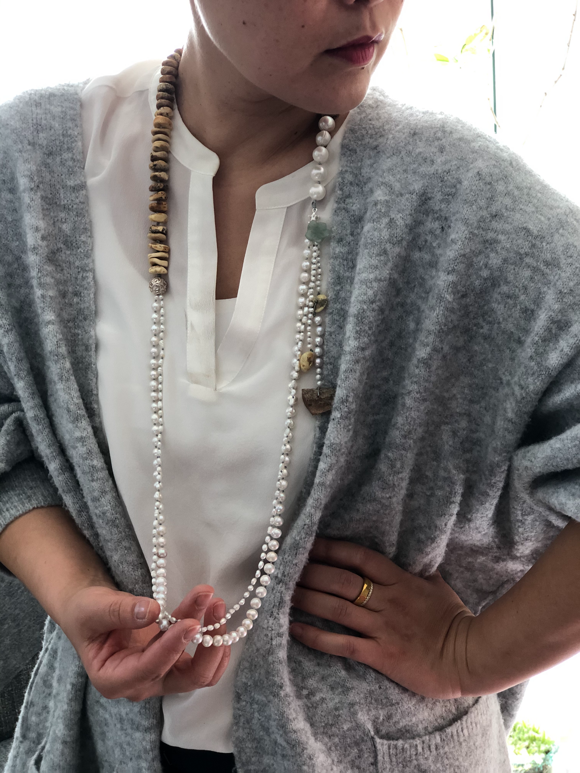 Materials : Baltic butter amber, fresh water pearl, jade.