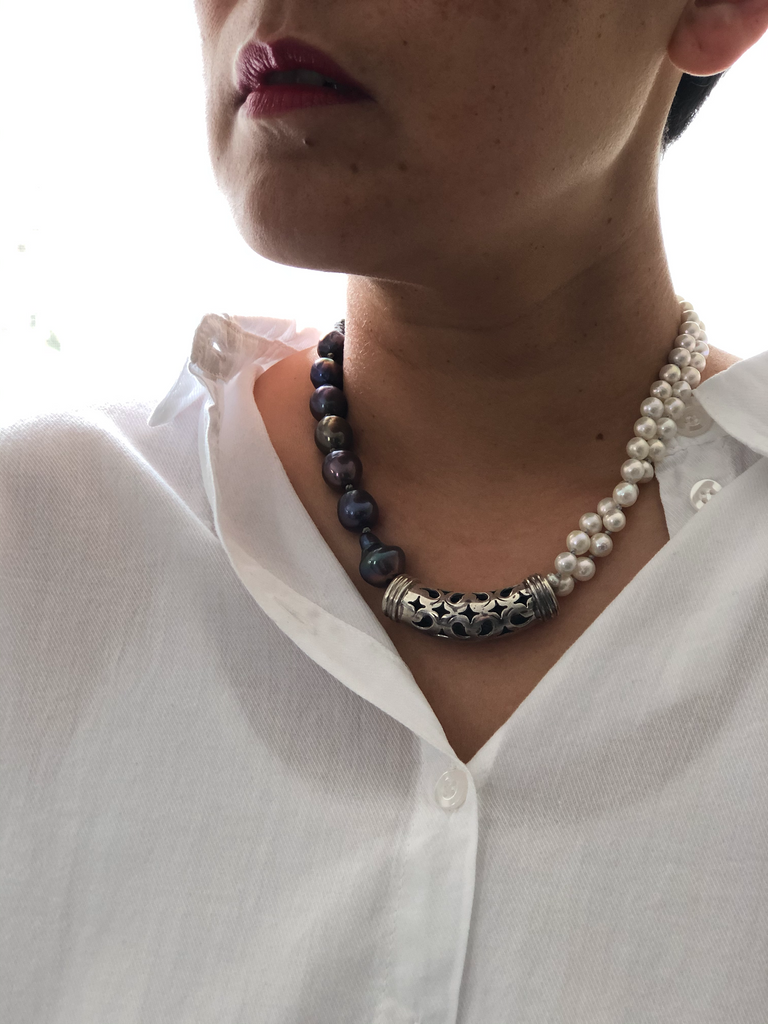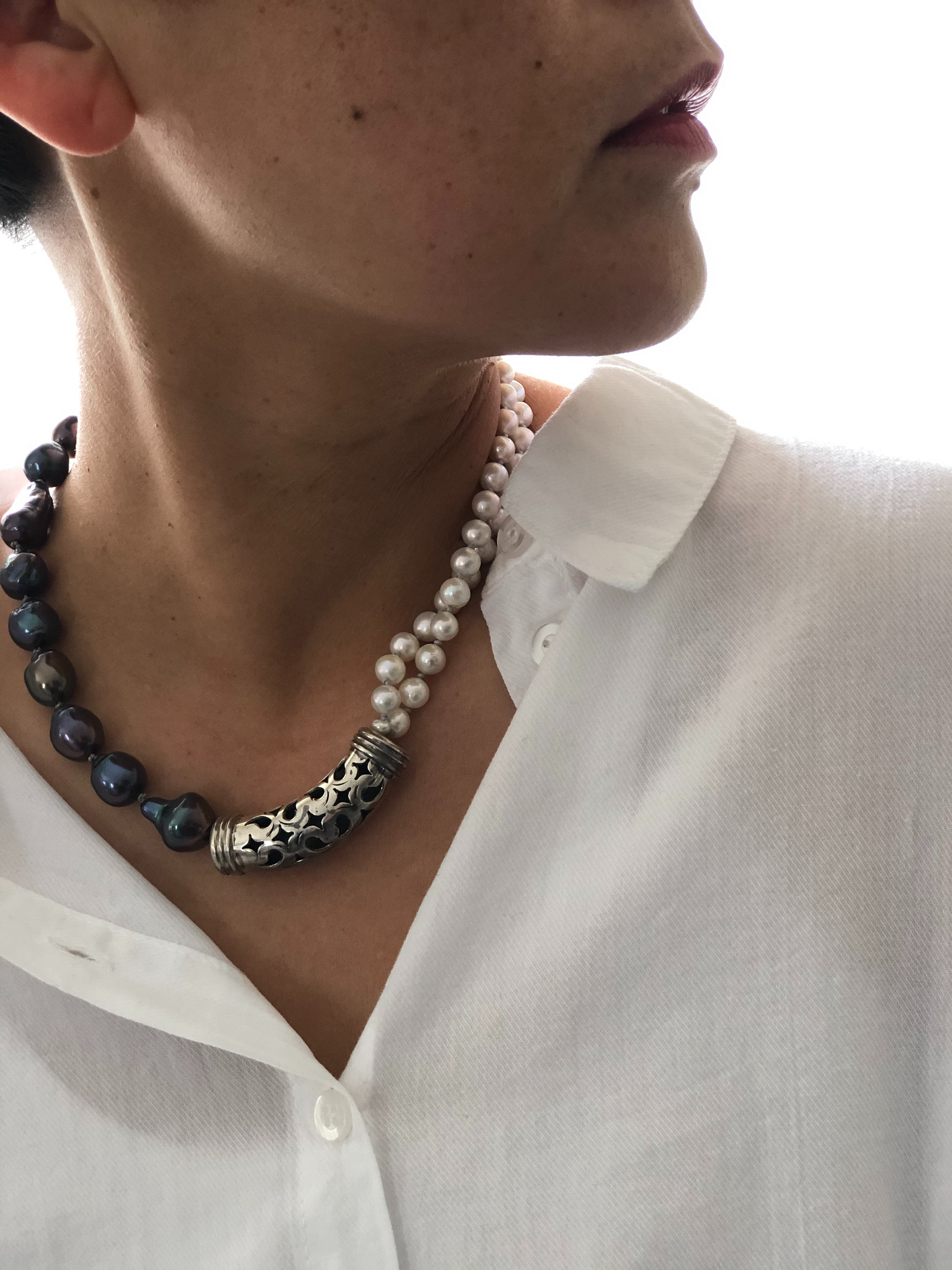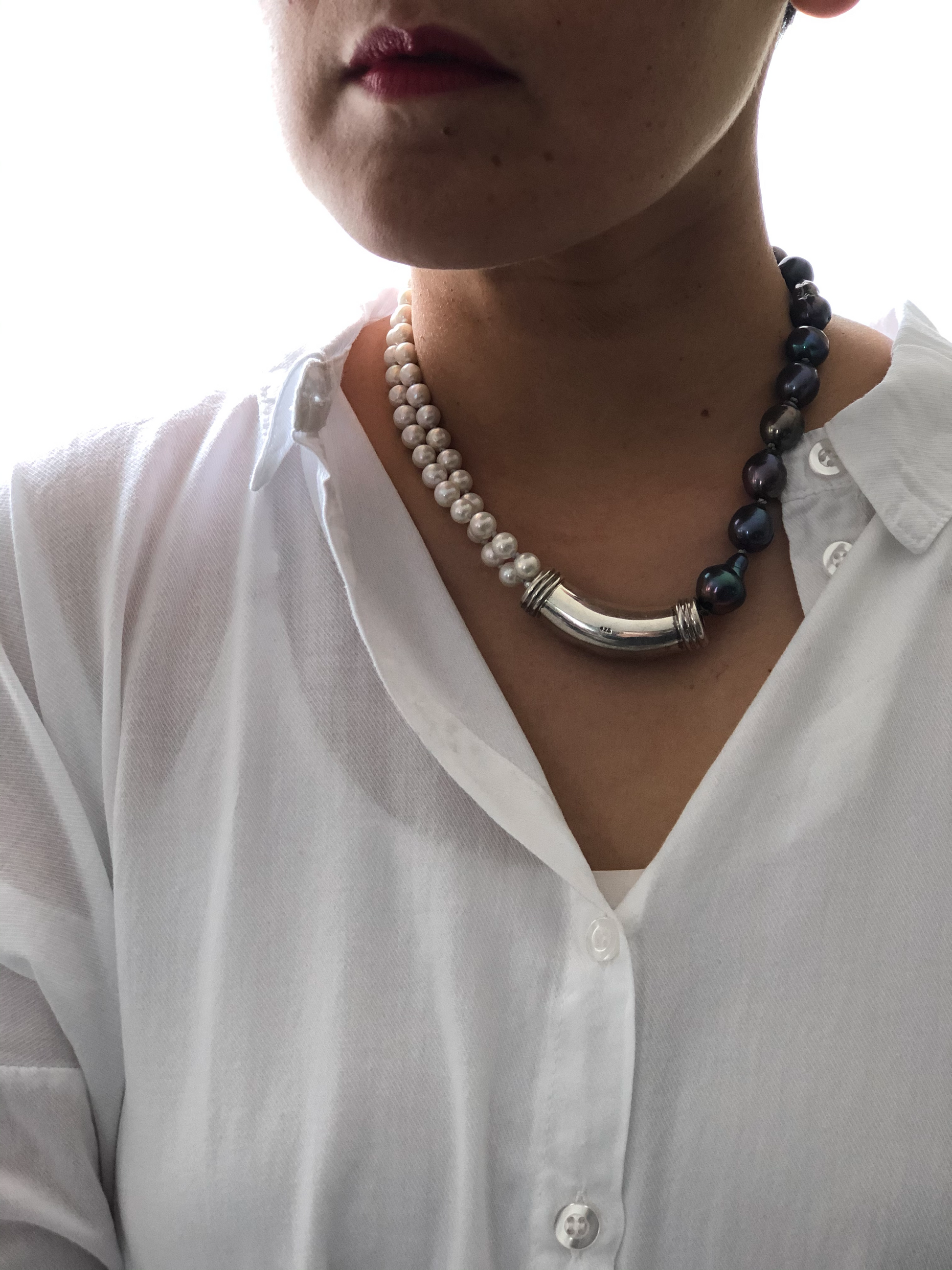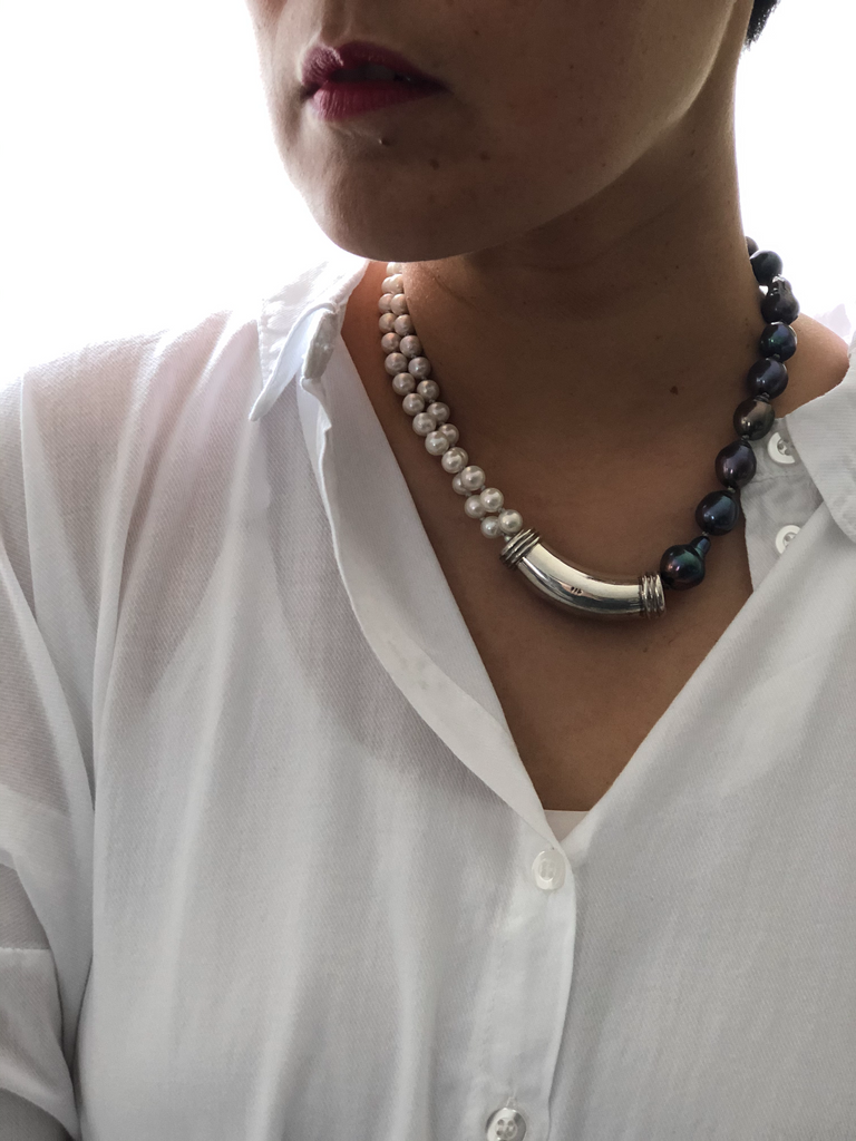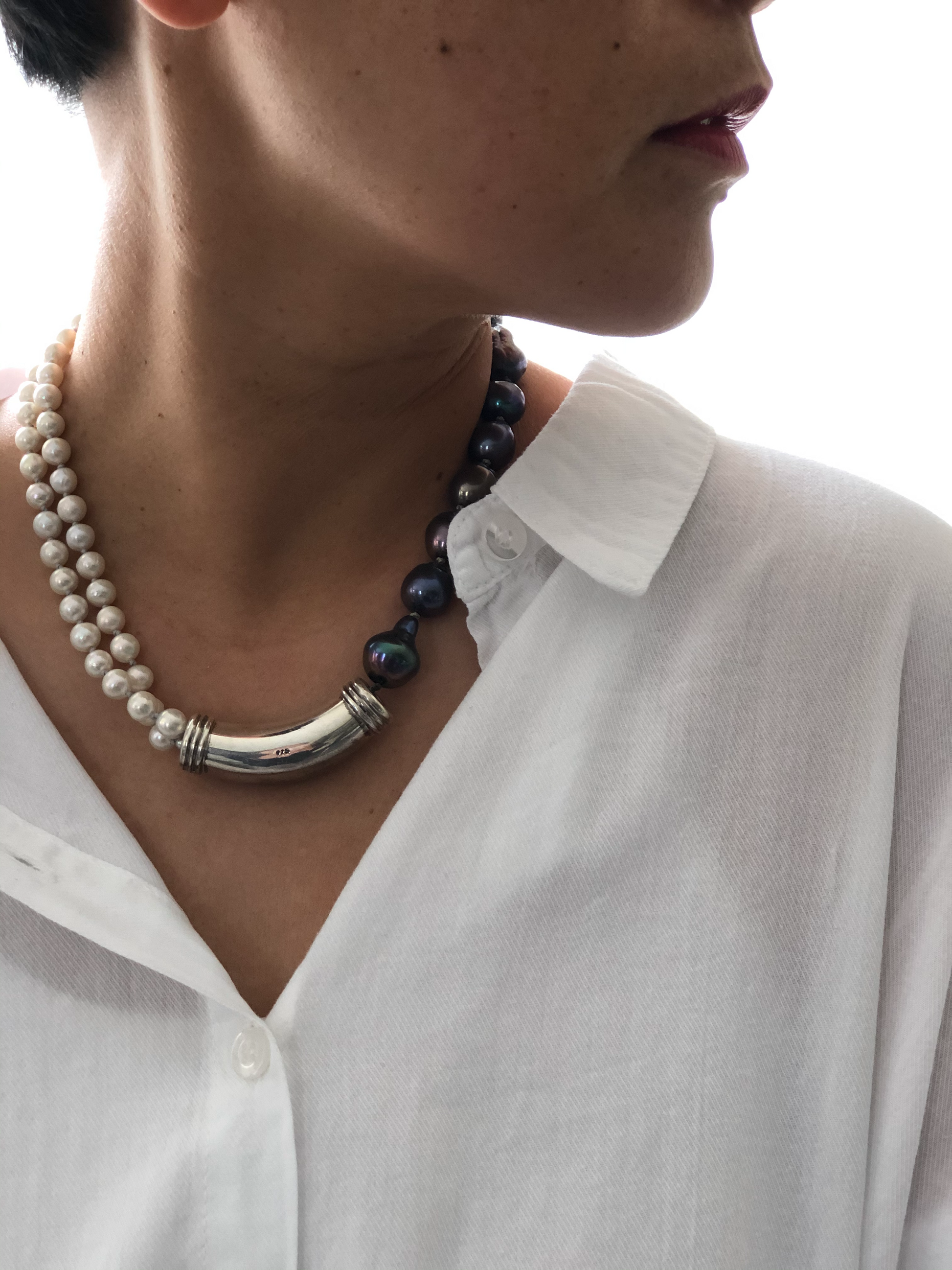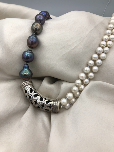 Materials : Sterling silver, fresh water pearl in two colors .
