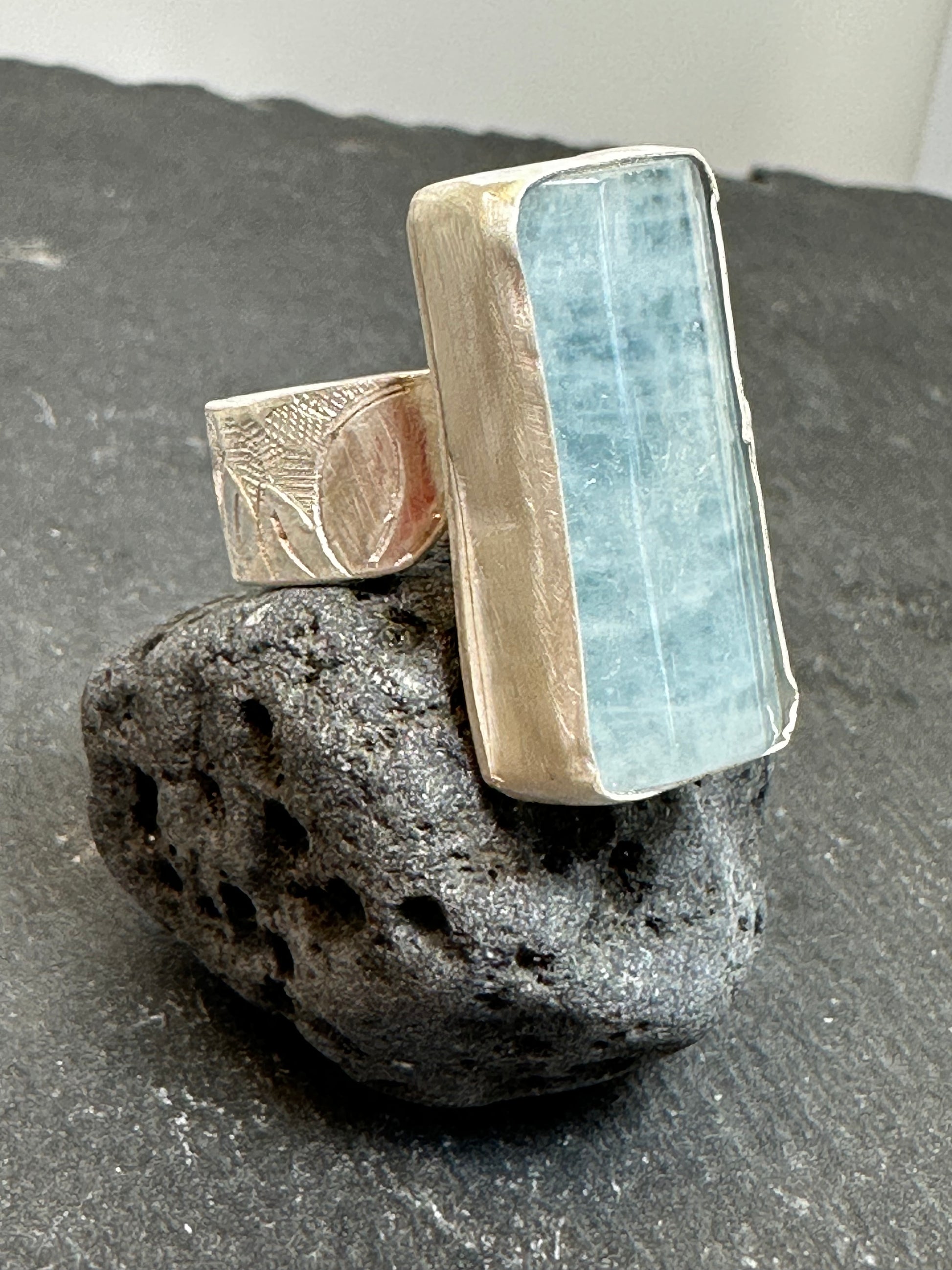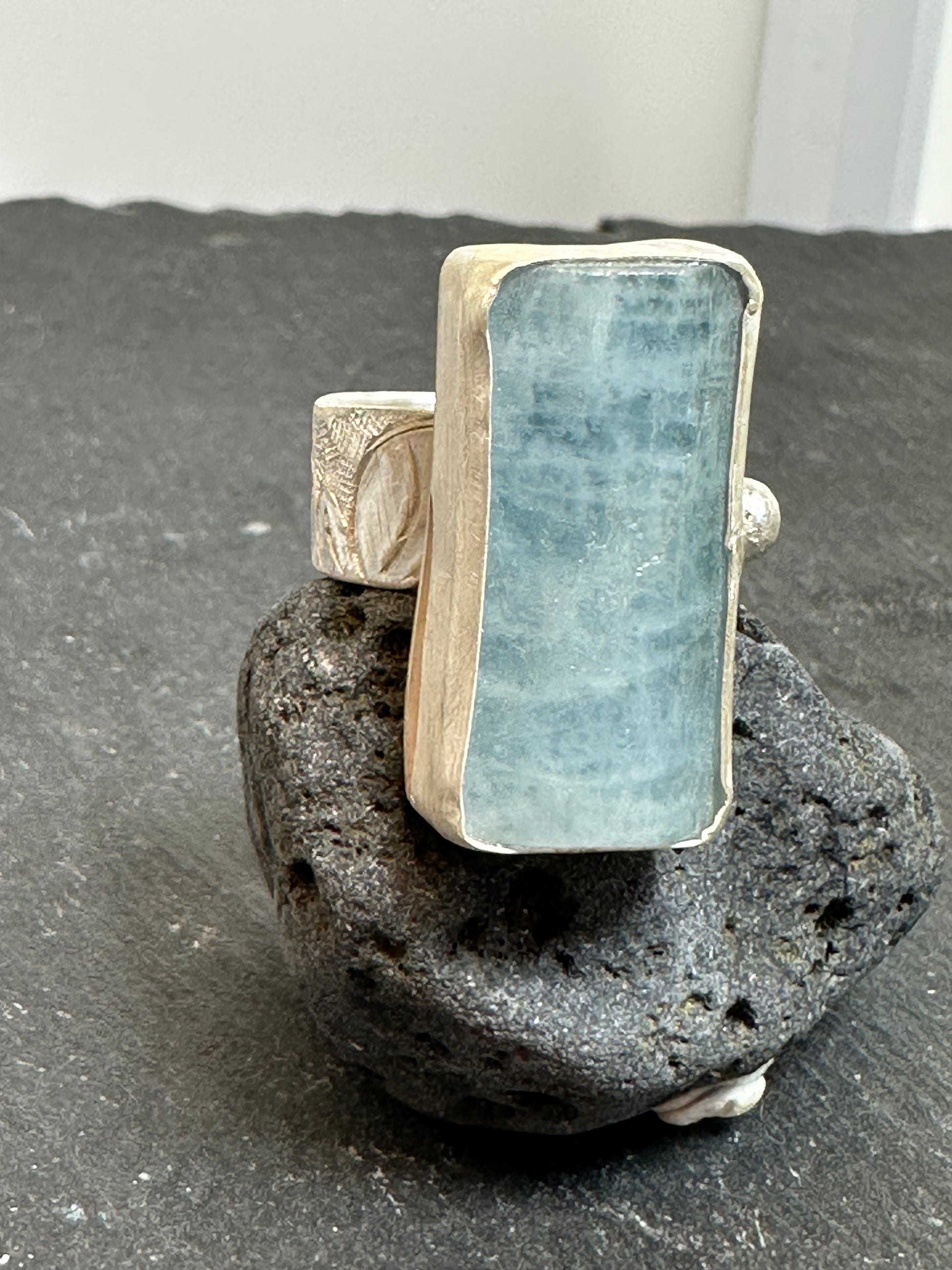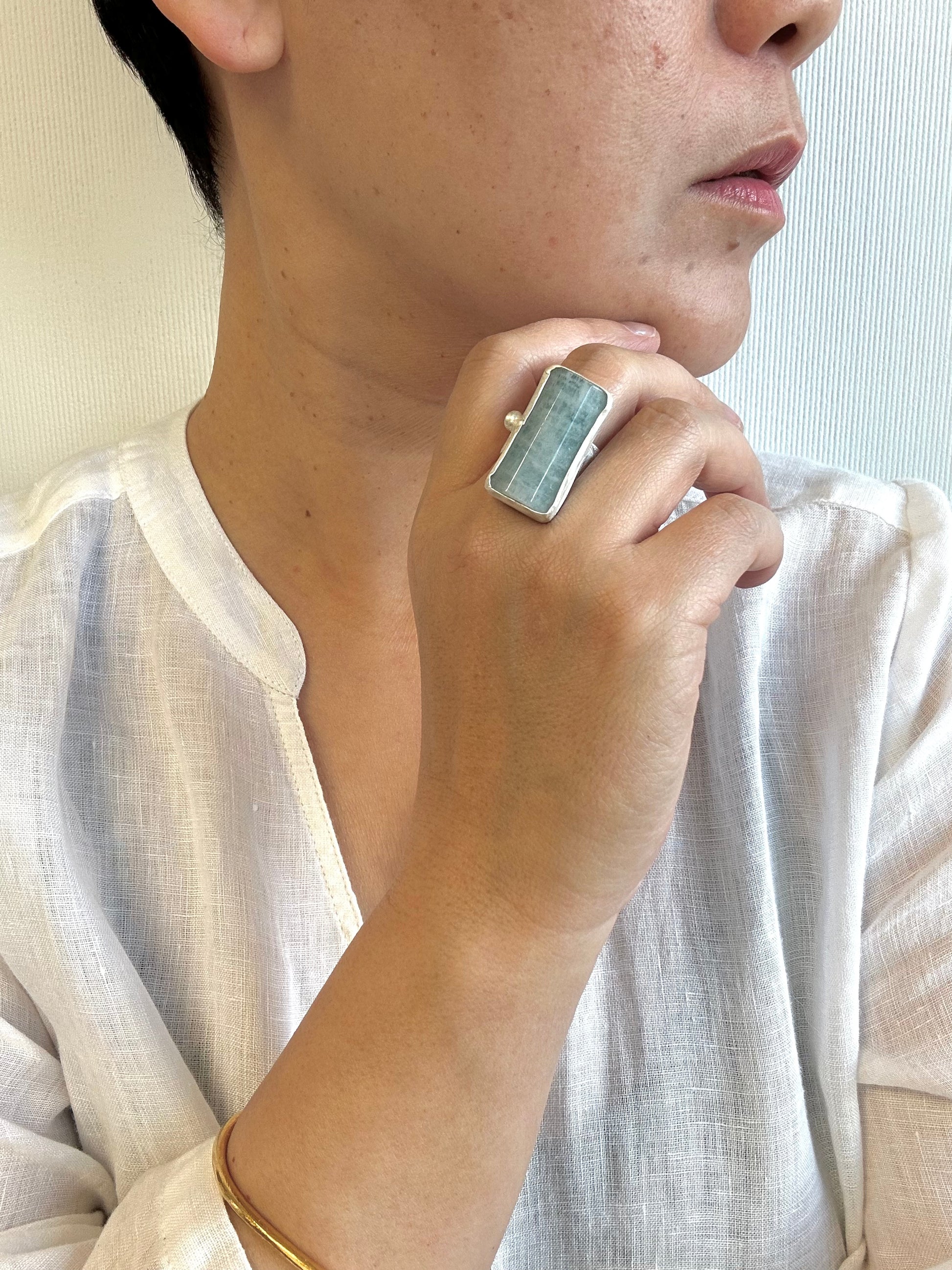 Very clear color of aquamarine, again , fine silver with free hand hammering, traditional Tibetan silve technique used for the ring .