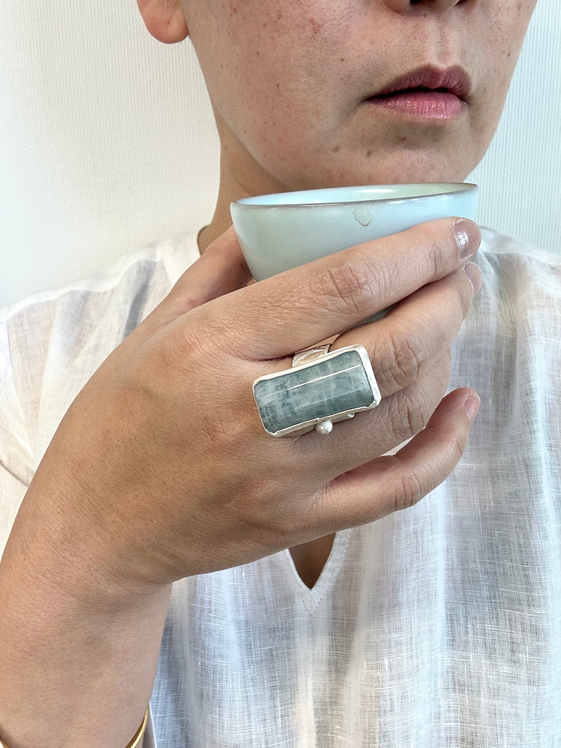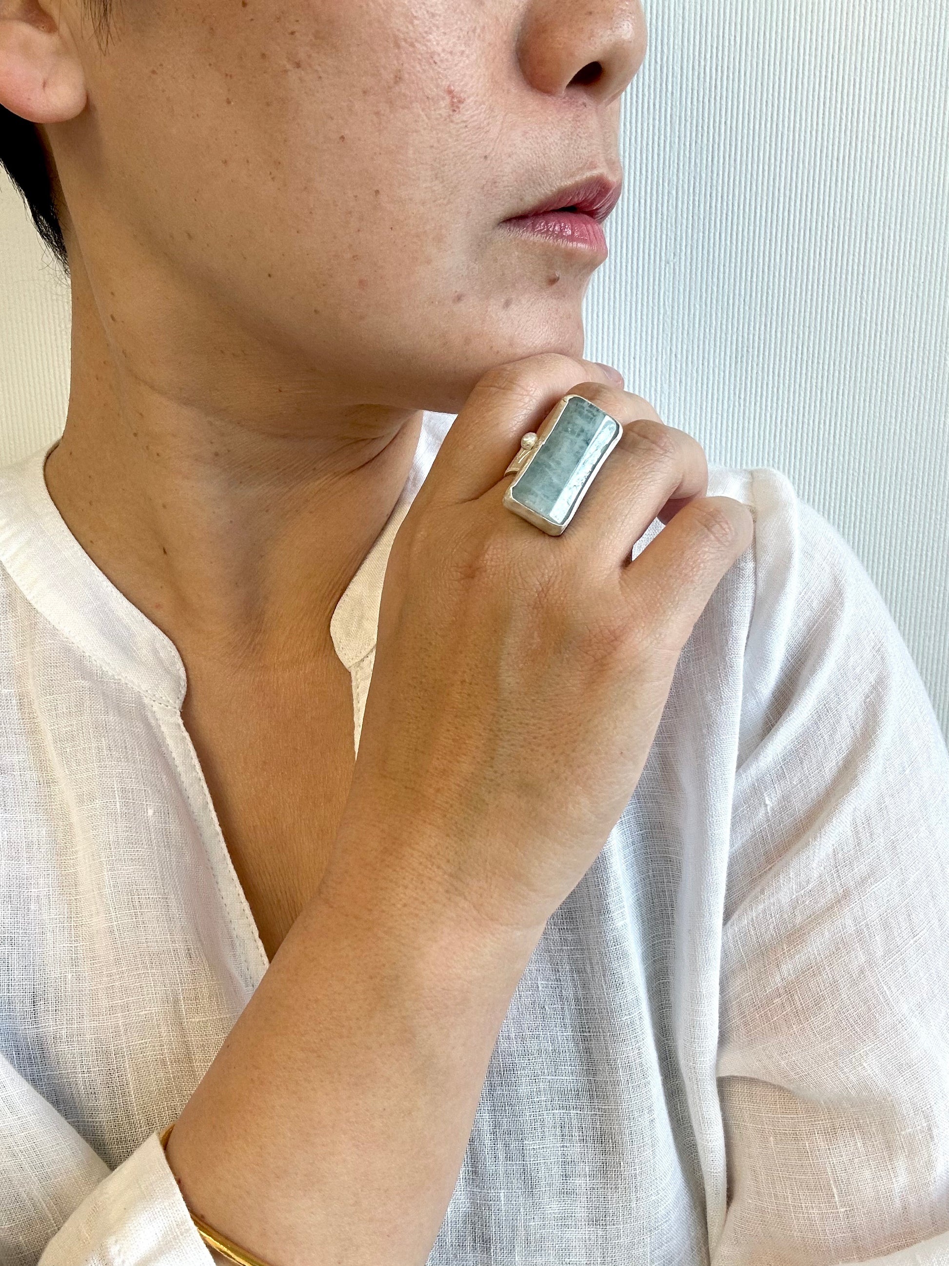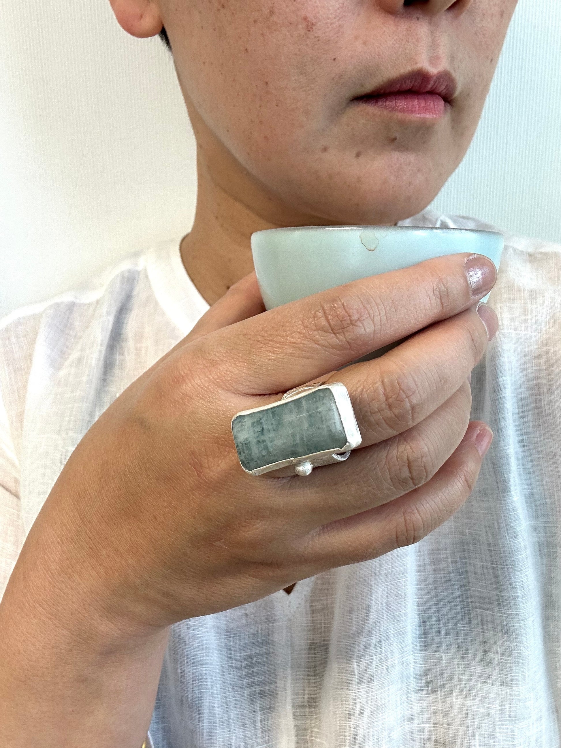 Very clear color of aquamarine, again , fine silver with free hand hammering, traditional Tibetan silve technique used for the ring .