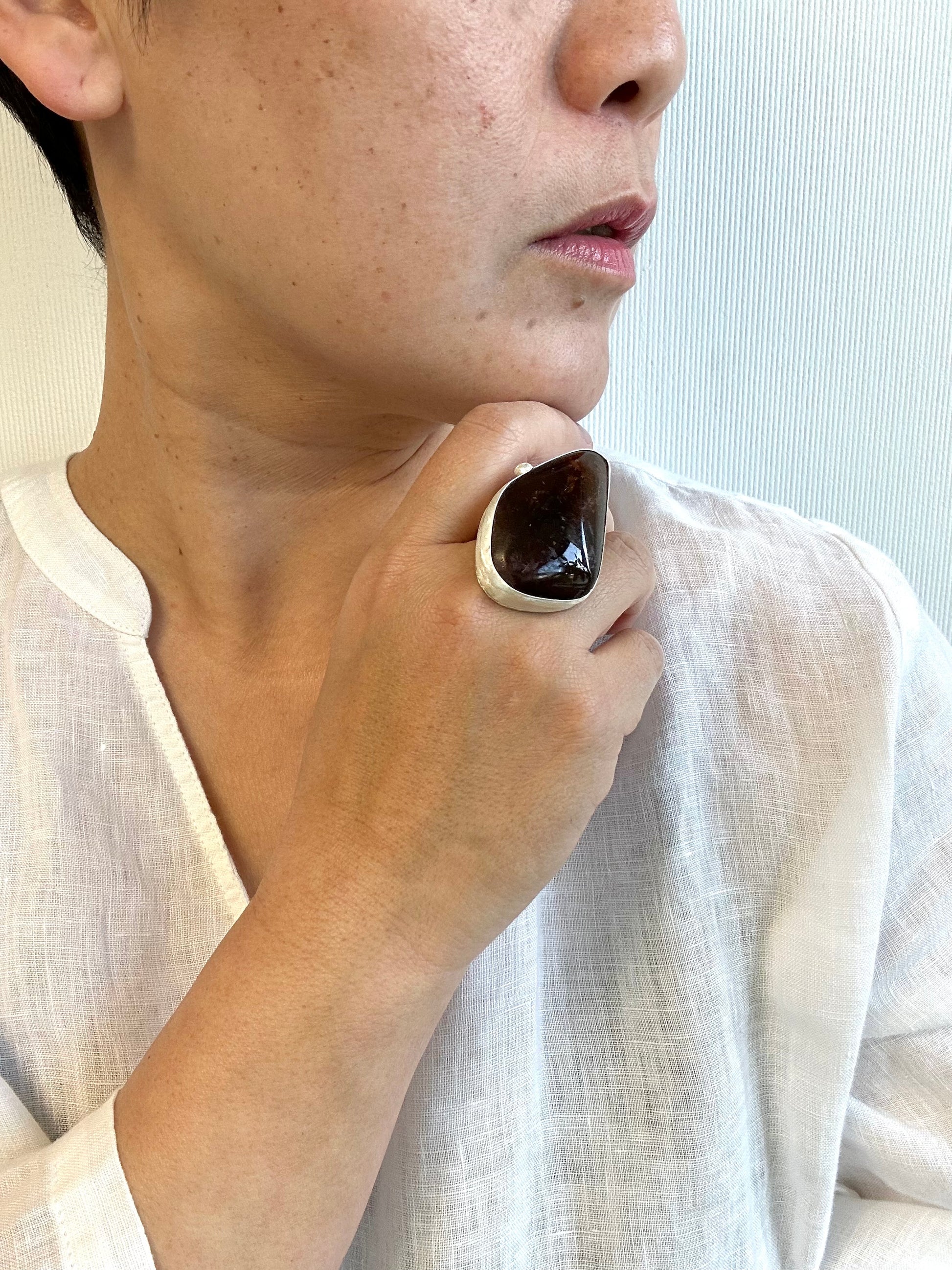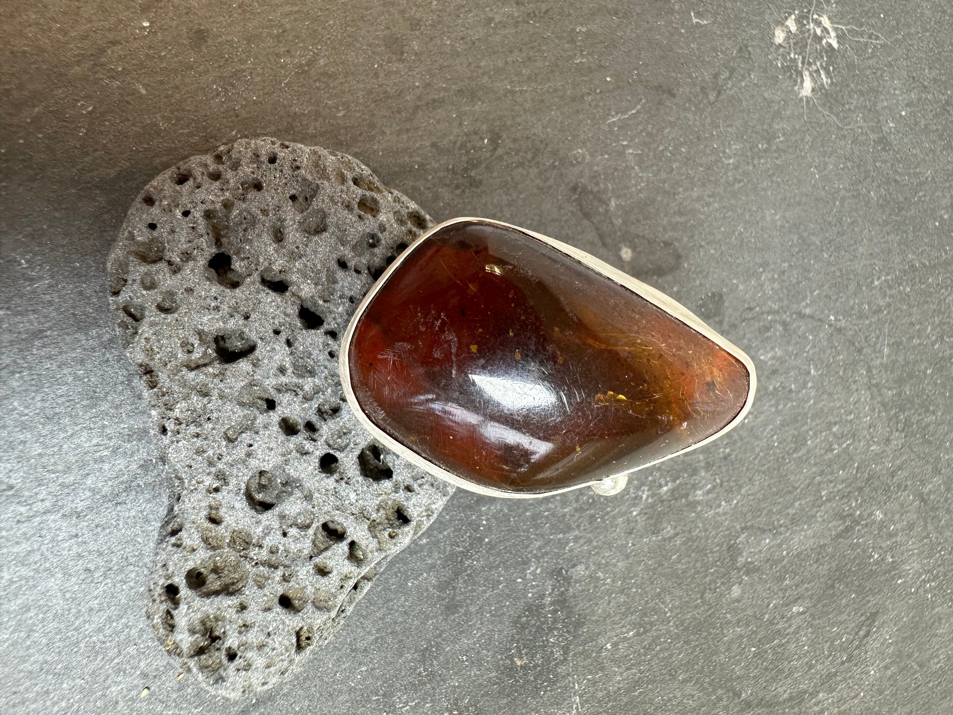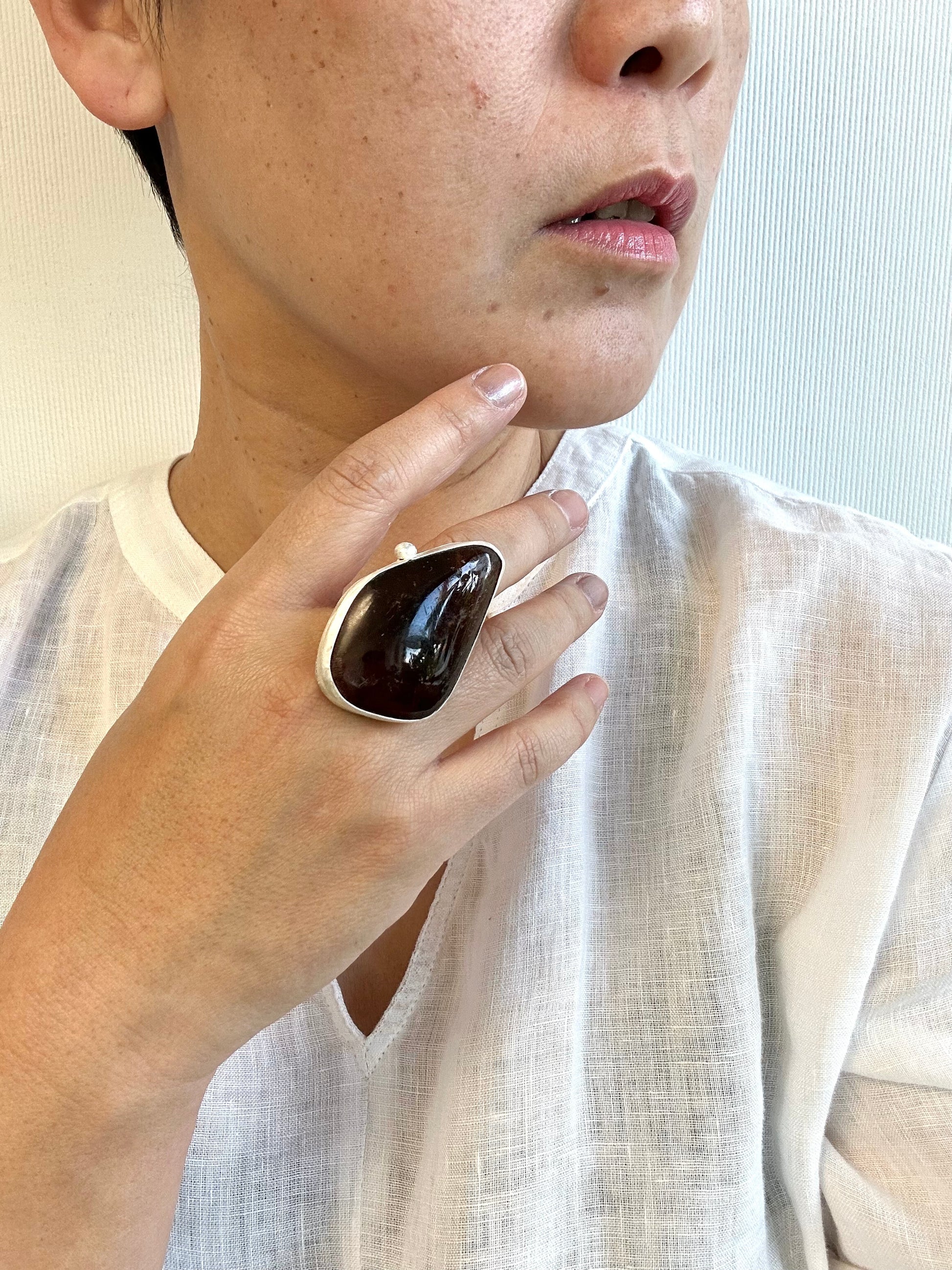 Large piece of amber. Free hand hammering on fine silver, traditional Tibetan silver technique used on the design.