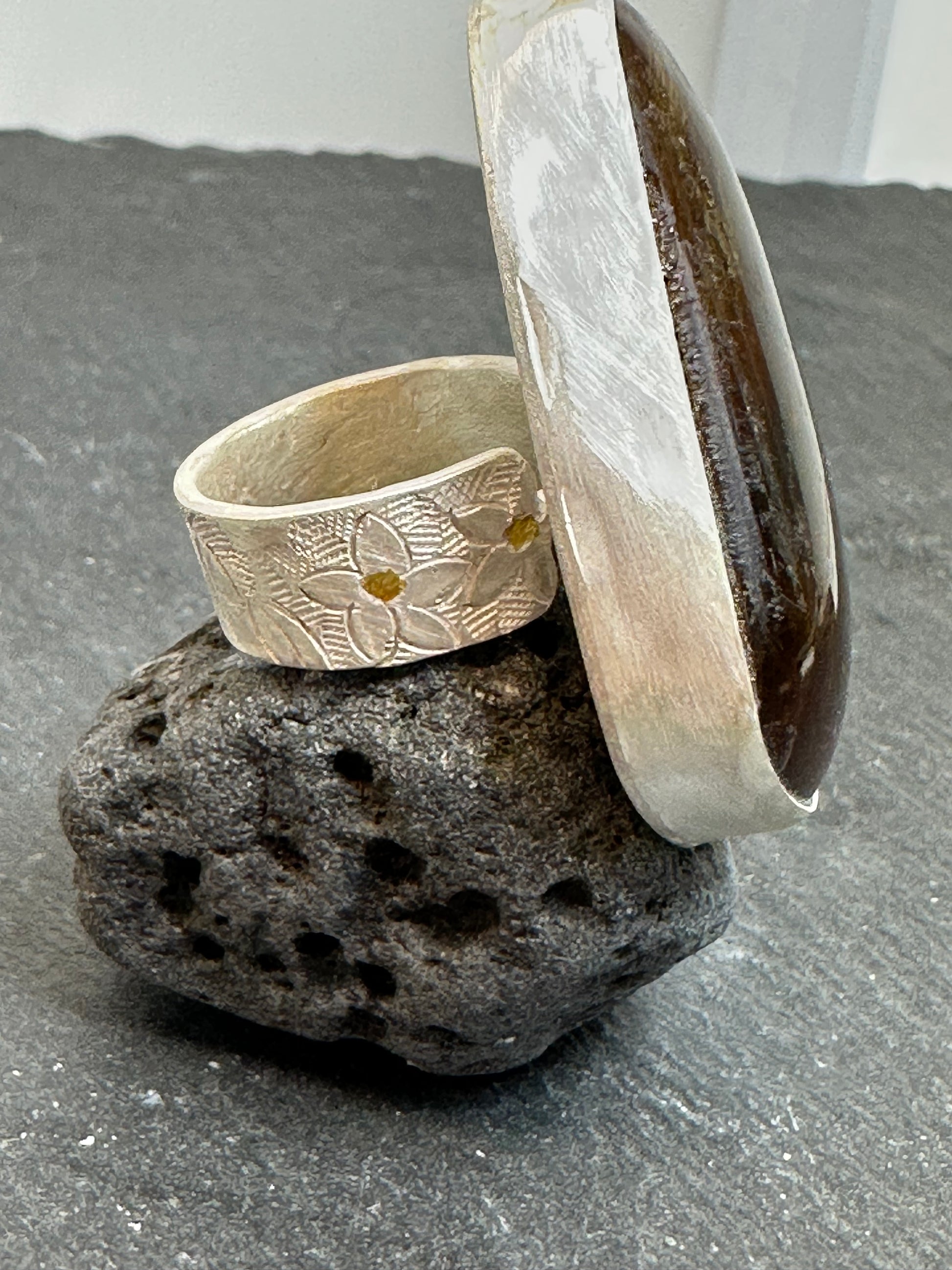 Materials : Fine silver, amber, 24k gold
