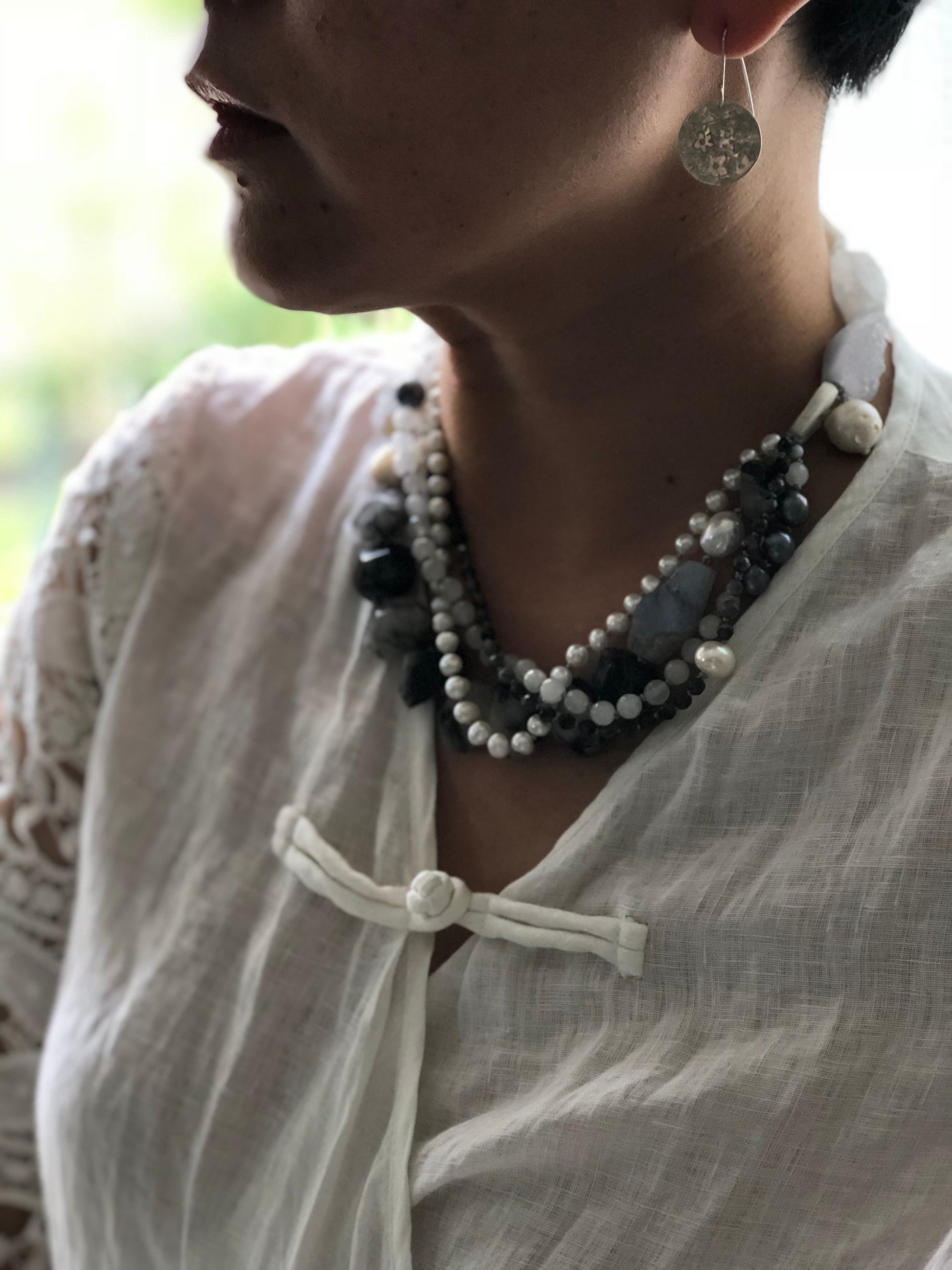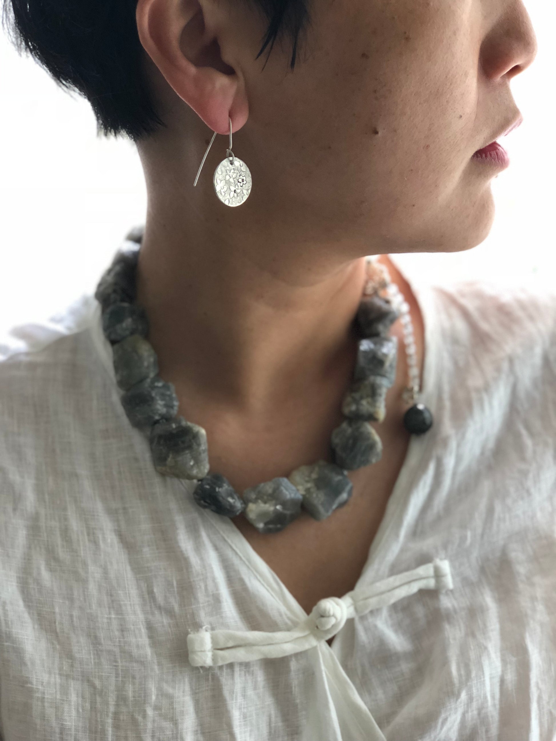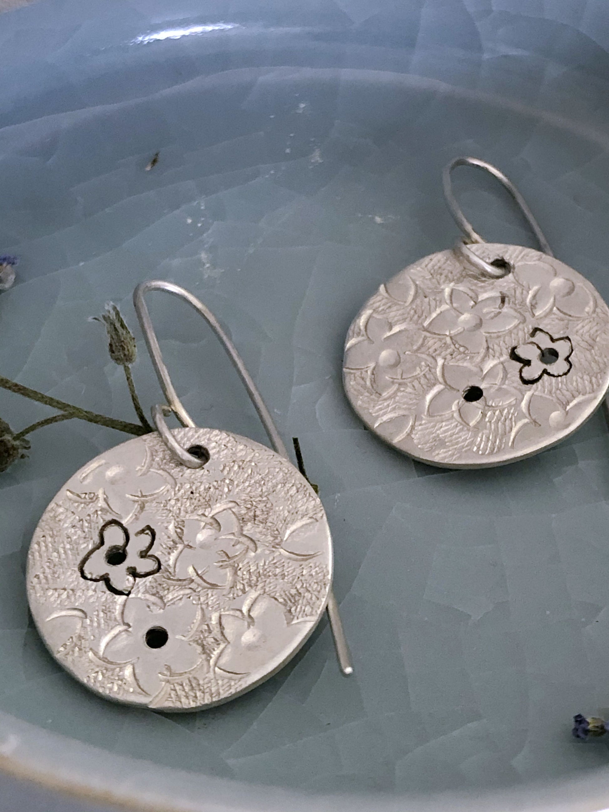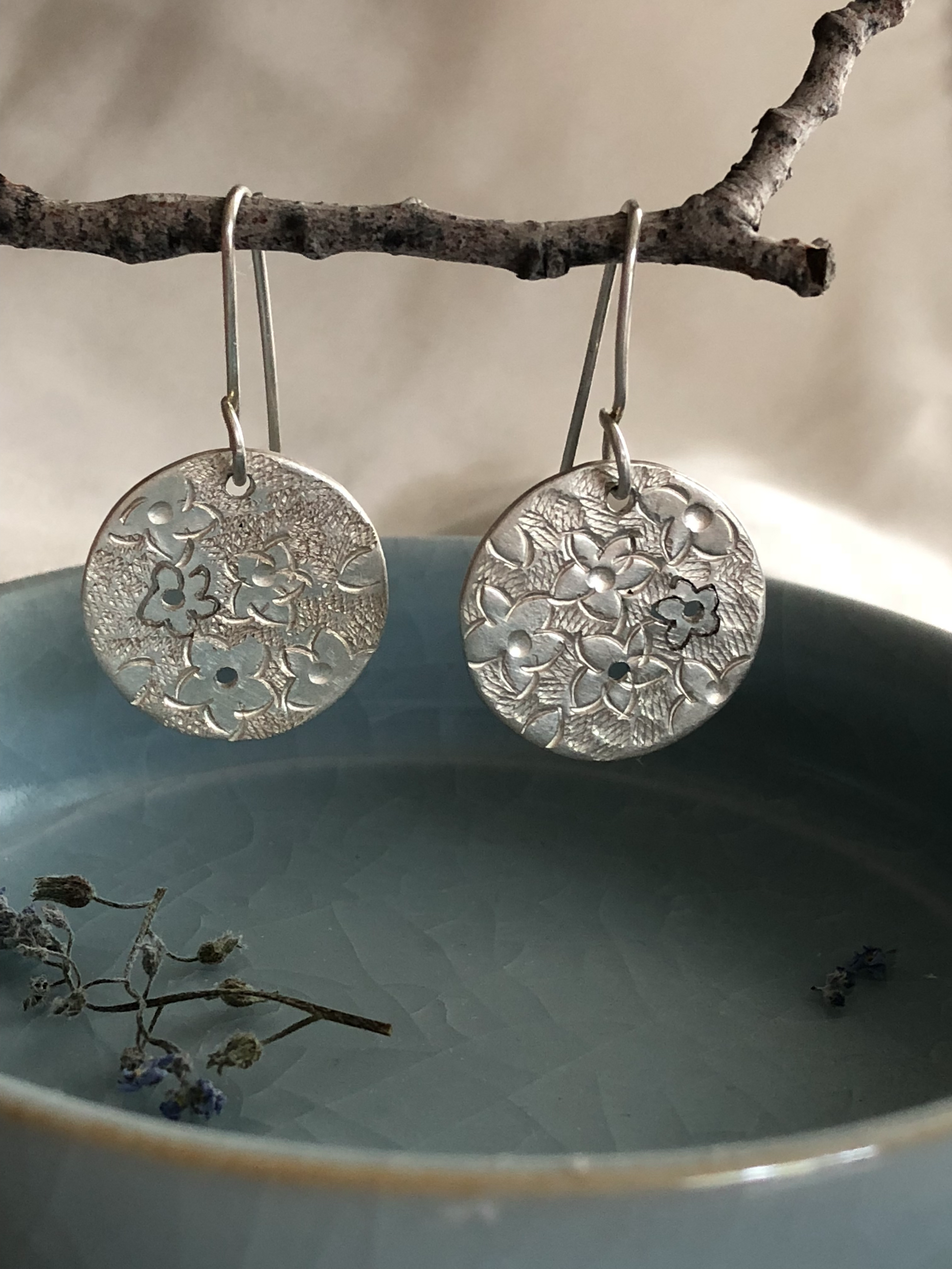 Free hand drawing of peach blossom on find silver and hand hammered. Each one is different .