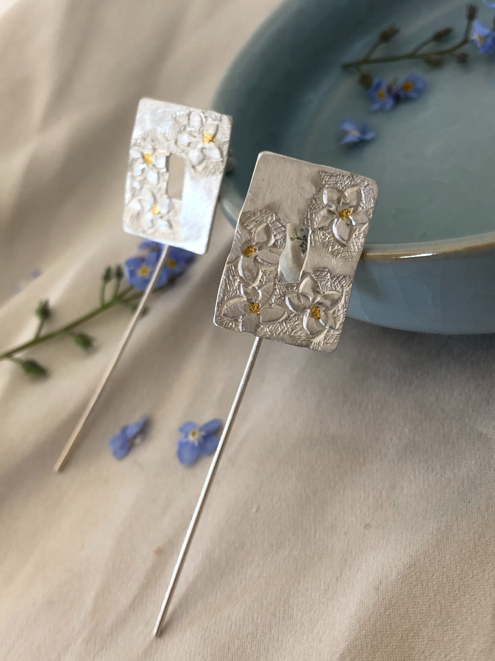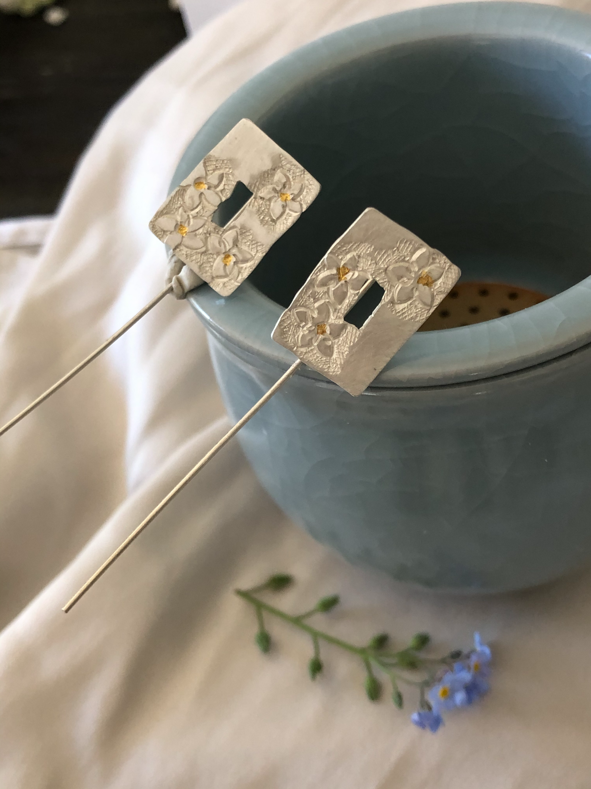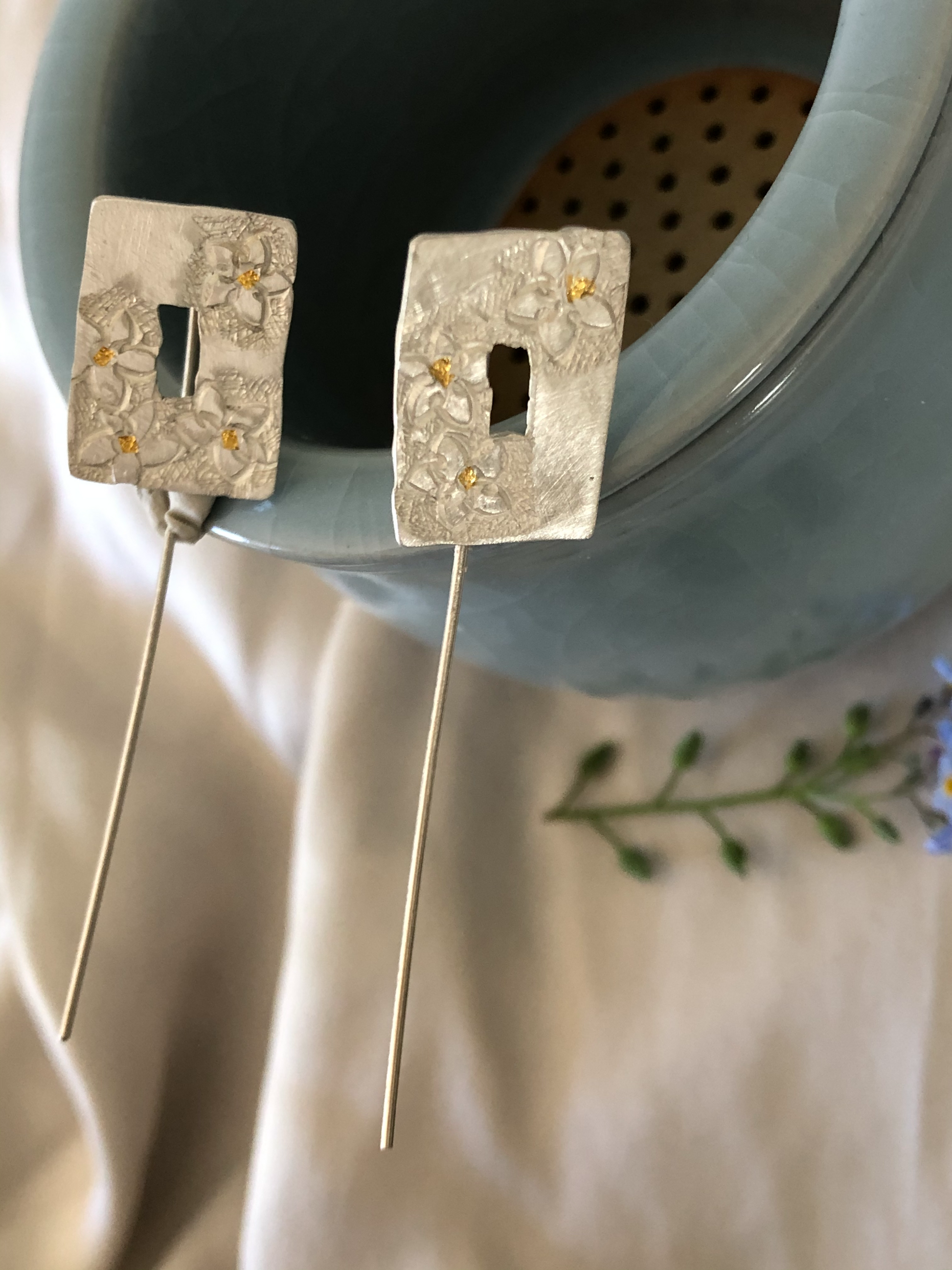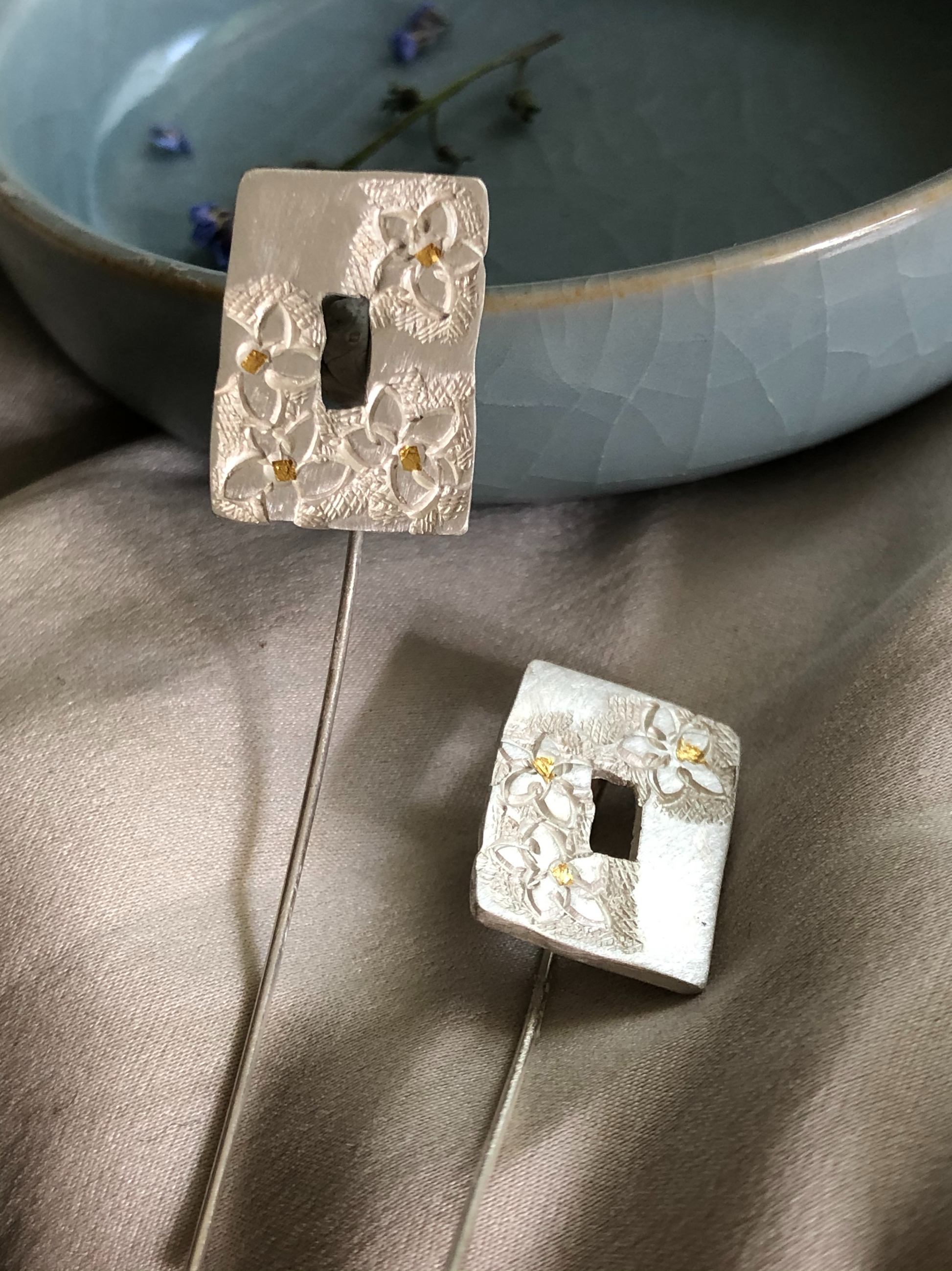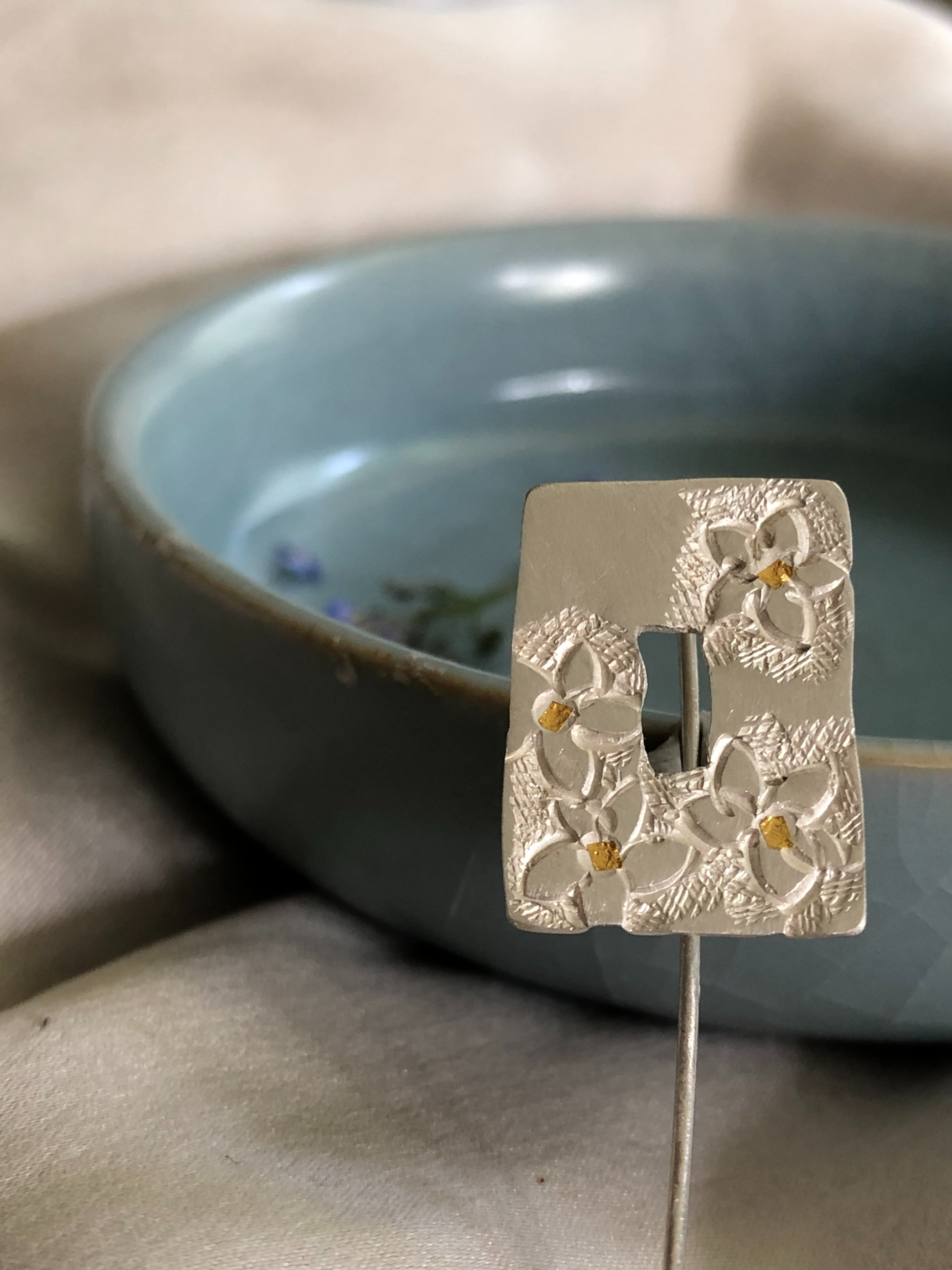 Hand drawing , hand hammed on fine silver , with a little bit fine gold on flowers . one of a kind piece.