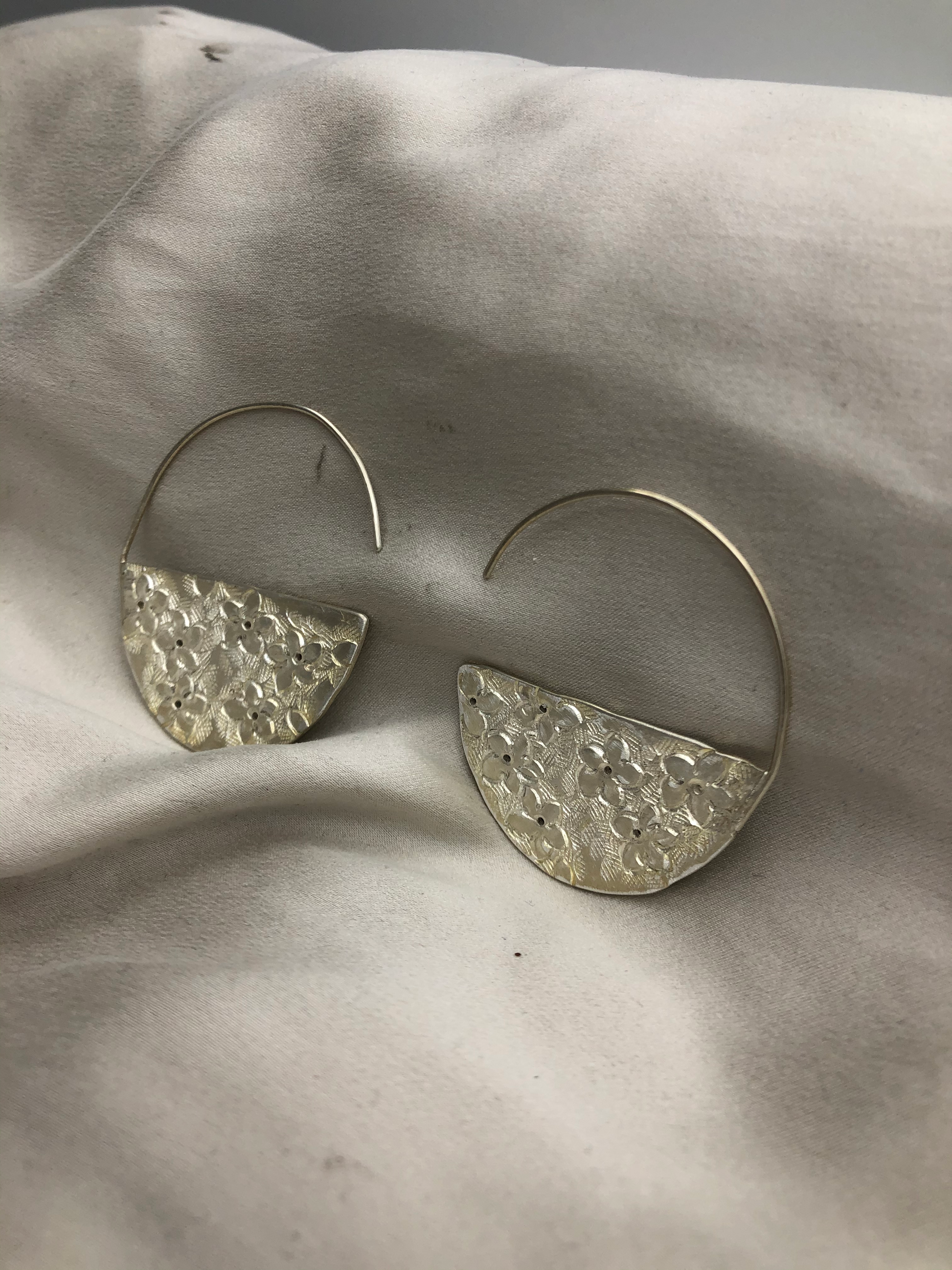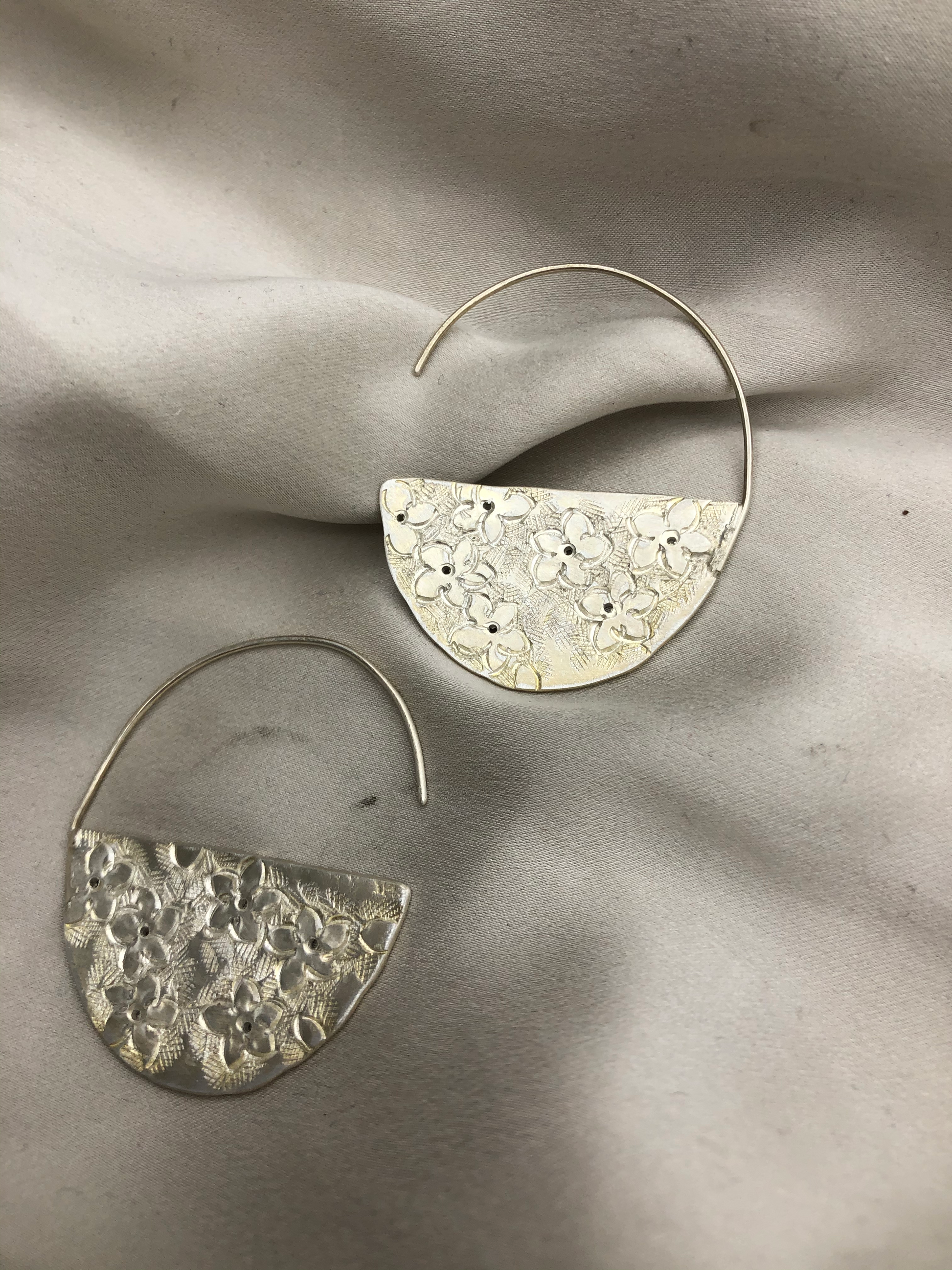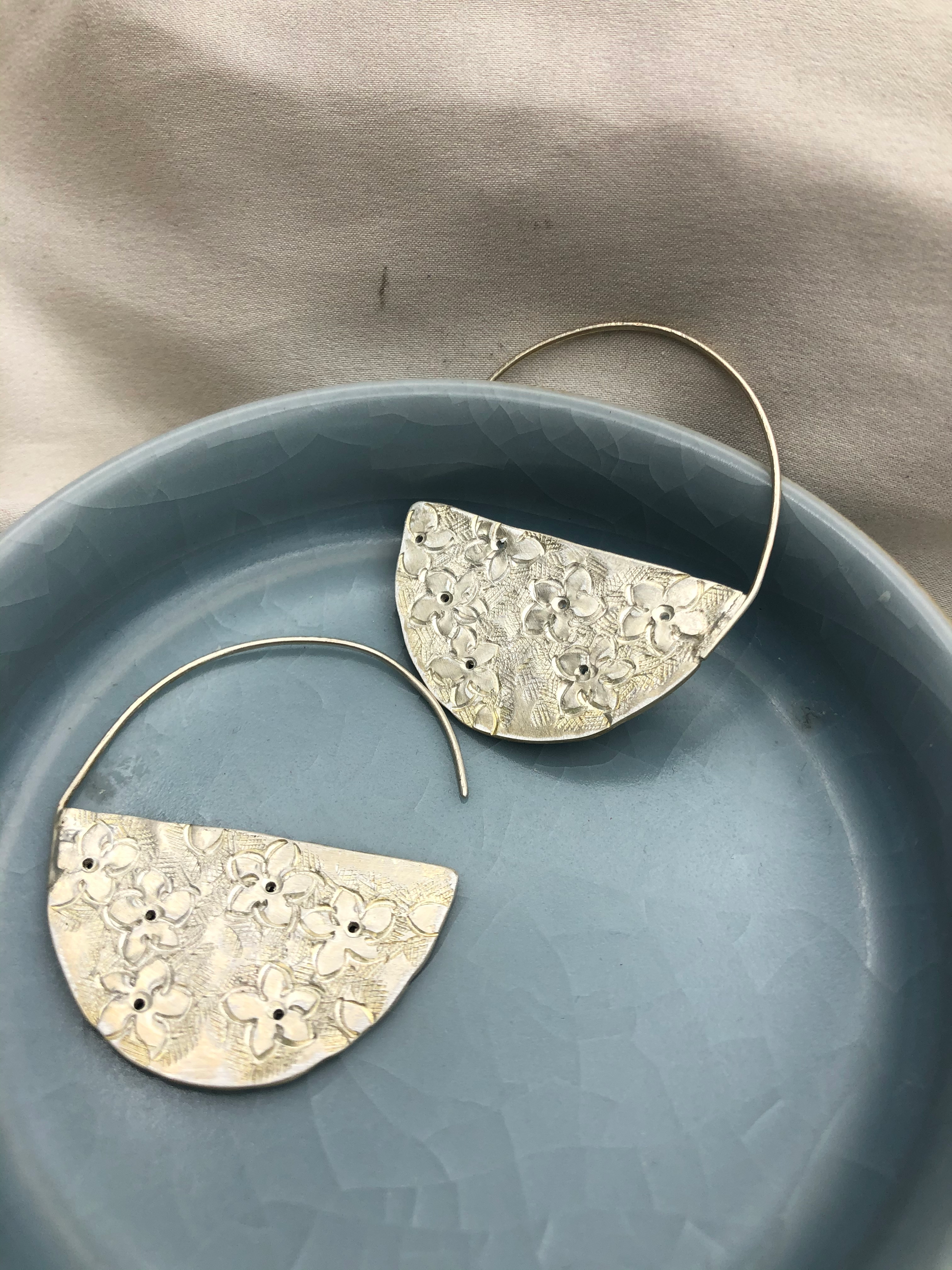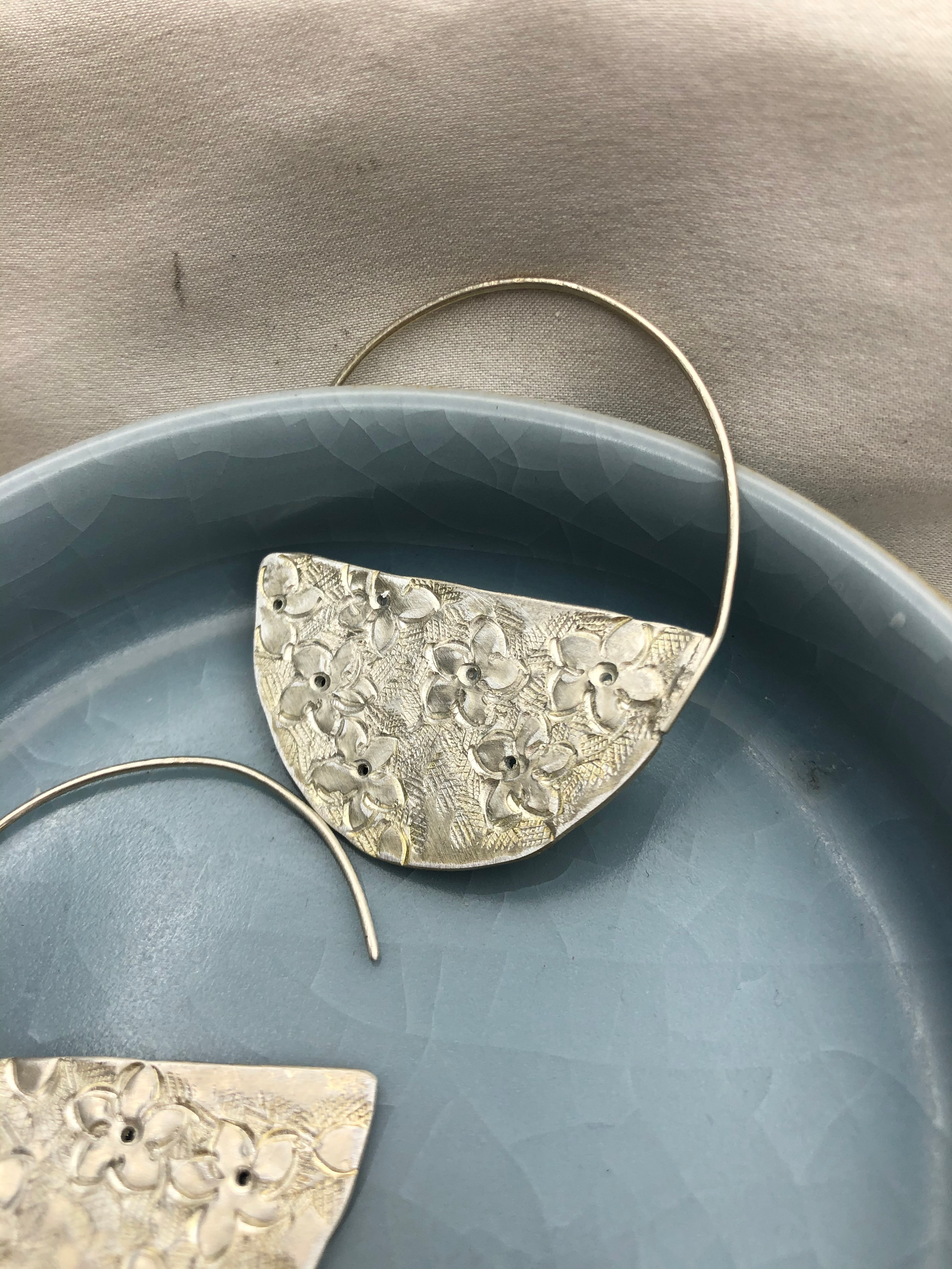 Free hand patterned and hammered on fine silver, one of a kind design.